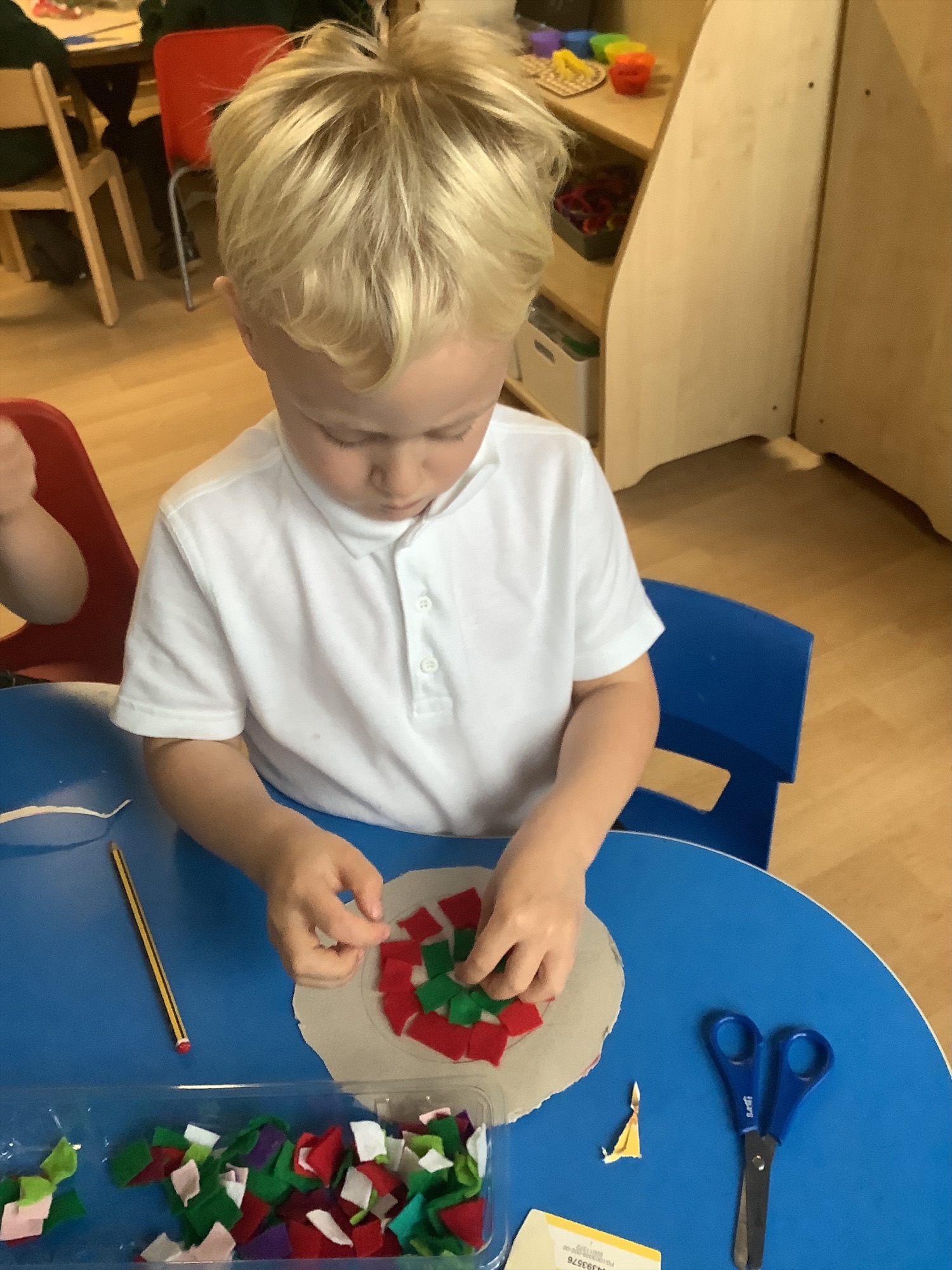 Our Reception children have been busy little elves, creating their very own Christmas baubles! They carefully glued on colourful felt, threaded wool, cut, stuck and sprinkled plenty of festive creativity into every decoration.