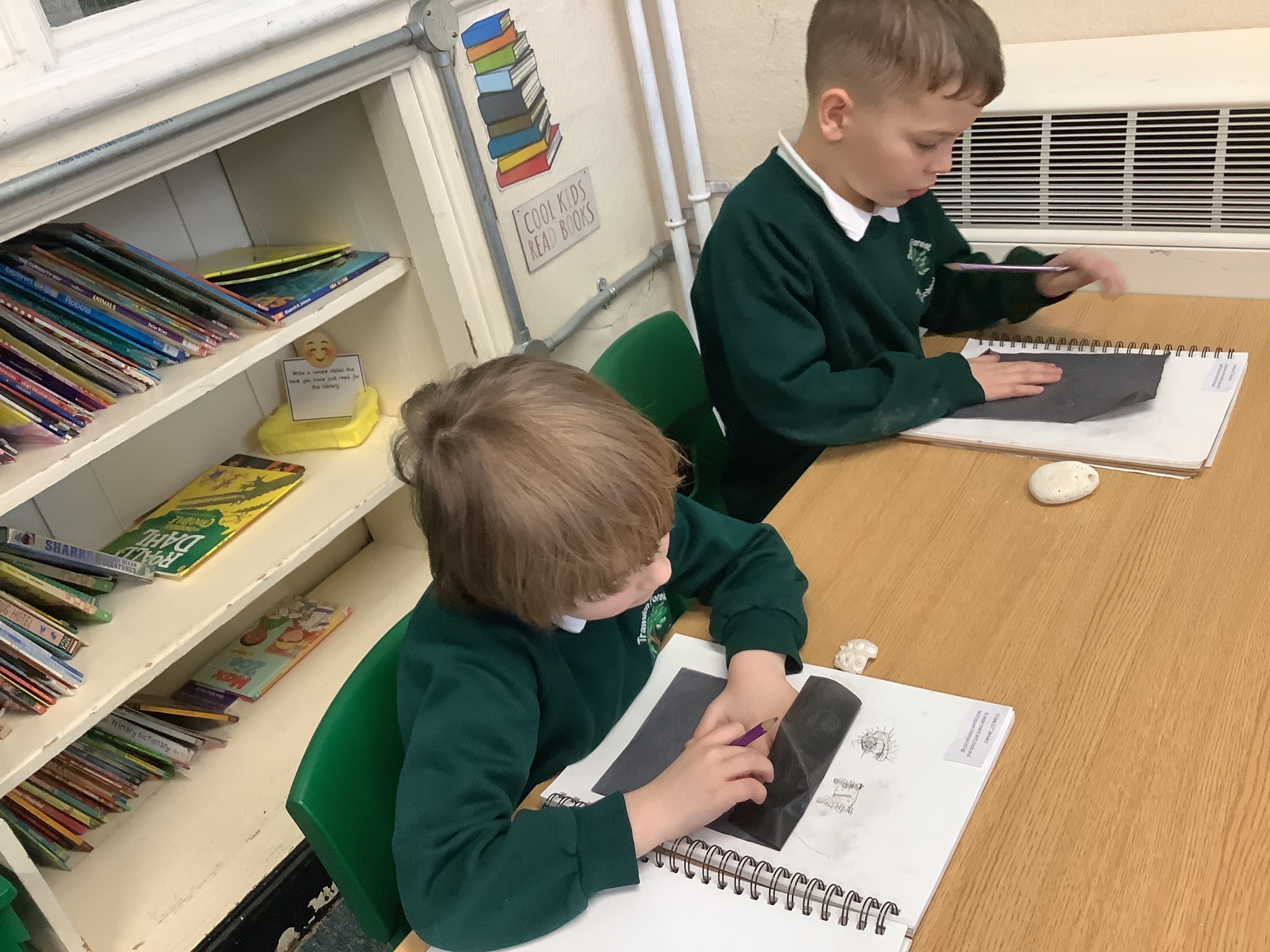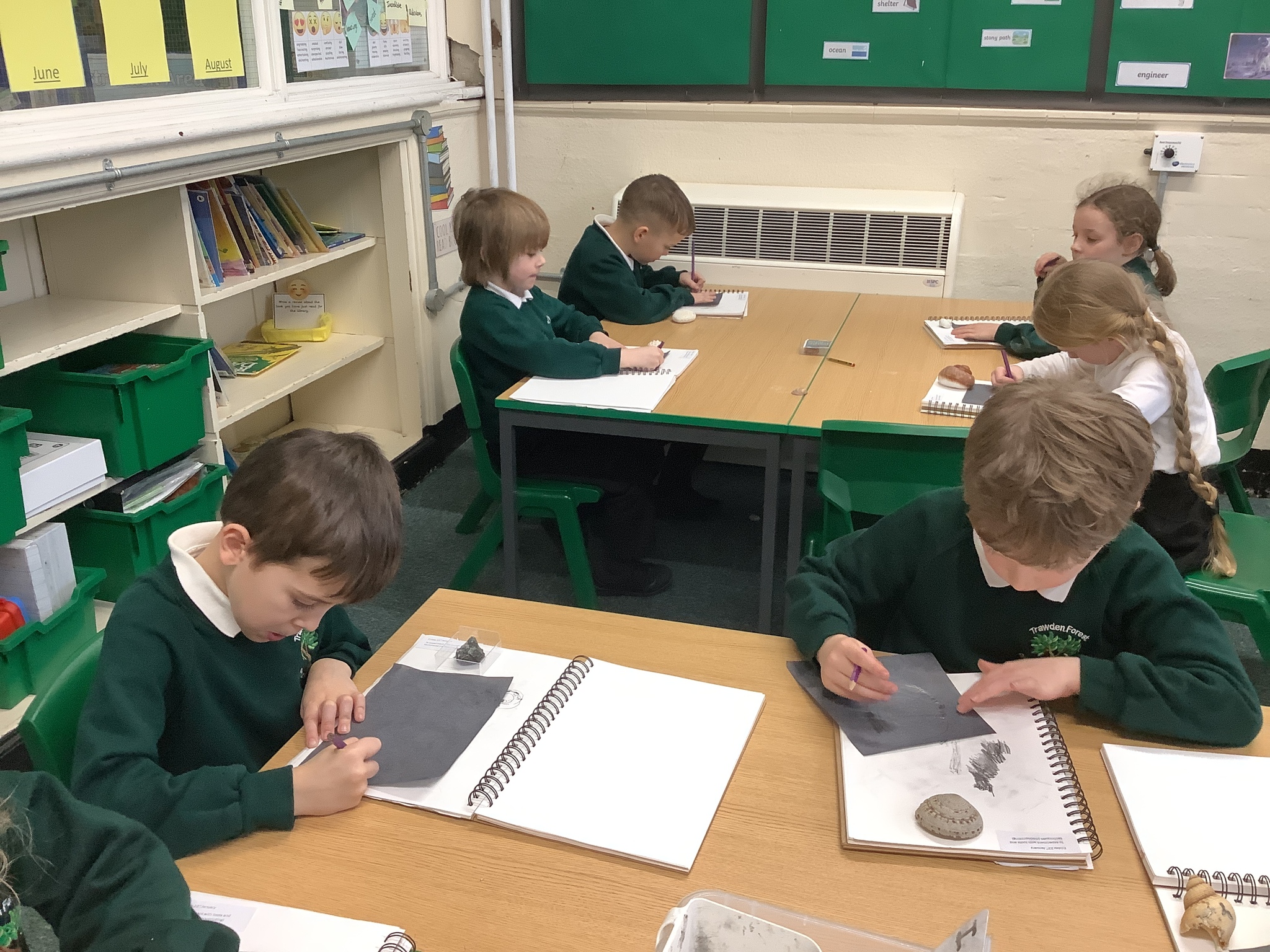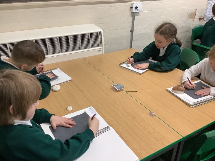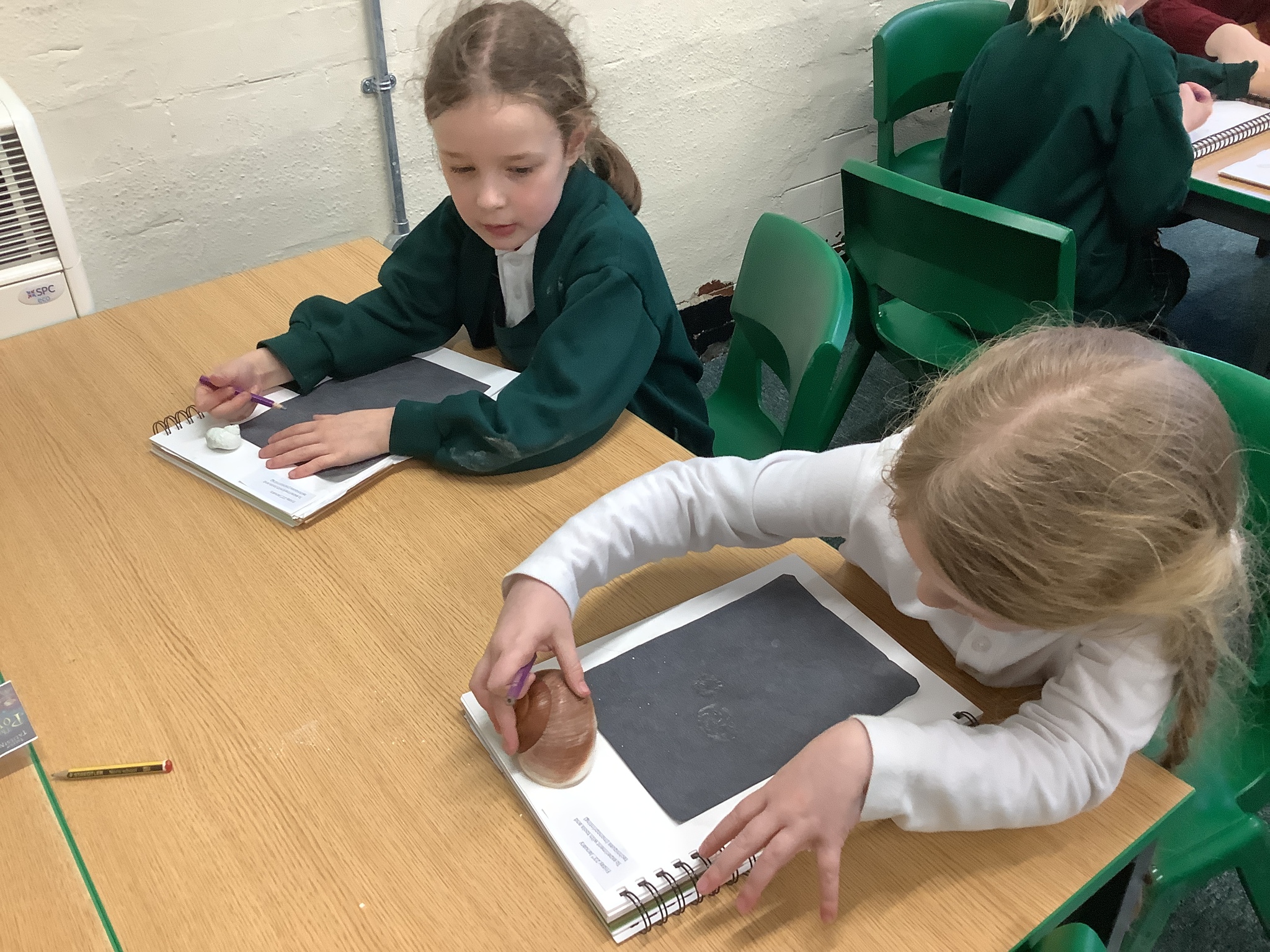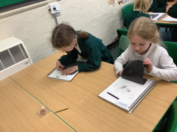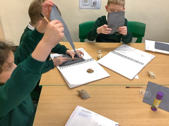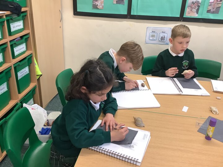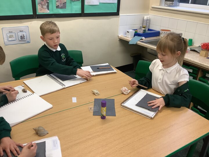 This afternoon, Year 2 have been busy experimenting with carbon paper monoprinting. They carefully drew shells and precious stones on carbon paper, then rubbed pastels over their prints to add beautiful colour and texture.
