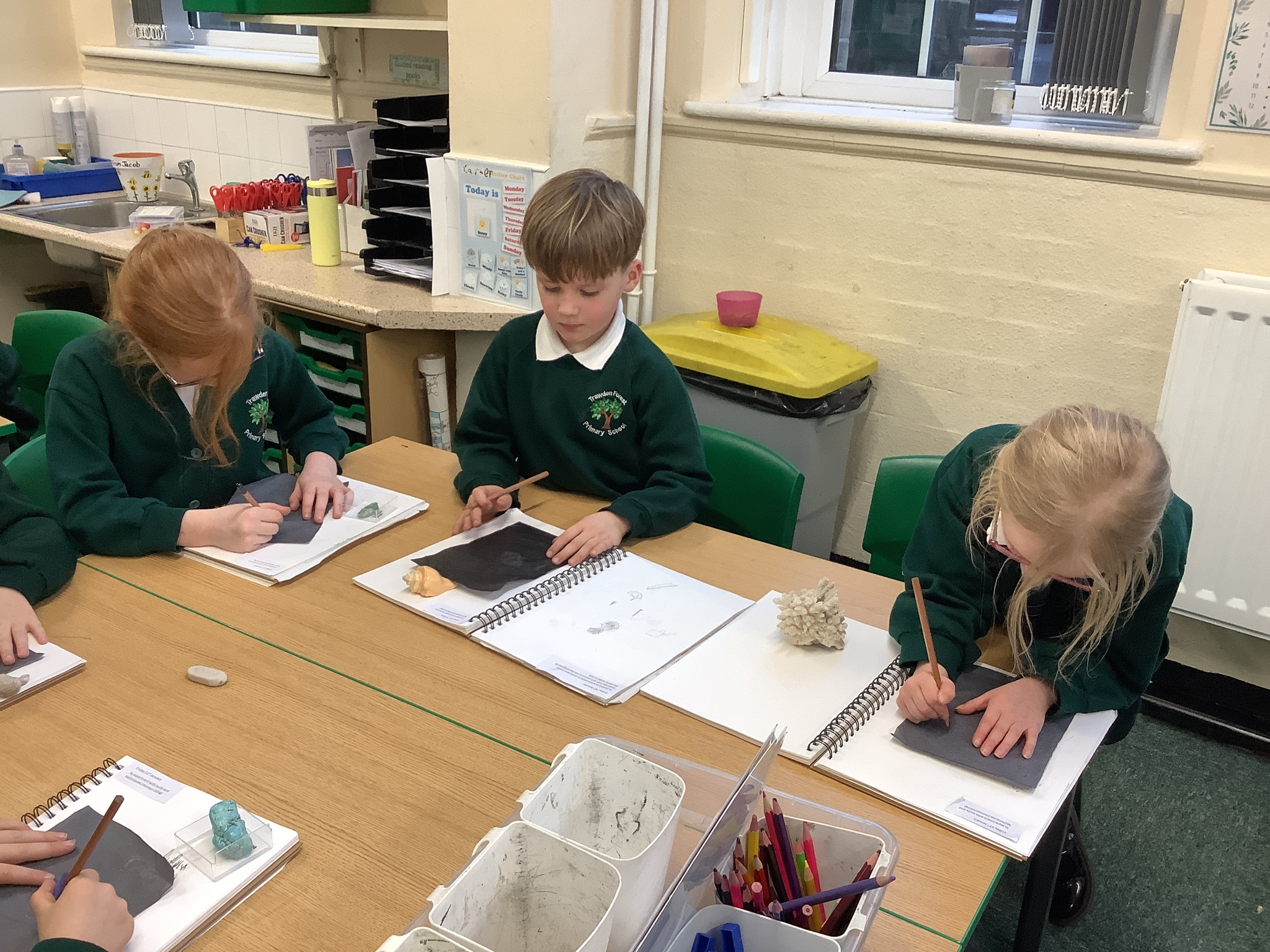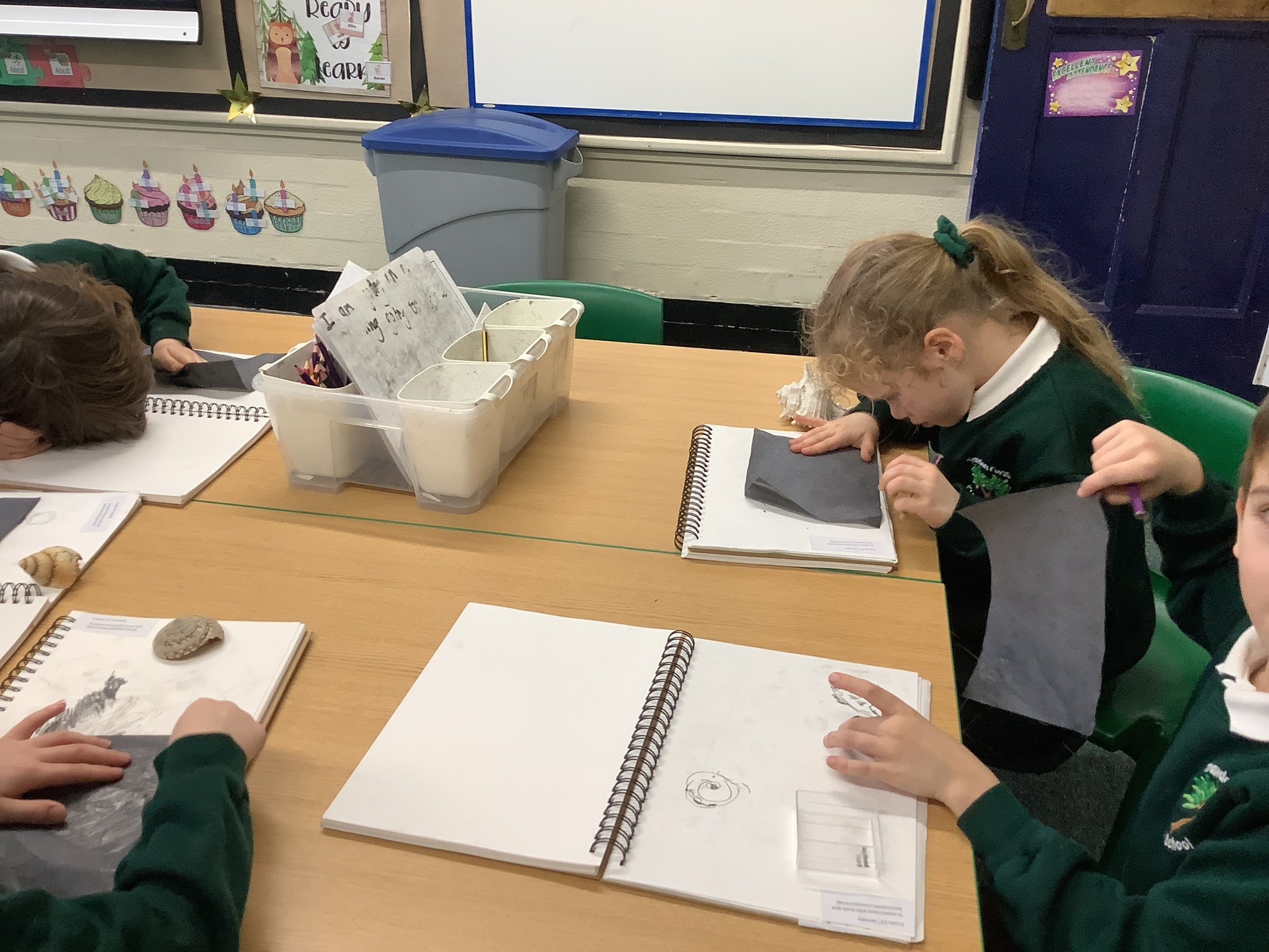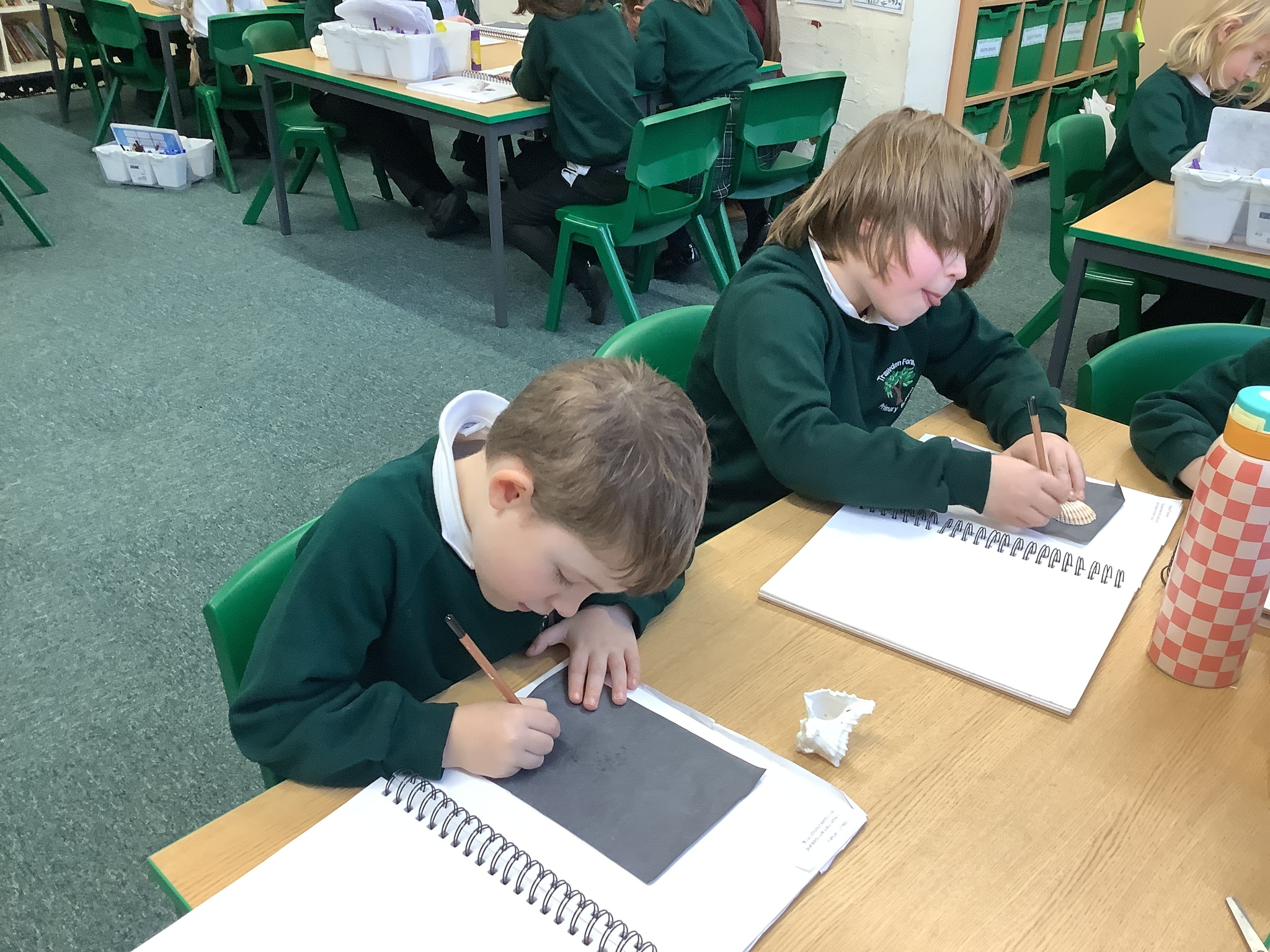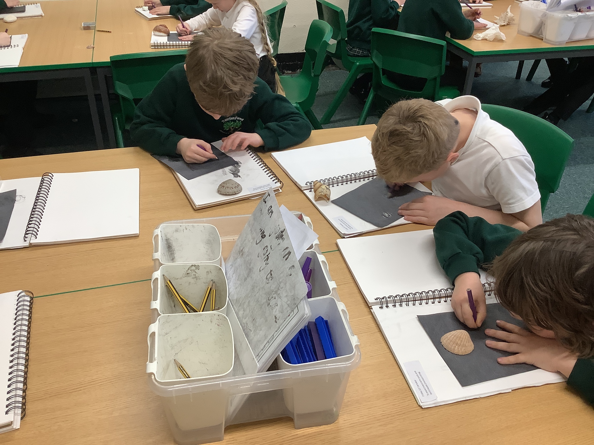 This afternoon, Year 2 have been busy experimenting with carbon paper monoprinting. They carefully drew shells and precious stones on carbon paper, then rubbed pastels over their prints to add beautiful colour and texture.