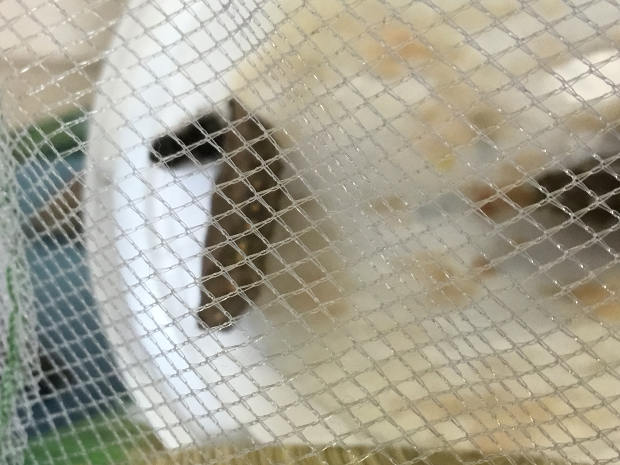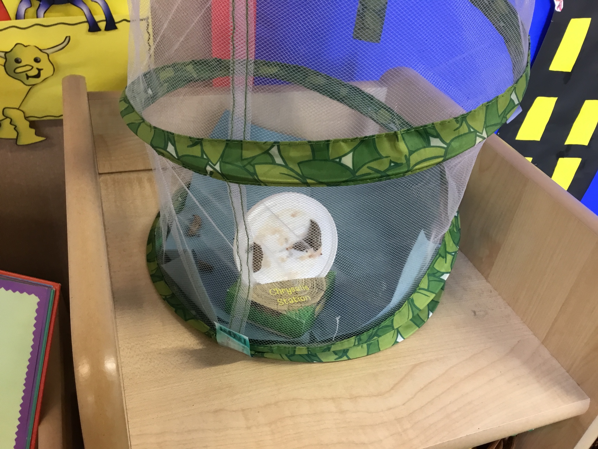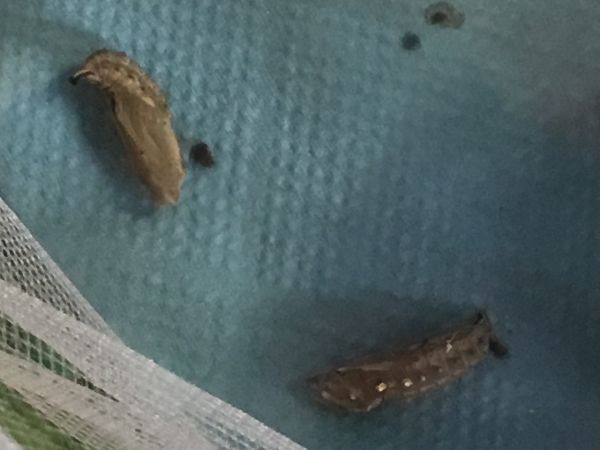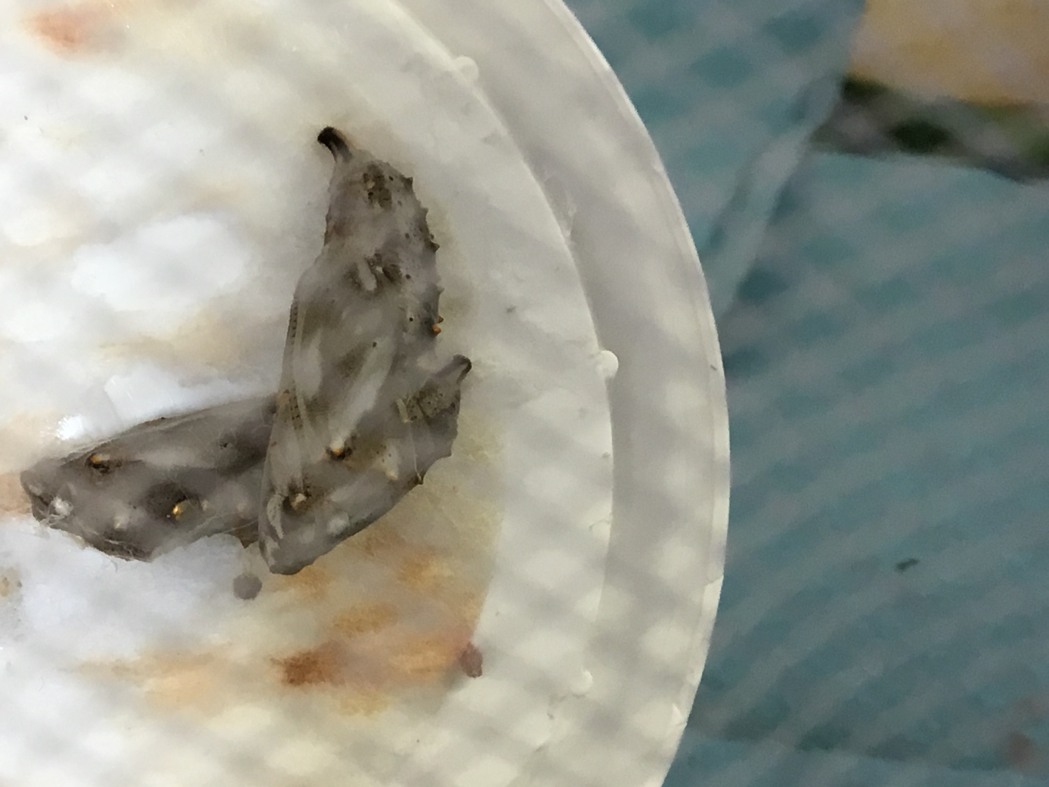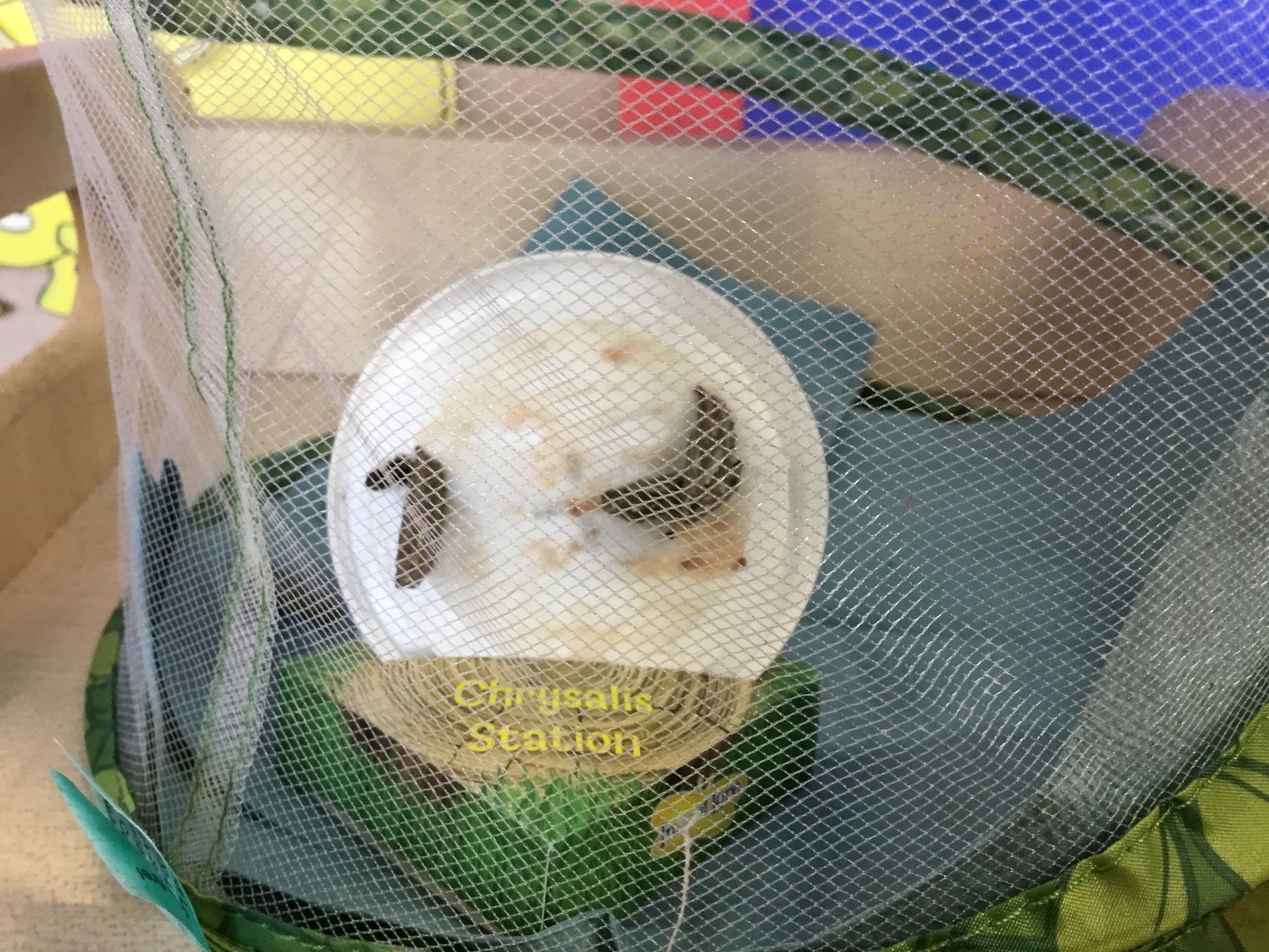 Today we have transferred all 5 caterpillars into the net habitat as they have all become chrysalides and have hardened ready for the transformation to take place. Two of the chrysalides had been knocked to the bottom of the pot by the other caterpillars whilst they were getting ready but they will be fine laid gently in the habitat.