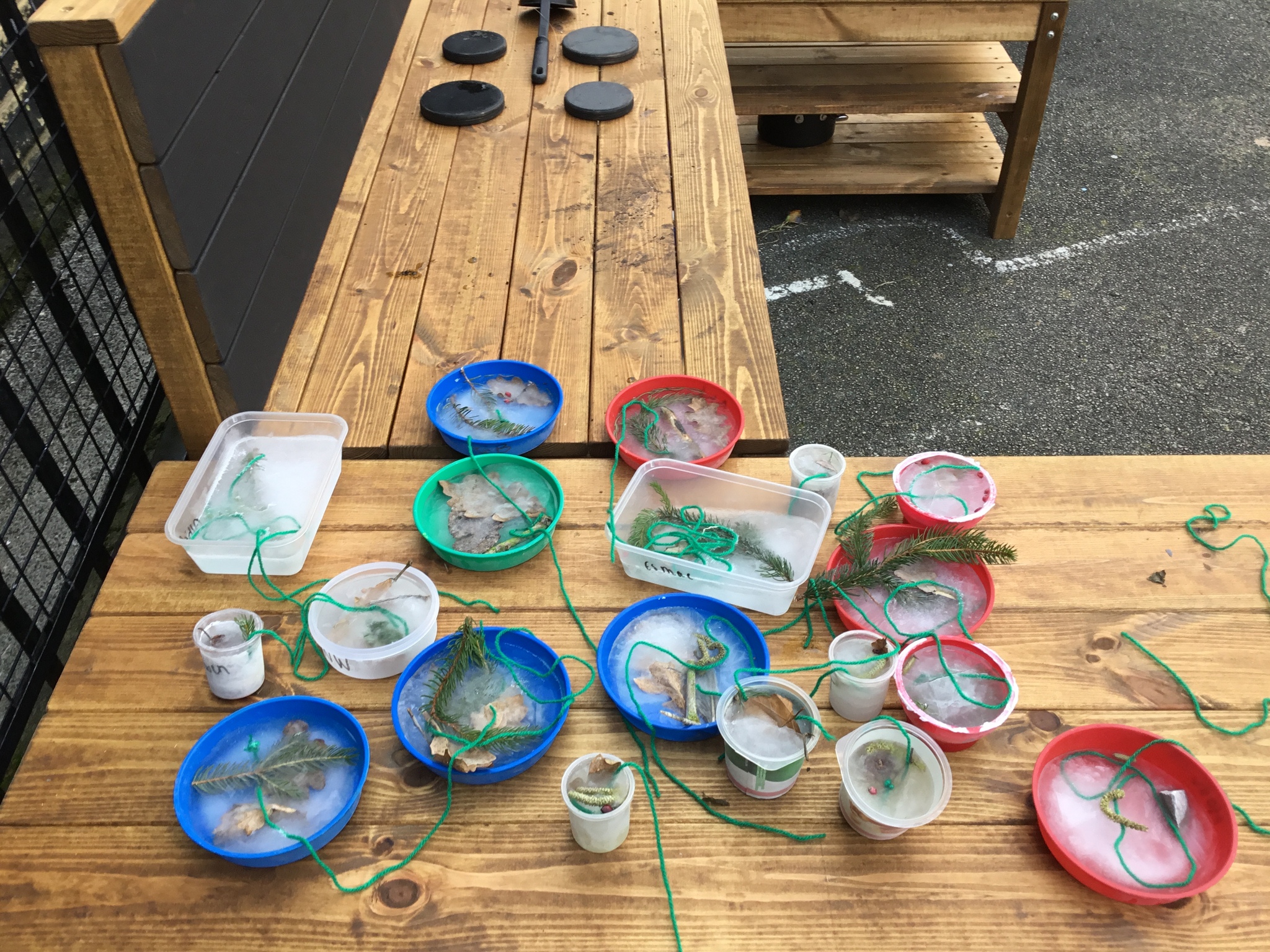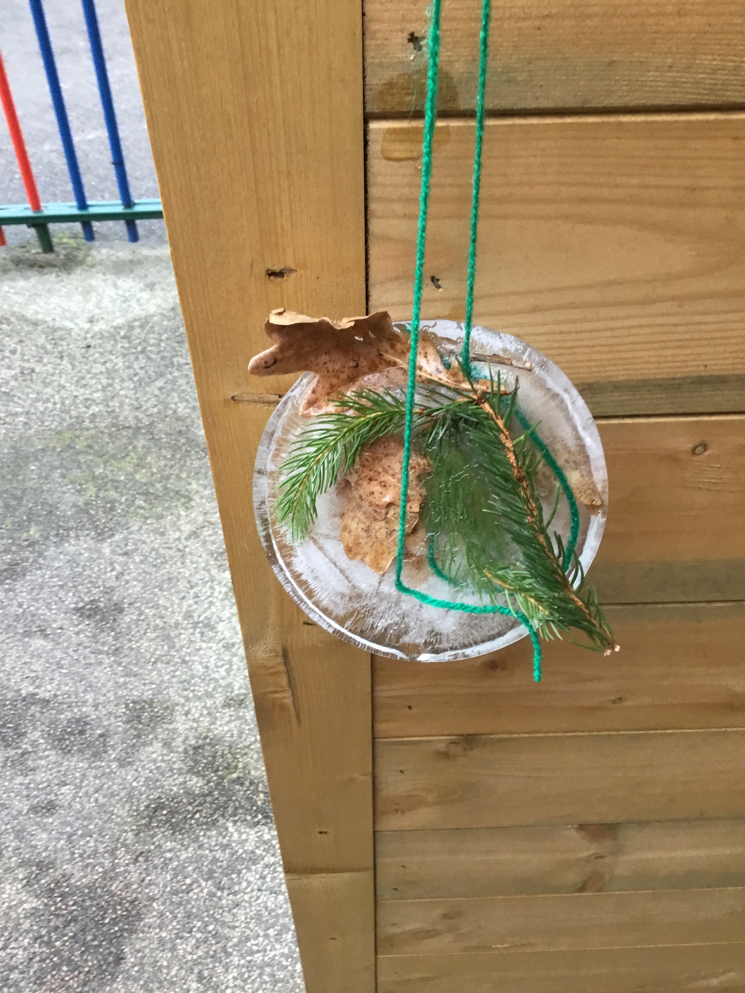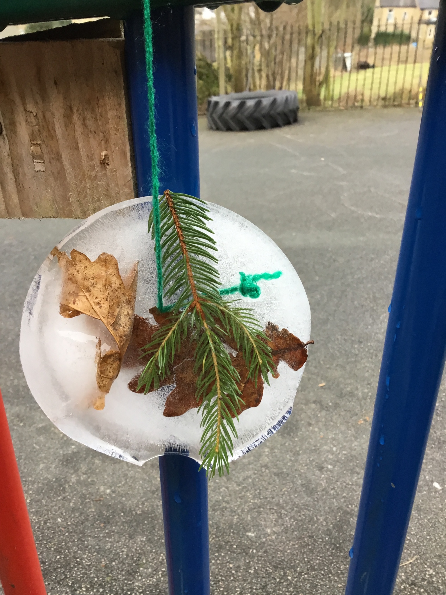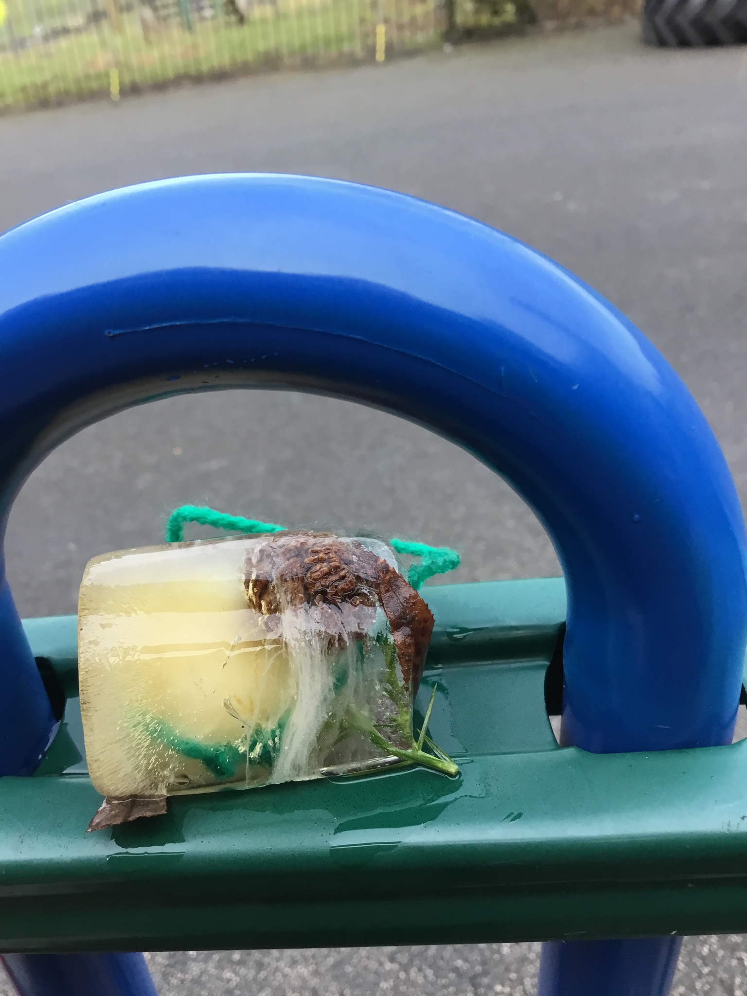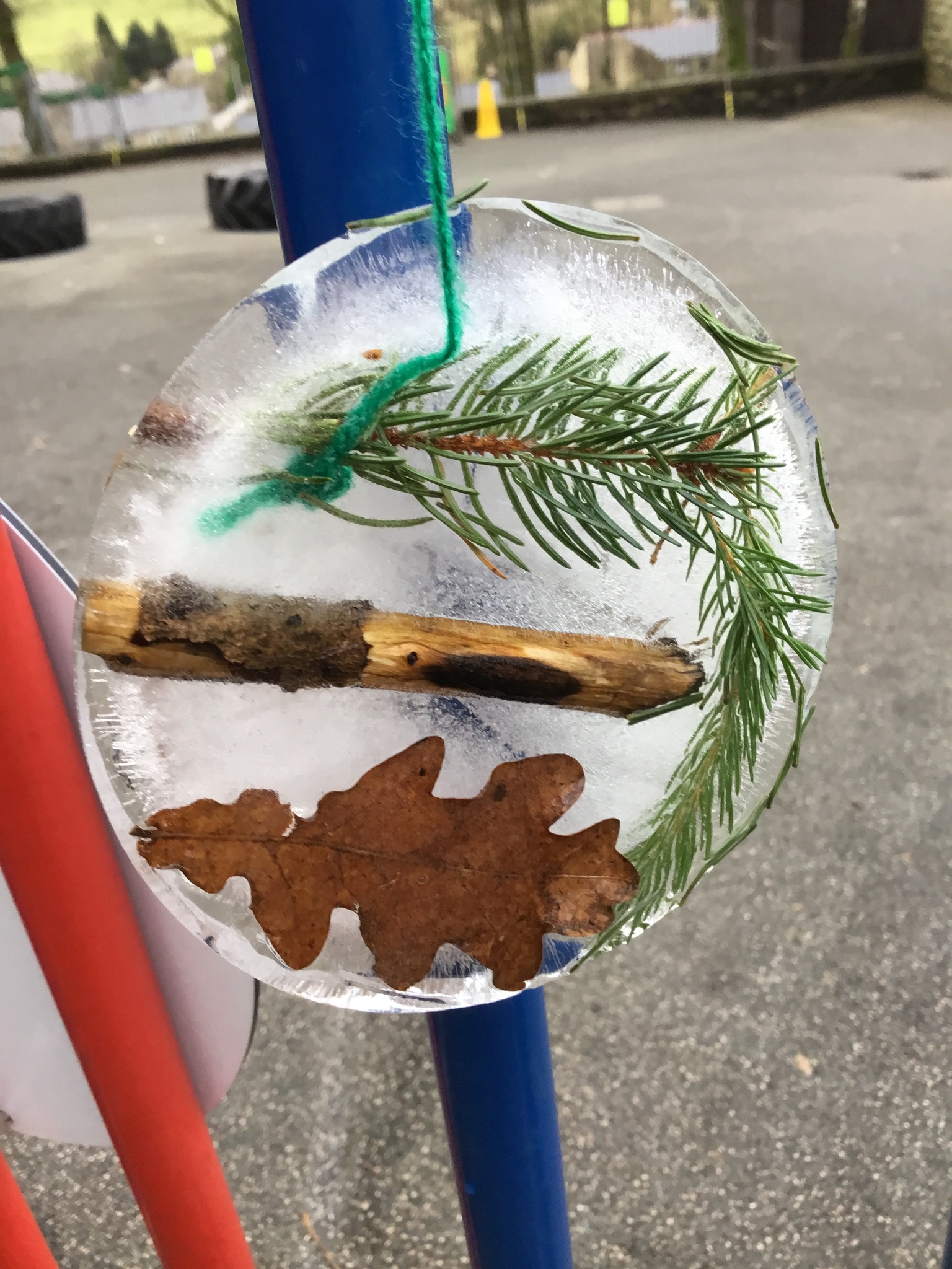 To link Forest School with our ice topic we made some pieces of ice art. We collected interesting natural items from the forest then added water and froze them.