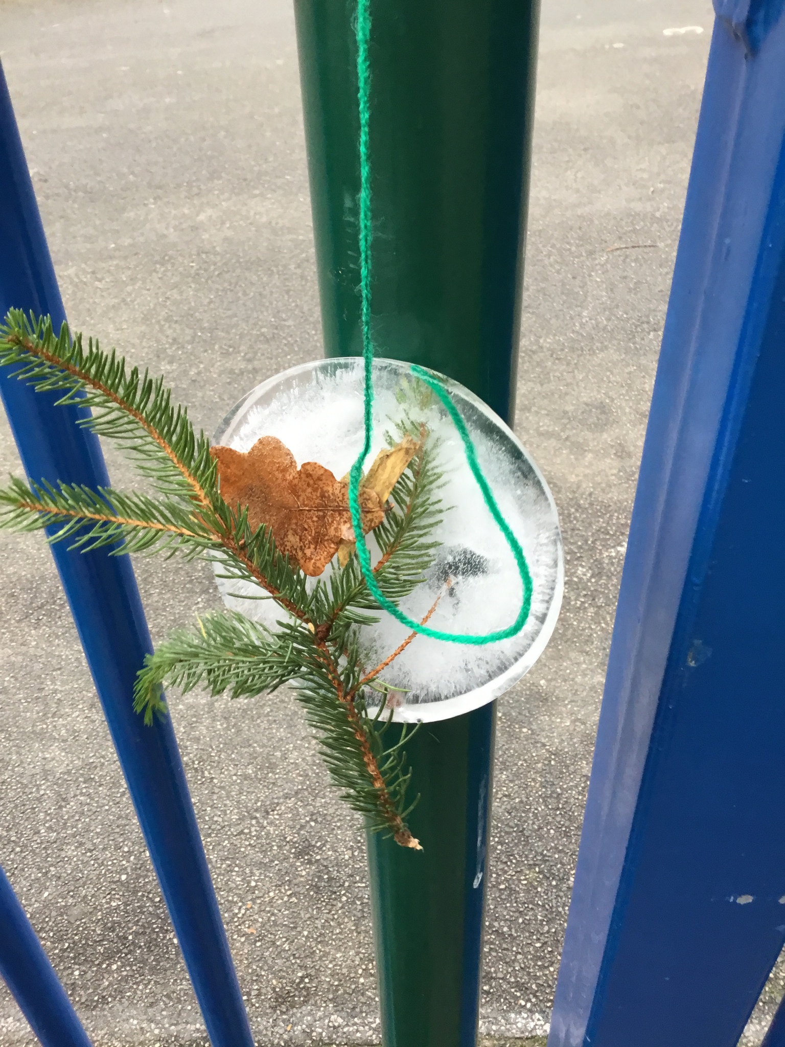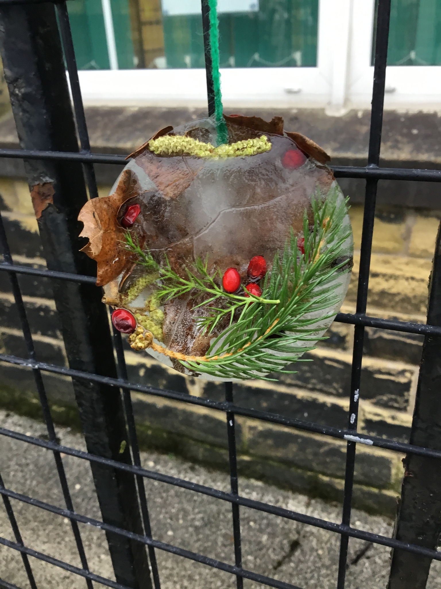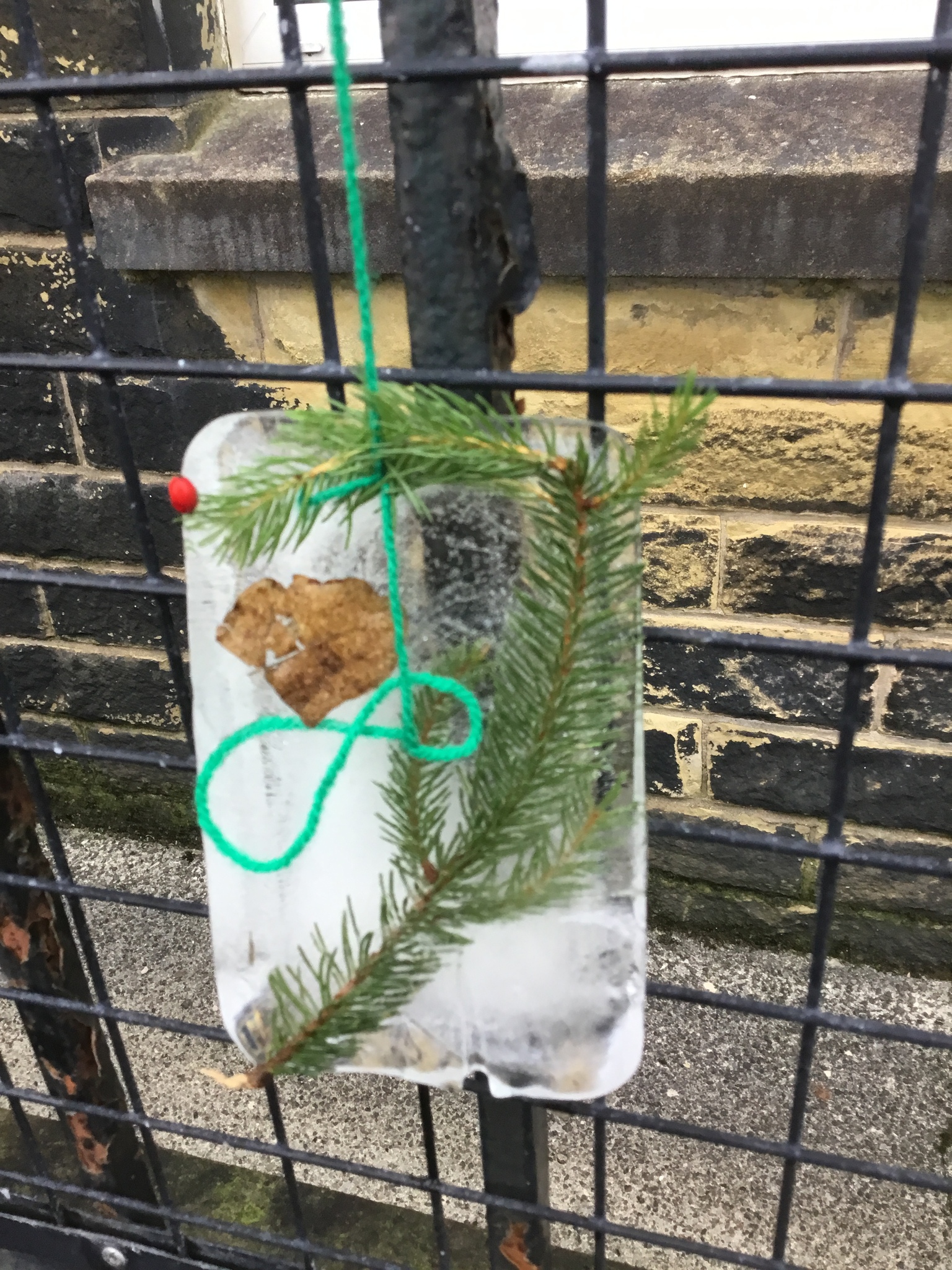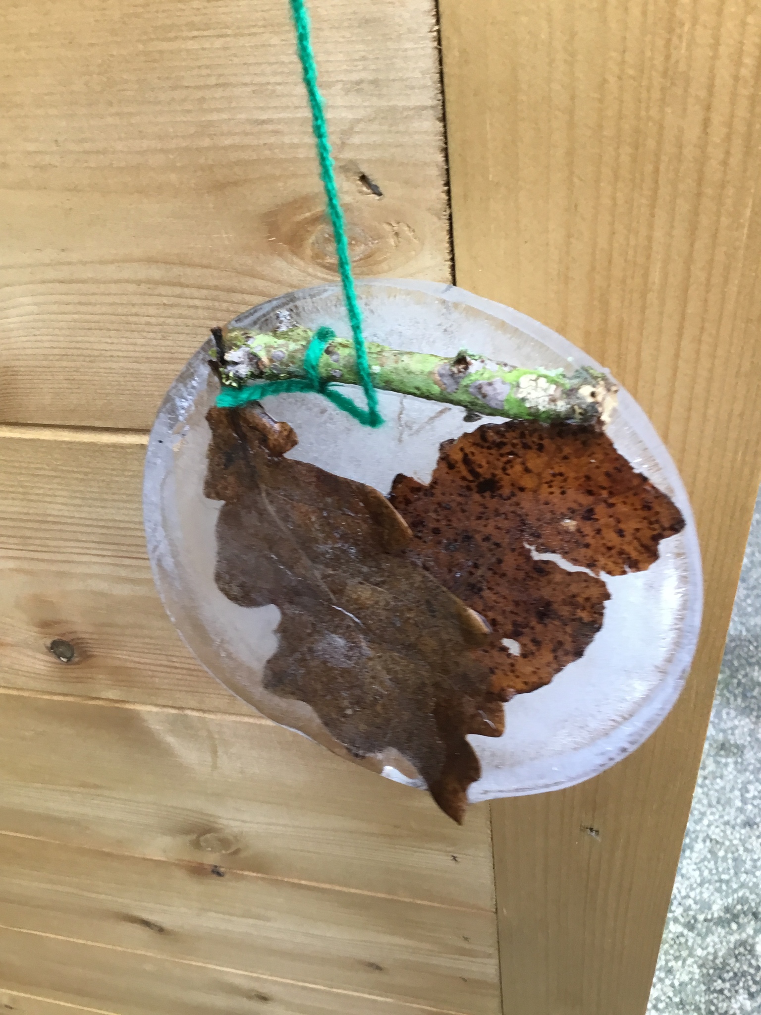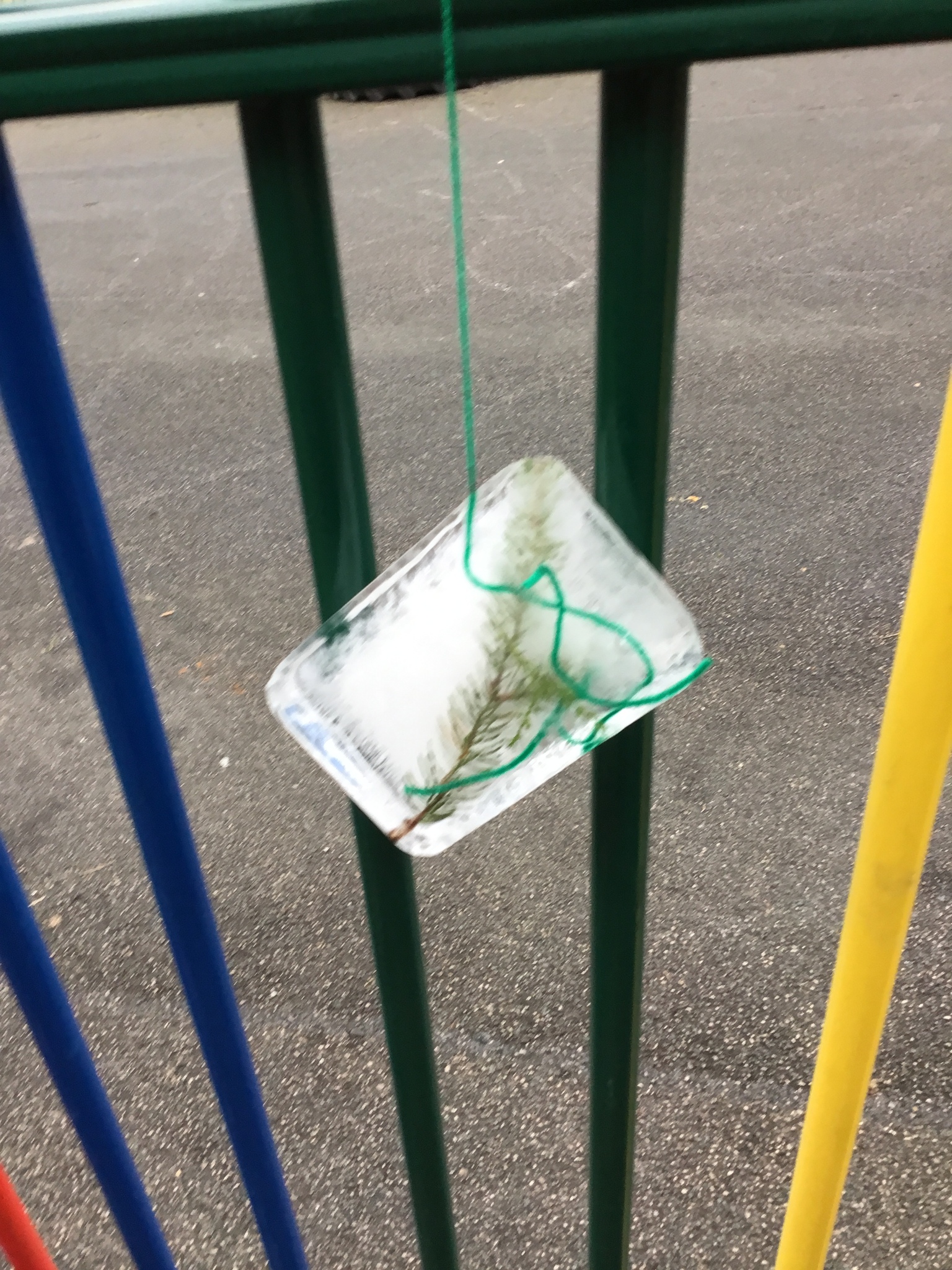 To link Forest School with our ice topic we made some pieces of ice art. We collected interesting natural items from the forest then added water and froze them.
