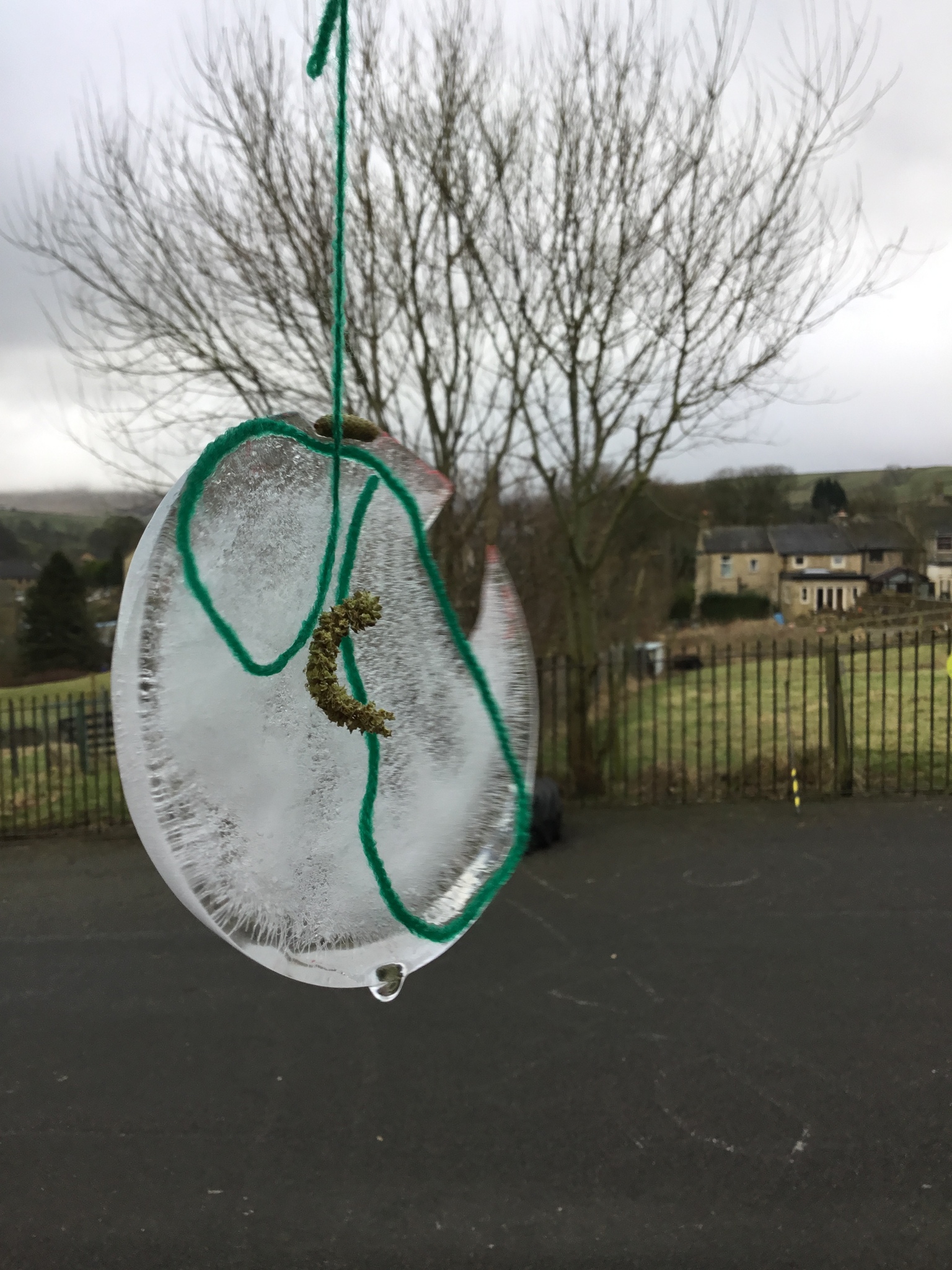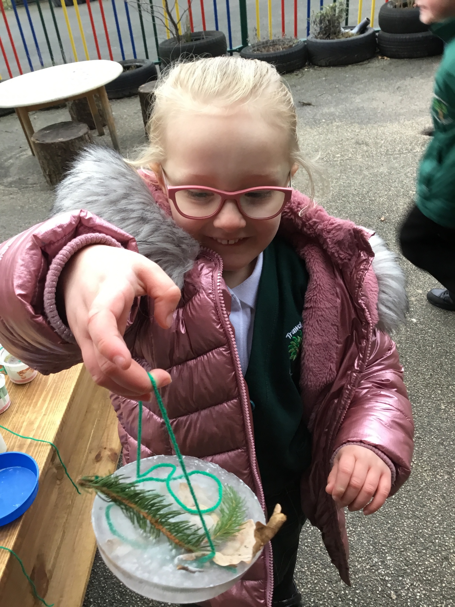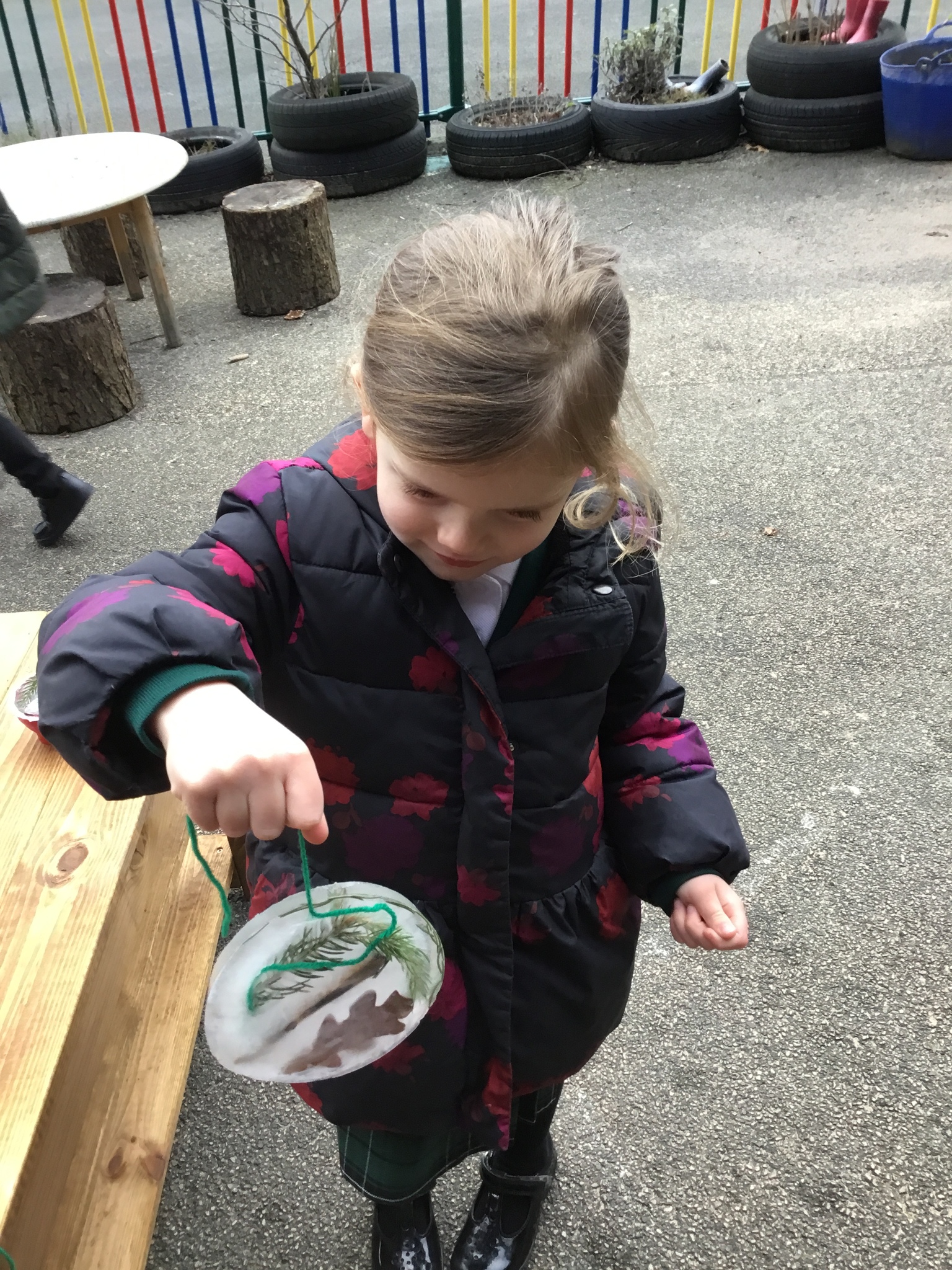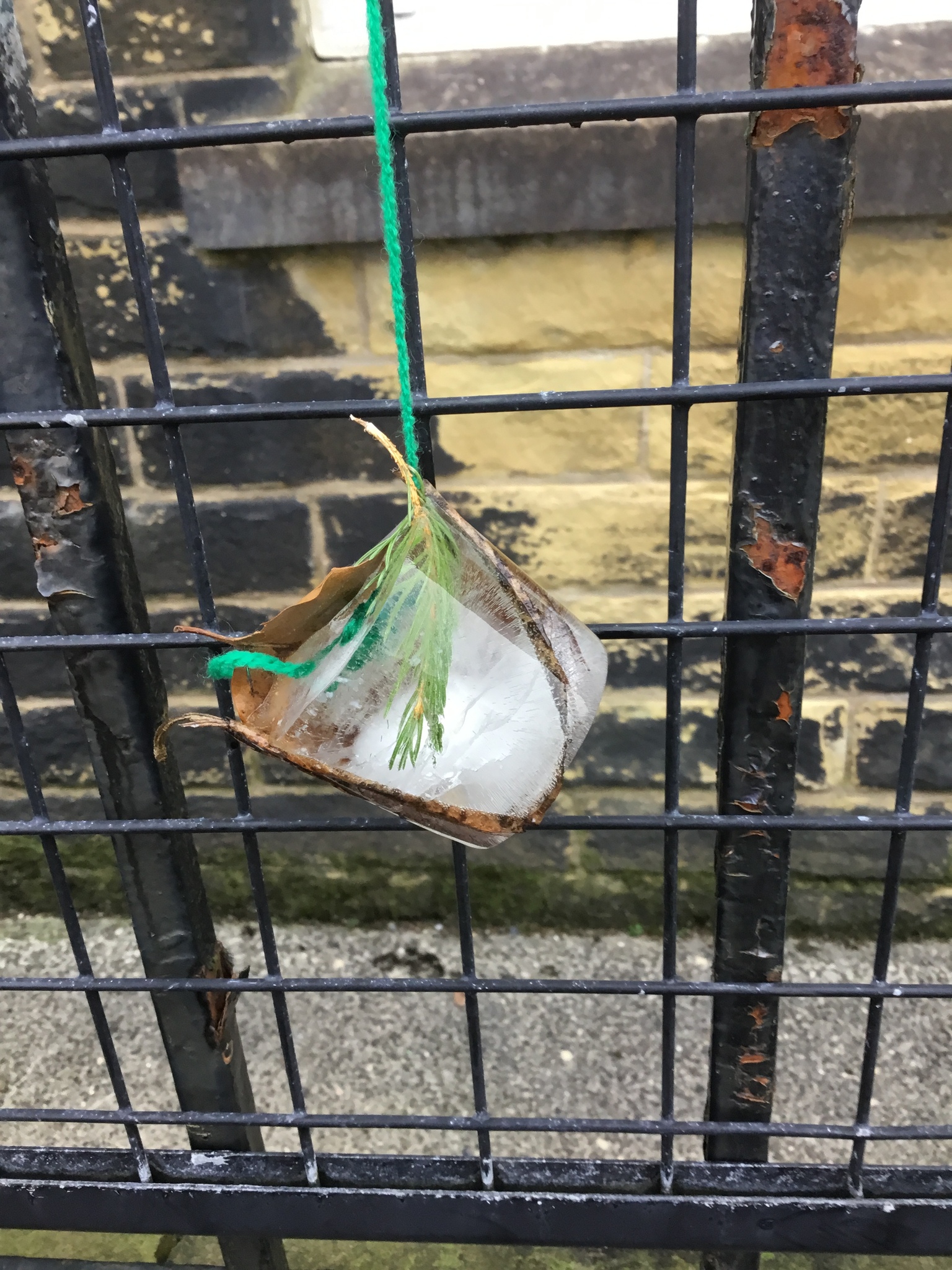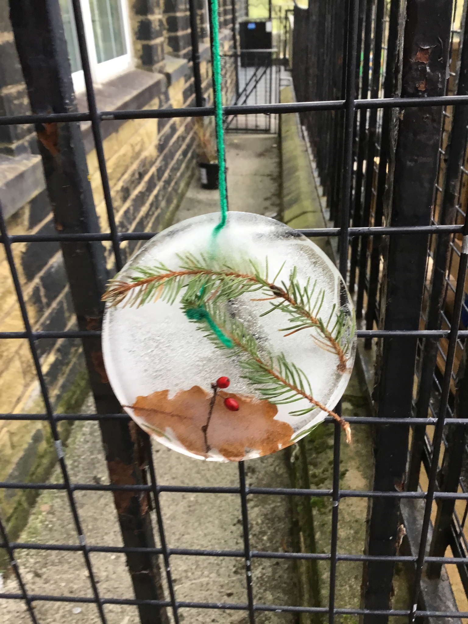 To link Forest School with our ice topic we made some pieces of ice art. We collected interesting natural items from the forest then added water and froze them.