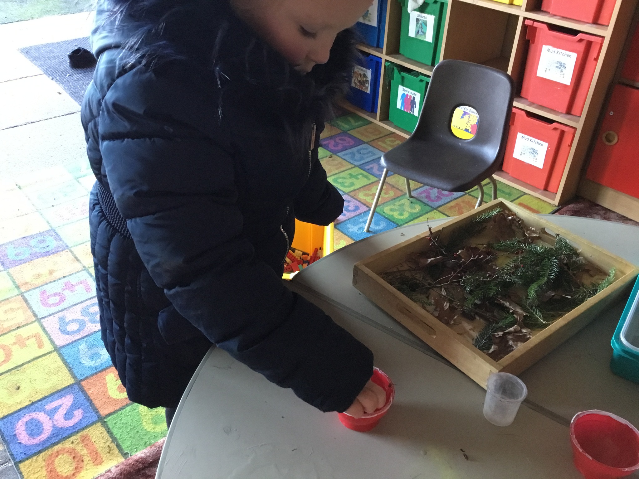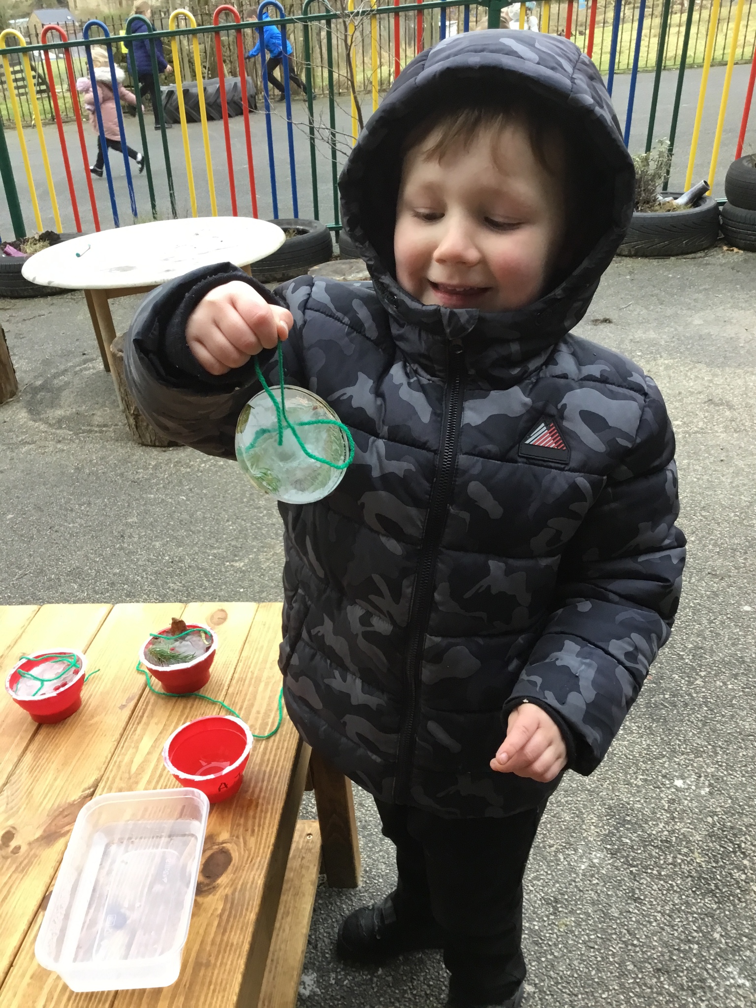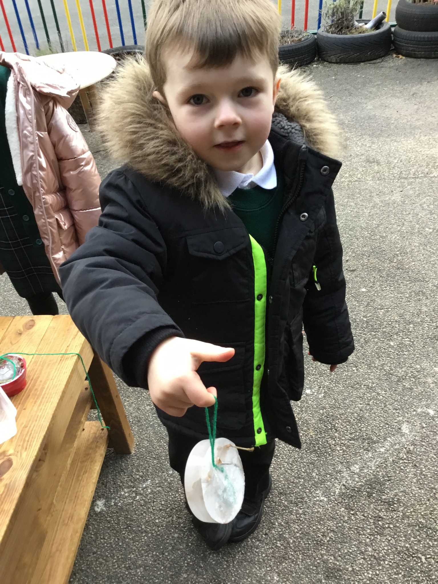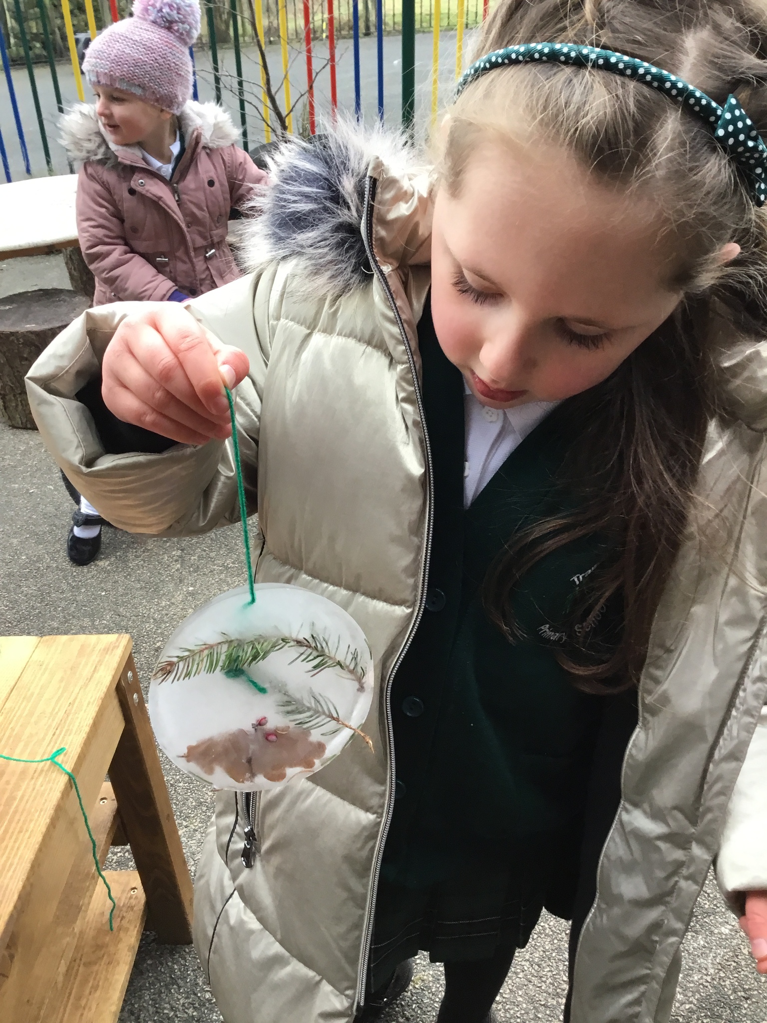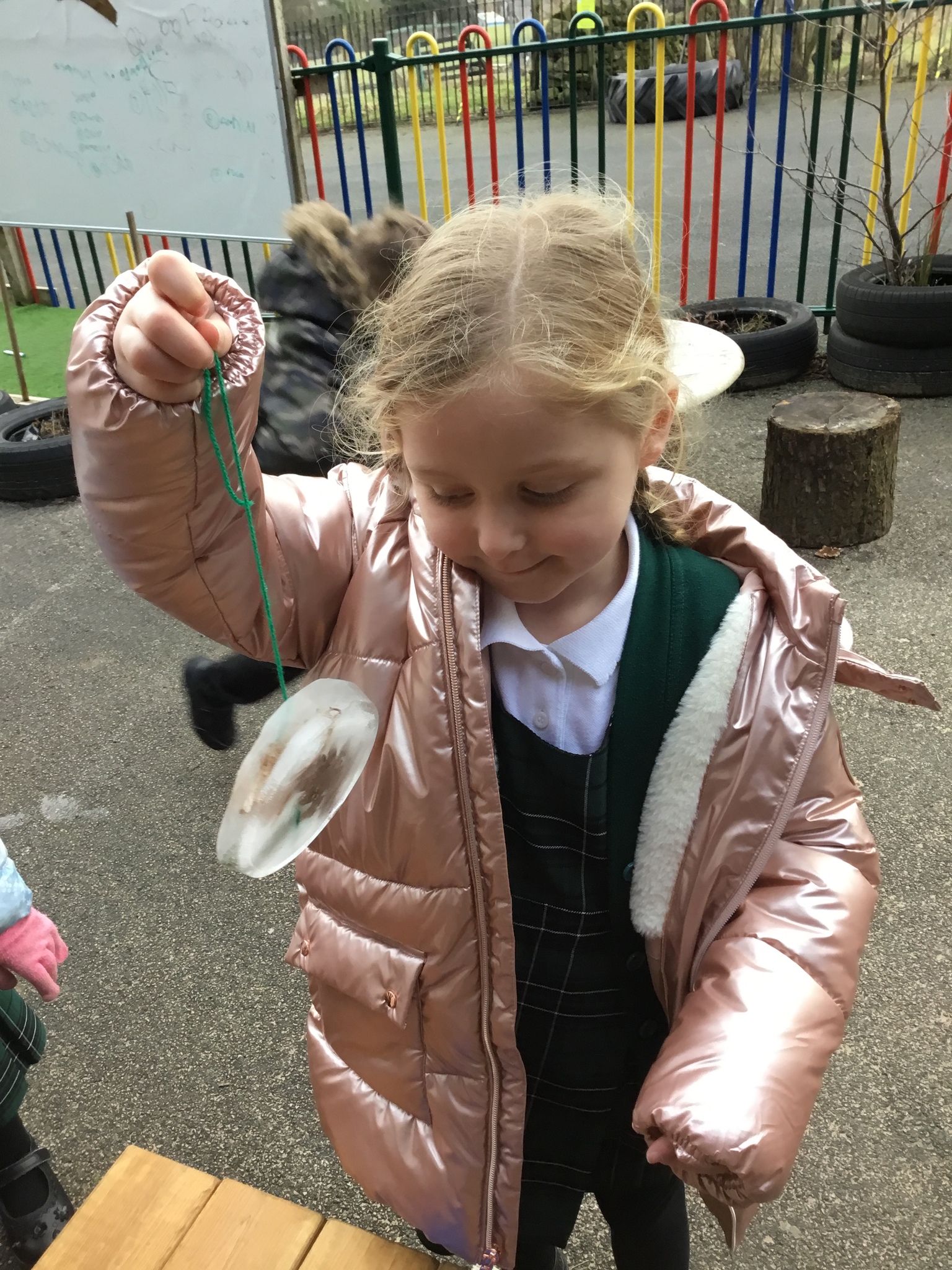 To link Forest School with our ice topic we made some pieces of ice art. We collected interesting natural items from the forest then added water and froze them.