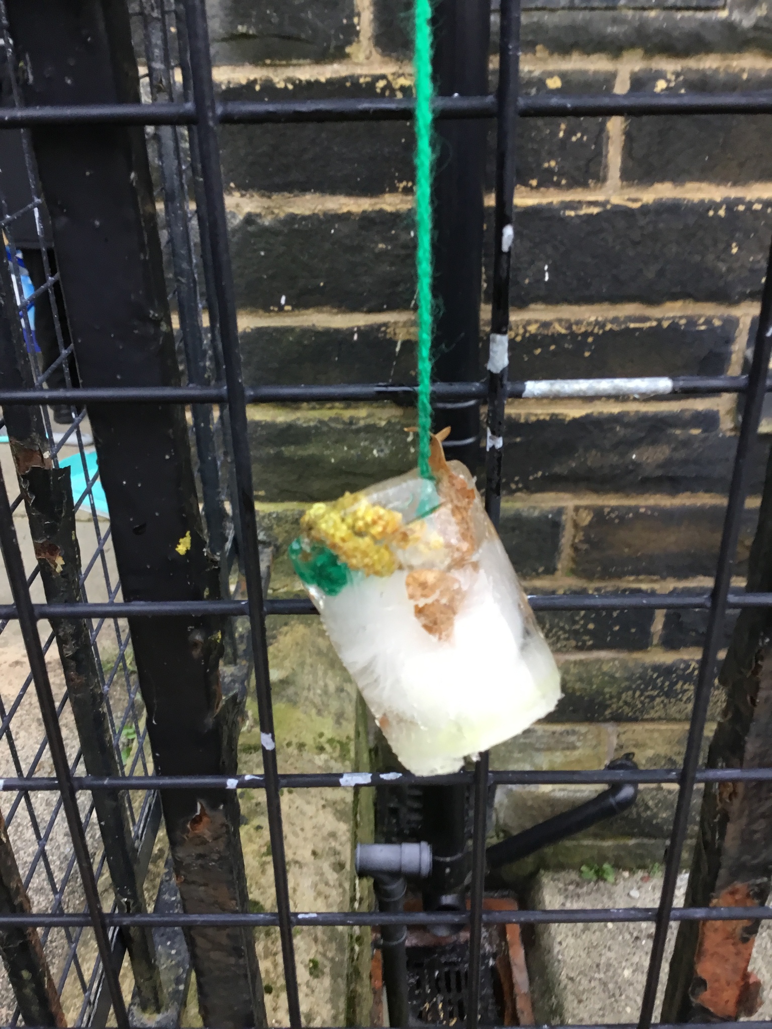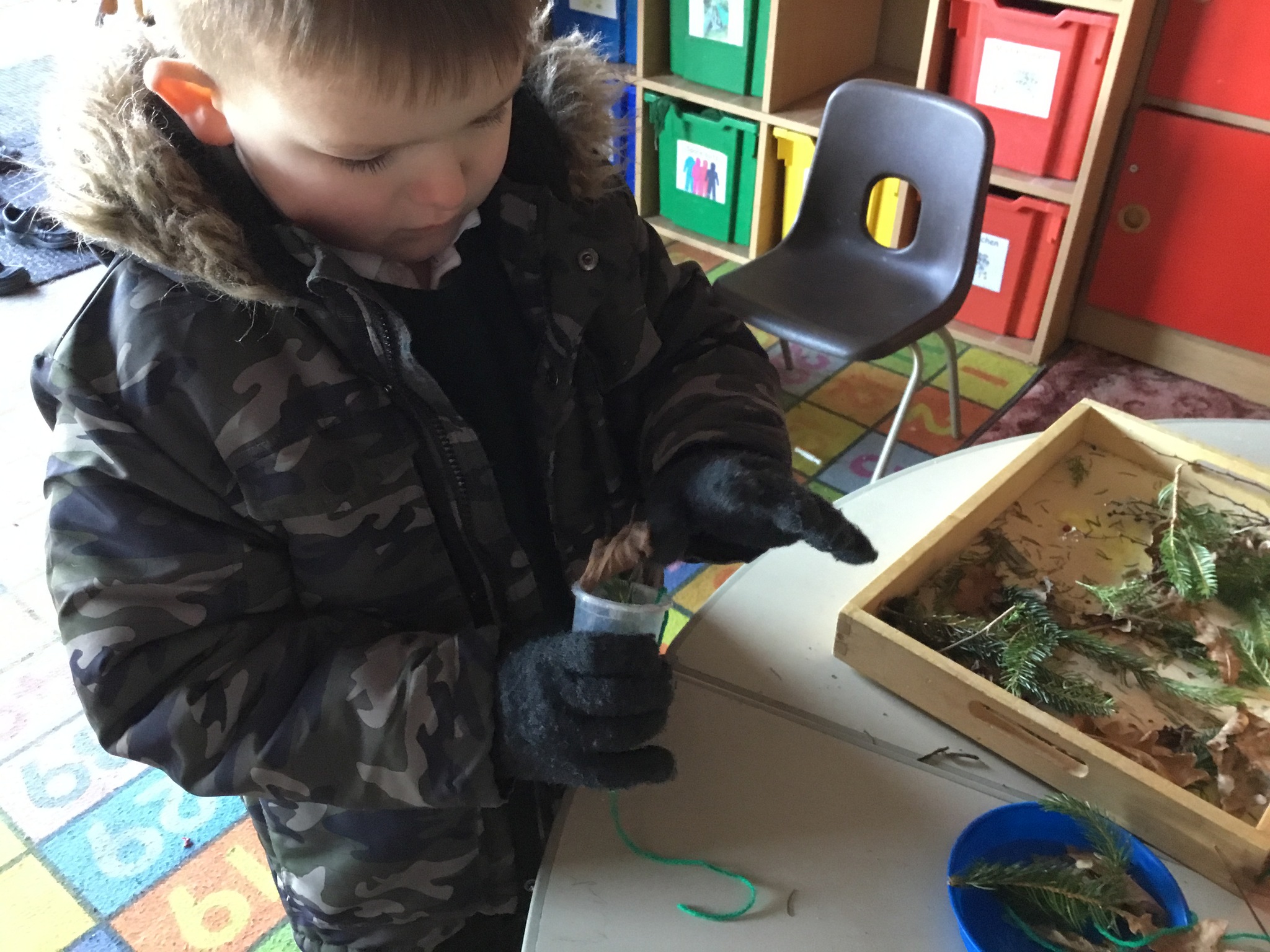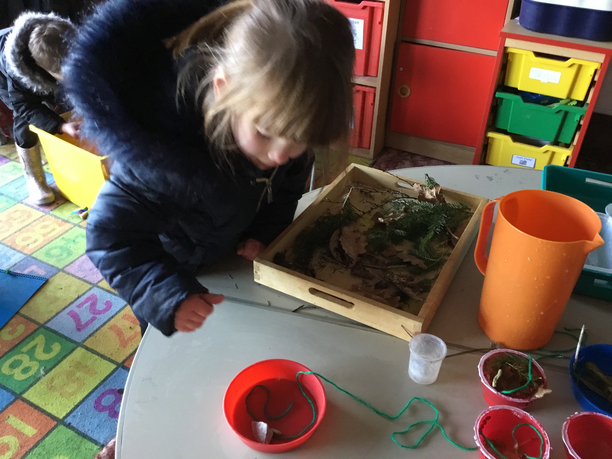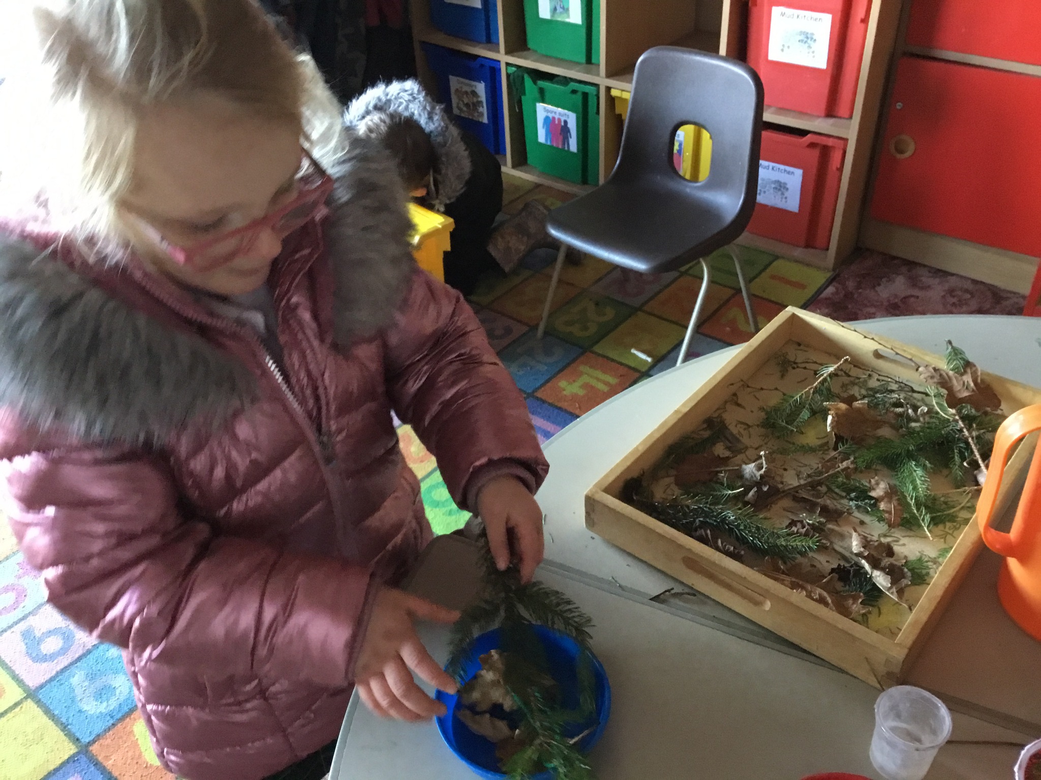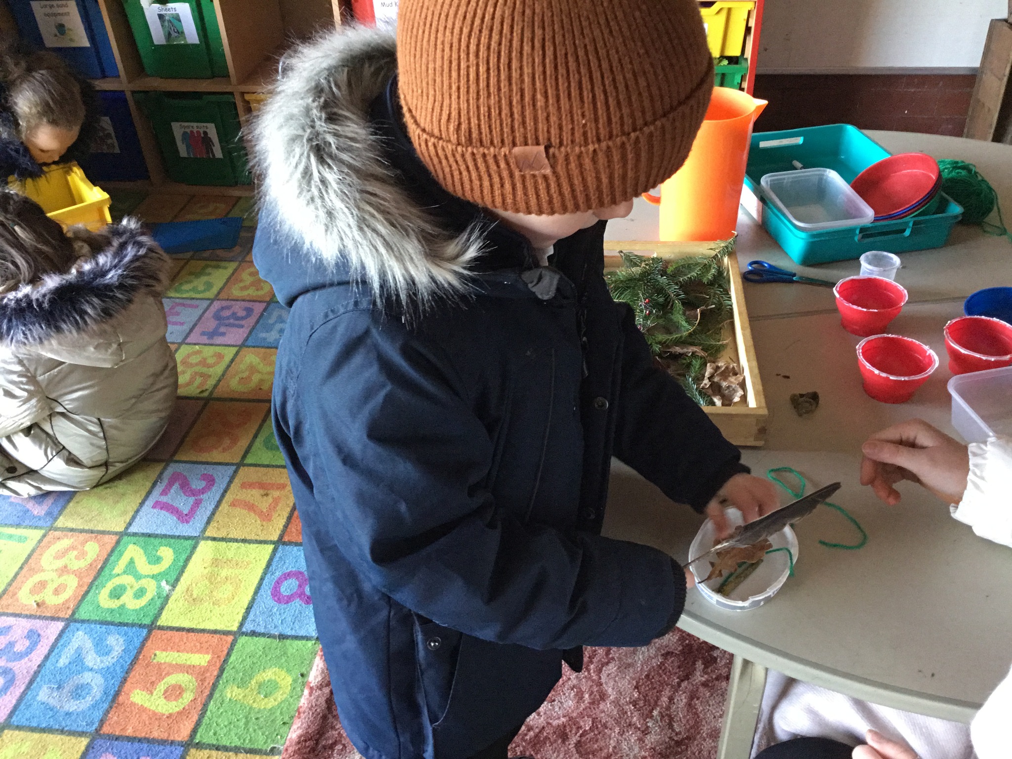 To link Forest School with our ice topic we made some pieces of ice art. We collected interesting natural items from the forest then added water and froze them.