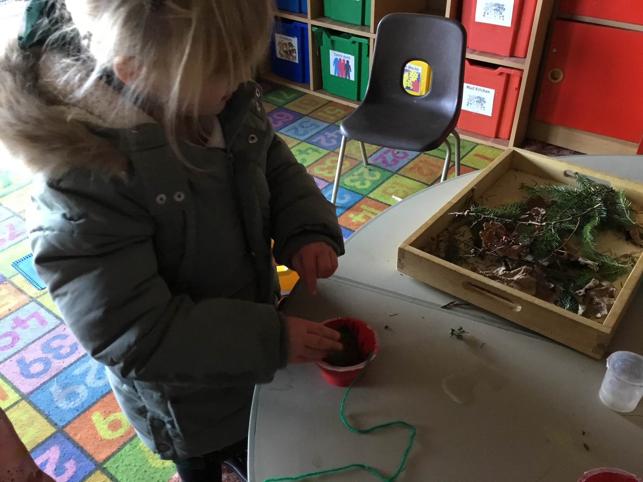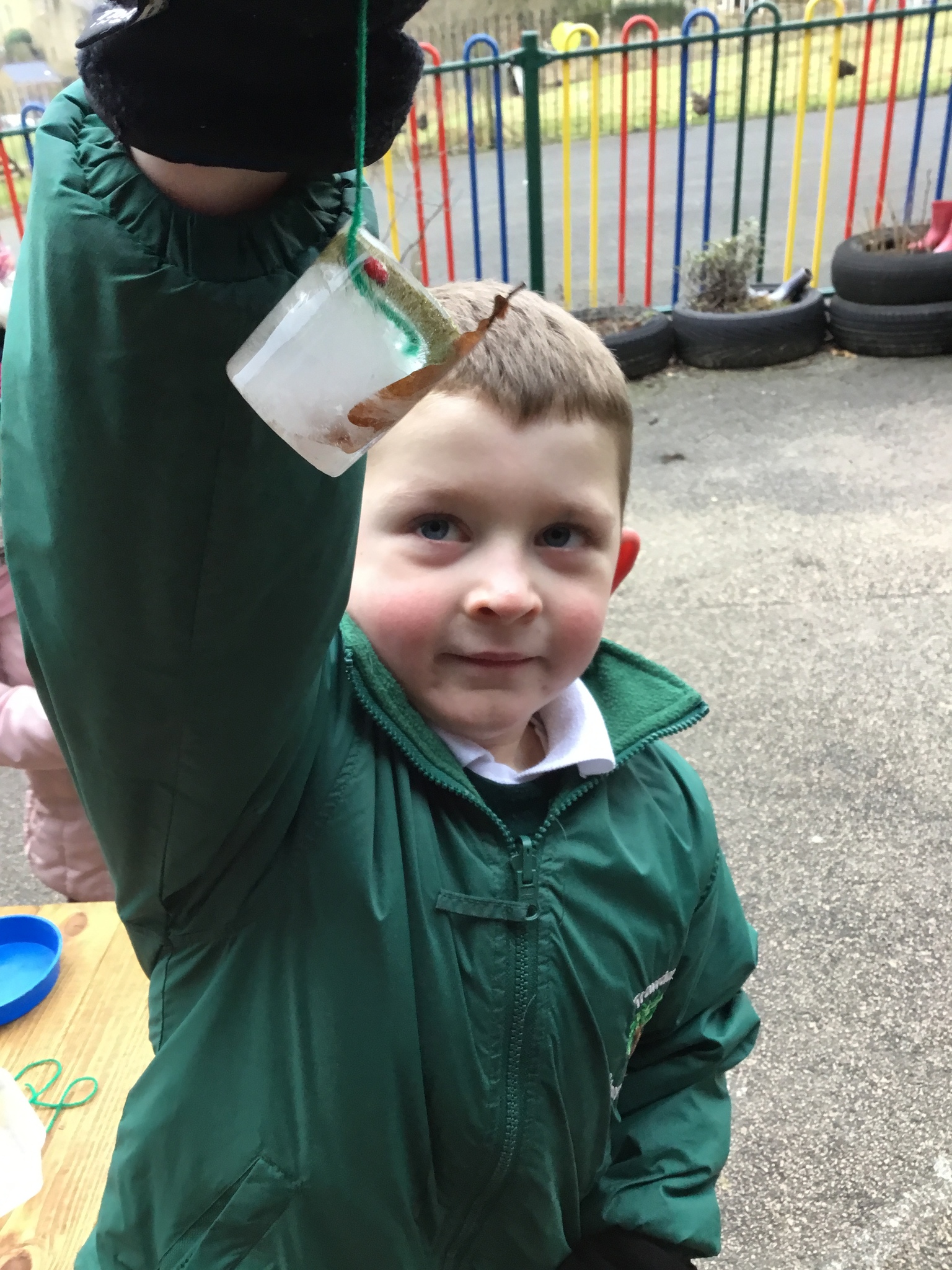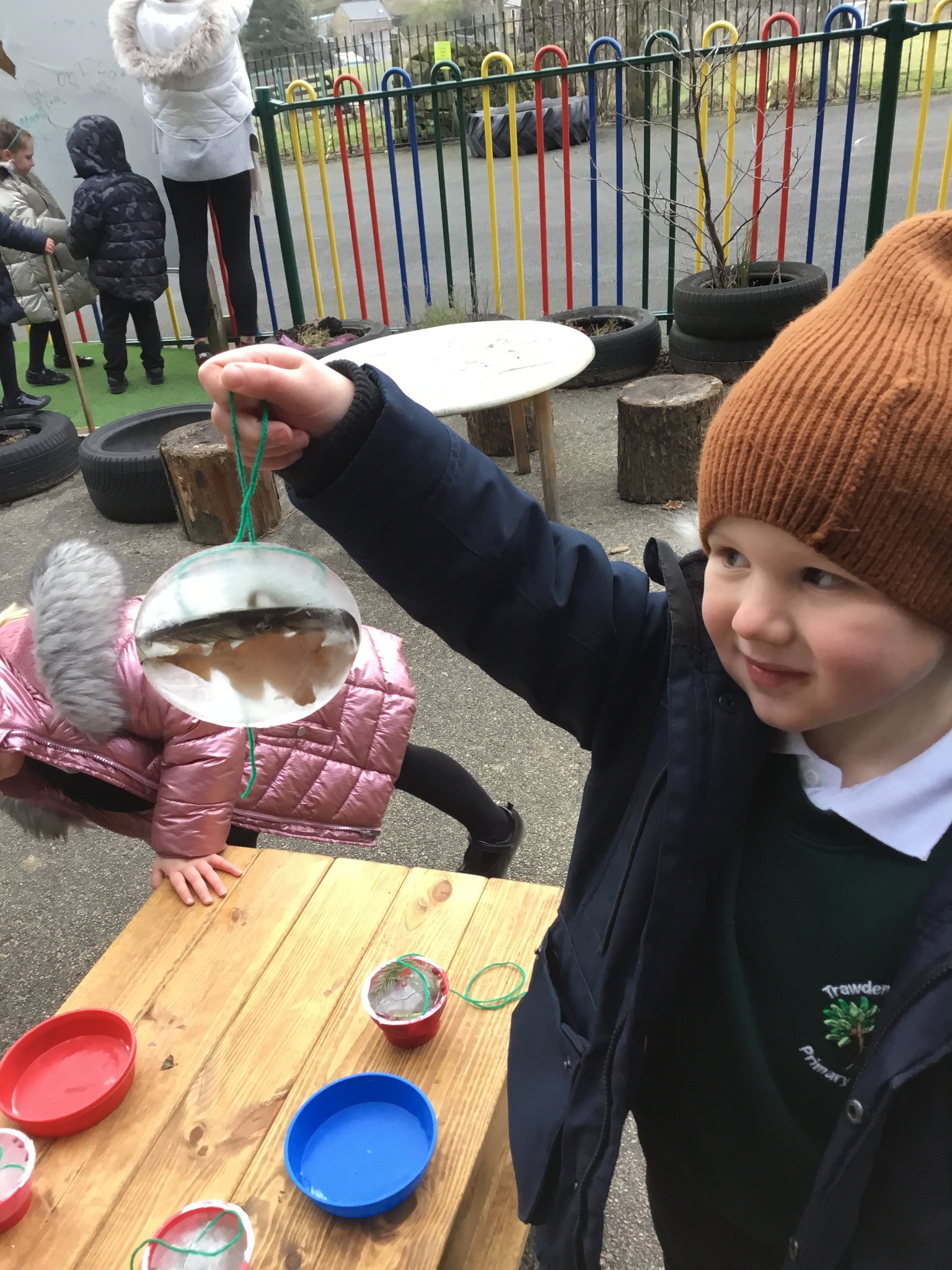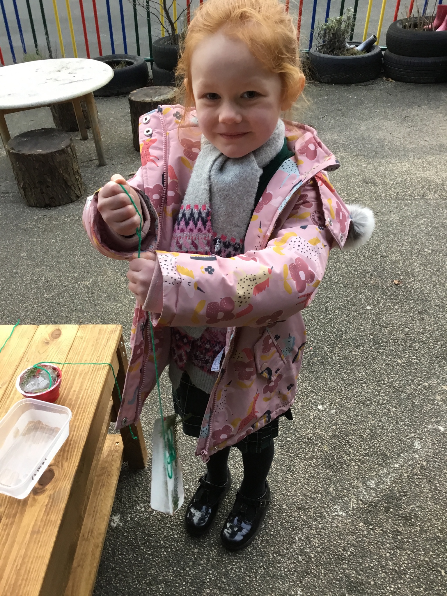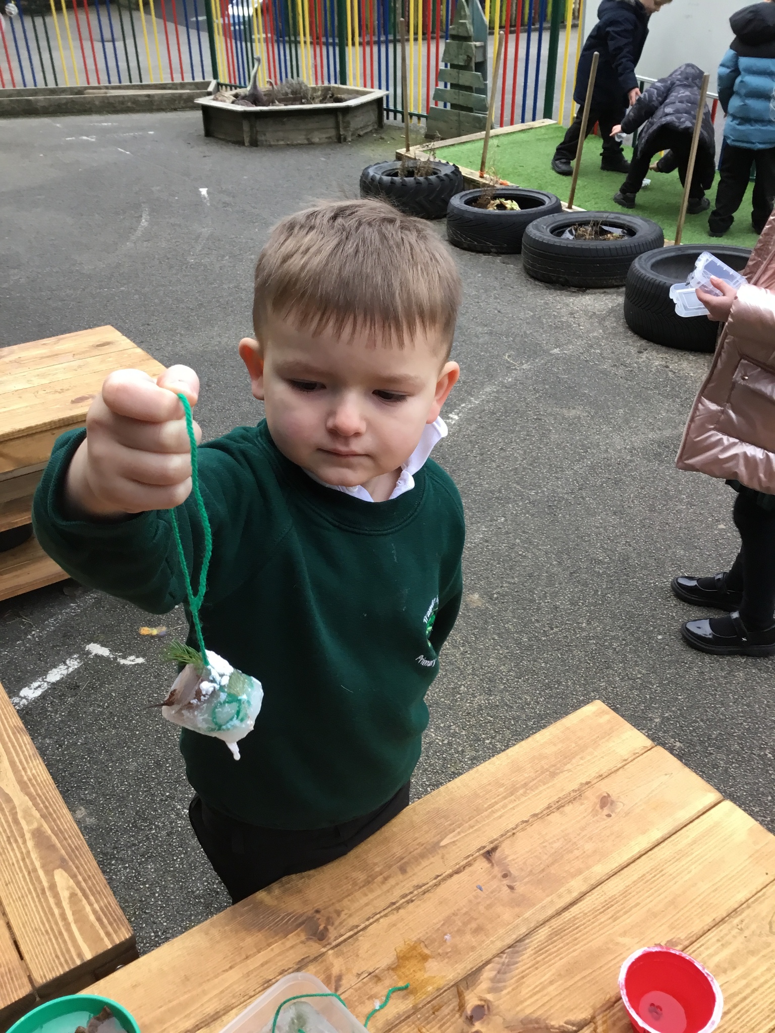 To link Forest School with our ice topic we made some pieces of ice art. We collected interesting natural items from the forest then added water and froze them.