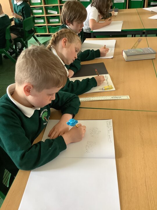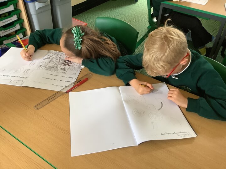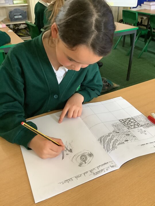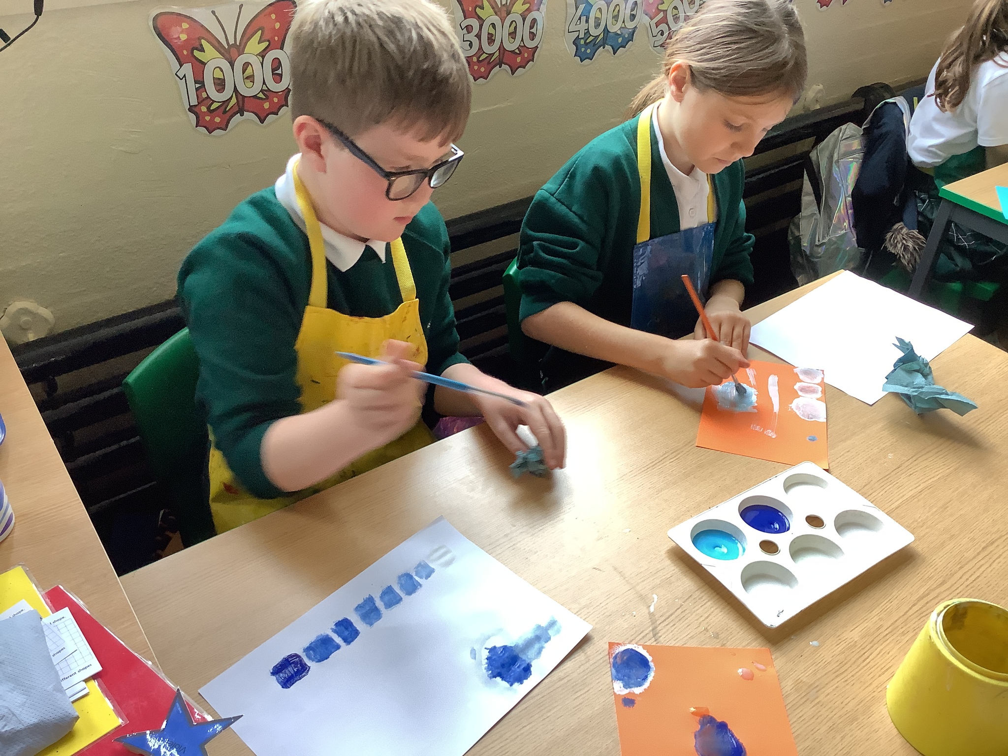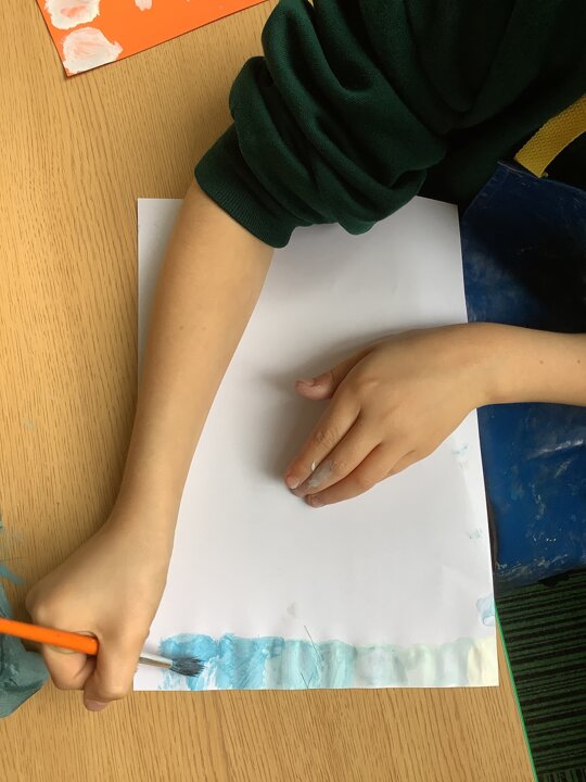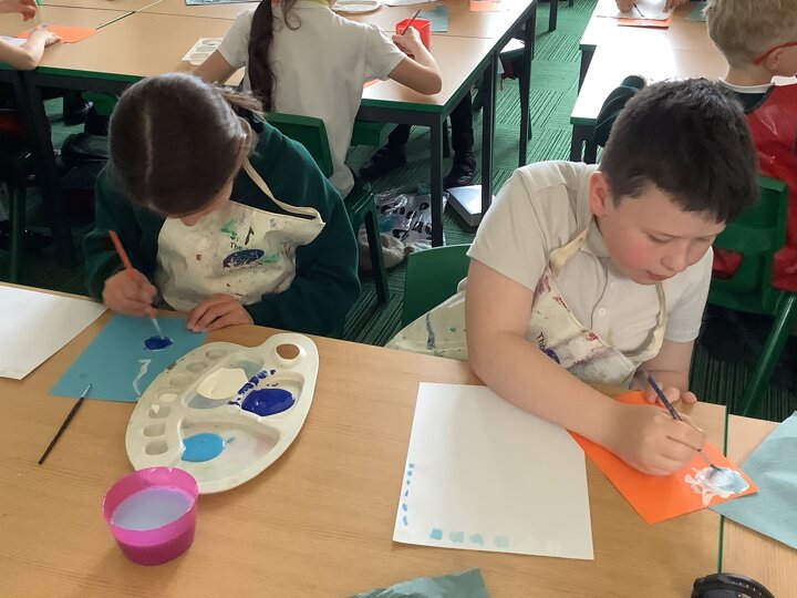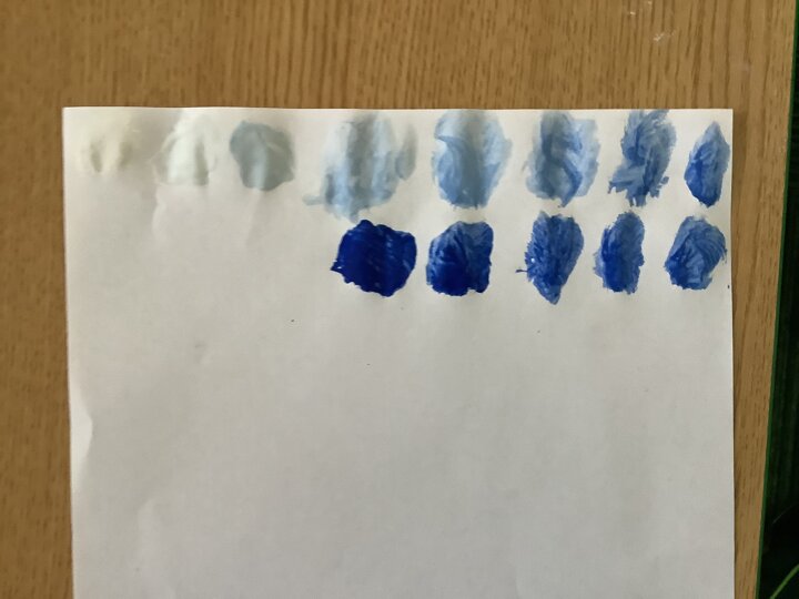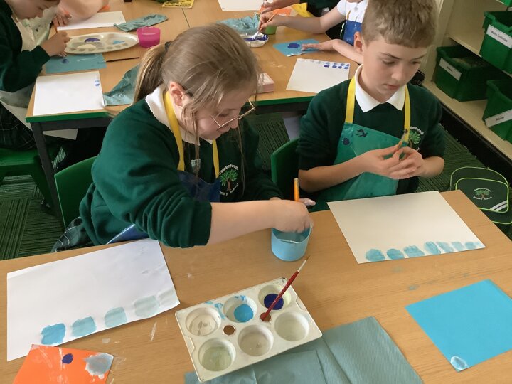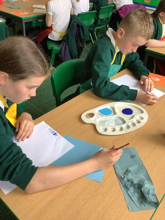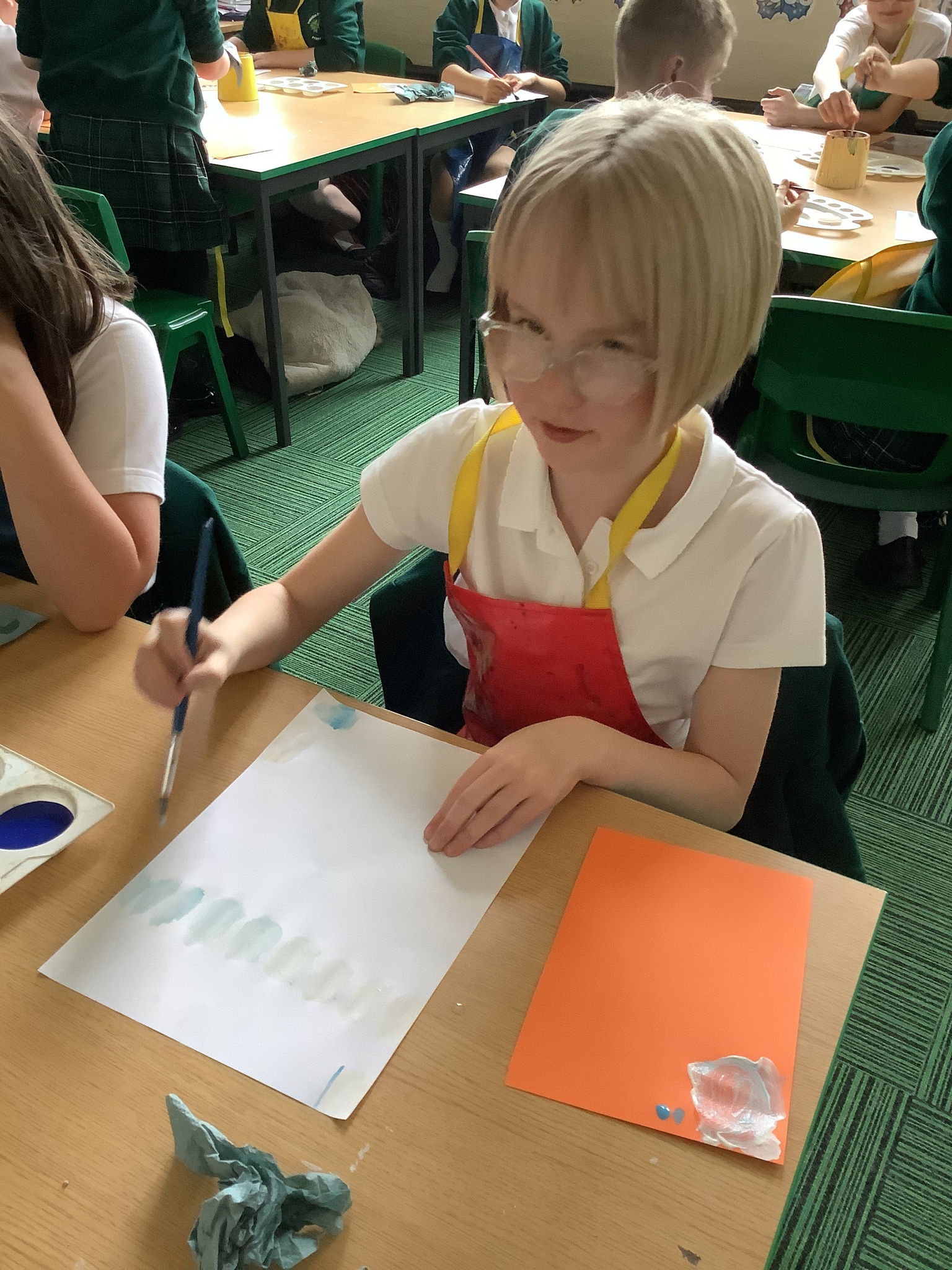 This afternoon in their artwork, Year 4 investigated different starting points for their watery art pieces. They began by sketching watery shapes and finished with creating a range of different blue tones whereby they added white to blue.