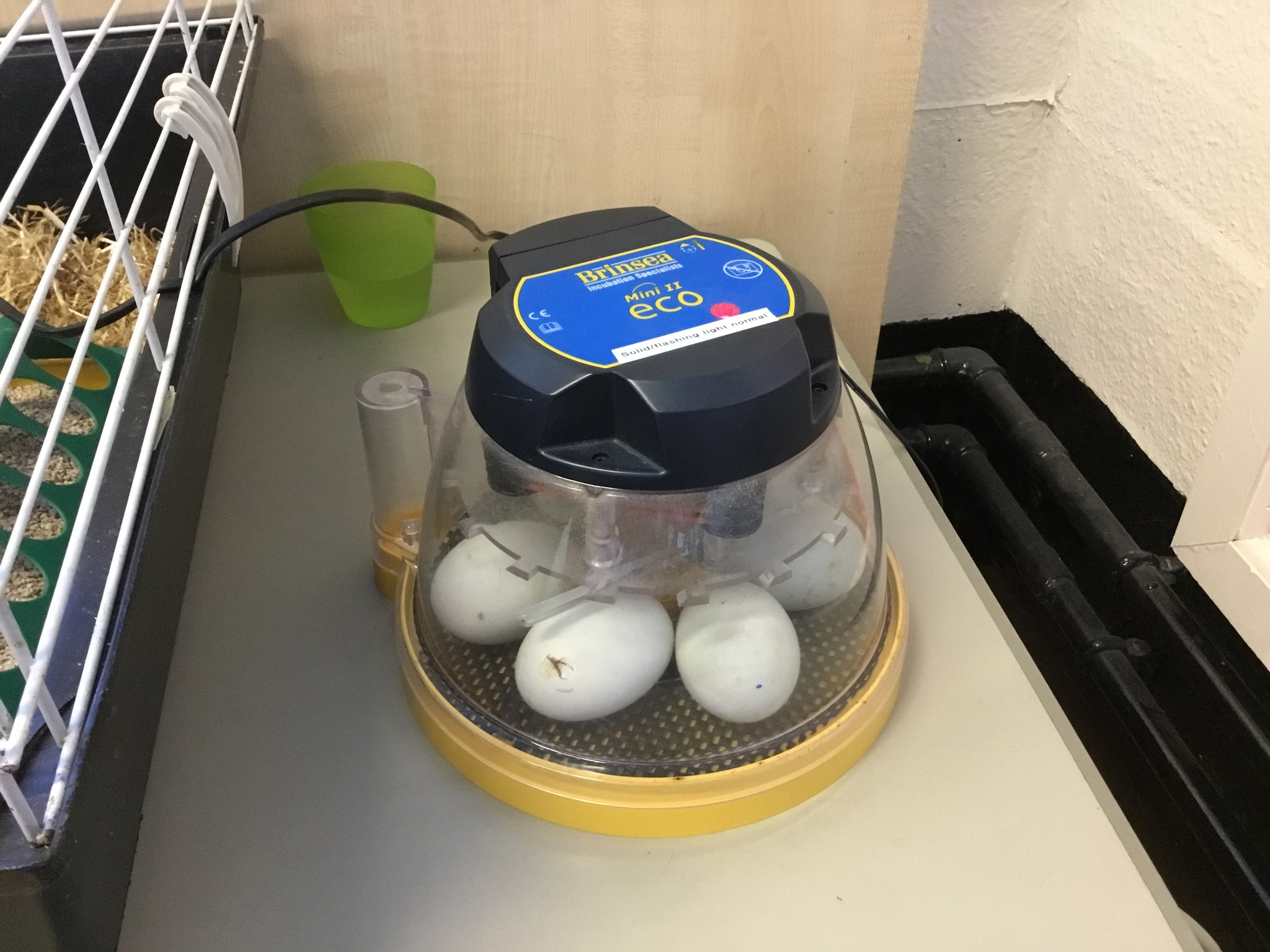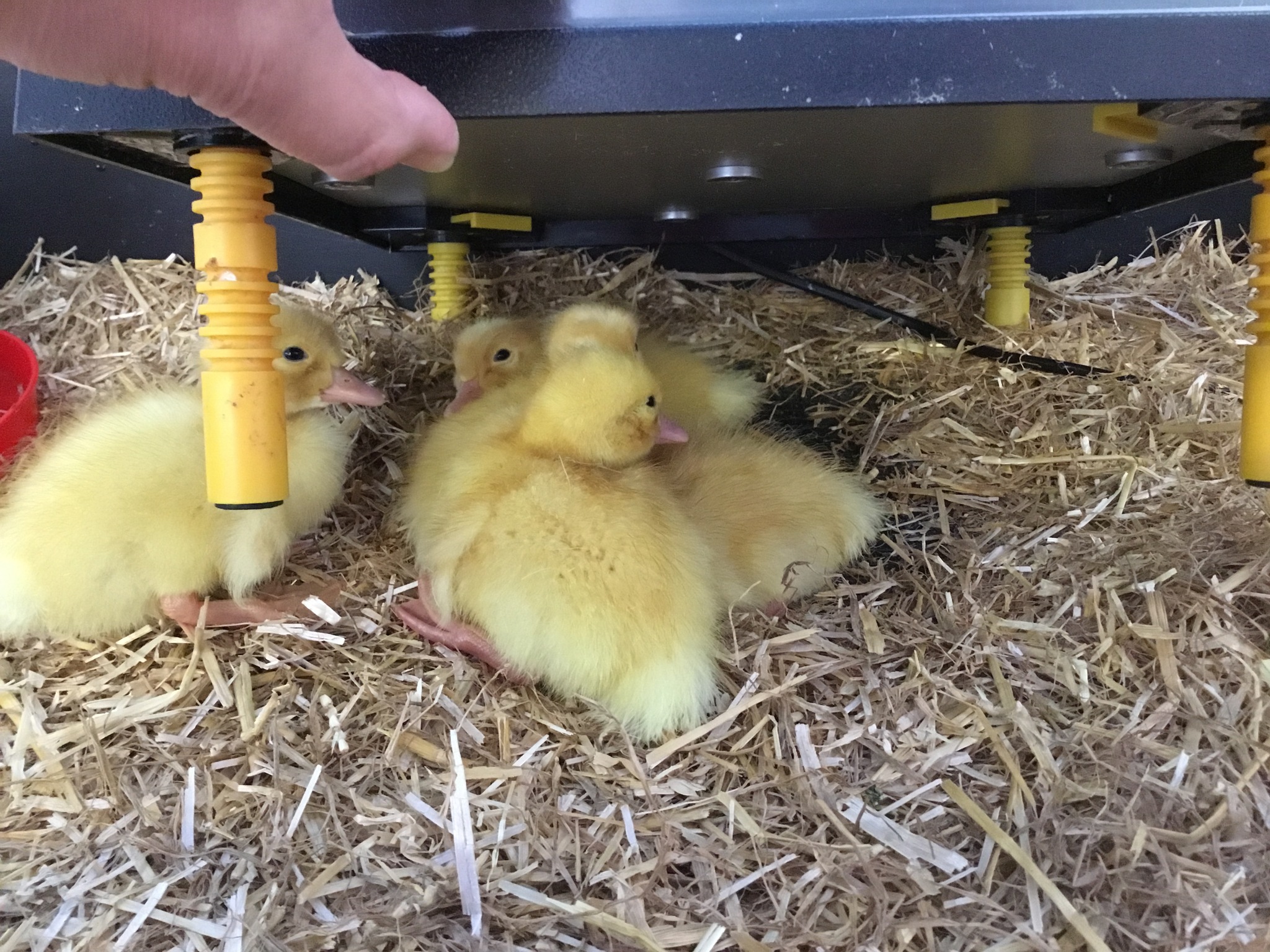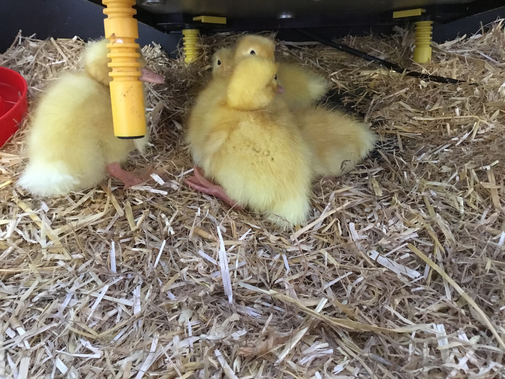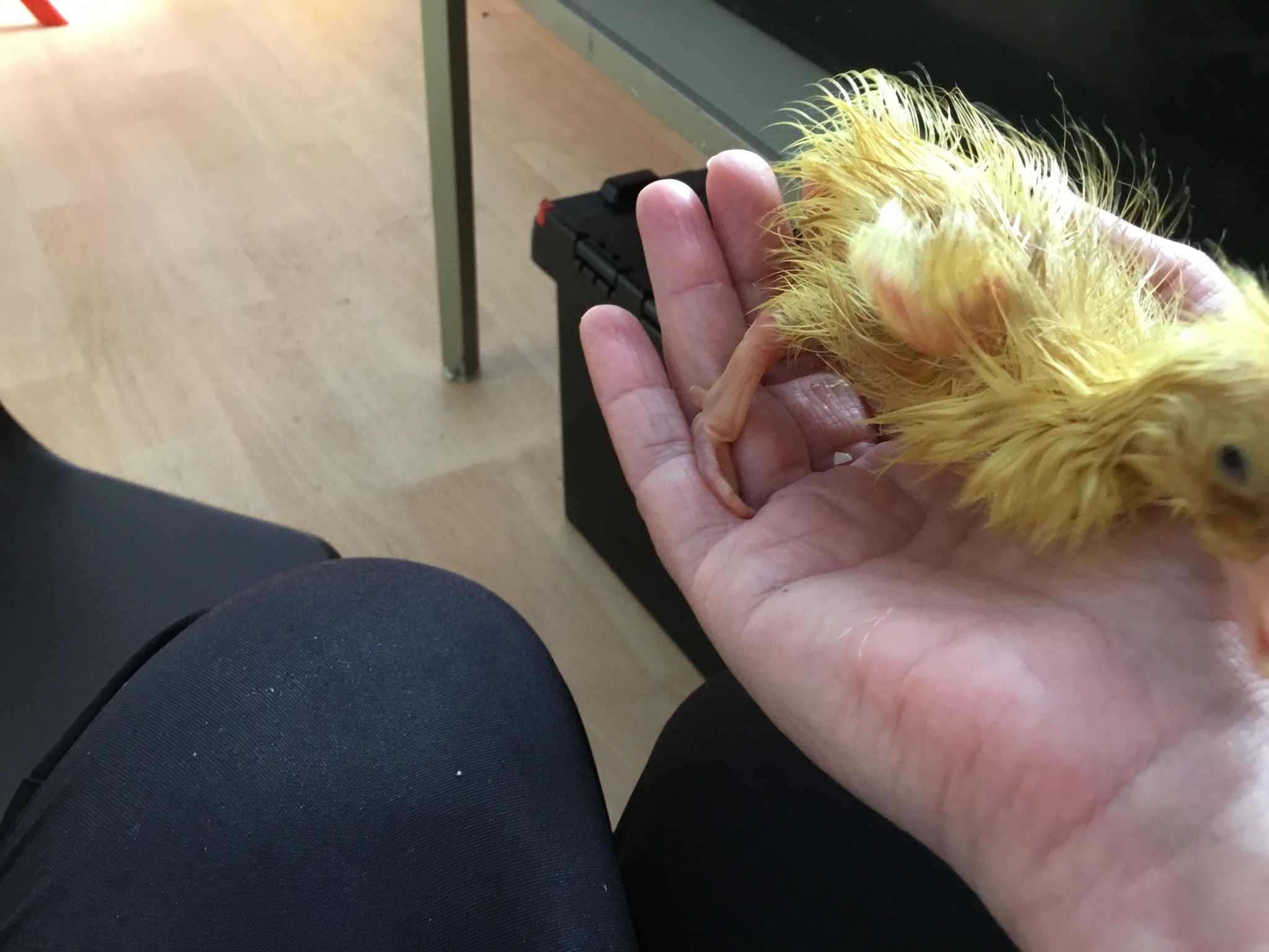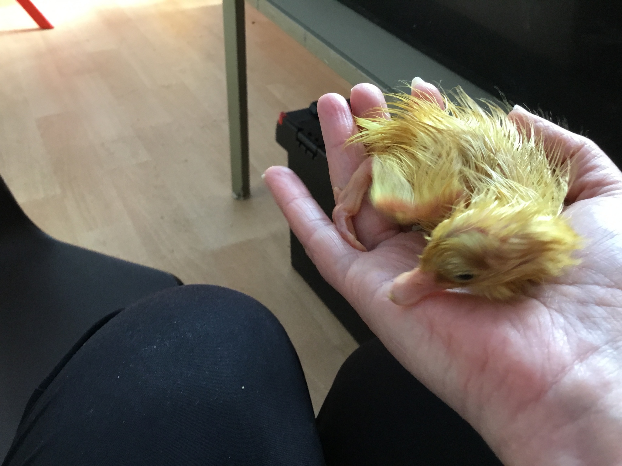 We now have five fluffy yellow friends who are already eating drinking and running around their cage, and number six is busy pecking away.