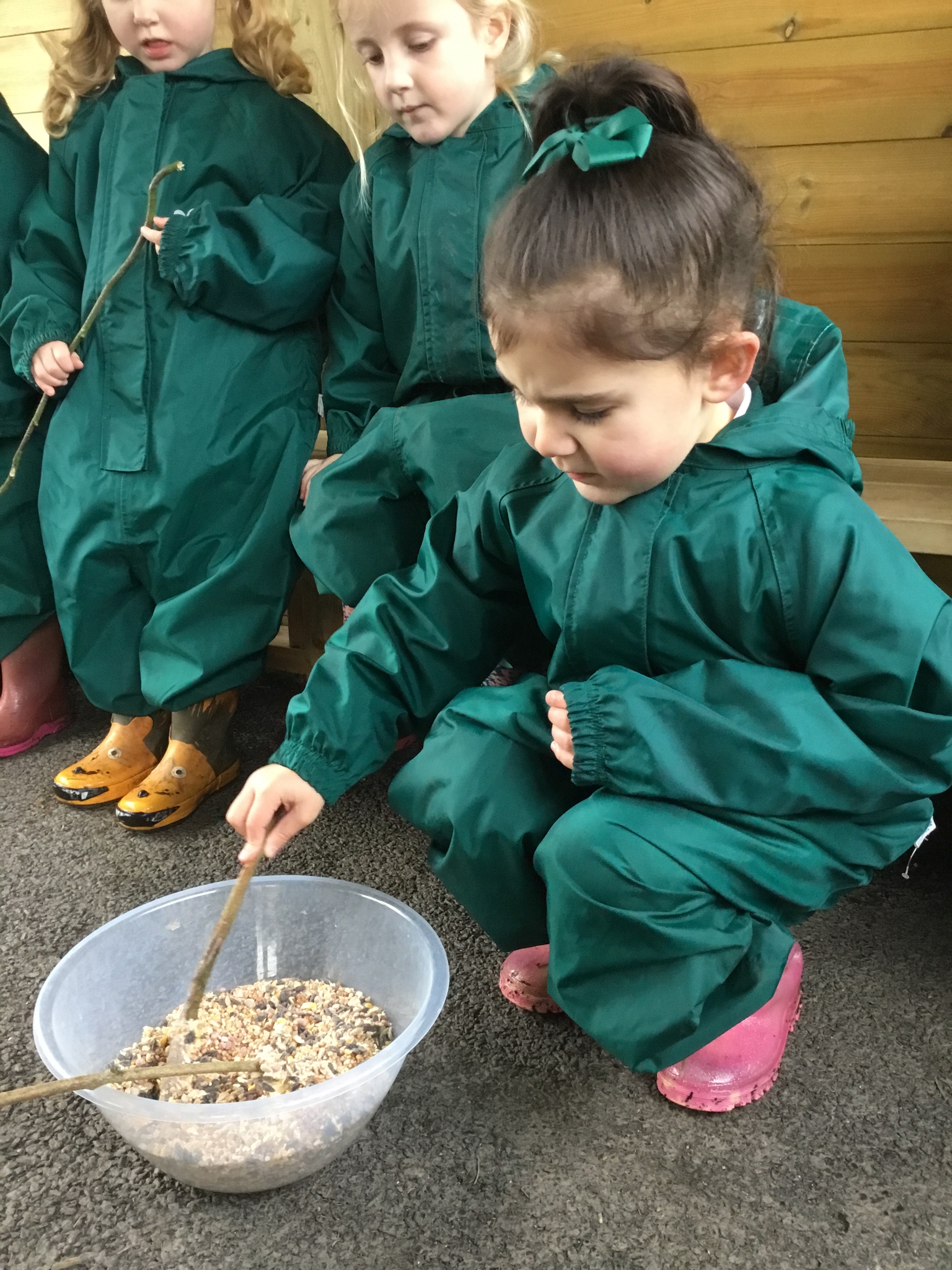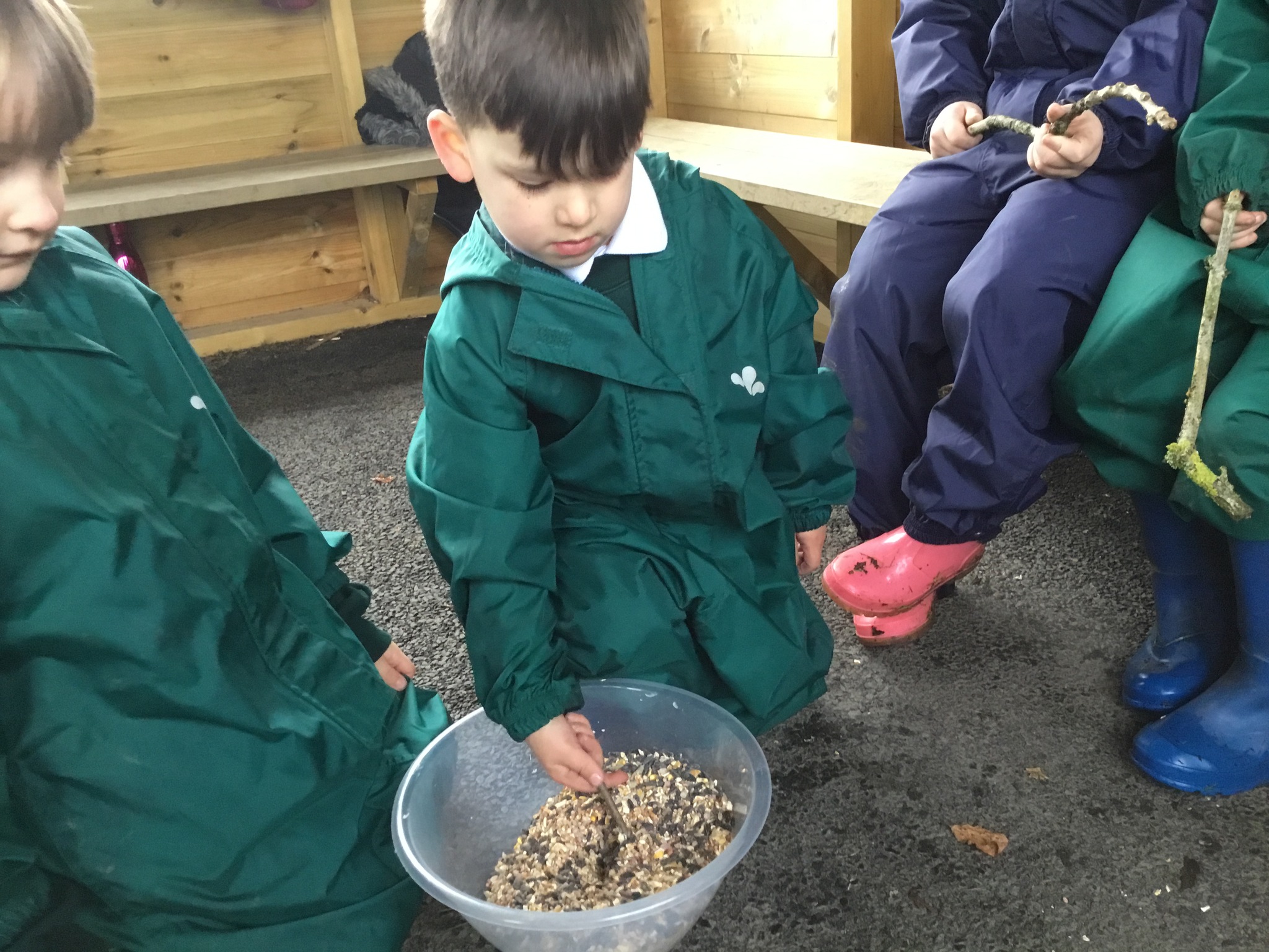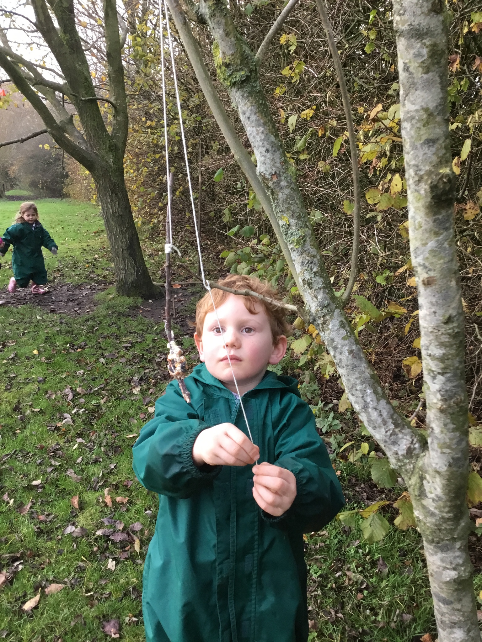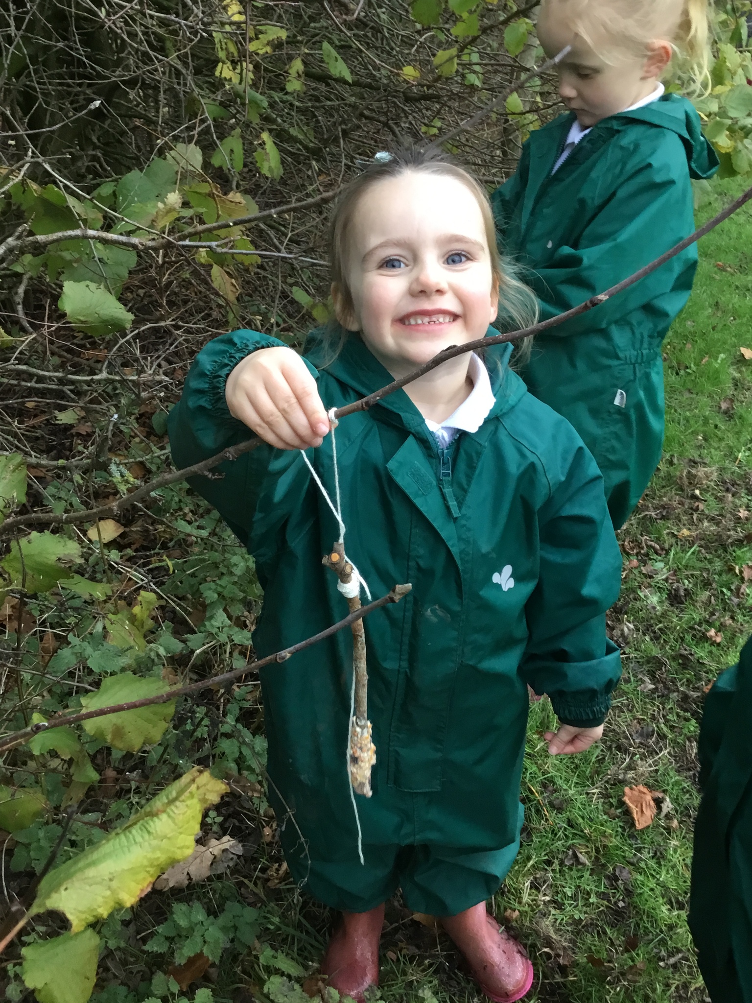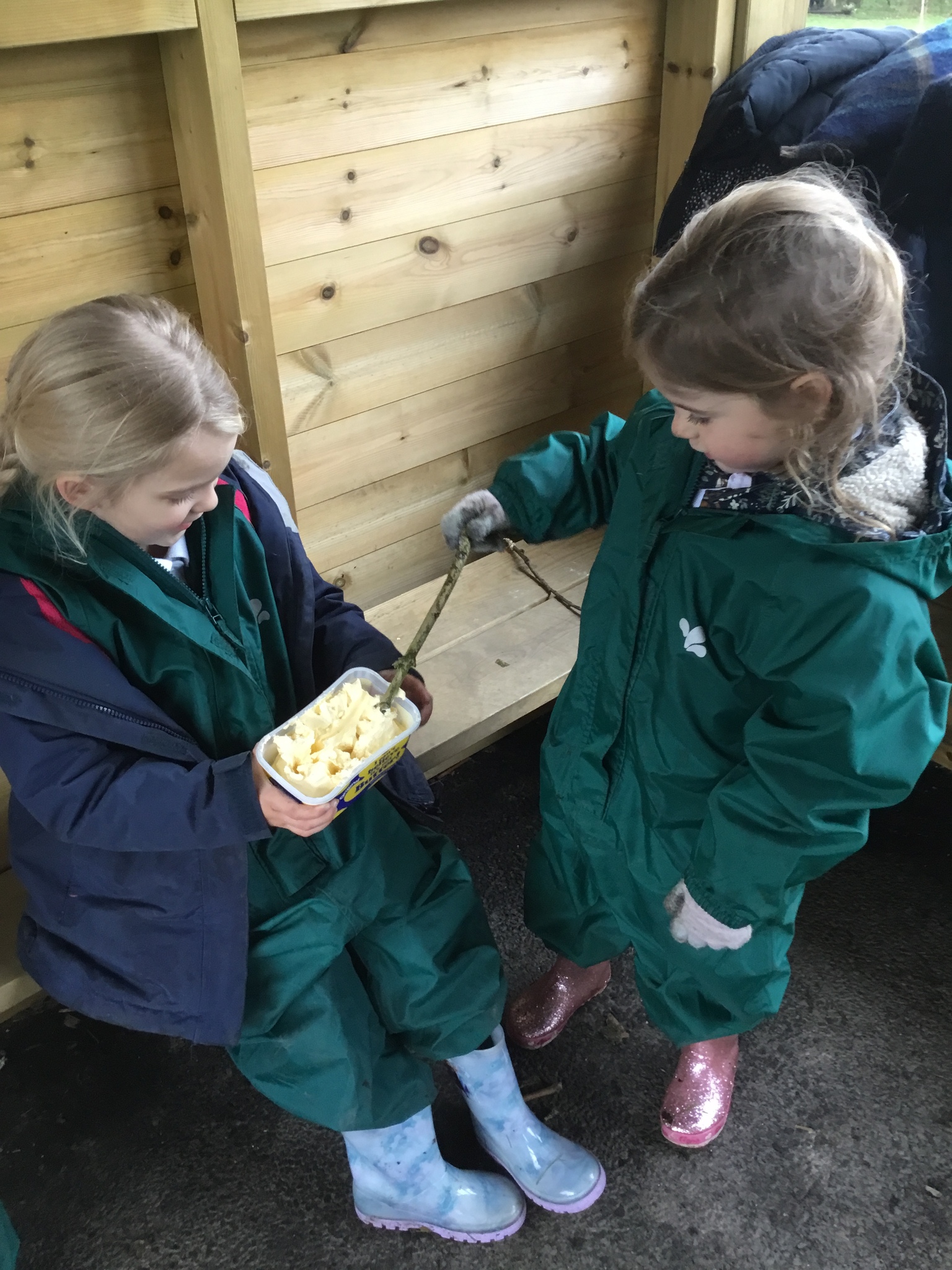 Our EYFS children have talked about what sort of animals might visit our field and what sort of food they might eat. We then worked in pairs to find a perfect stick, and used butter and bird seeds to create bird feeders. We then tied them onto branches around the field for the birds to eat.