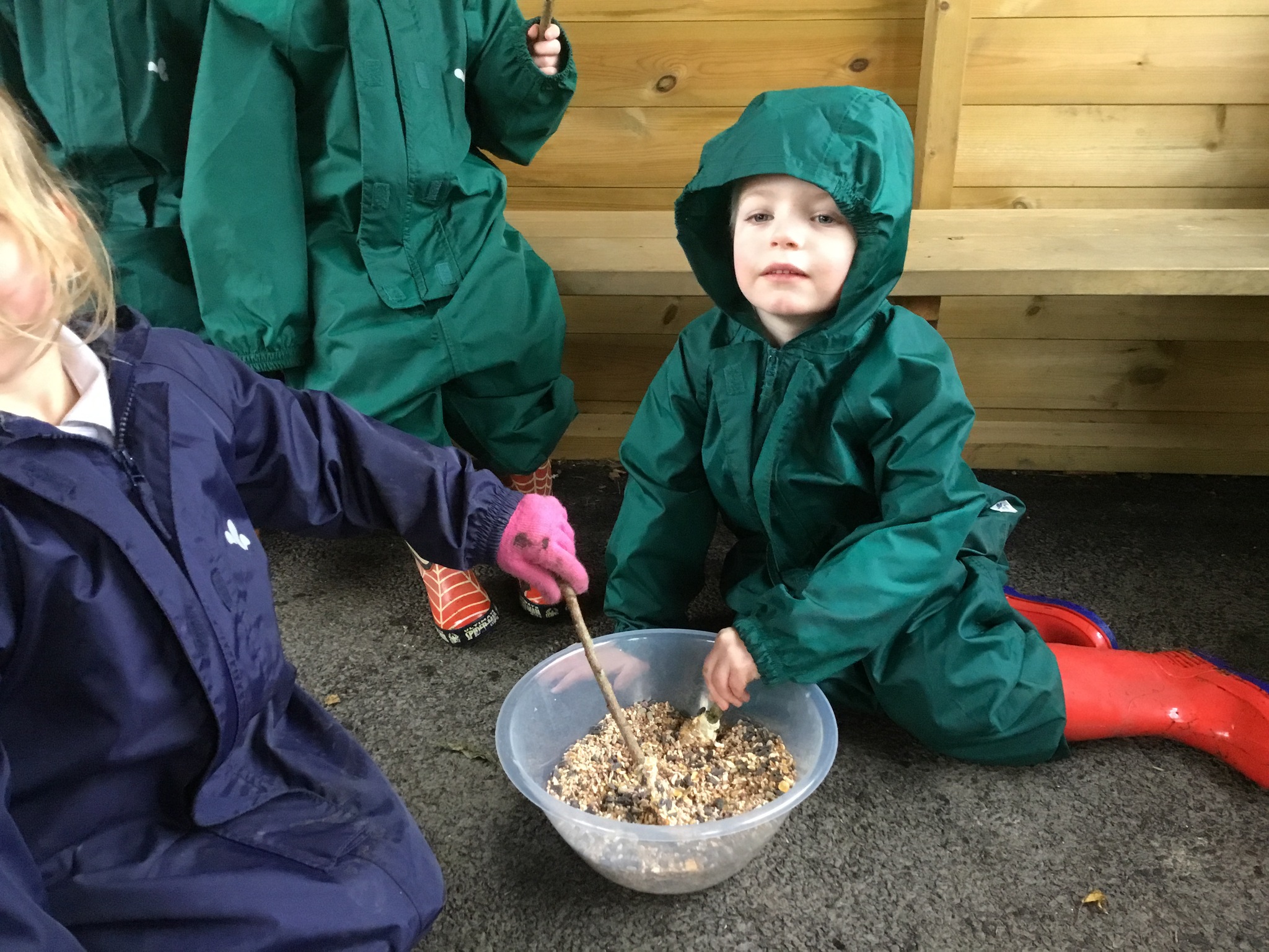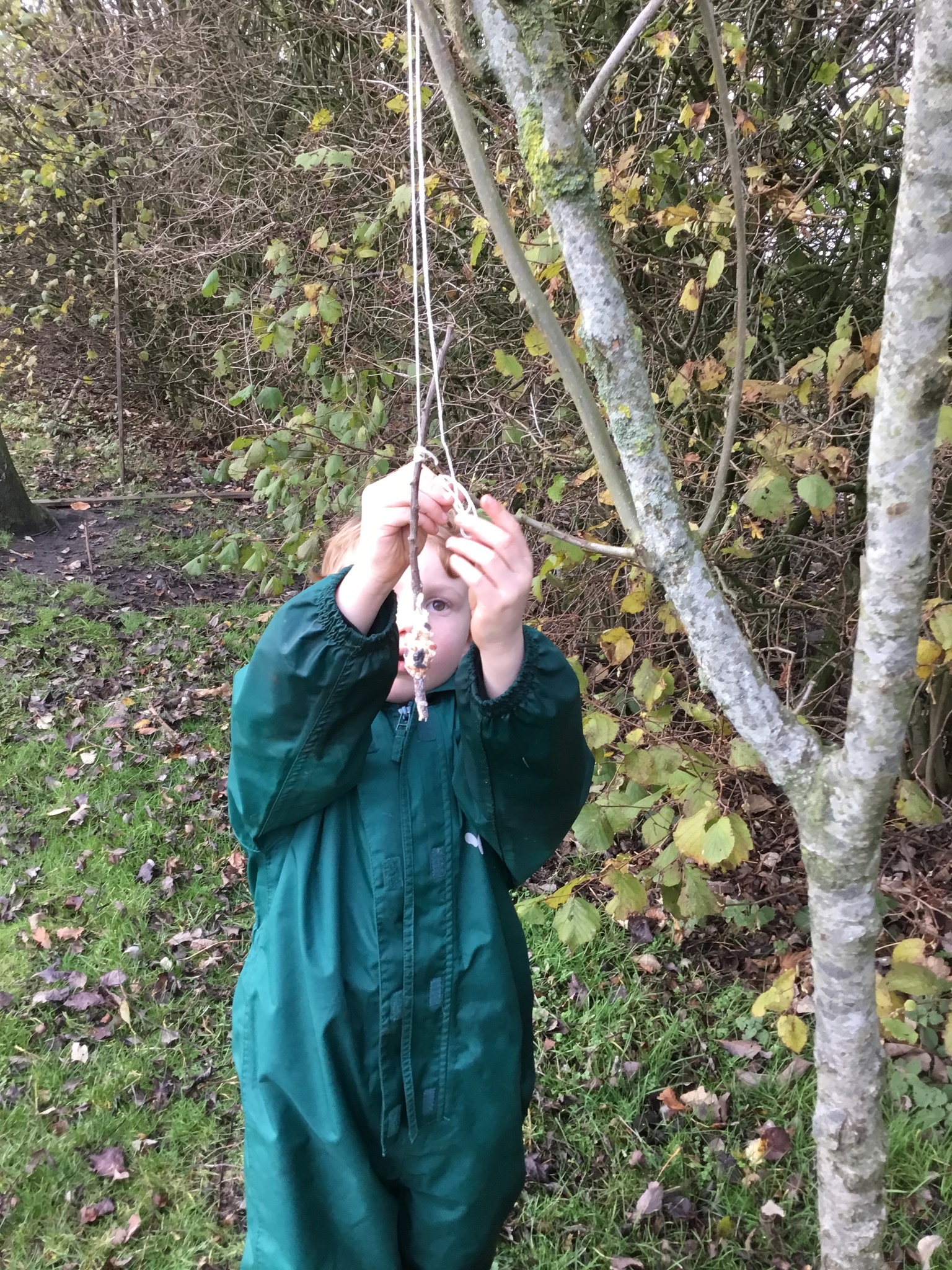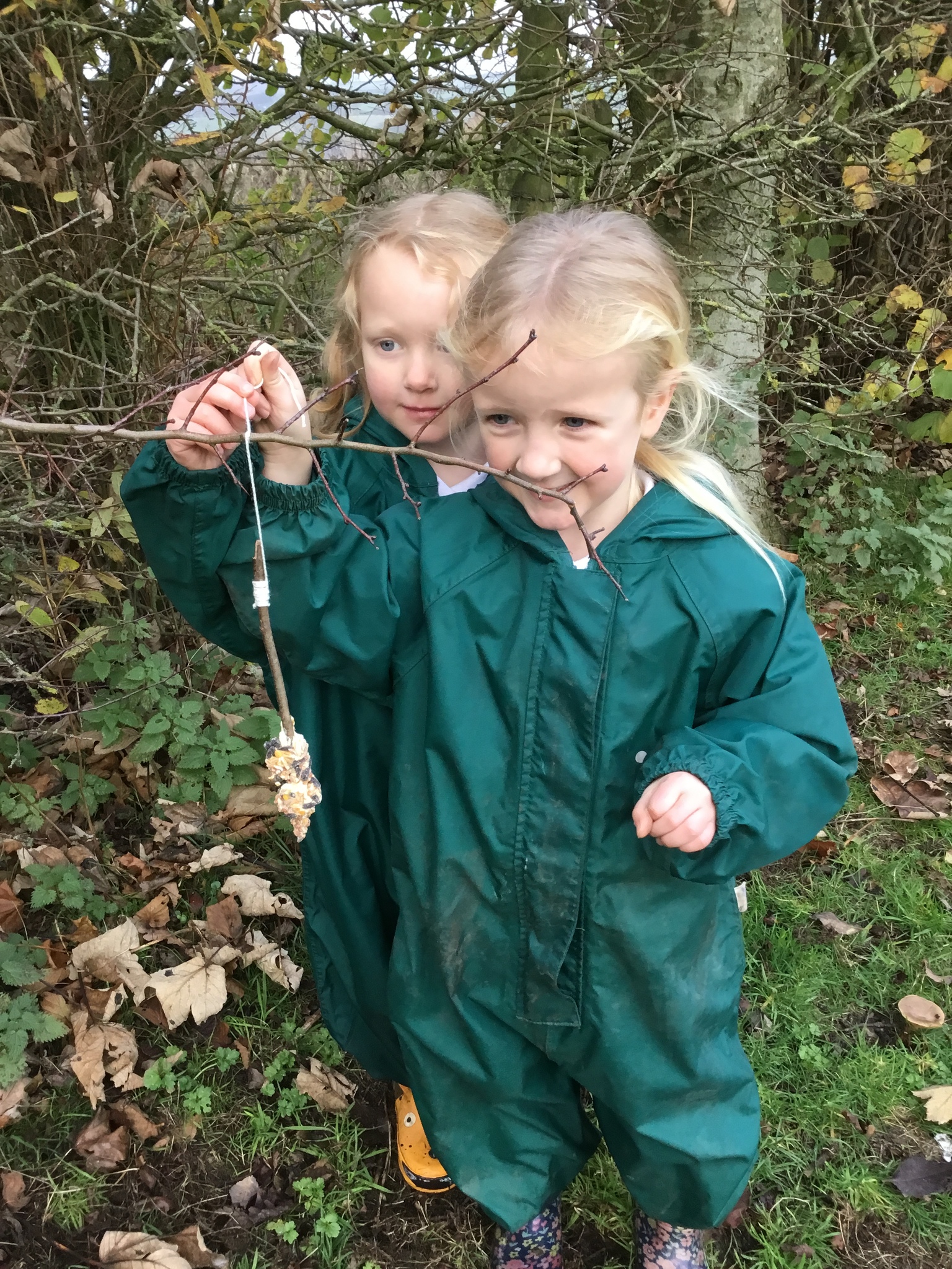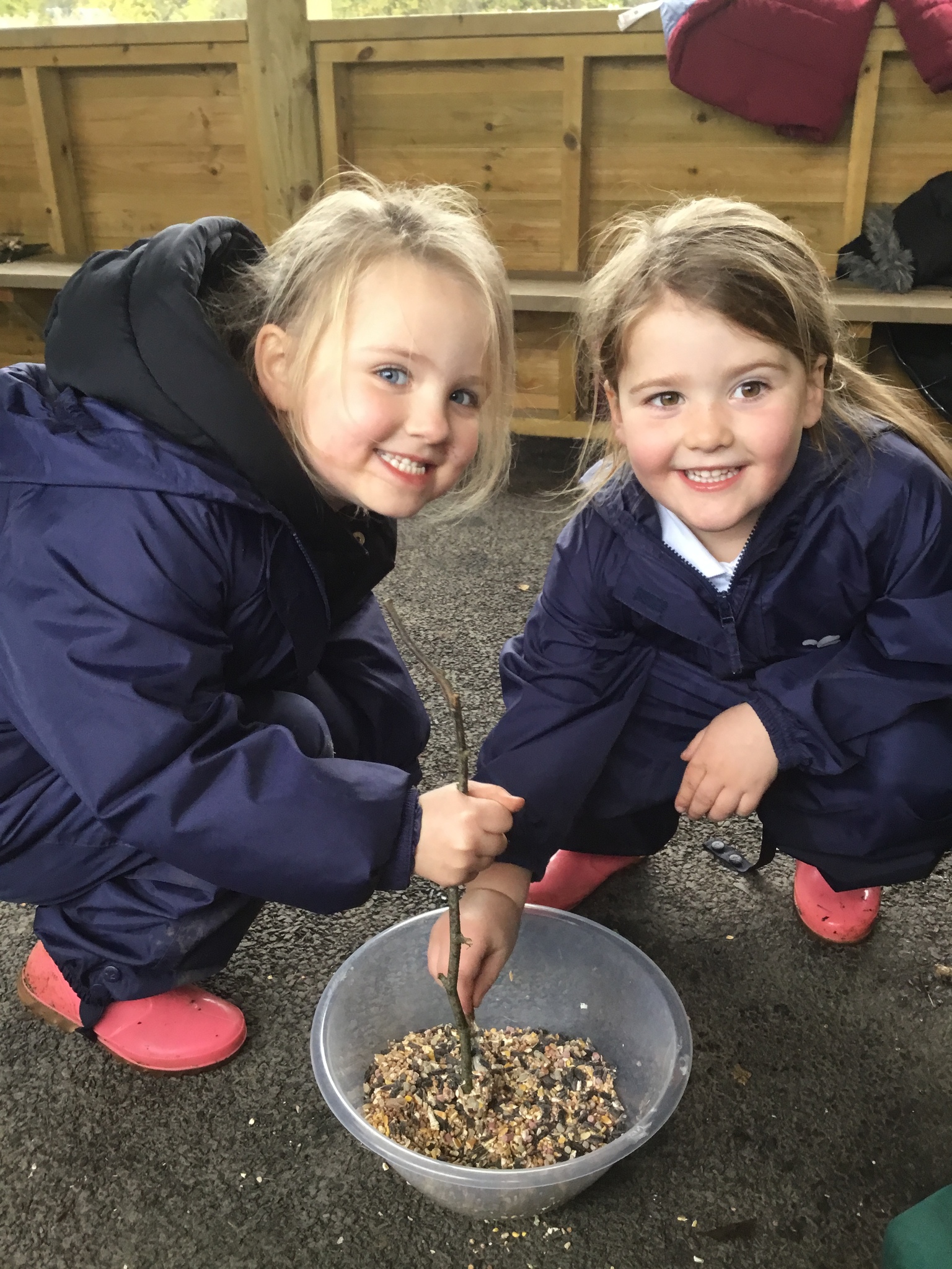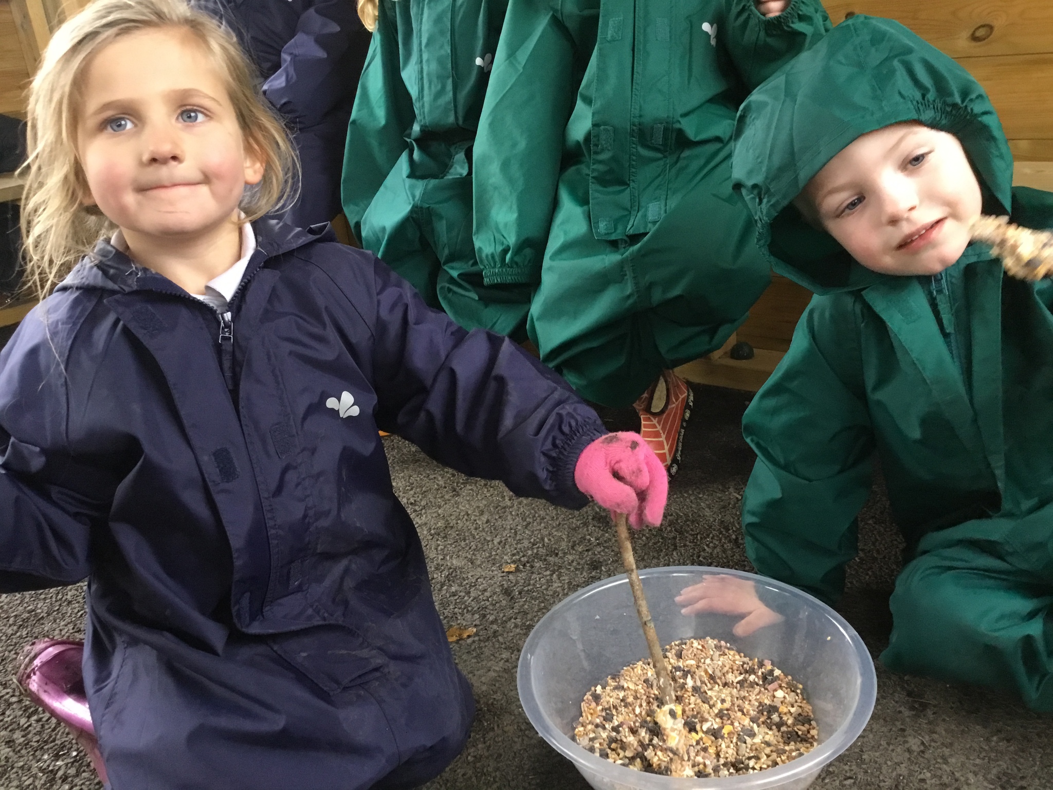 Our EYFS children have talked about what sort of animals might visit our field and what sort of food they might eat. We then worked in pairs to find a perfect stick, and used butter and bird seeds to create bird feeders. We then tied them onto branches around the field for the birds to eat.