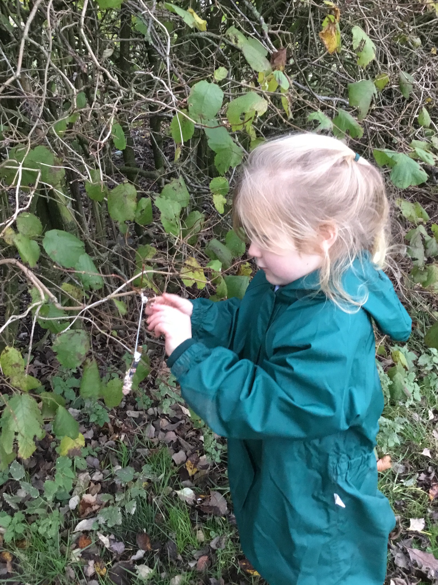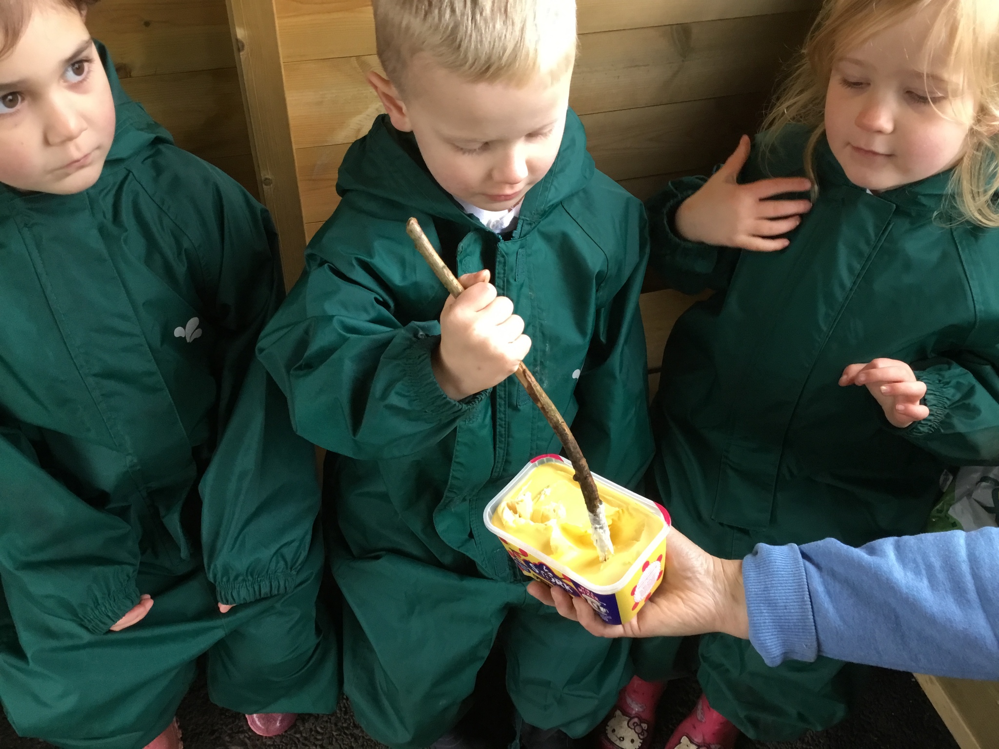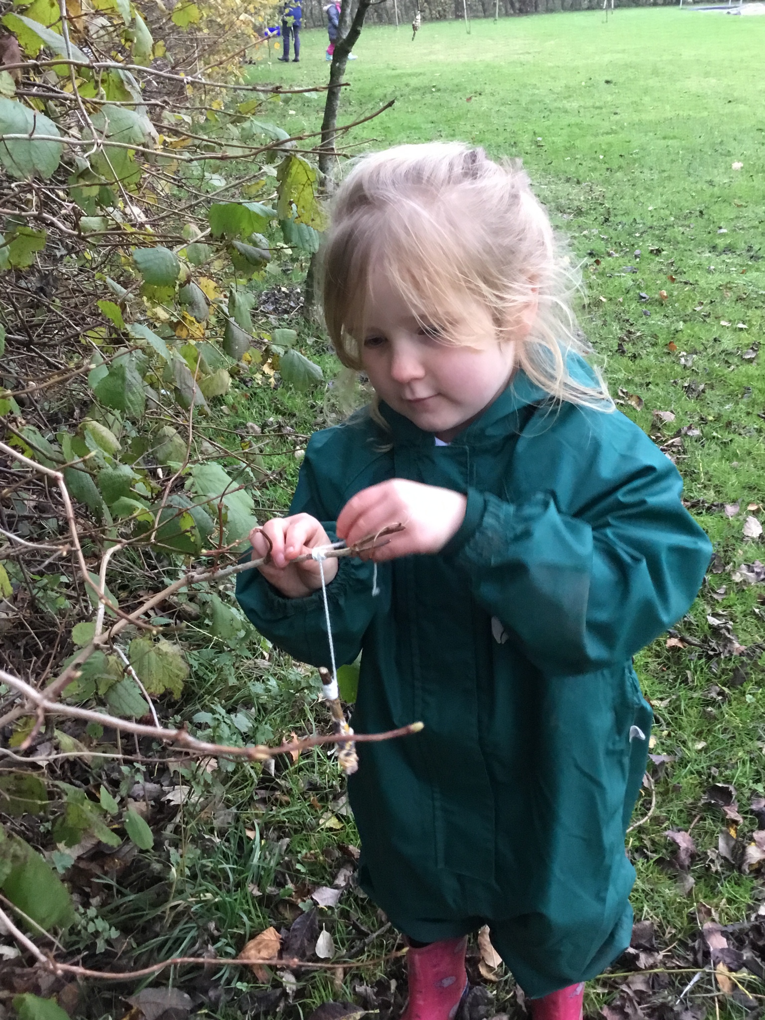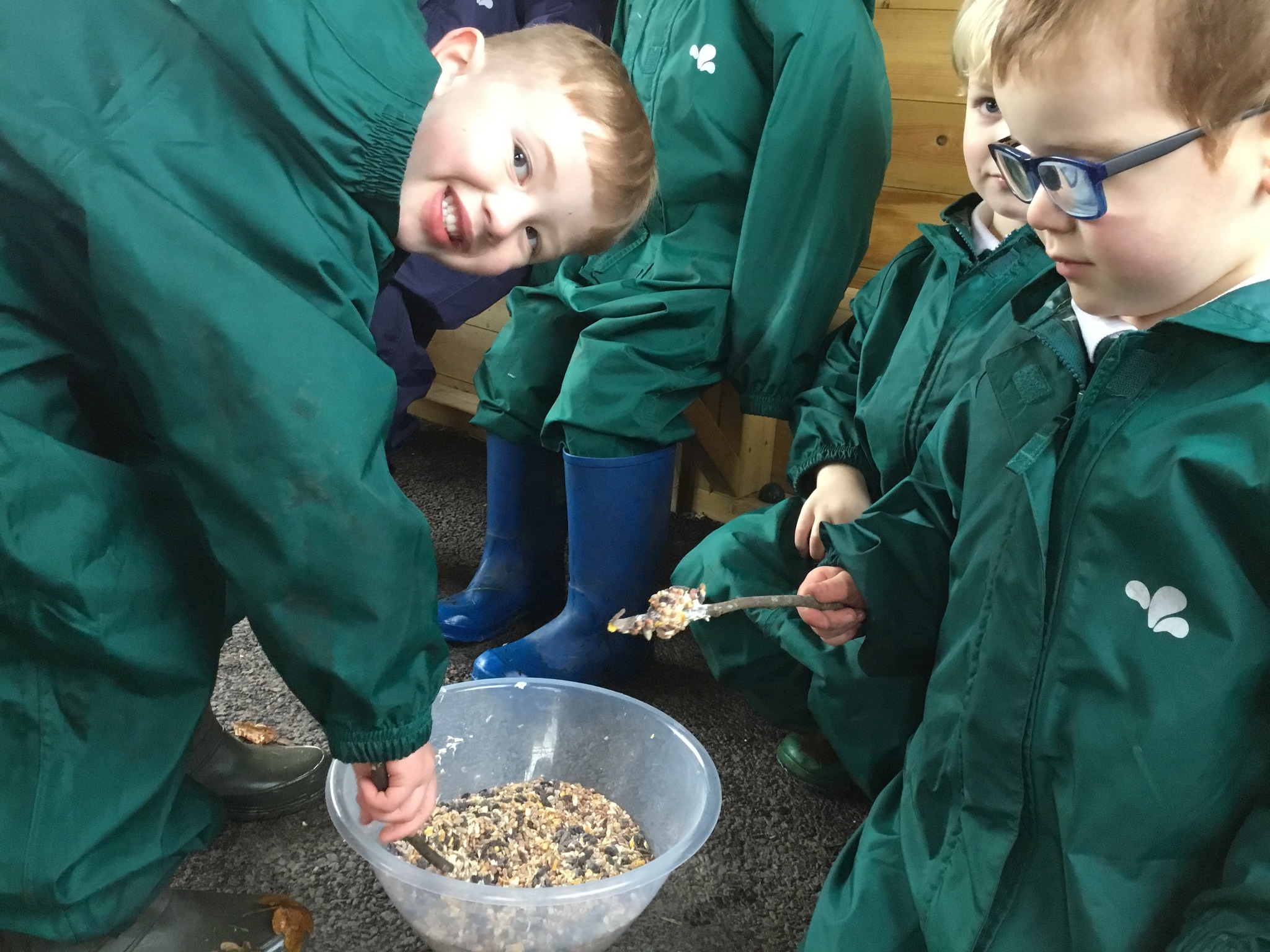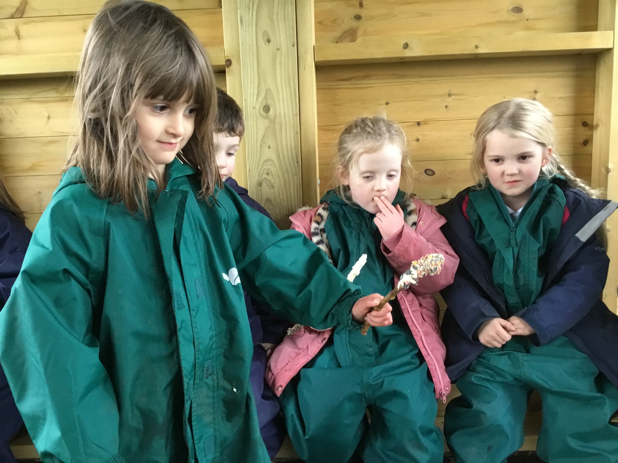 Our EYFS children have talked about what sort of animals might visit our field and what sort of food they might eat. We then worked in pairs to find a perfect stick, and used butter and bird seeds to create bird feeders. We then tied them onto branches around the field for the birds to eat.