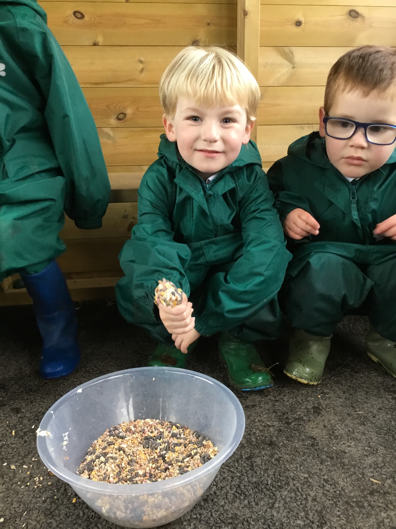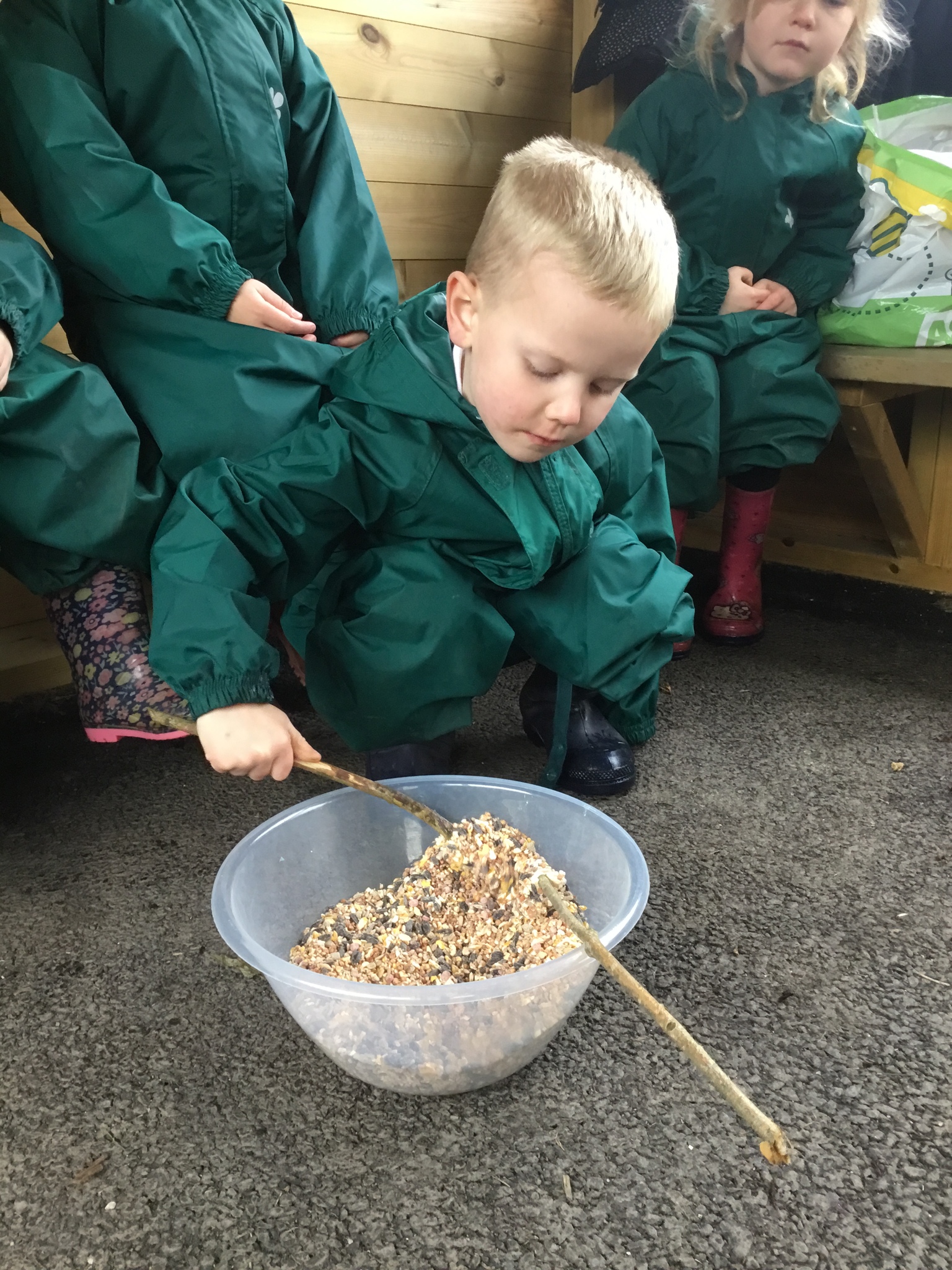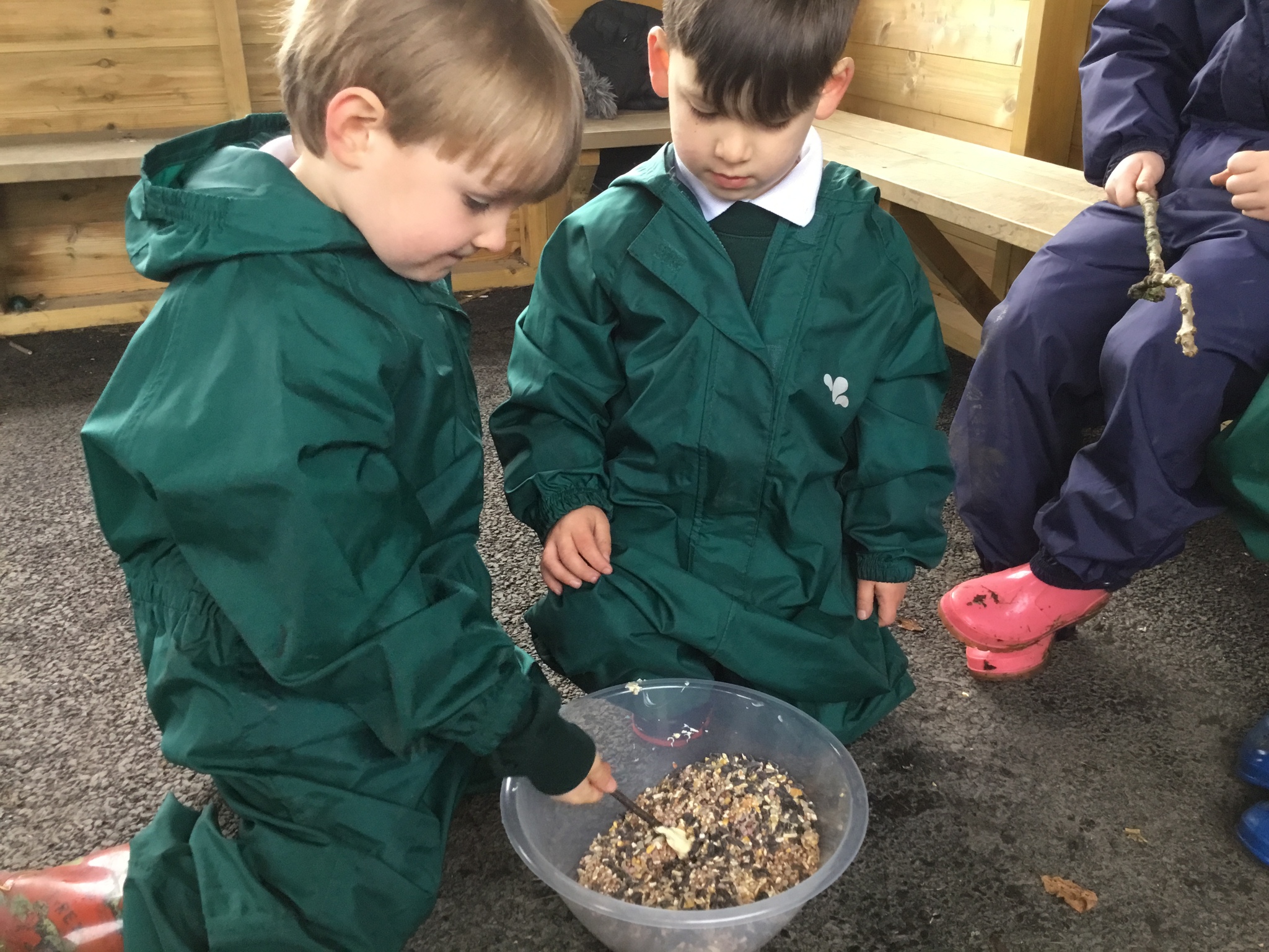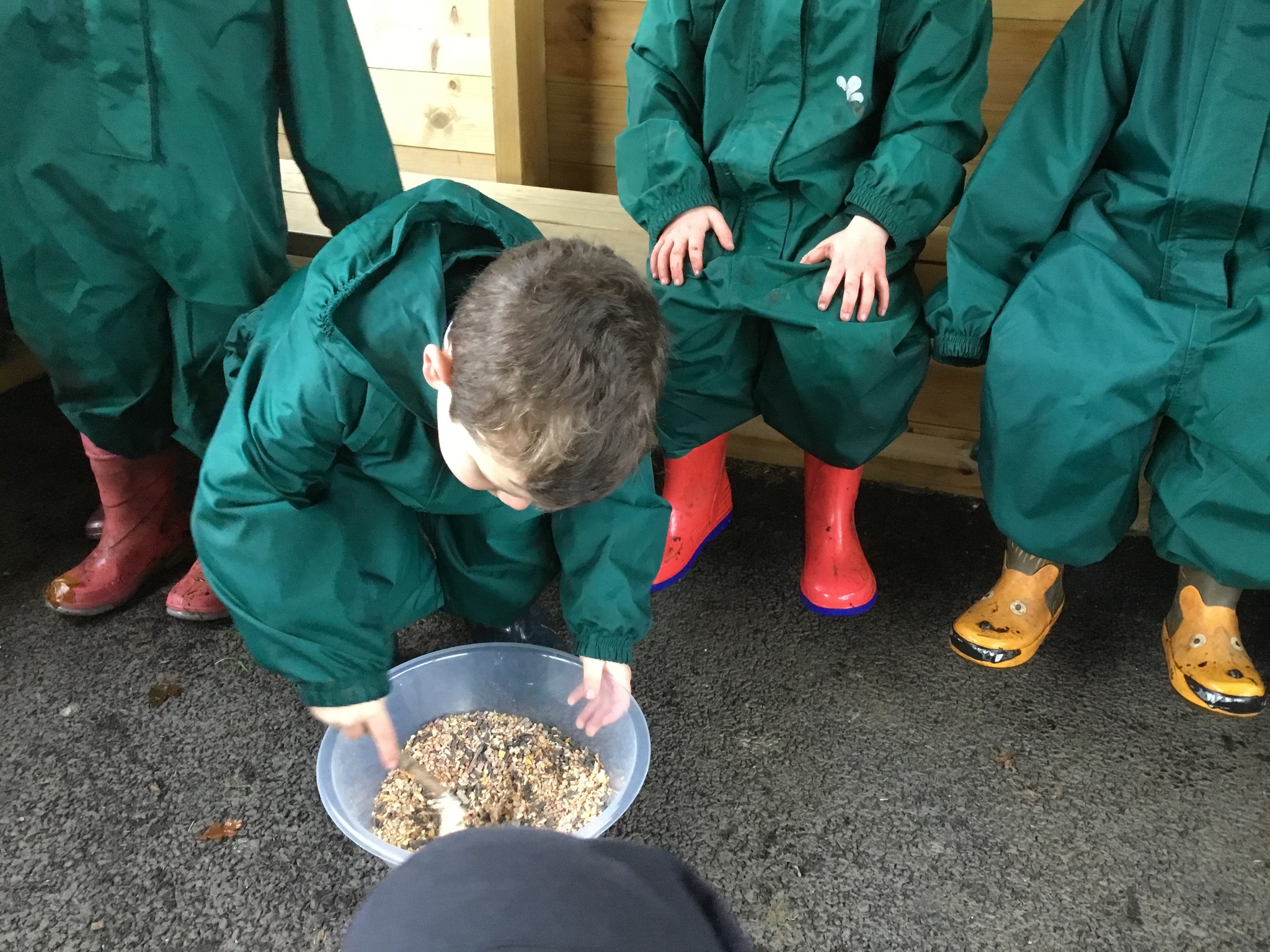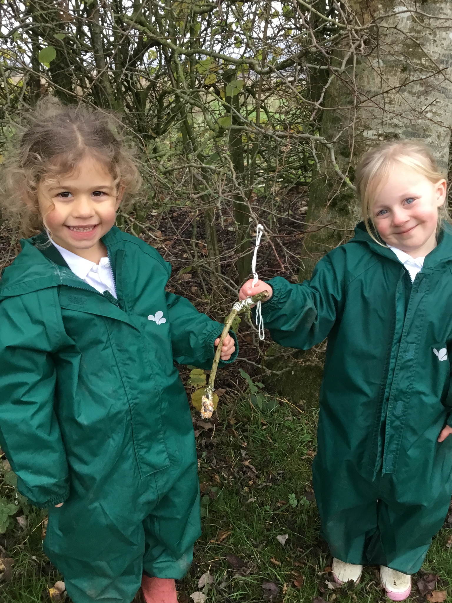 Our EYFS children have talked about what sort of animals might visit our field and what sort of food they might eat. We then worked in pairs to find a perfect stick, and used butter and bird seeds to create bird feeders. We then tied them onto branches around the field for the birds to eat.