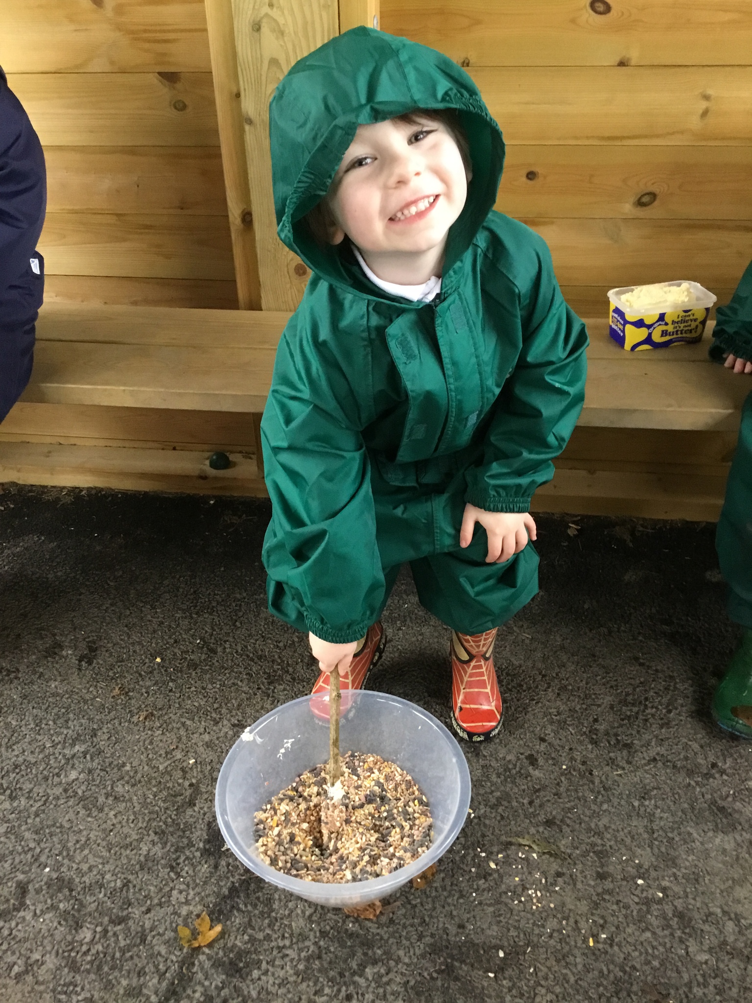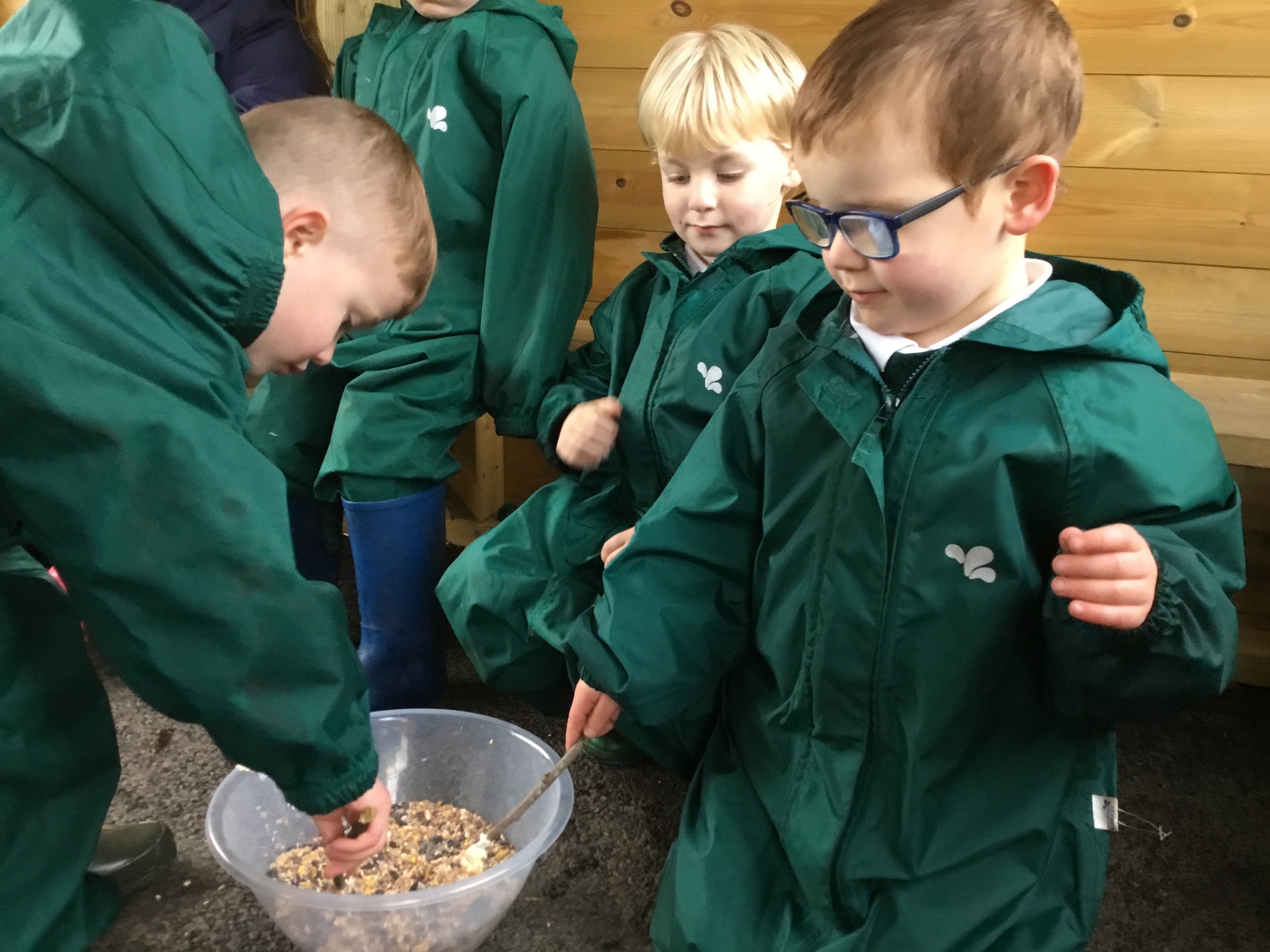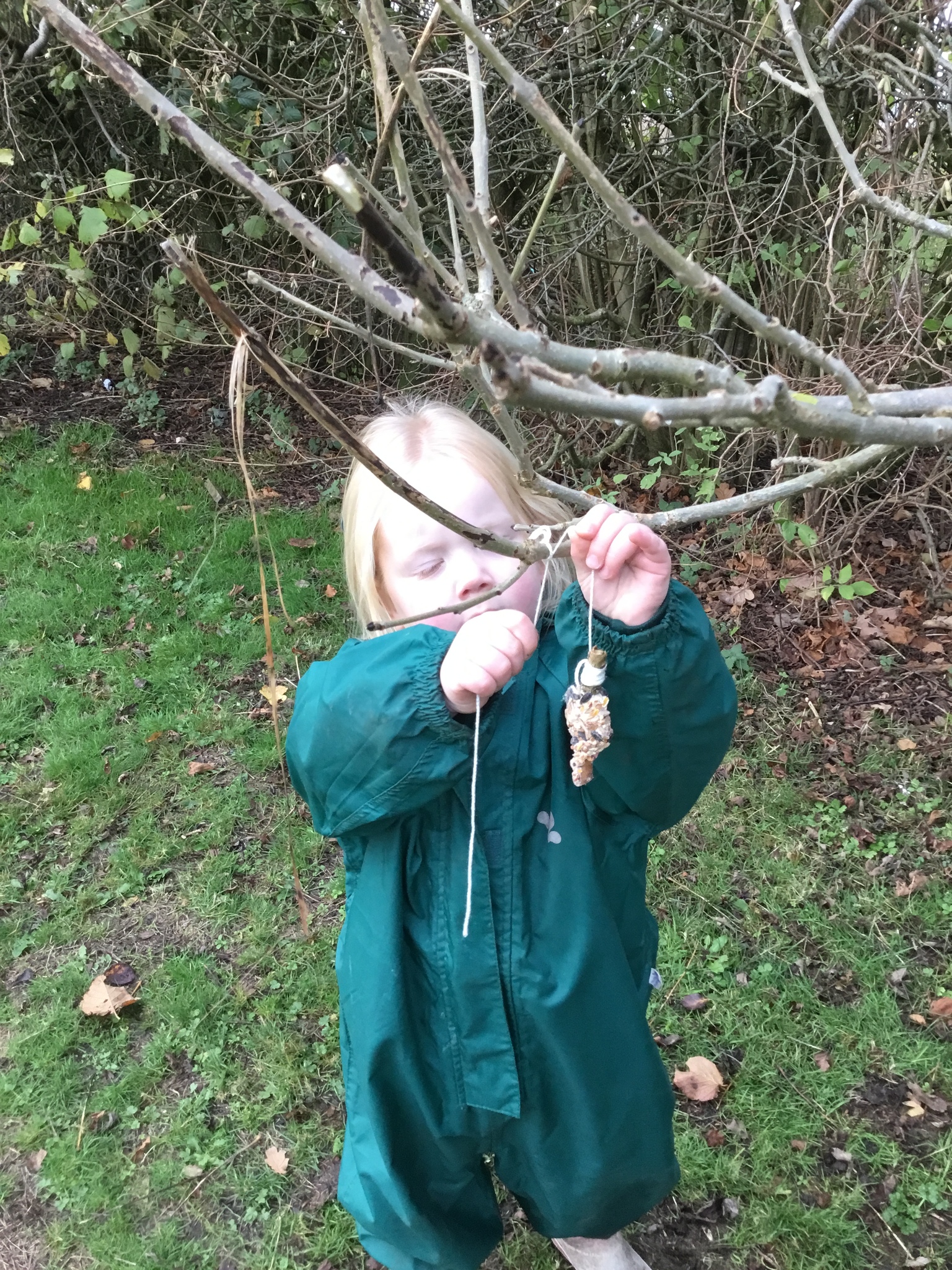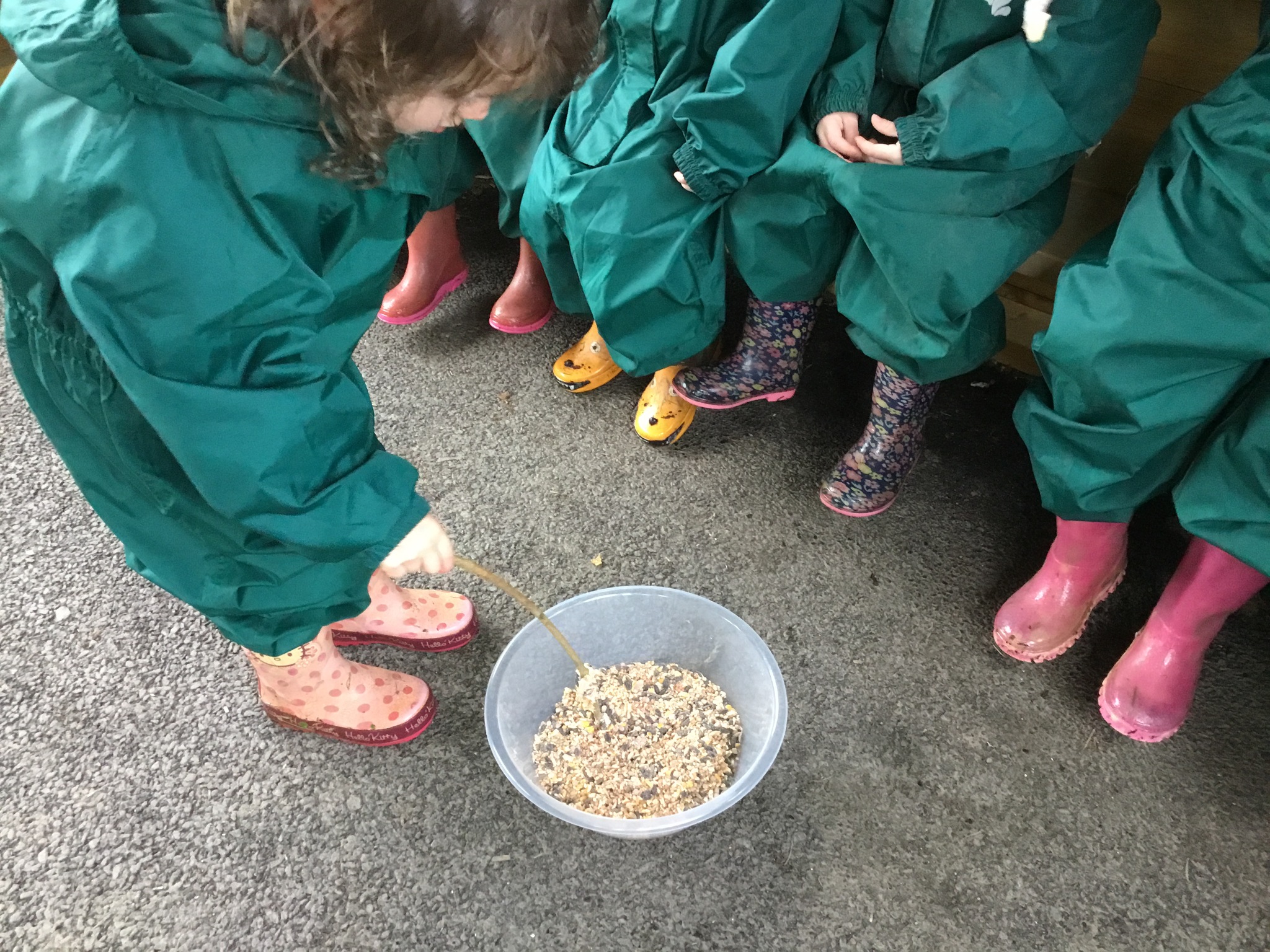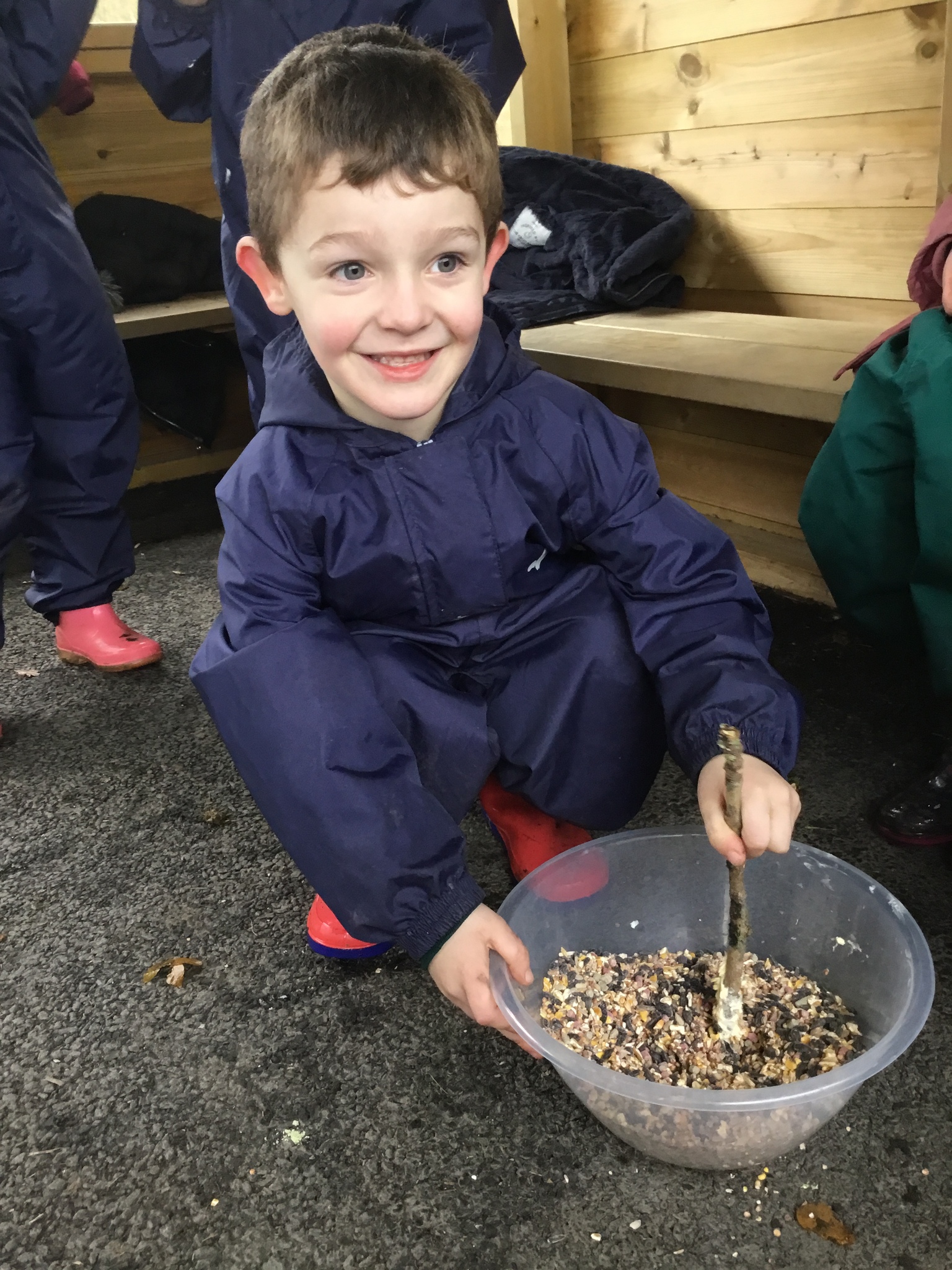 Our EYFS children have talked about what sort of animals might visit our field and what sort of food they might eat. We then worked in pairs to find a perfect stick, and used butter and bird seeds to create bird feeders. We then tied them onto branches around the field for the birds to eat.