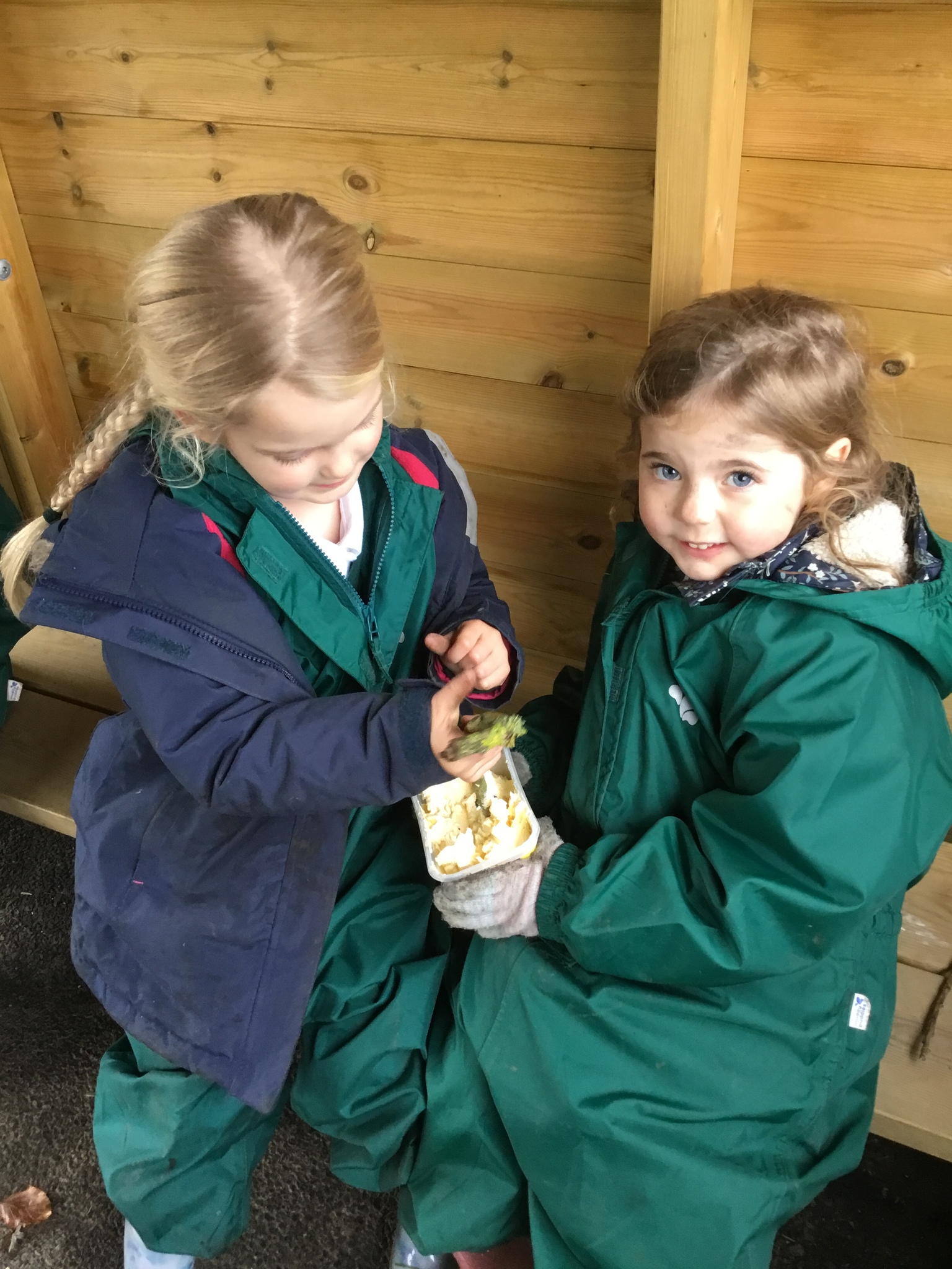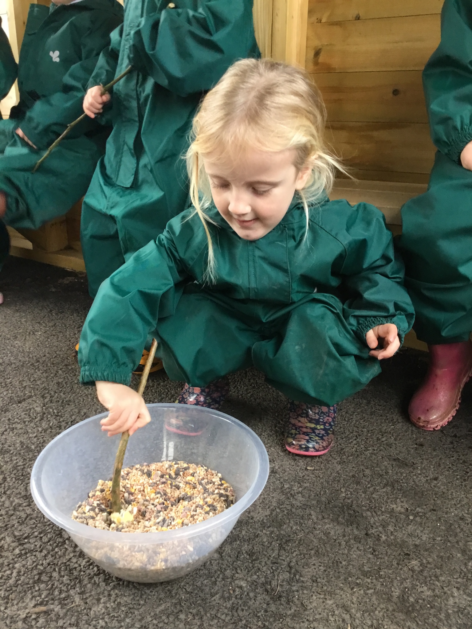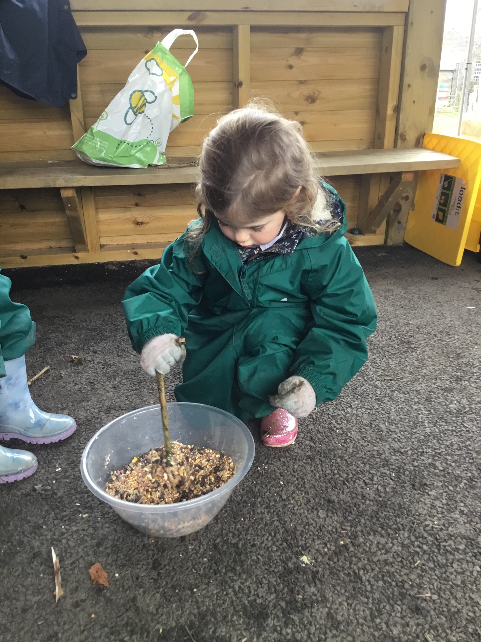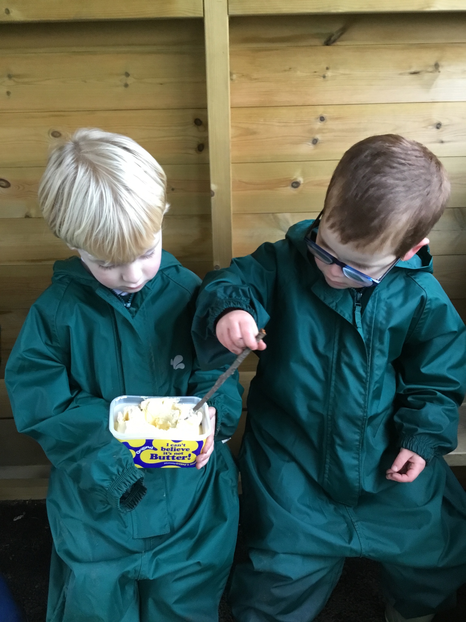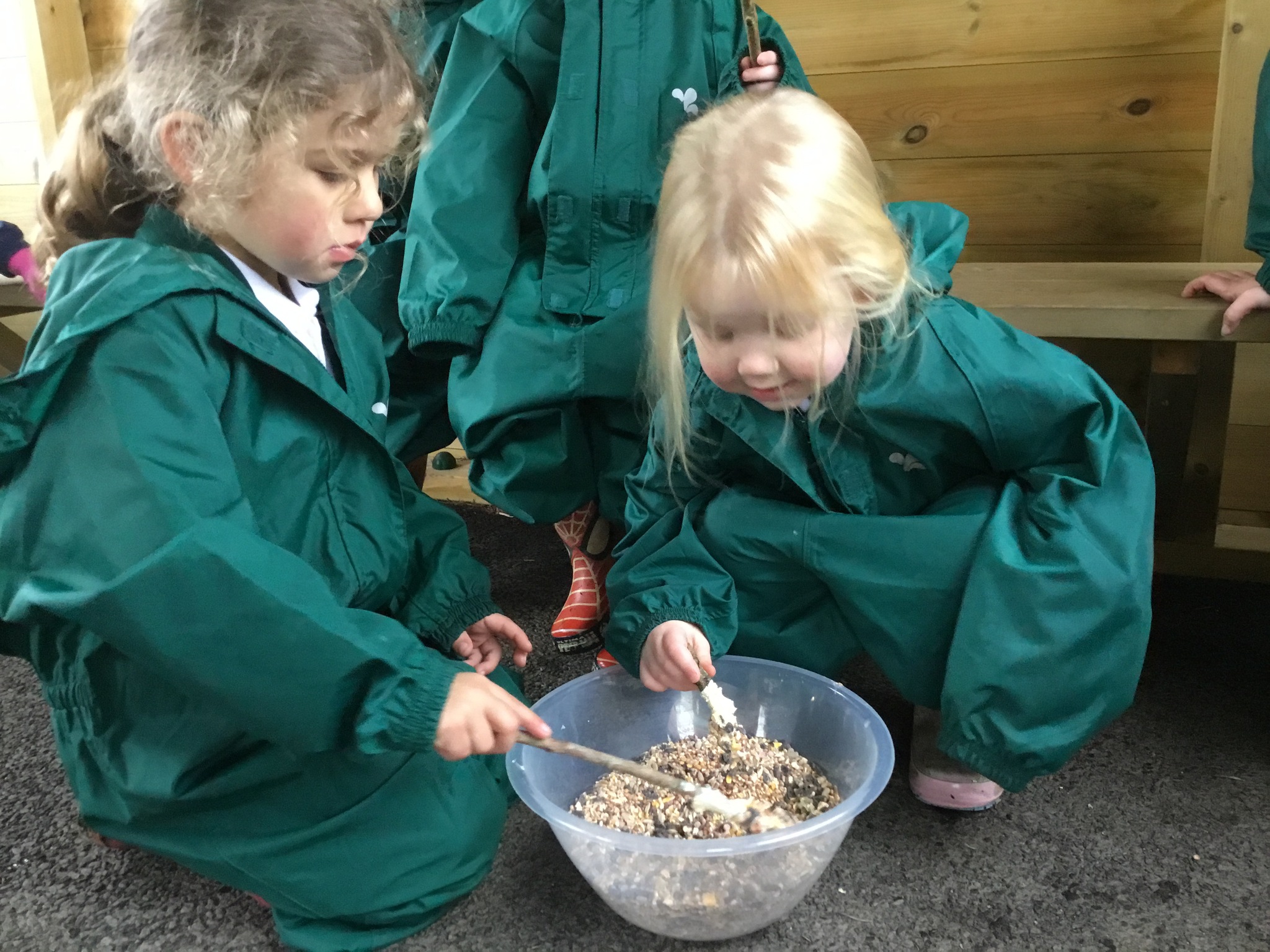 Our EYFS children have talked about what sort of animals might visit our field and what sort of food they might eat. We then worked in pairs to find a perfect stick, and used butter and bird seeds to create bird feeders. We then tied them onto branches around the field for the birds to eat.