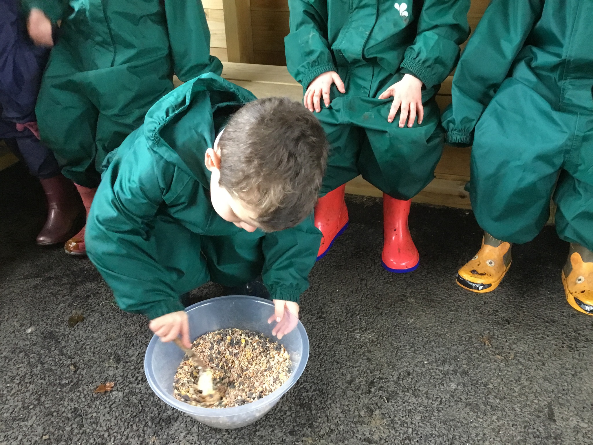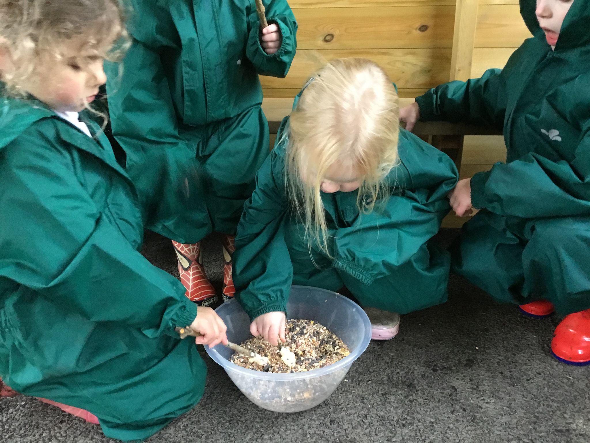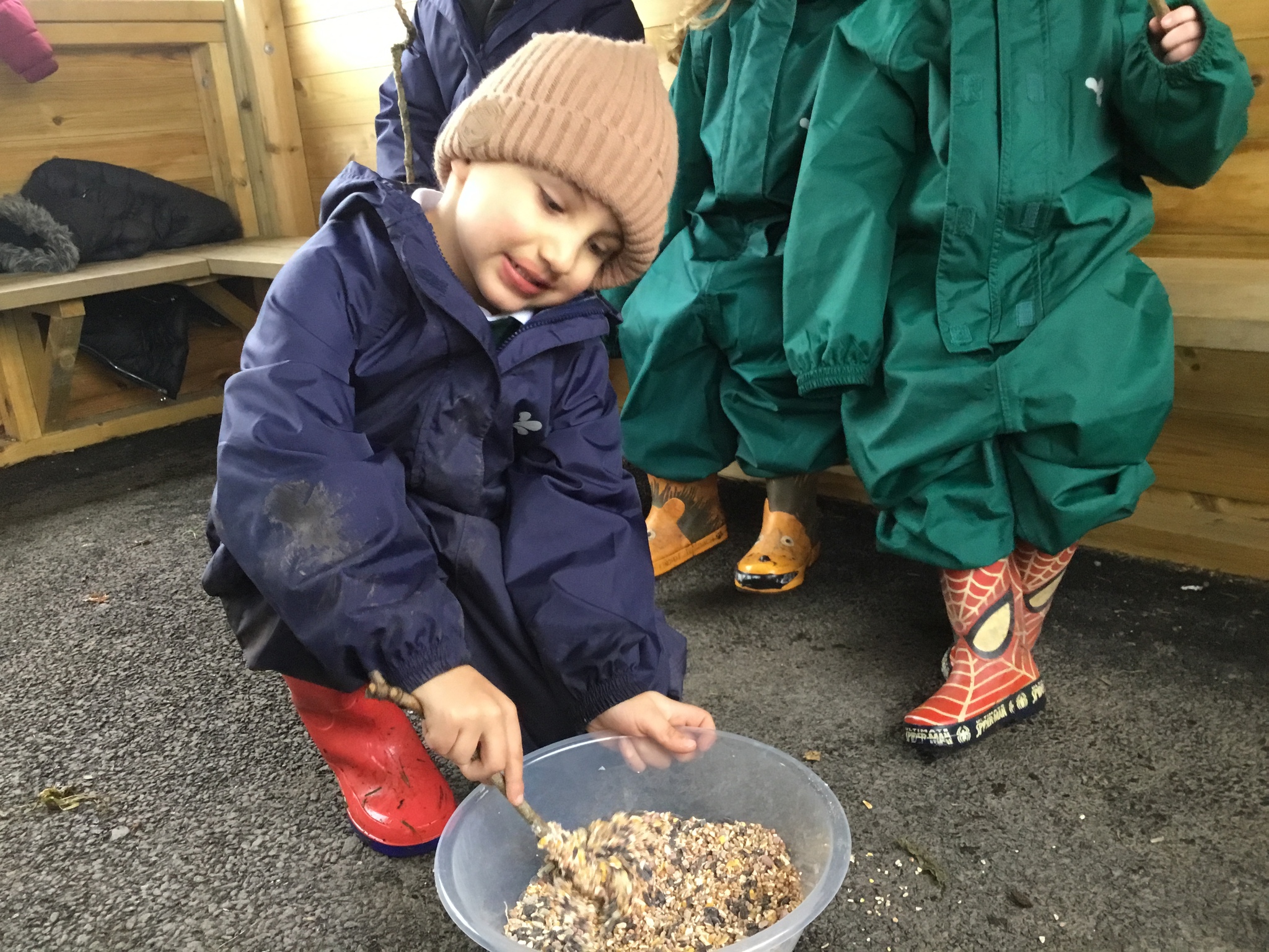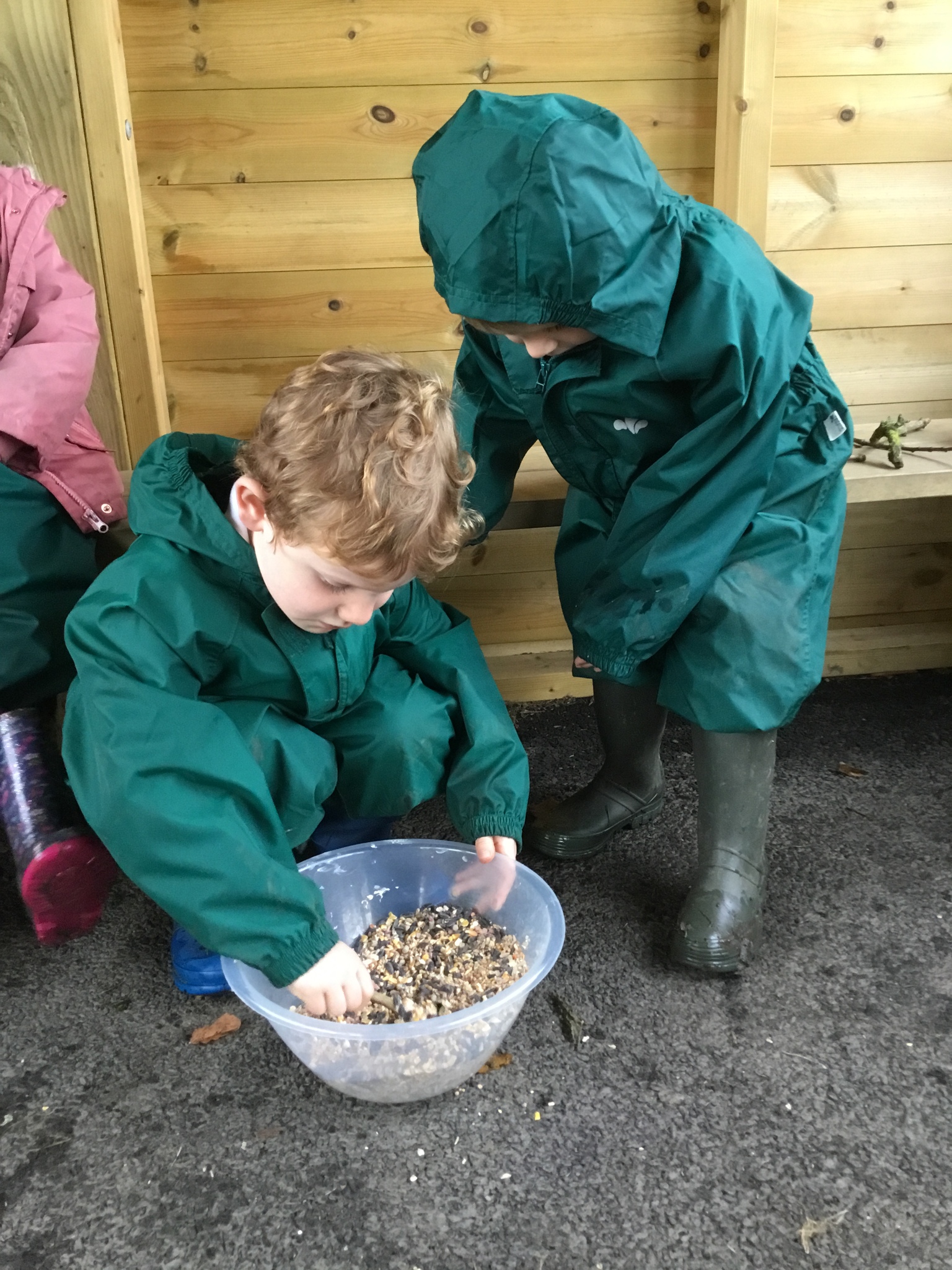 Our EYFS children have talked about what sort of animals might visit our field and what sort of food they might eat. We then worked in pairs to find a perfect stick, and used butter and bird seeds to create bird feeders. We then tied them onto branches around the field for the birds to eat.