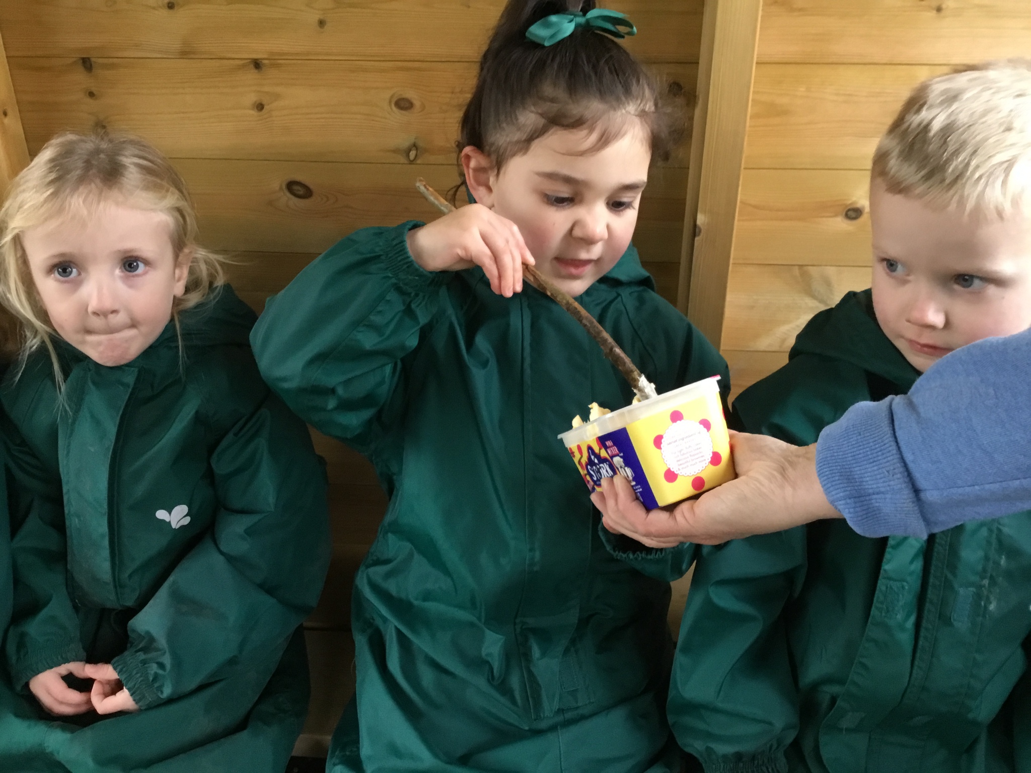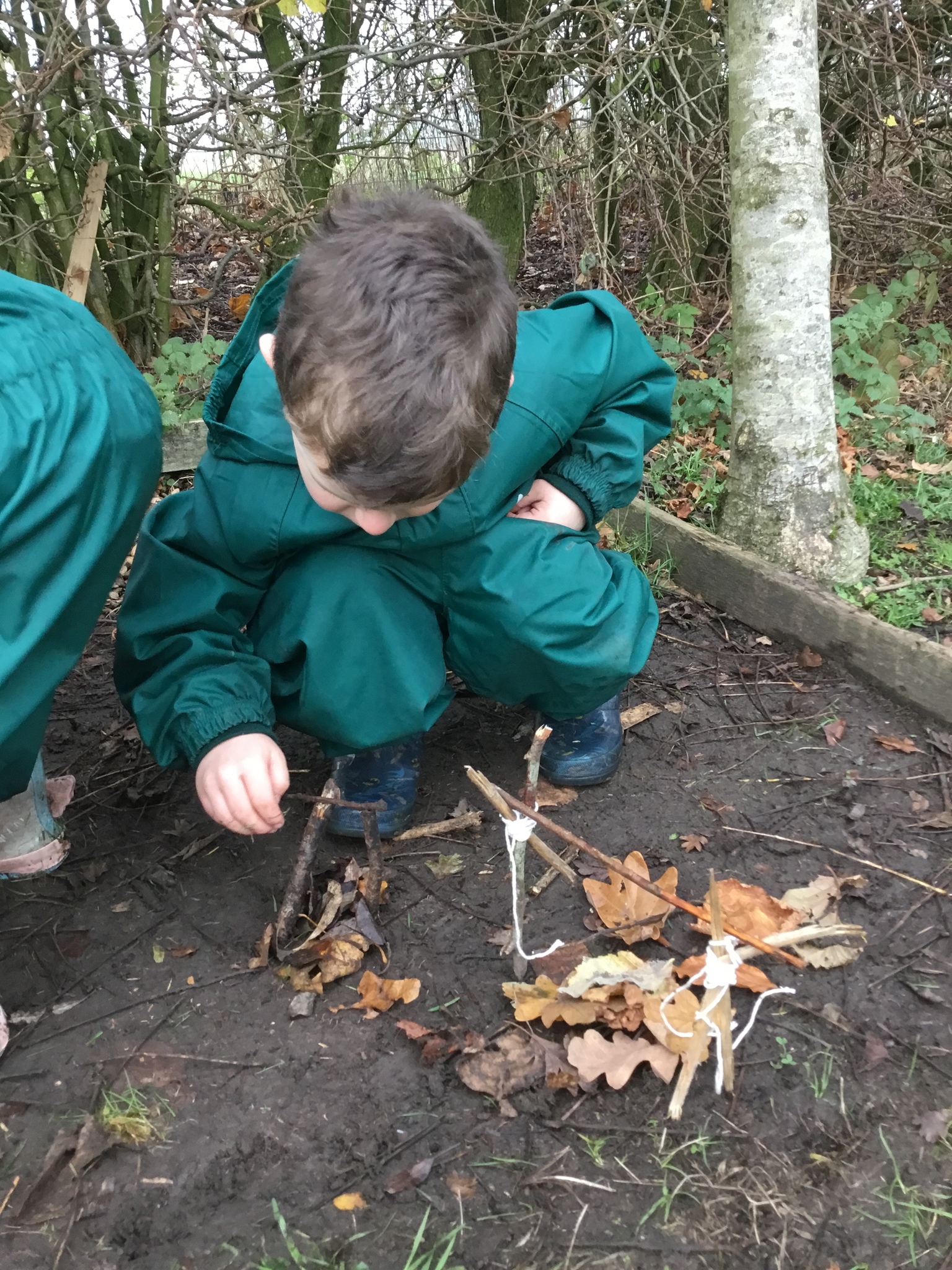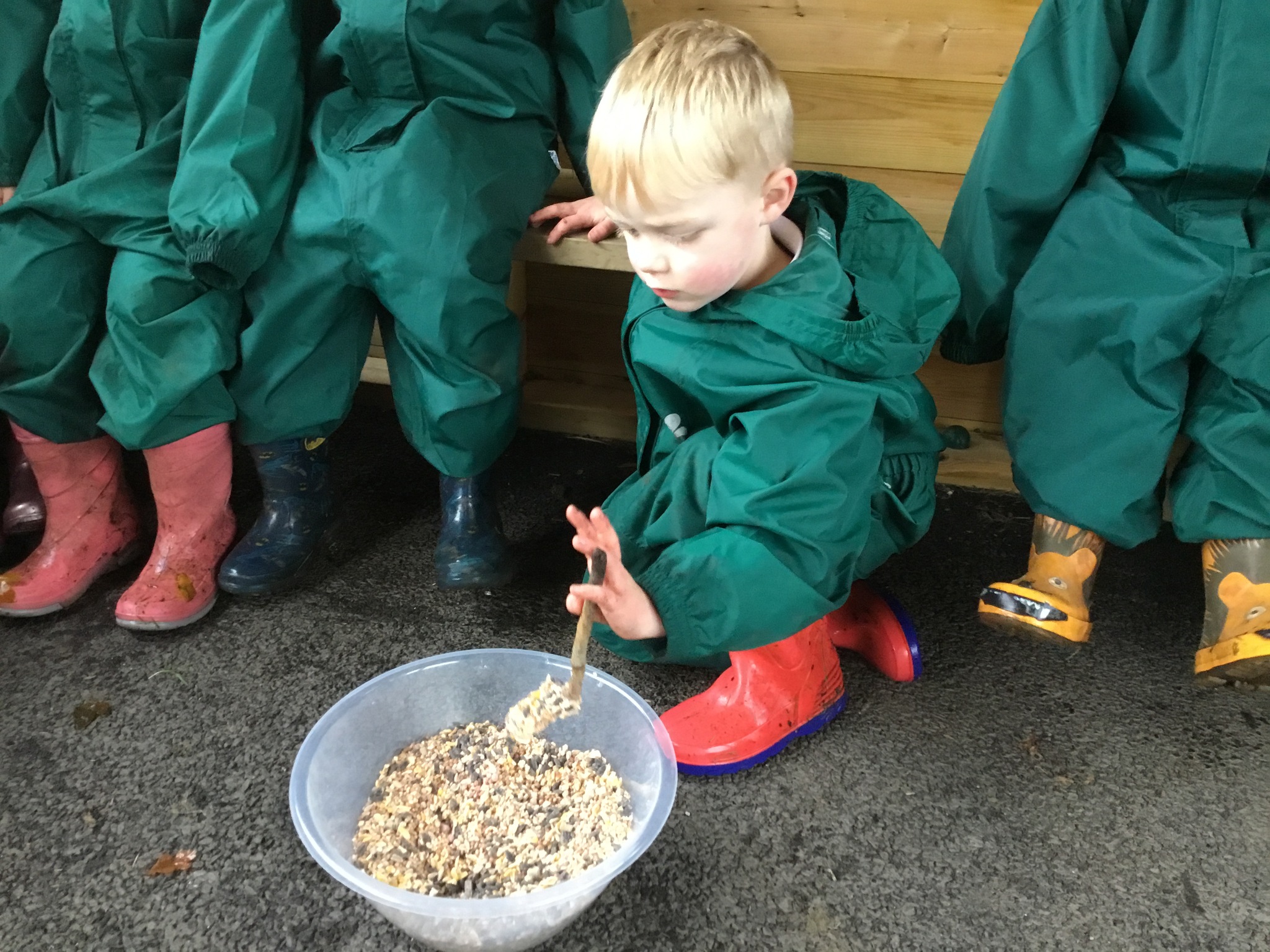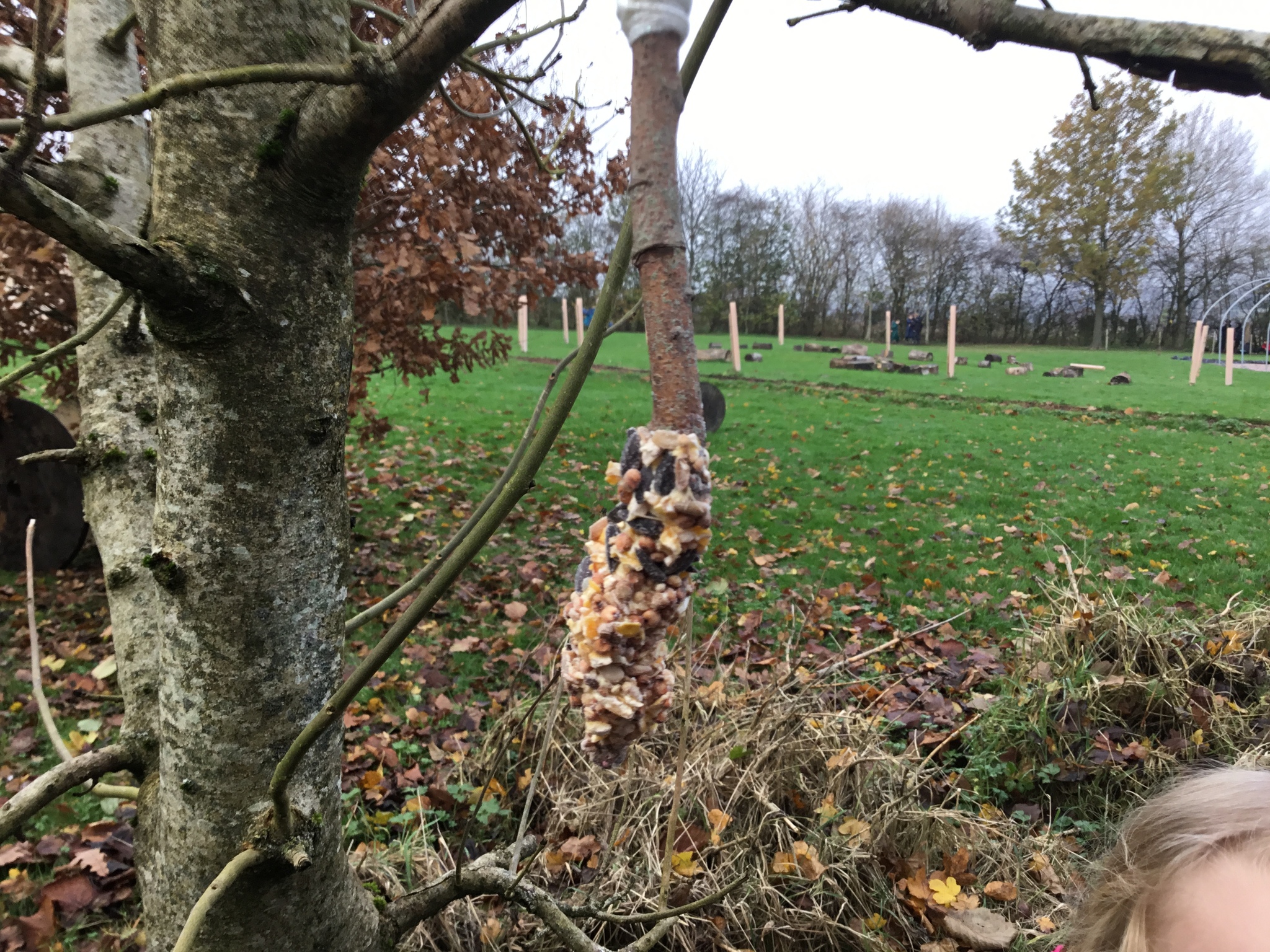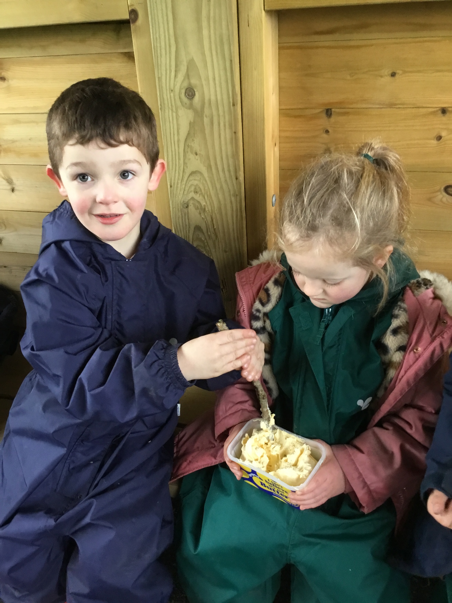 Our EYFS children have talked about what sort of animals might visit our field and what sort of food they might eat. We then worked in pairs to find a perfect stick, and used butter and bird seeds to create bird feeders. We then tied them onto branches around the field for the birds to eat.