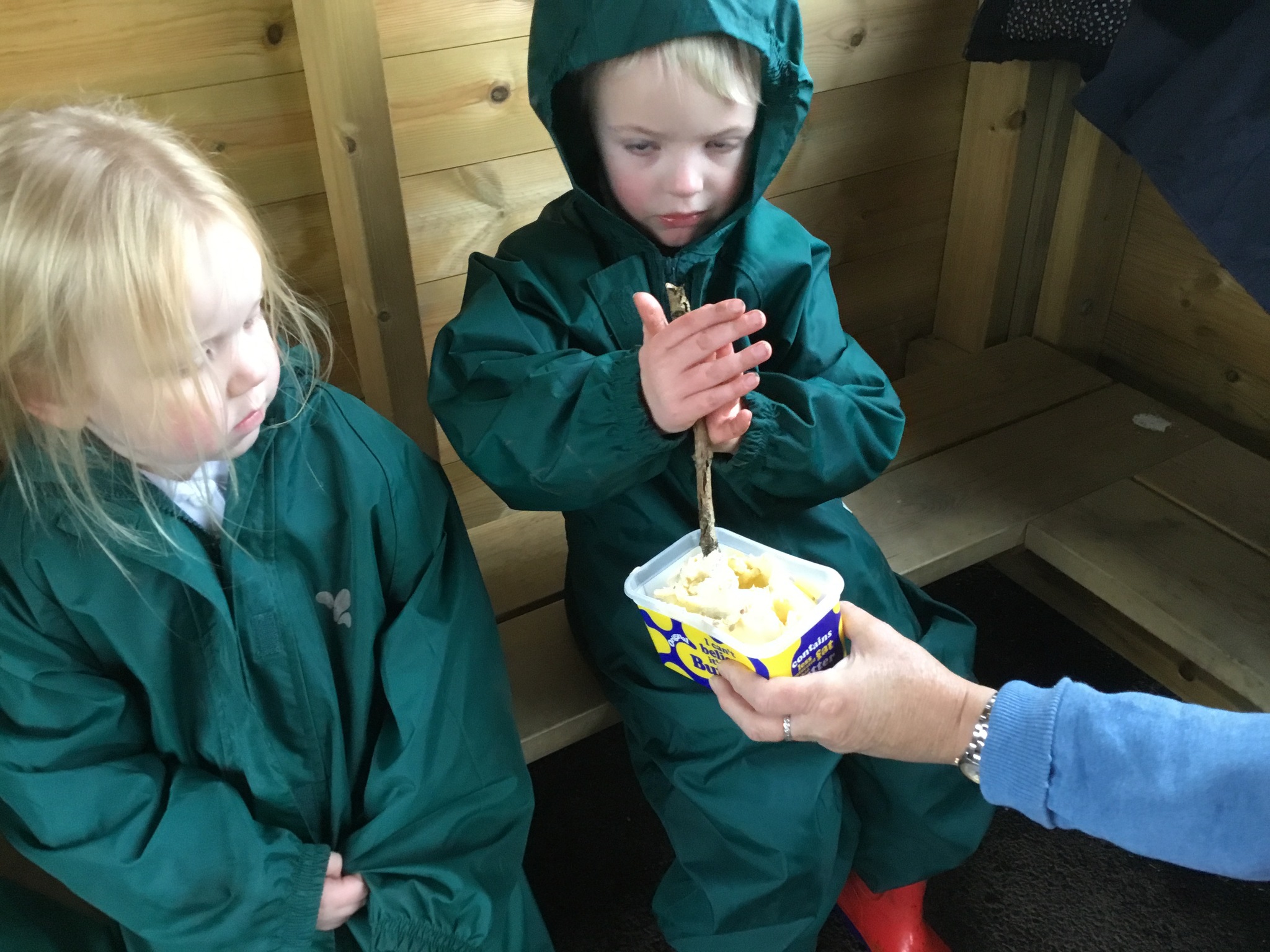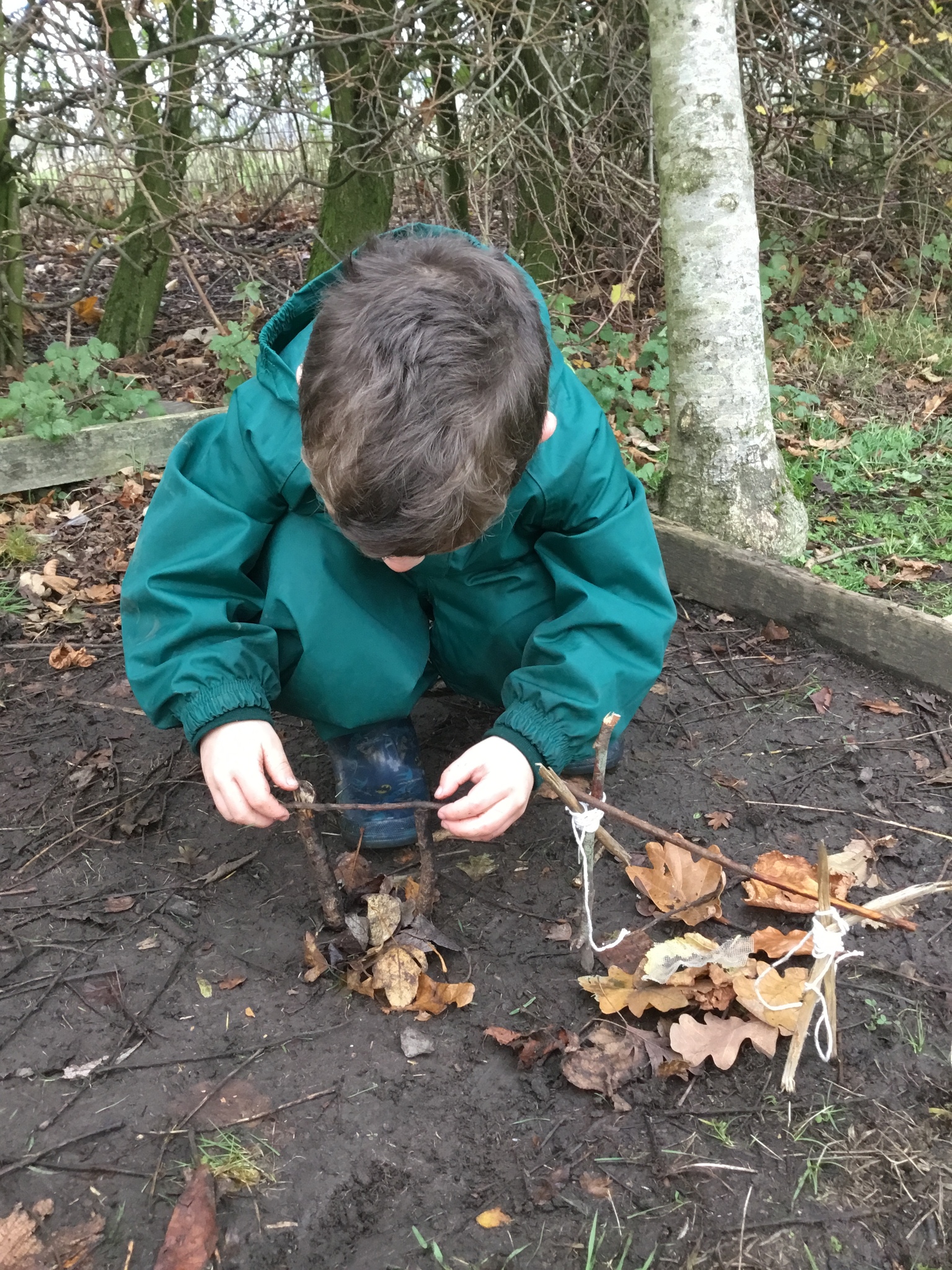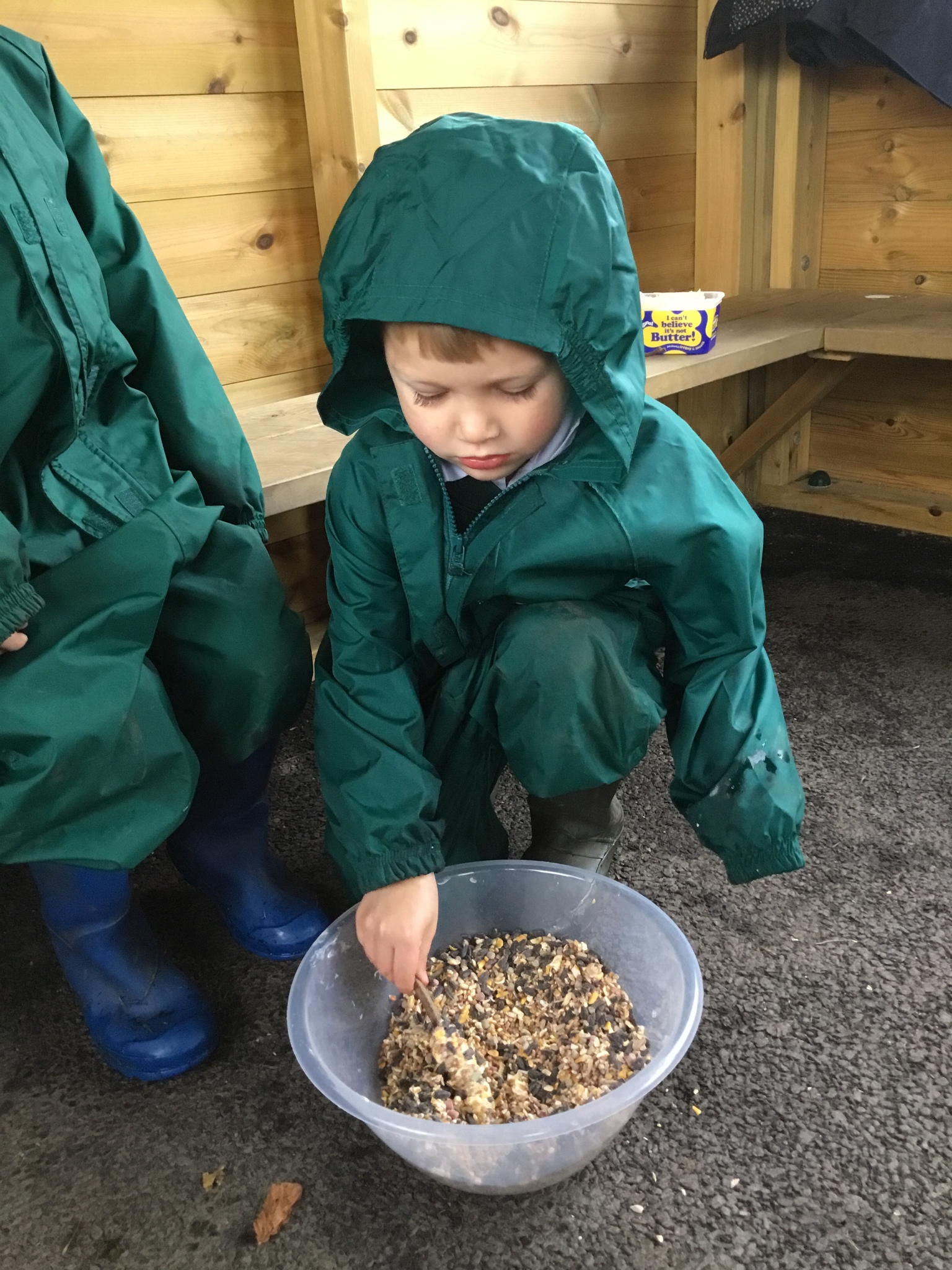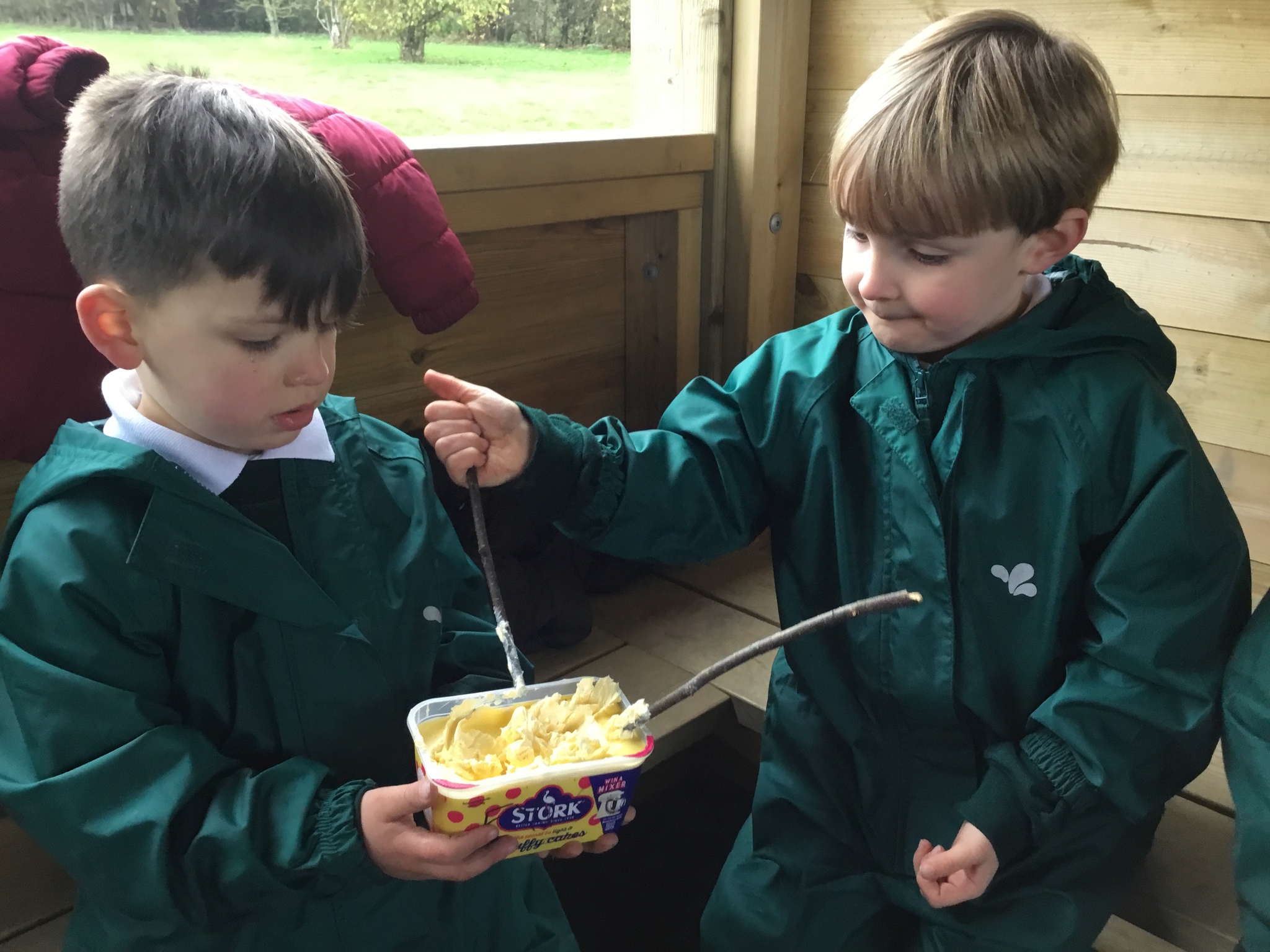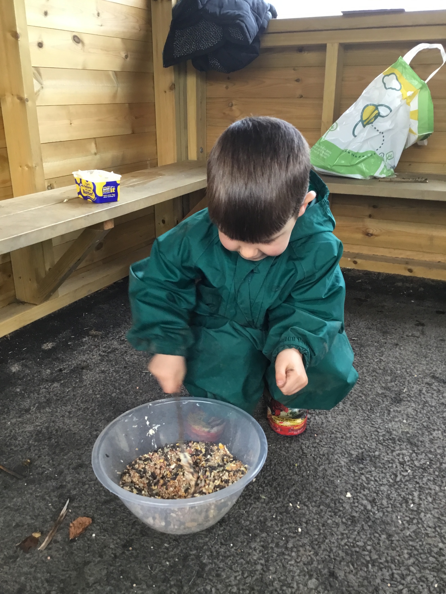 Our EYFS children have talked about what sort of animals might visit our field and what sort of food they might eat. We then worked in pairs to find a perfect stick, and used butter and bird seeds to create bird feeders. We then tied them onto branches around the field for the birds to eat.