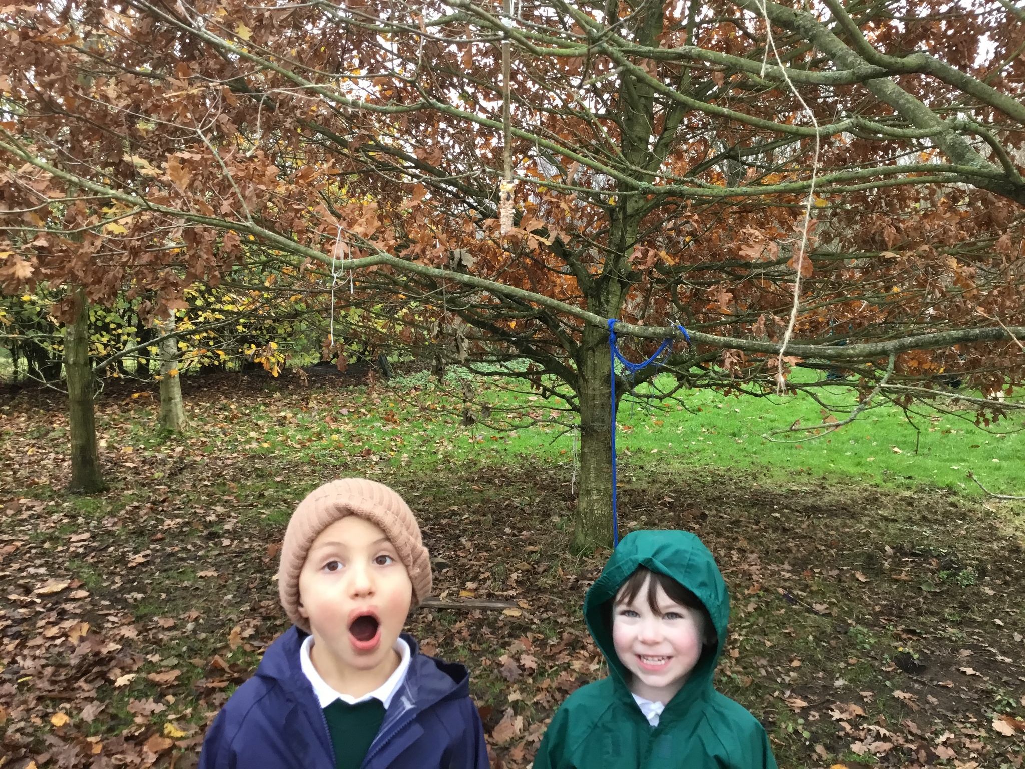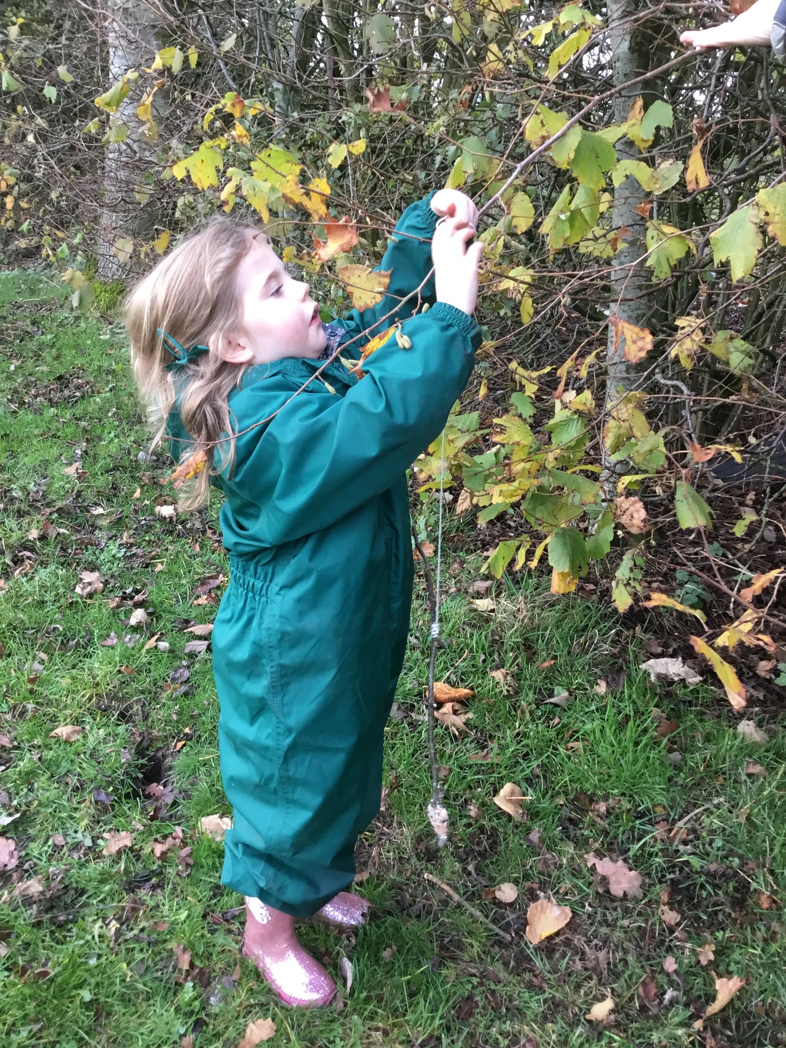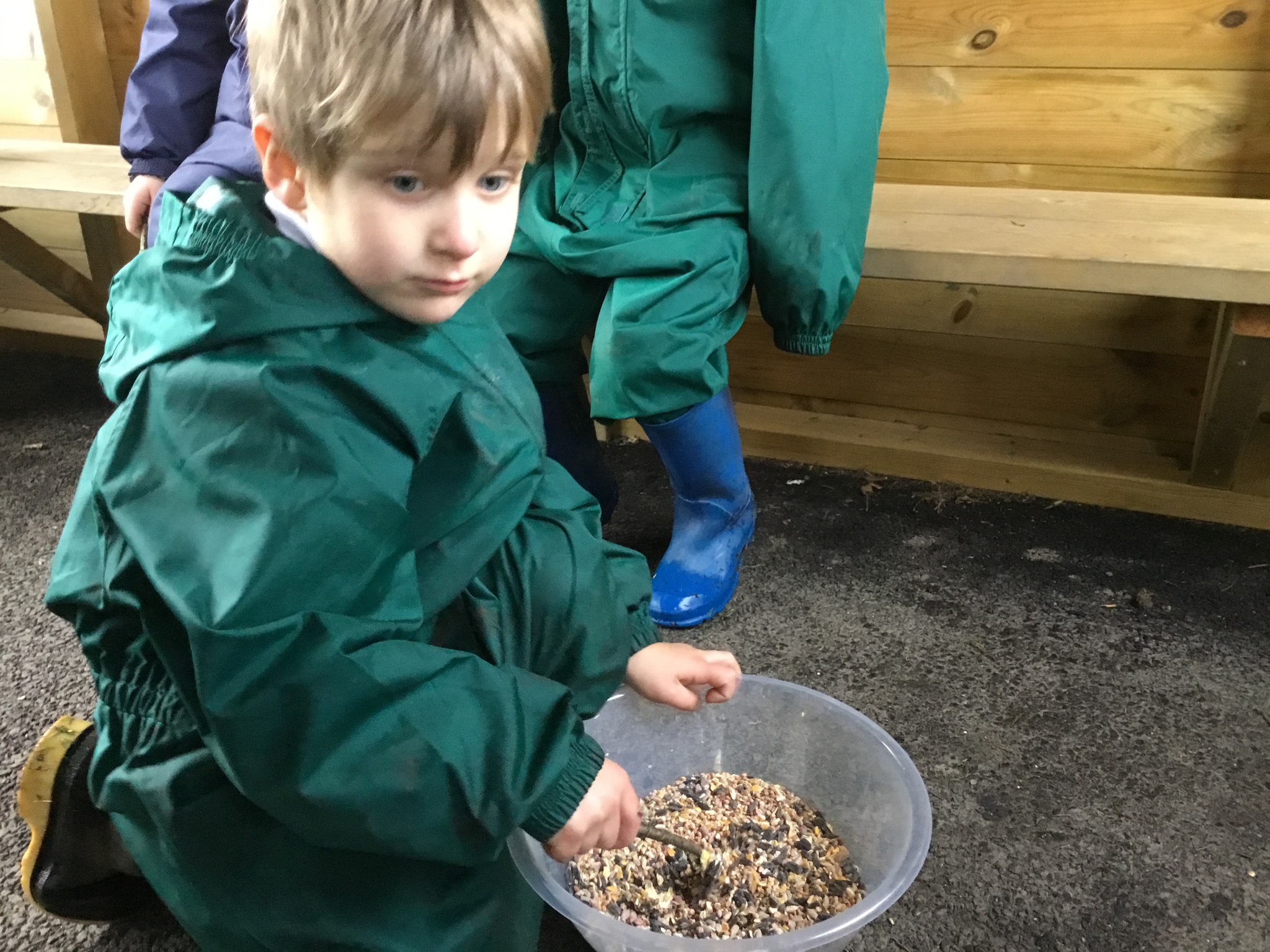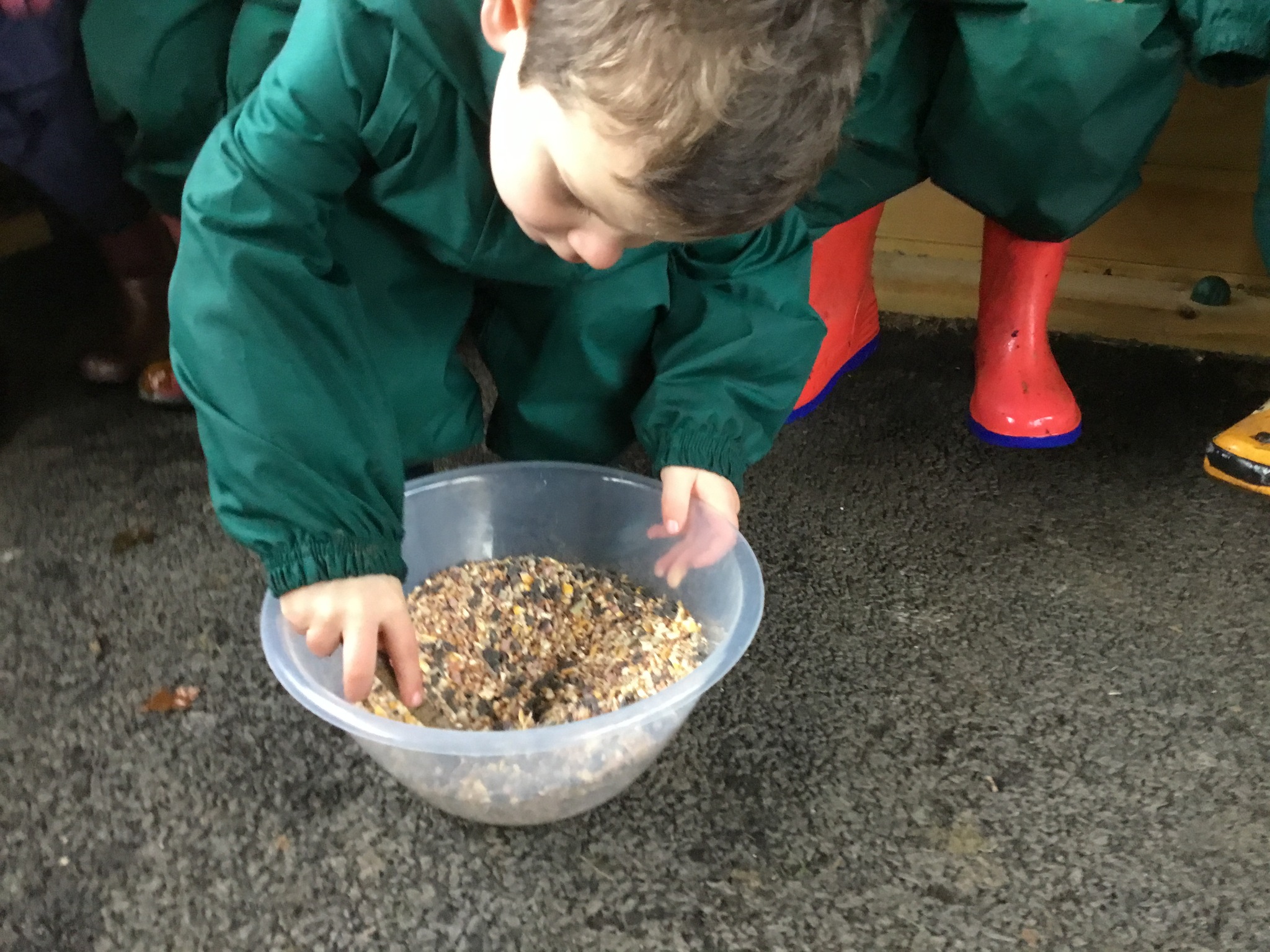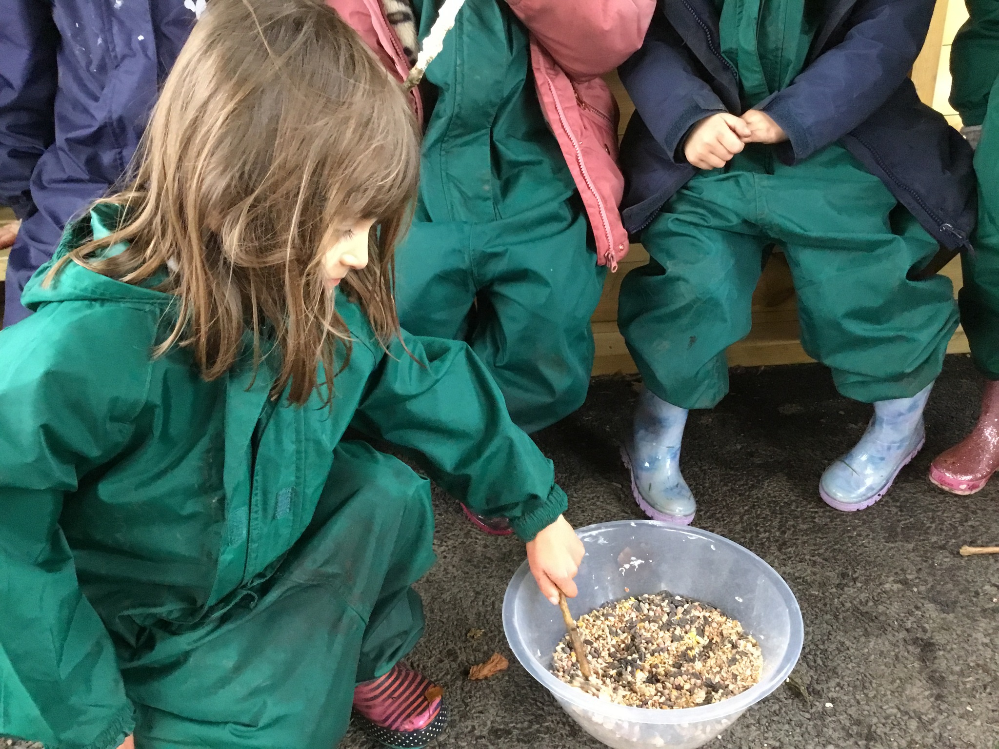Our EYFS children have talked about what sort of animals might visit our field and what sort of food they might eat. We then worked in pairs to find a perfect stick, and used butter and bird seeds to create bird feeders. We then tied them onto branches around the field for the birds to eat.