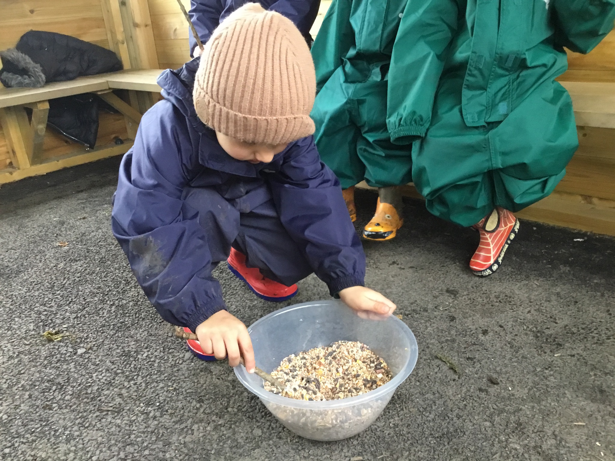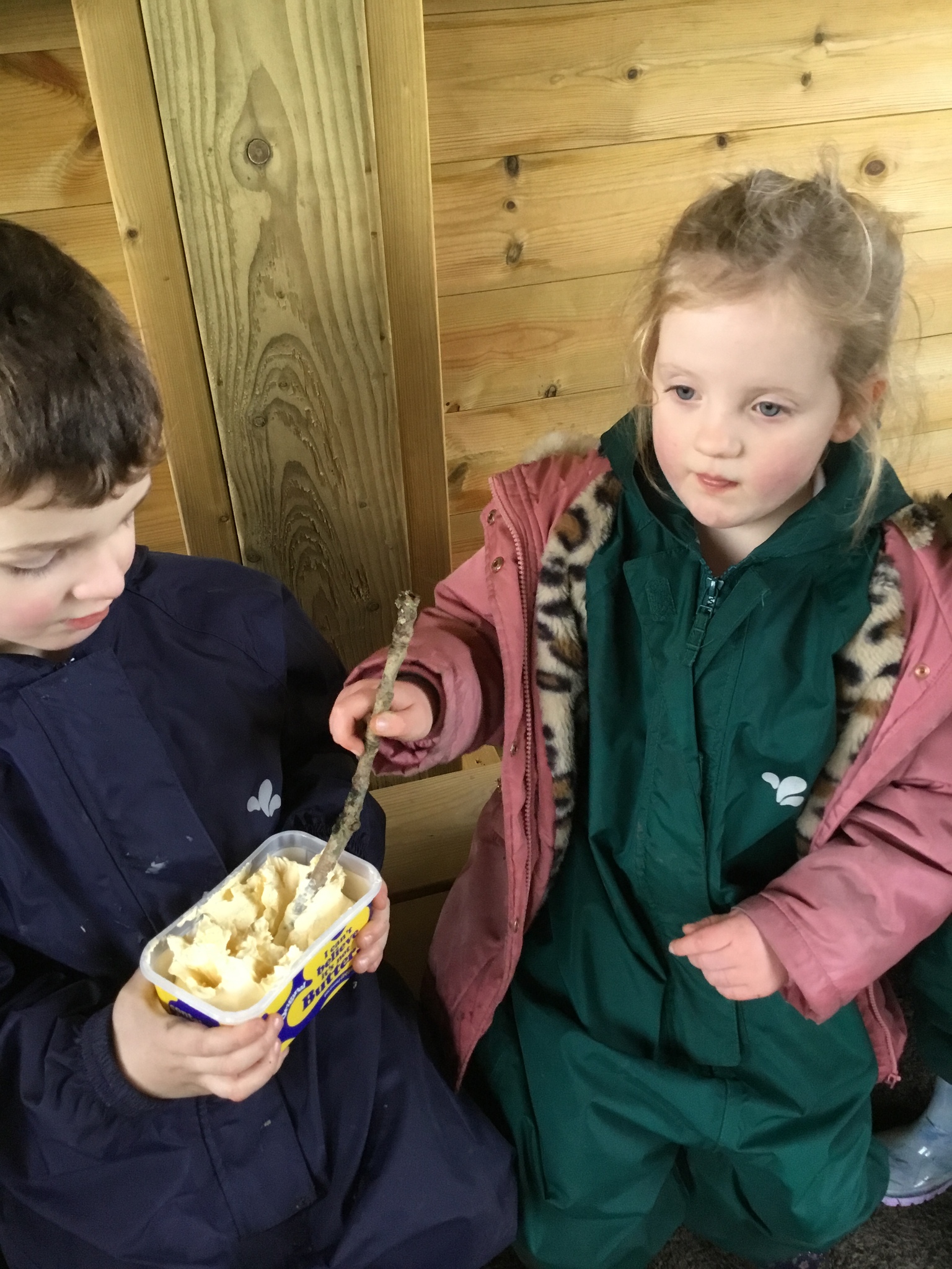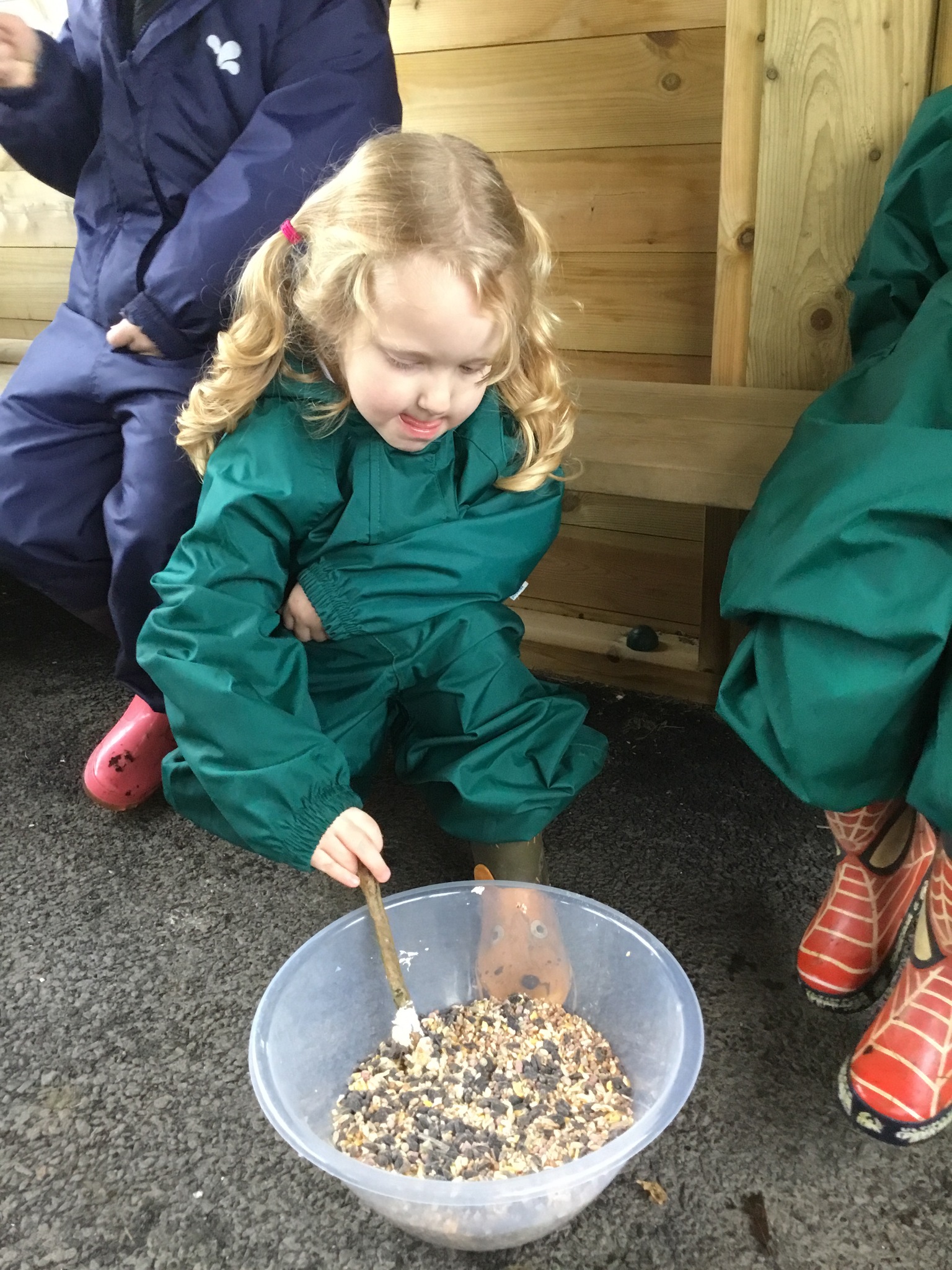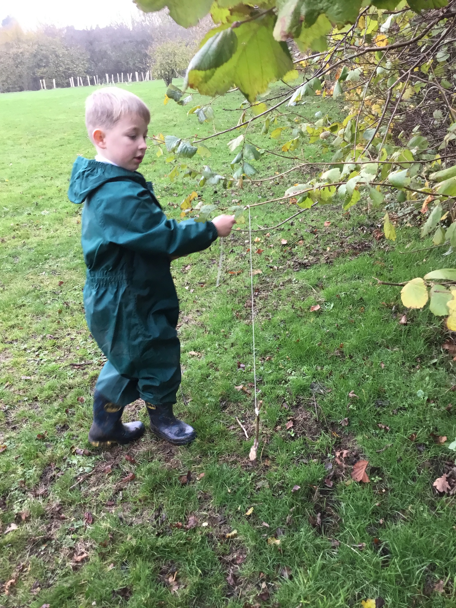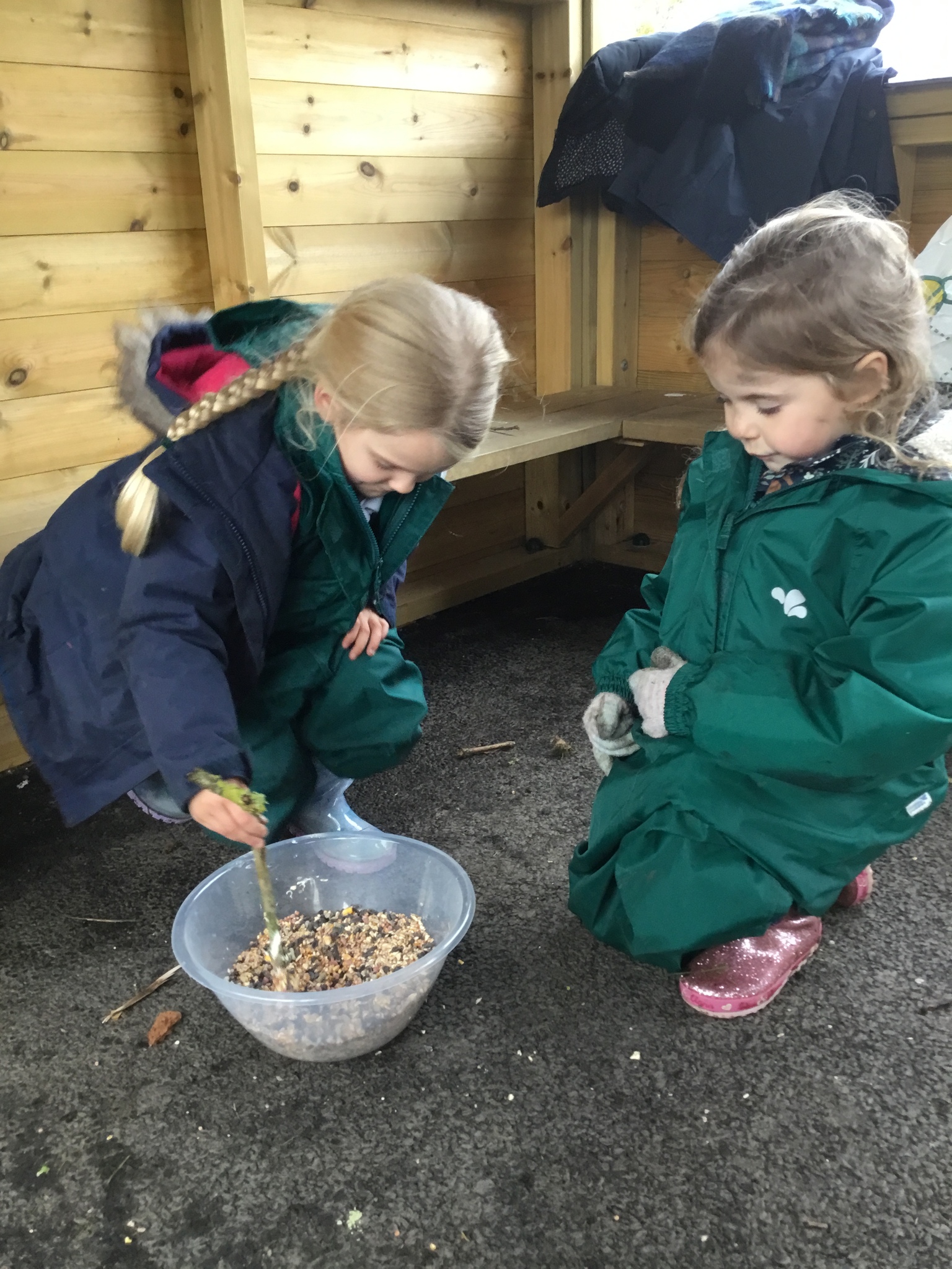 Our EYFS children have talked about what sort of animals might visit our field and what sort of food they might eat. We then worked in pairs to find a perfect stick, and used butter and bird seeds to create bird feeders. We then tied them onto branches around the field for the birds to eat.