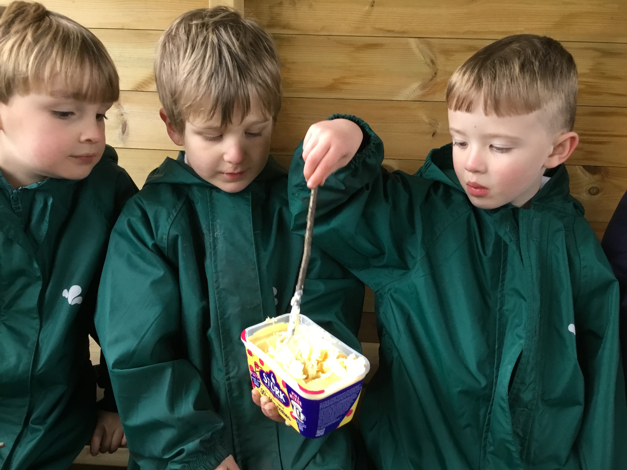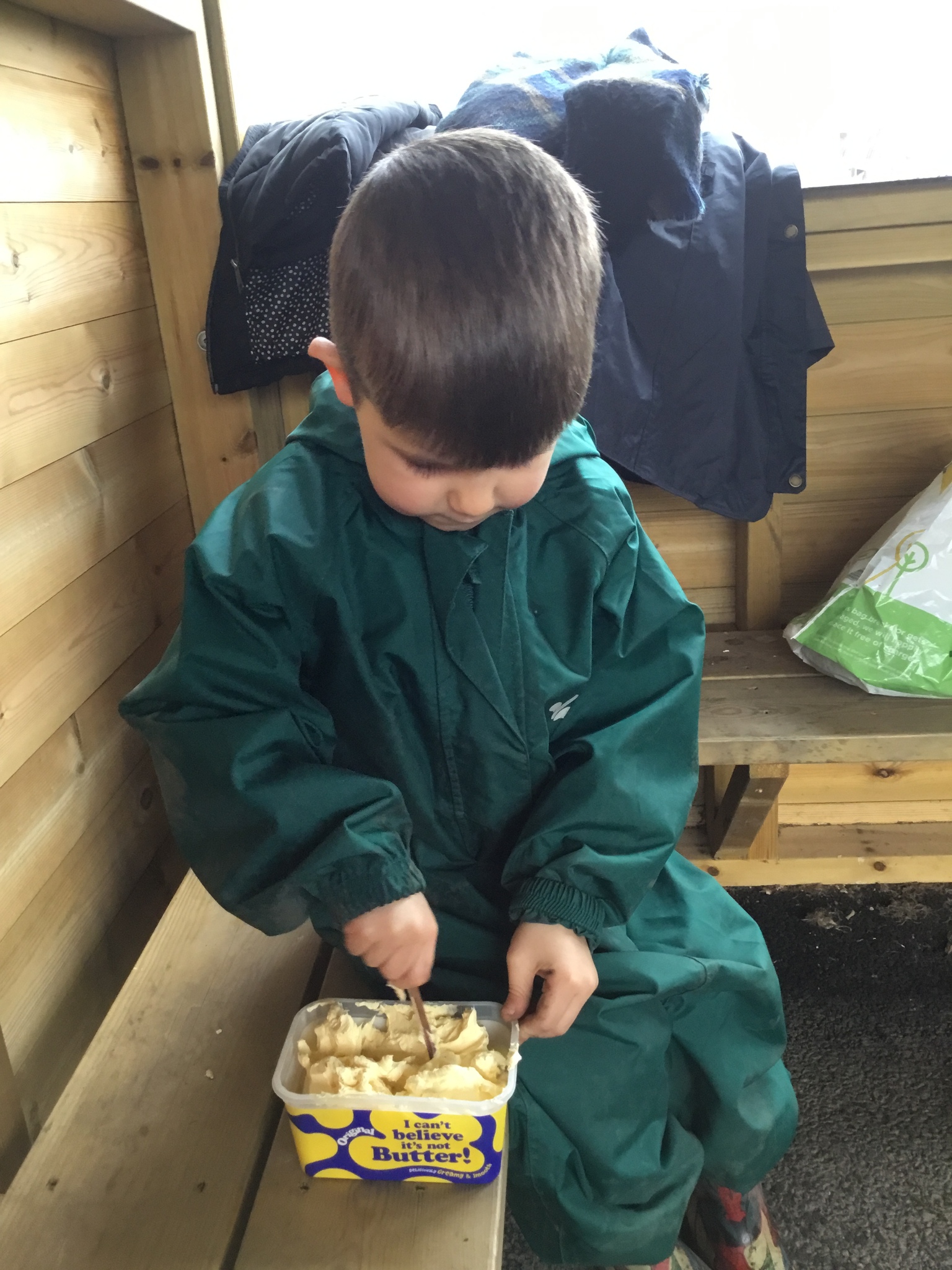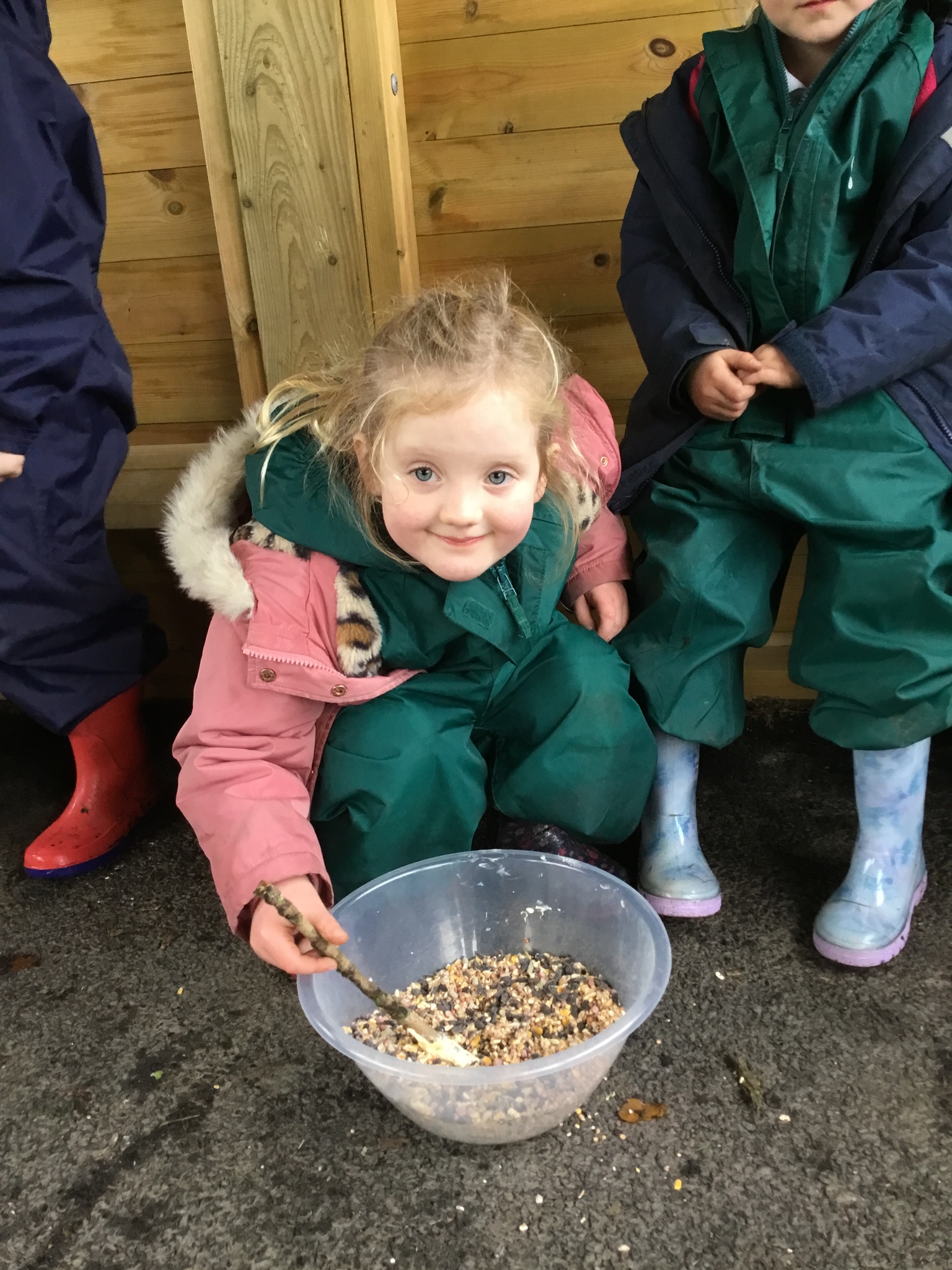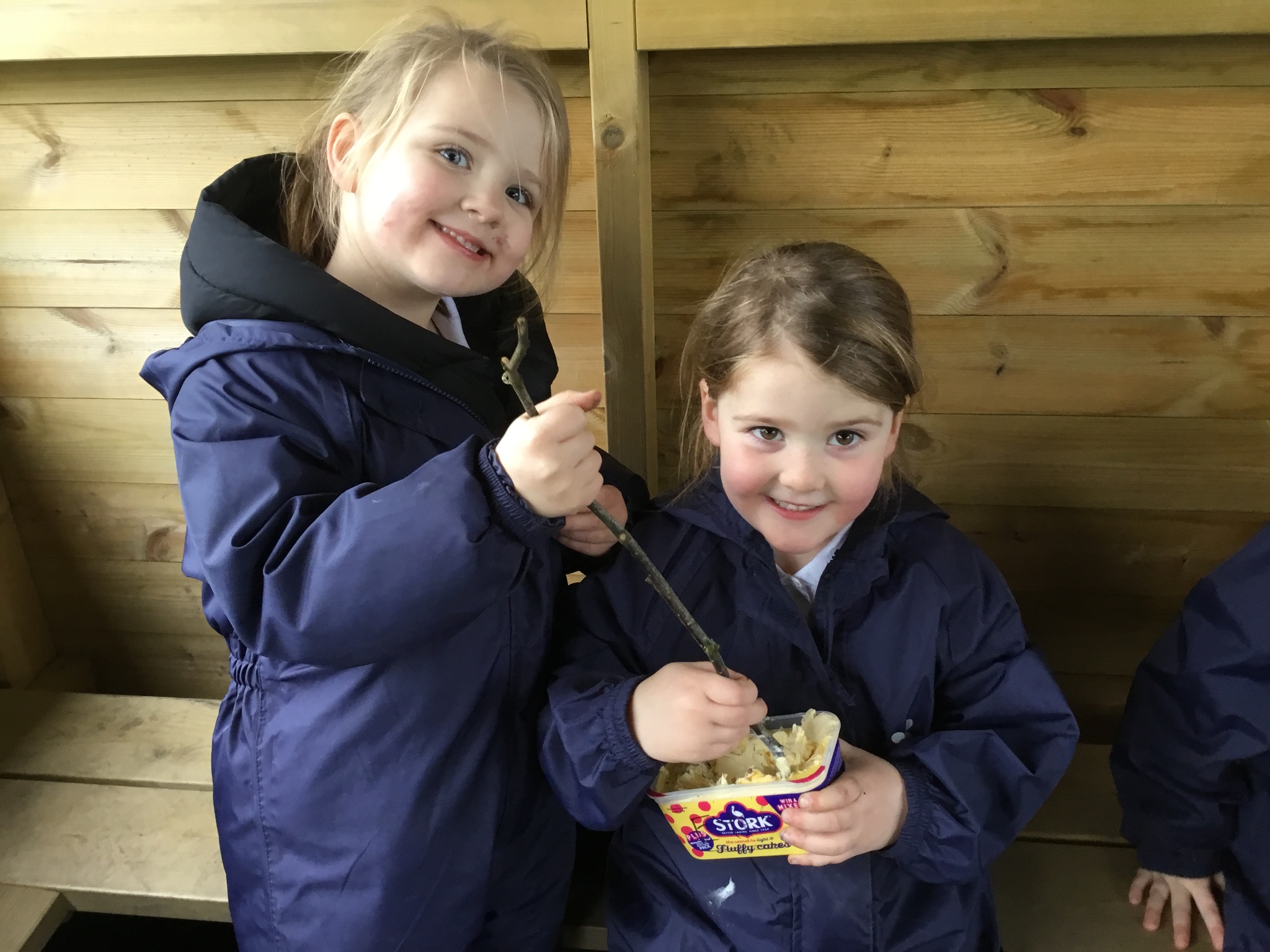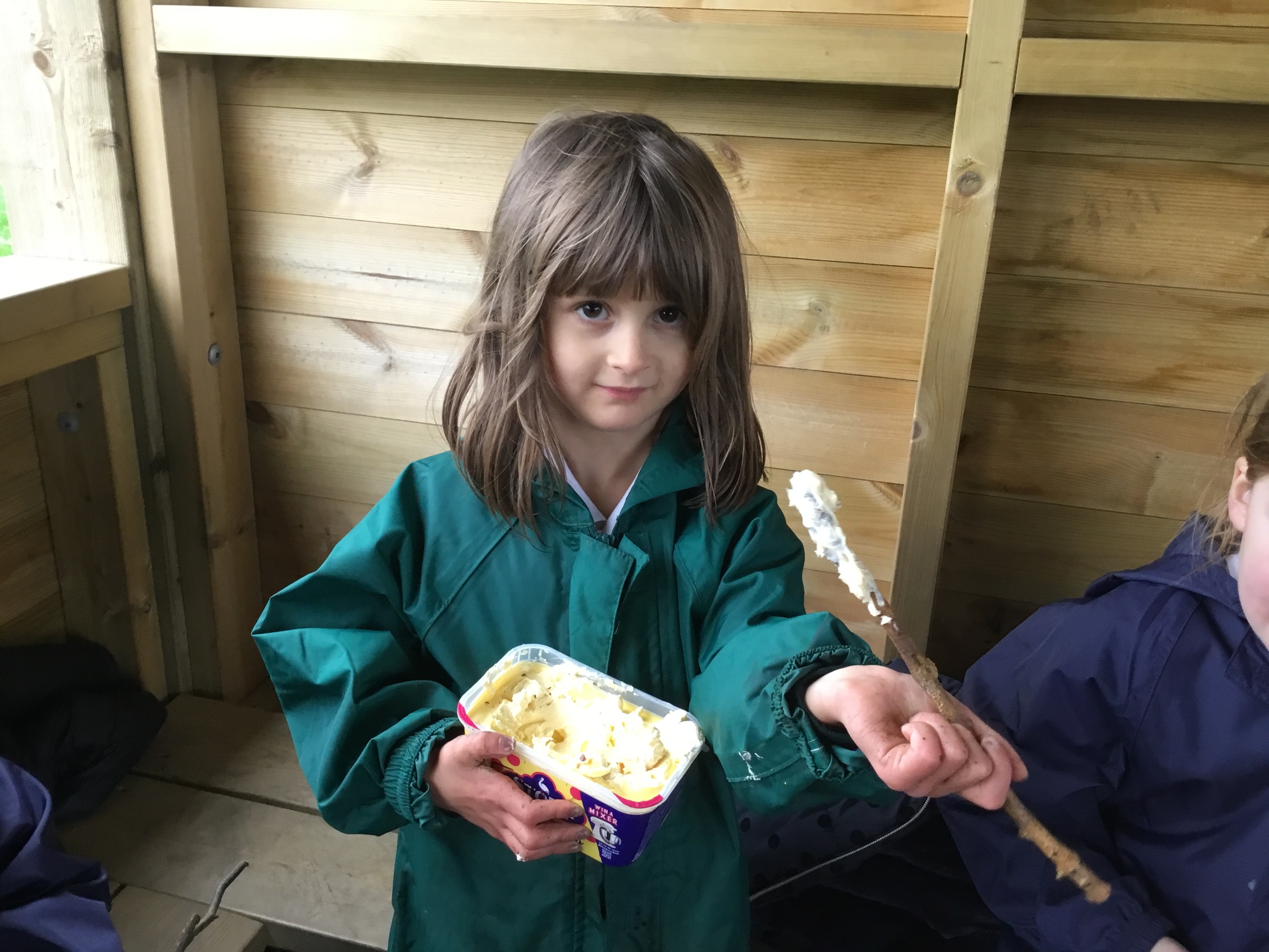 Our EYFS children have talked about what sort of animals might visit our field and what sort of food they might eat. We then worked in pairs to find a perfect stick, and used butter and bird seeds to create bird feeders. We then tied them onto branches around the field for the birds to eat.