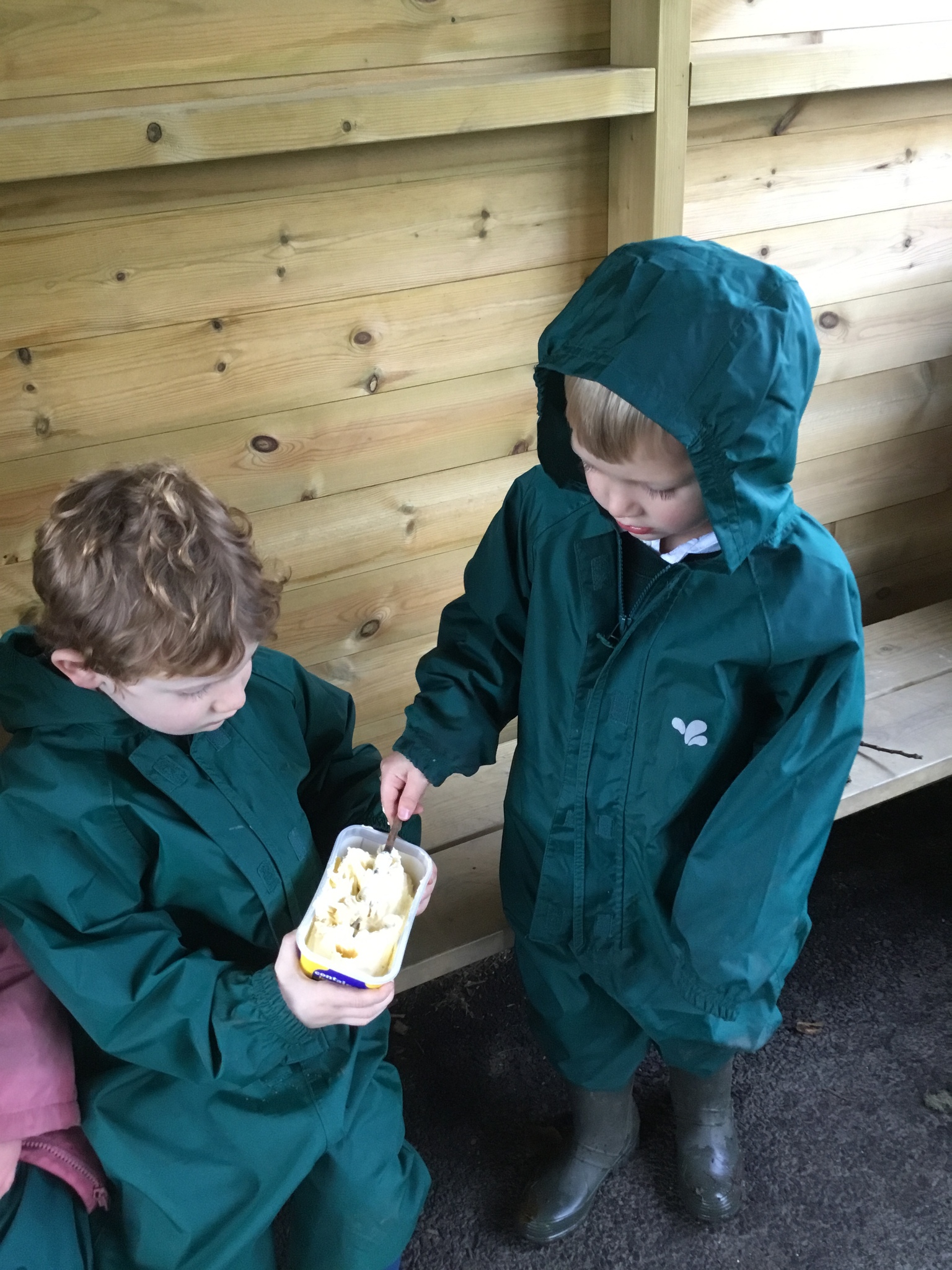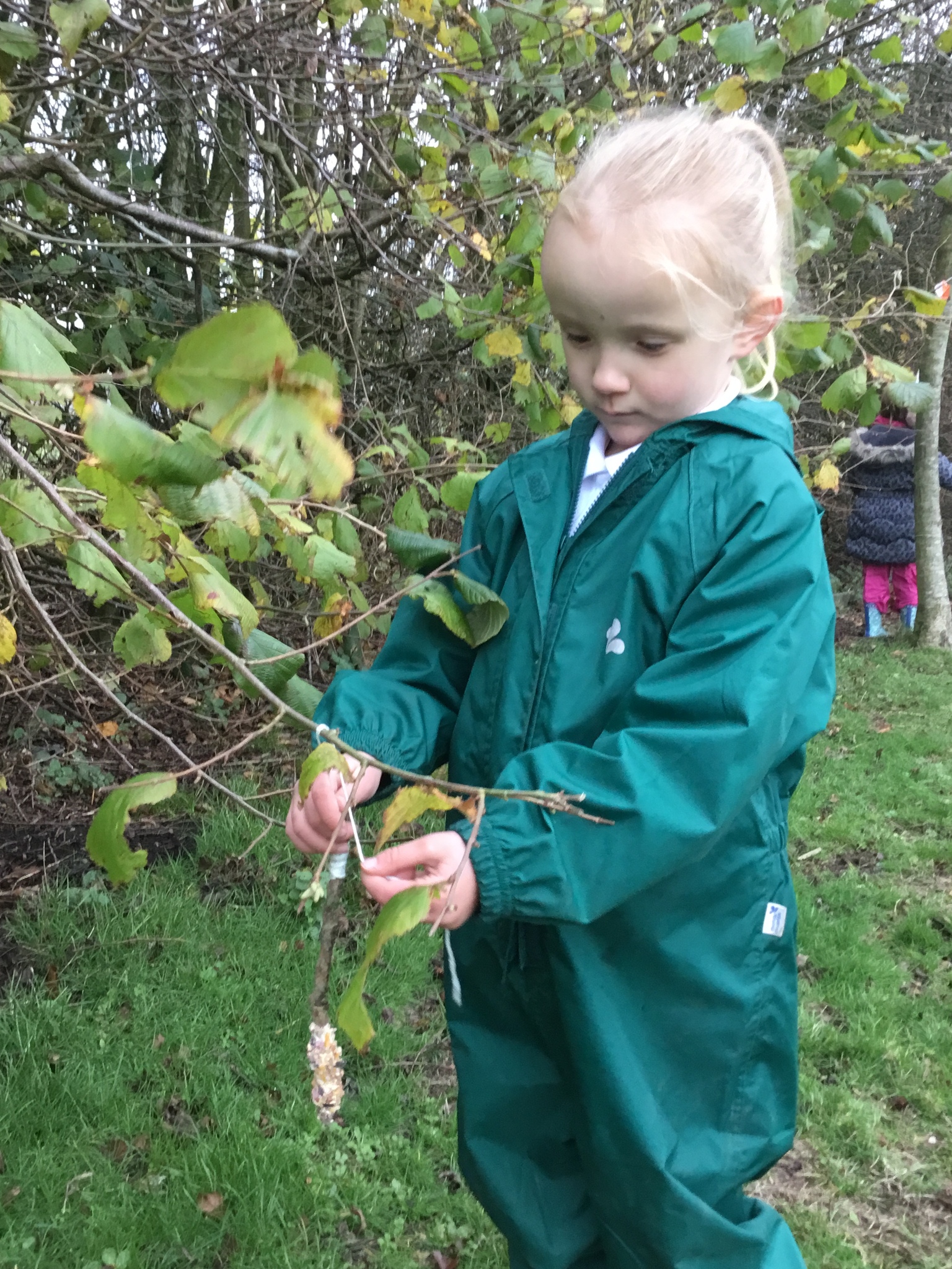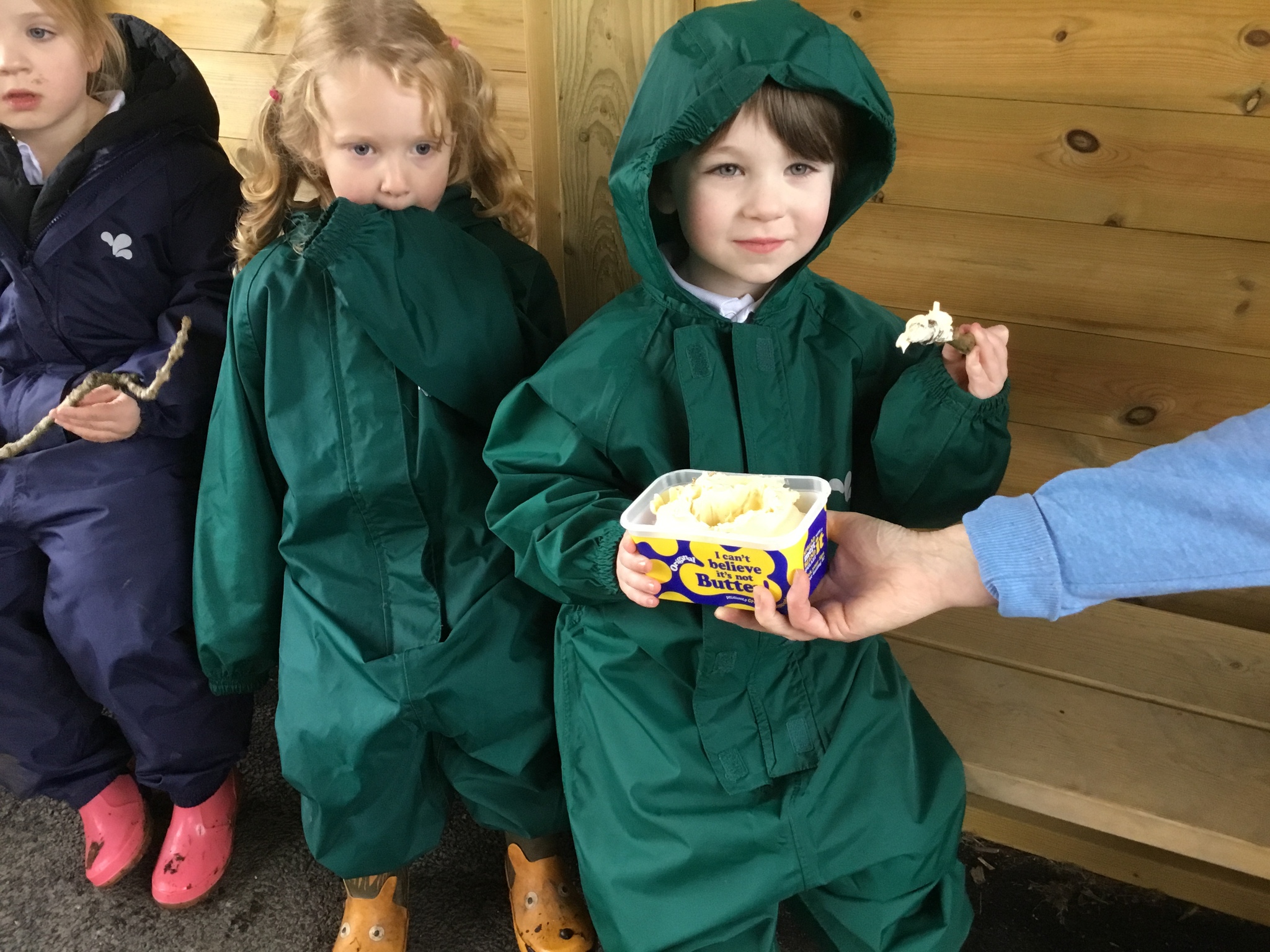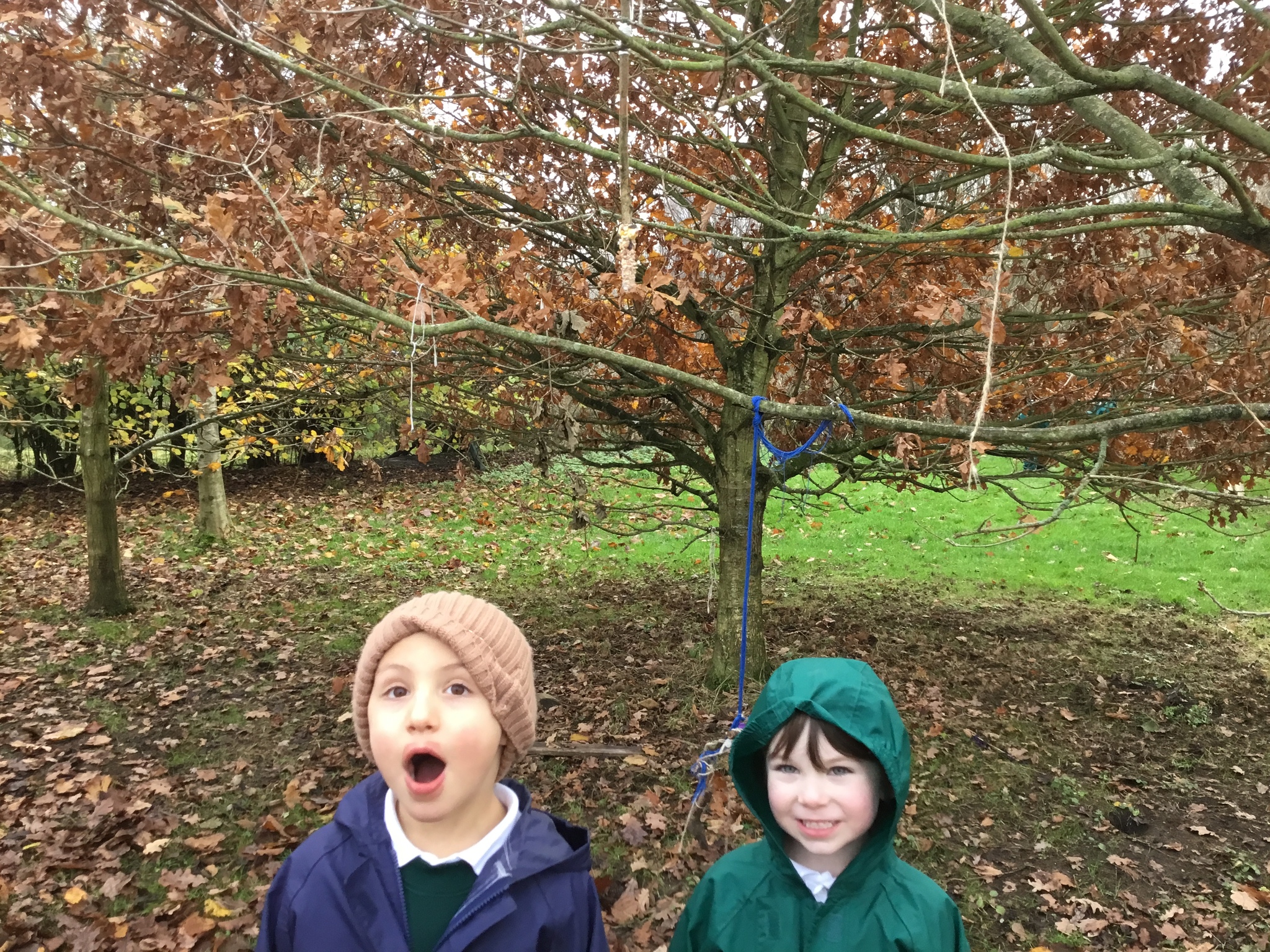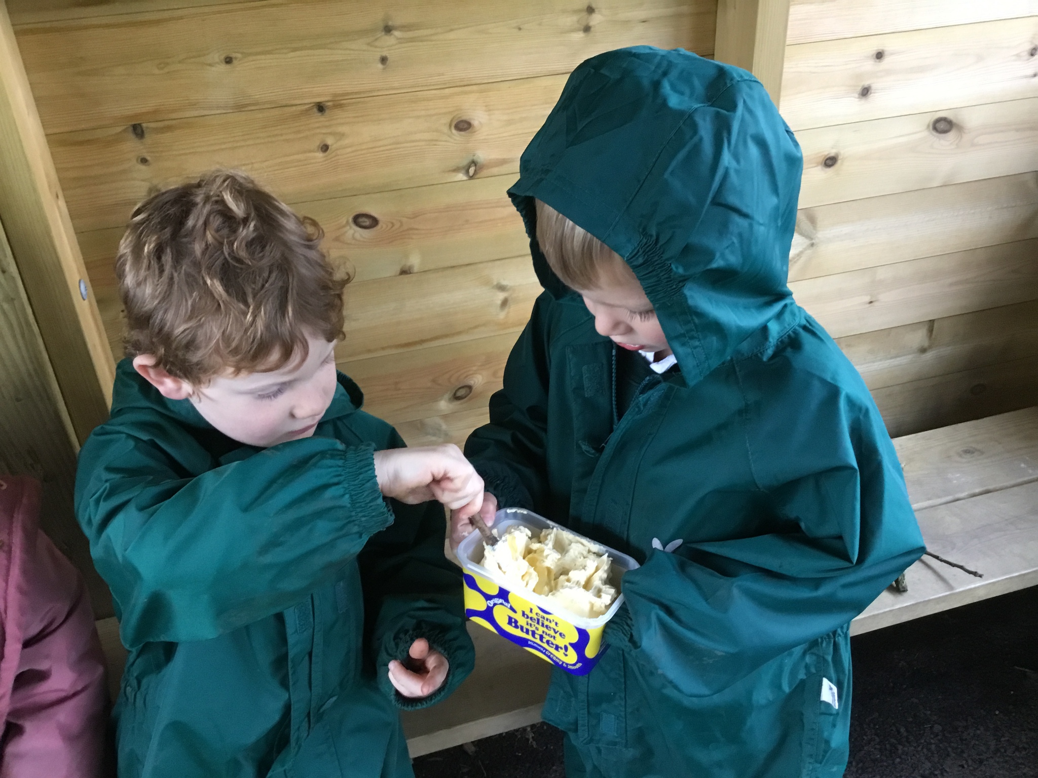 Our EYFS children have talked about what sort of animals might visit our field and what sort of food they might eat. We then worked in pairs to find a perfect stick, and used butter and bird seeds to create bird feeders. We then tied them onto branches around the field for the birds to eat.