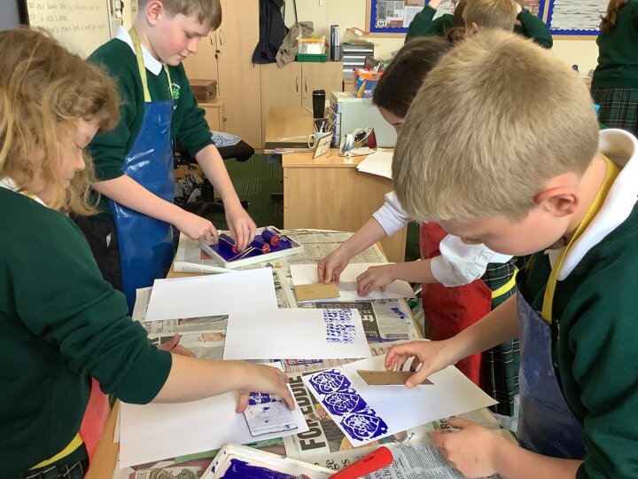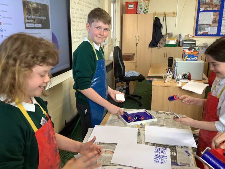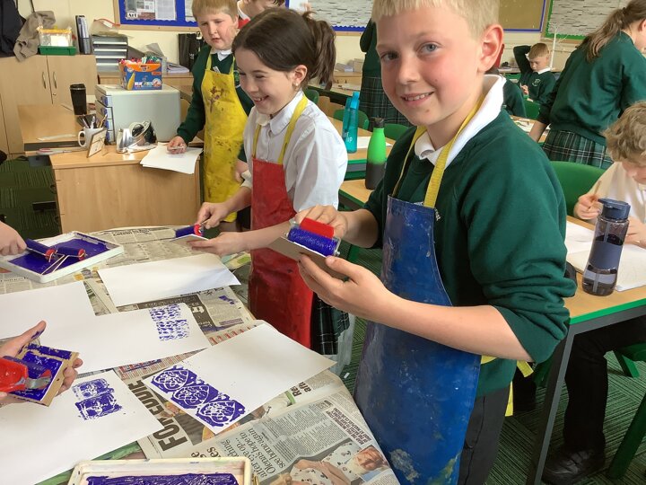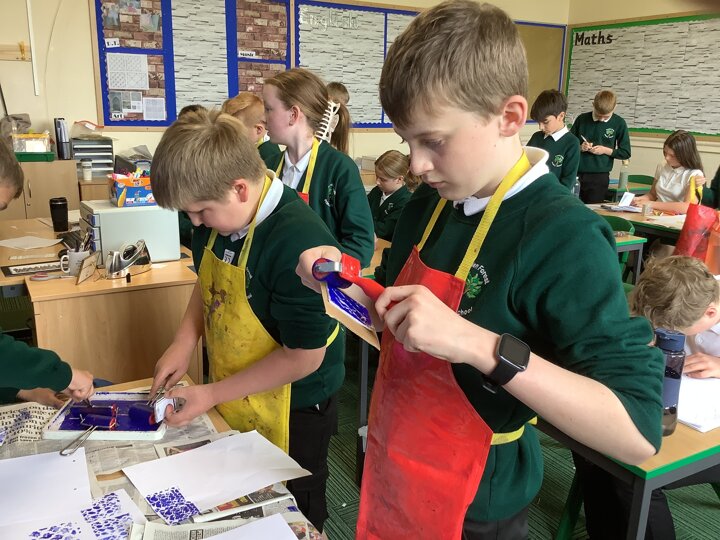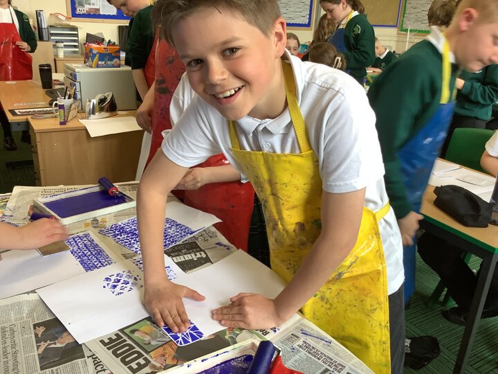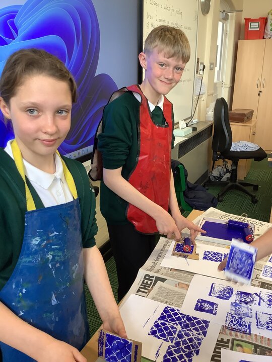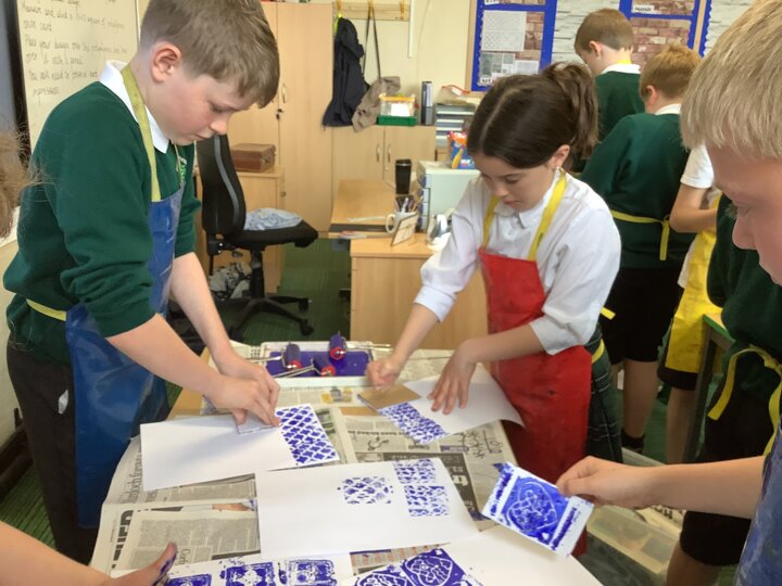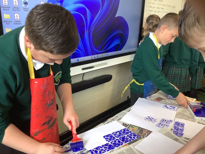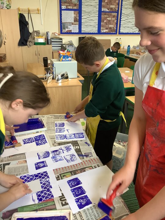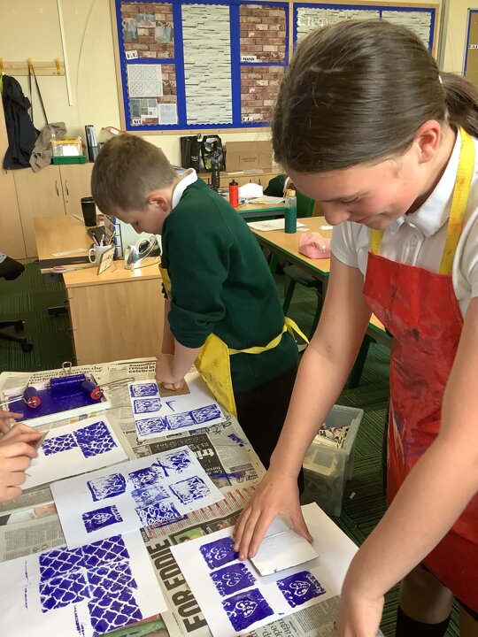 This week has been a busy week for Year 6 in more ways than one! They have learned about patterns and designs linked to the History topic of early Islamic Civilations. They enjoyed creating their own block pattern with shapes which they tesselated and they printed onto paper using rollers and ink.