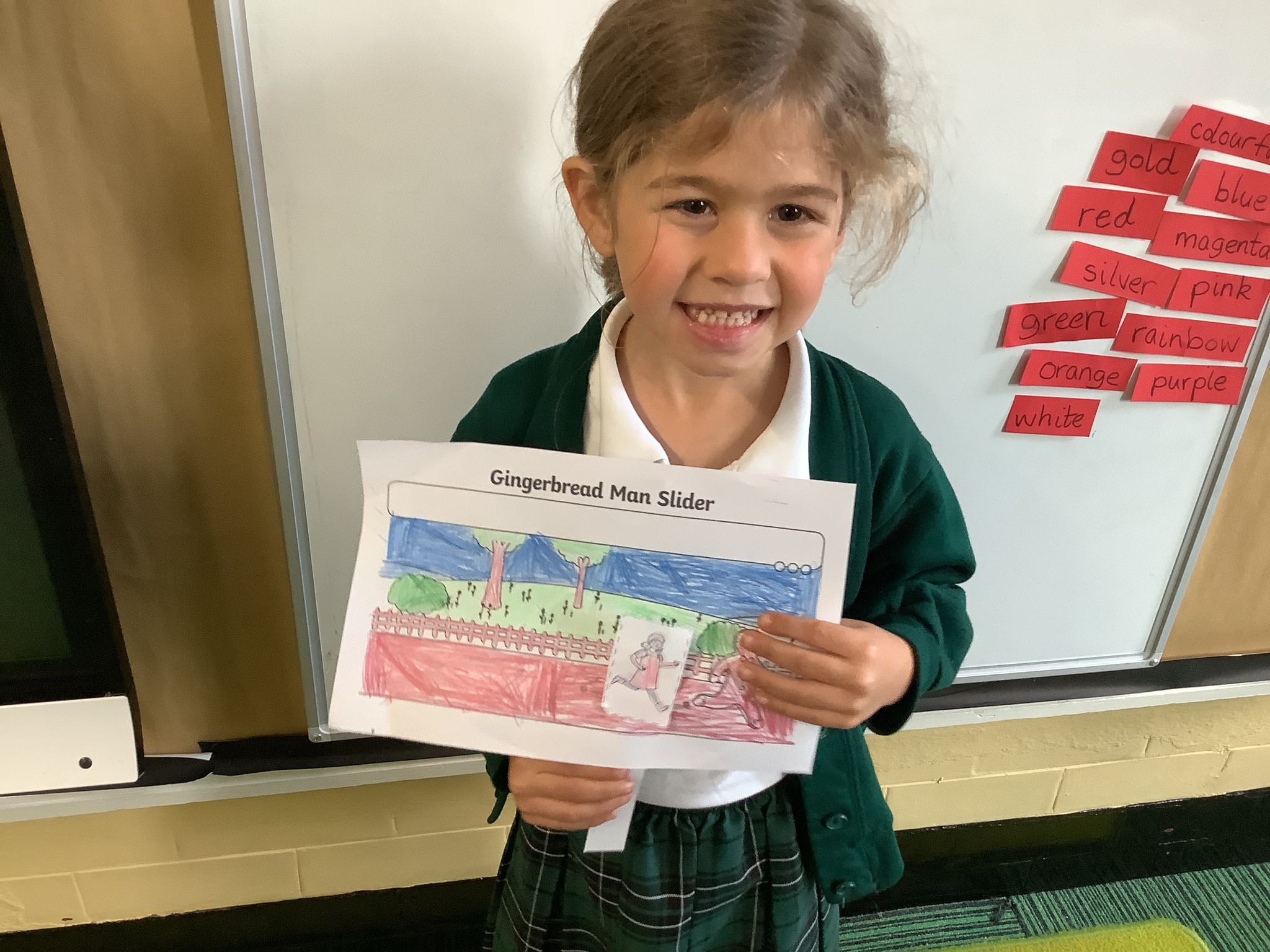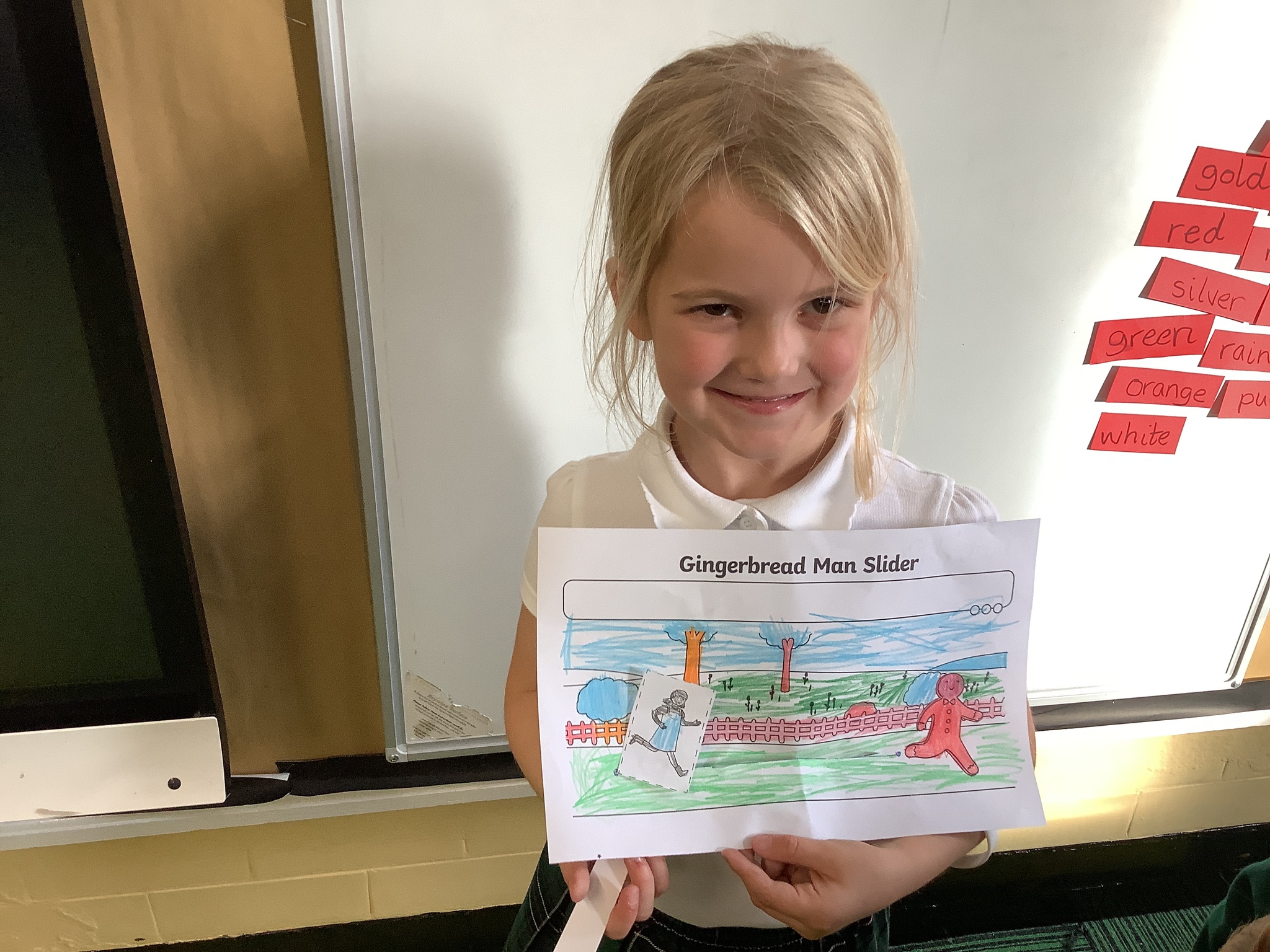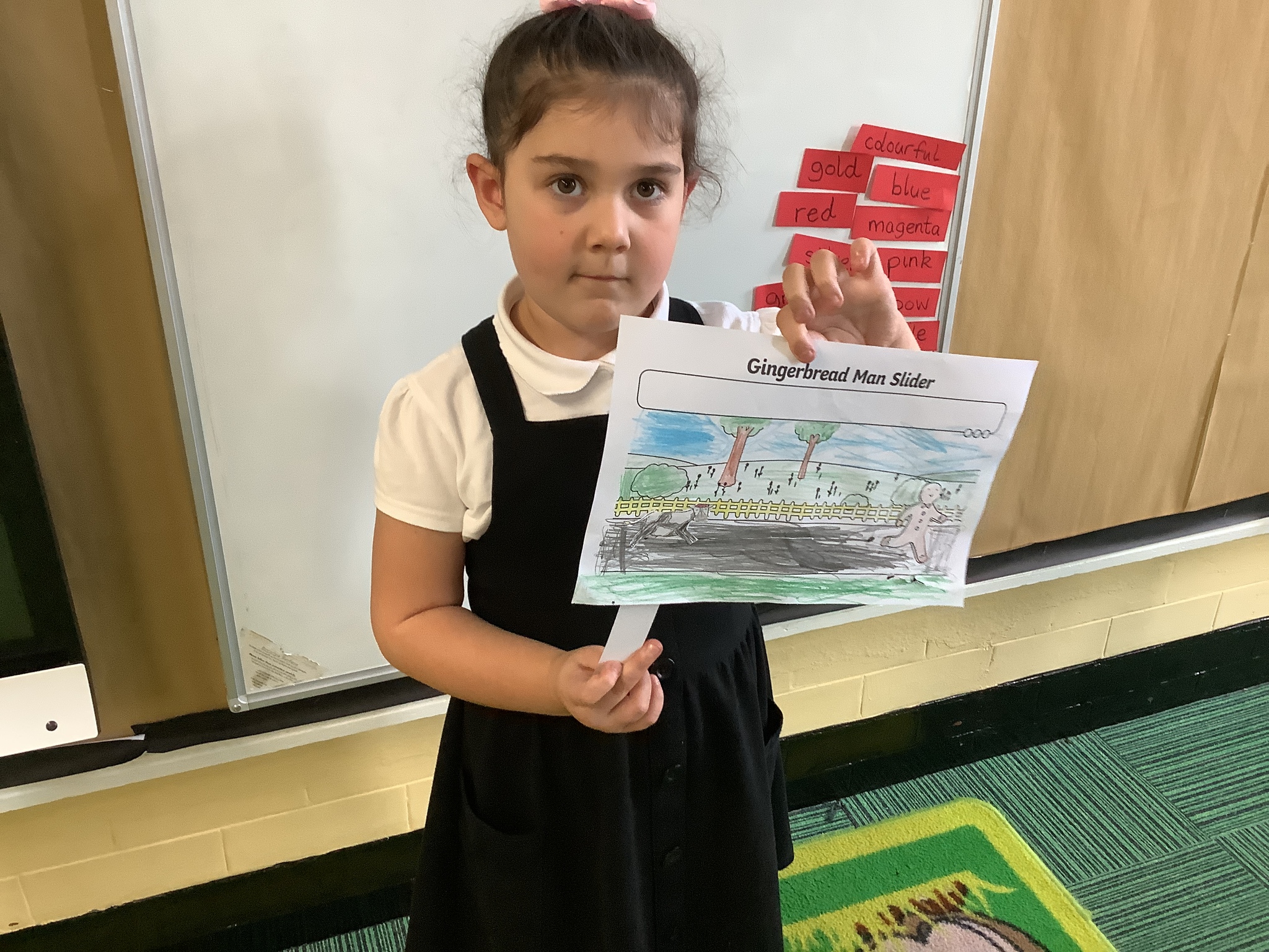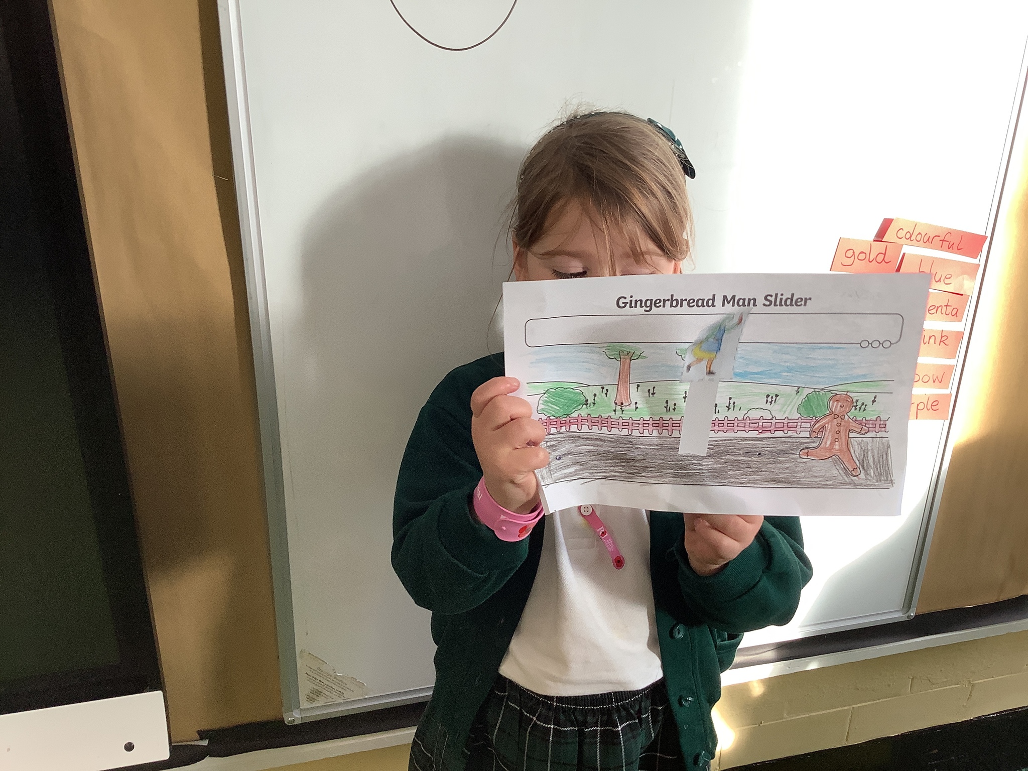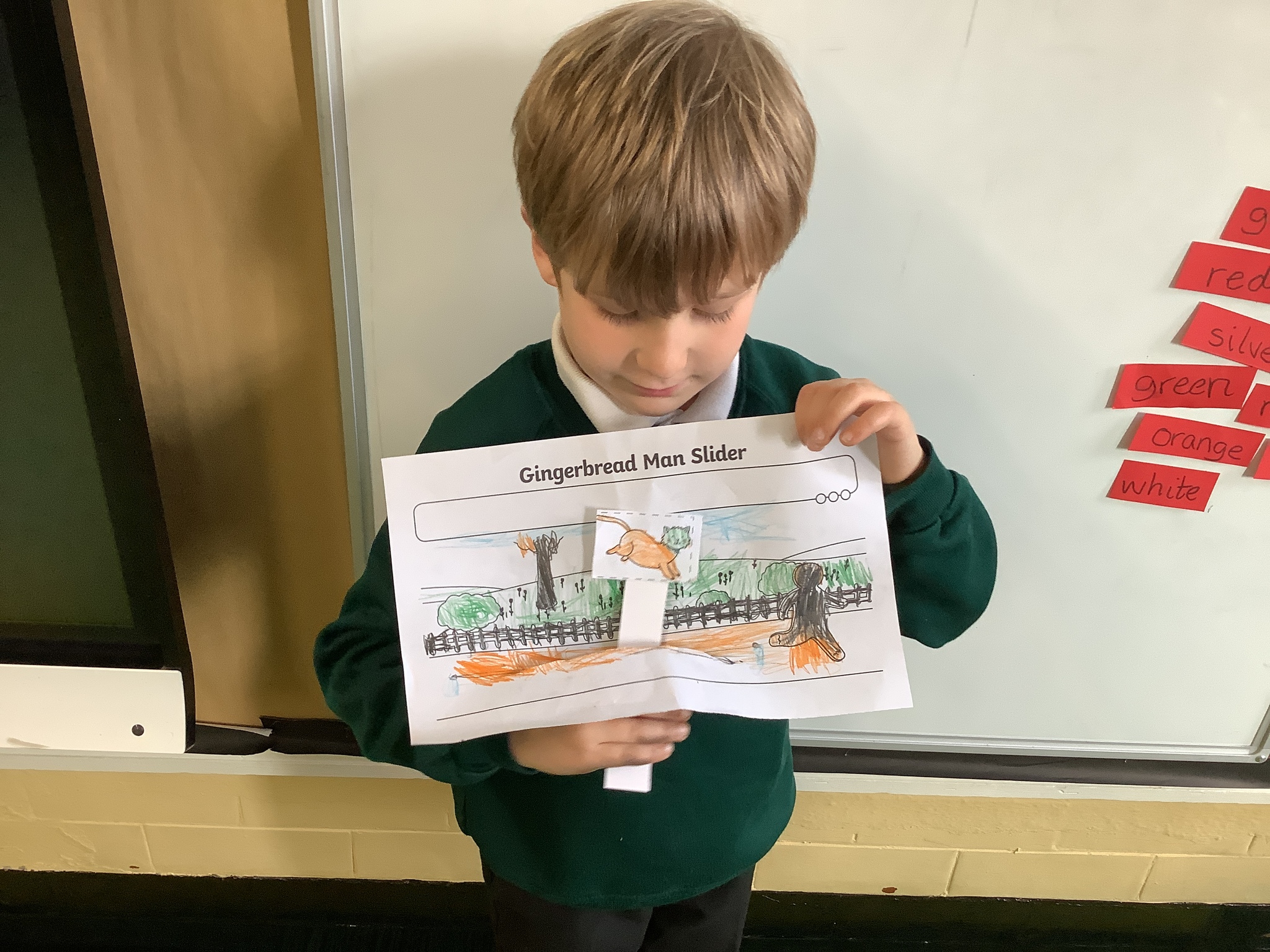 We made some human mechanisms to understand what they are before learning how to make a paper mechanism. We used a slider to make a moving picture to retell part of The Gingerbread Man story.