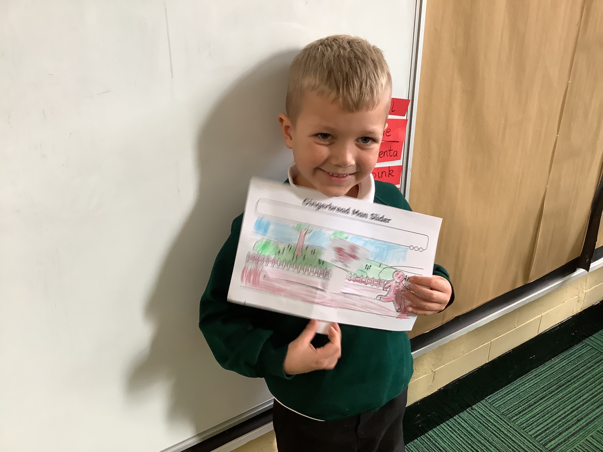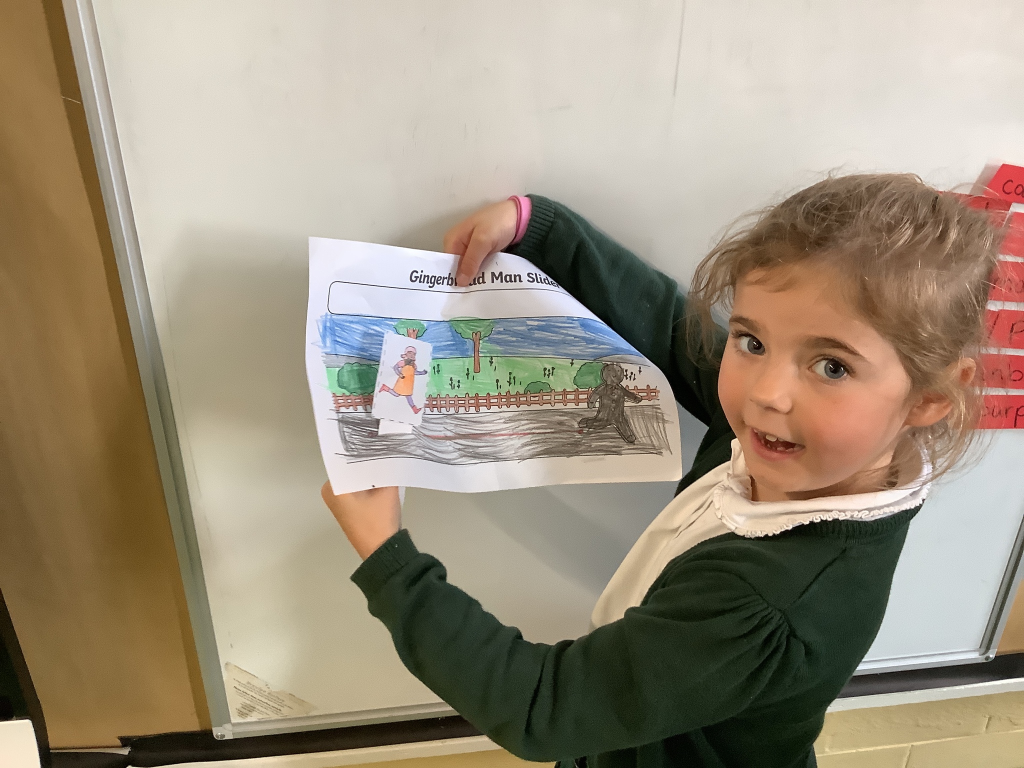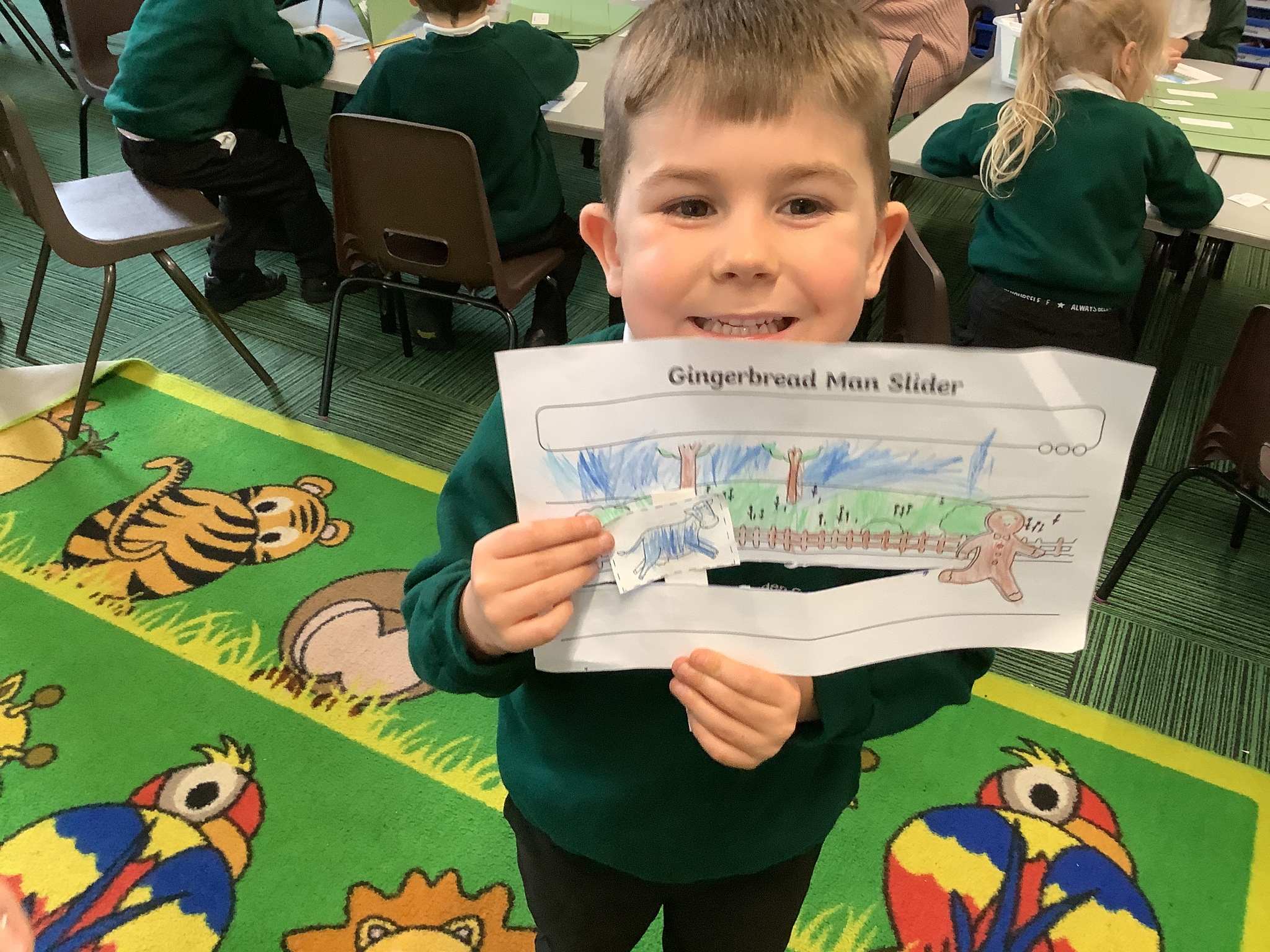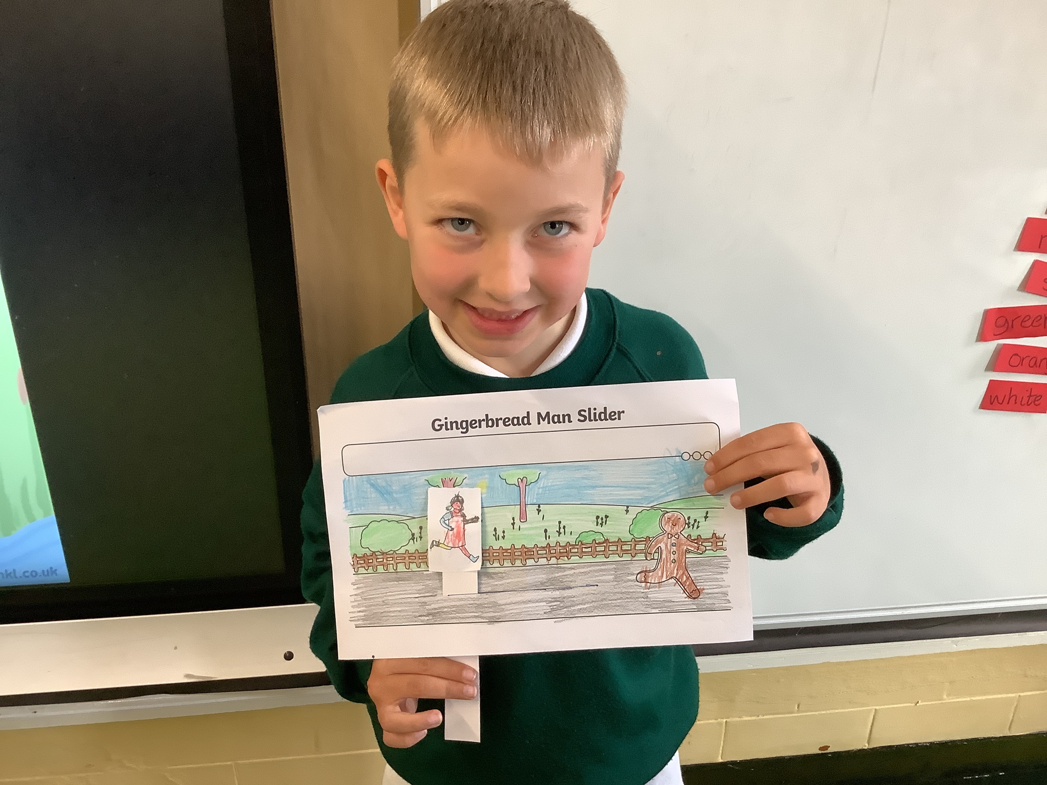 We made some human mechanisms to understand what they are before learning how to make a paper mechanism. We used a slider to make a moving picture to retell part of The Gingerbread Man story.