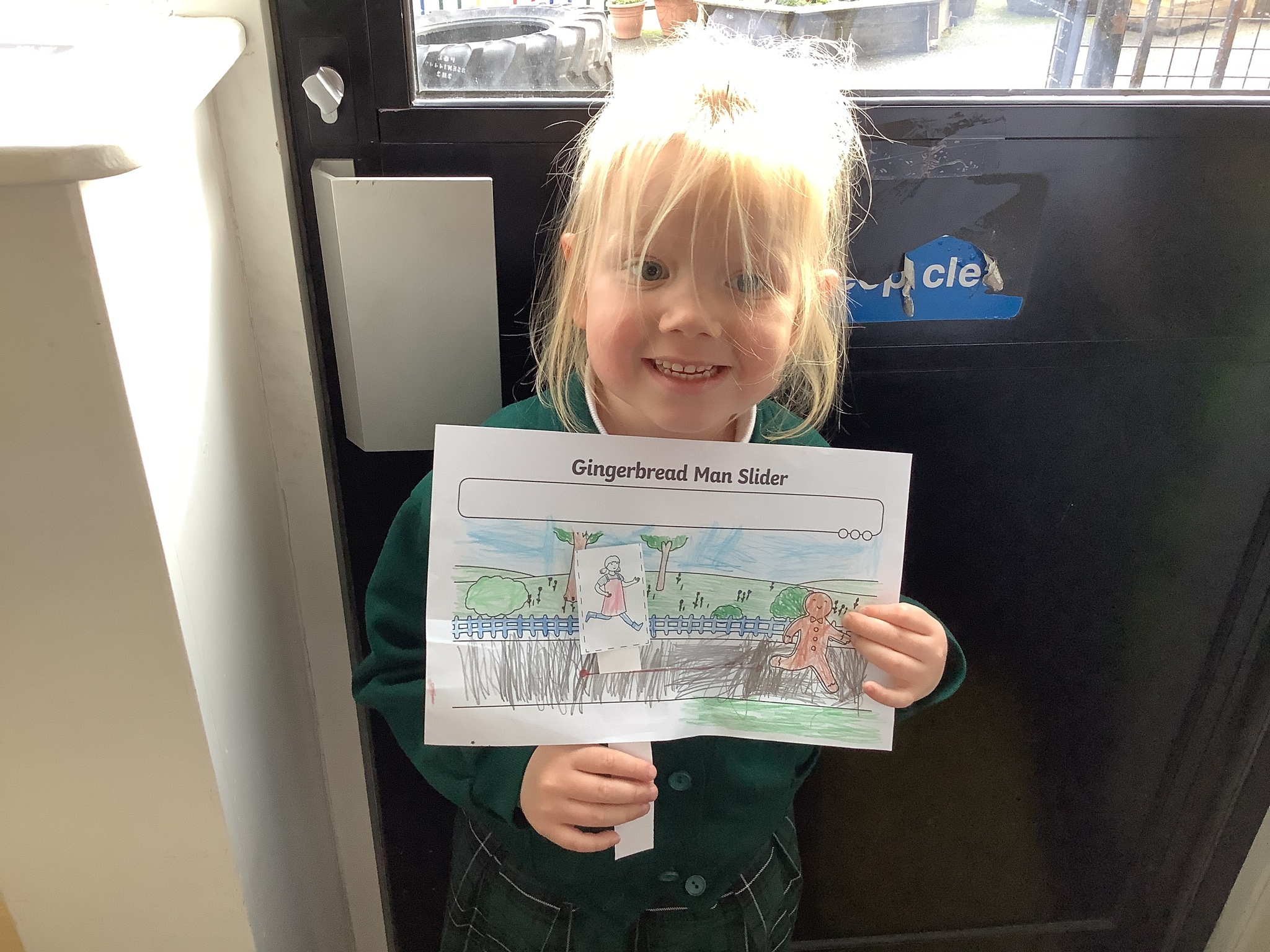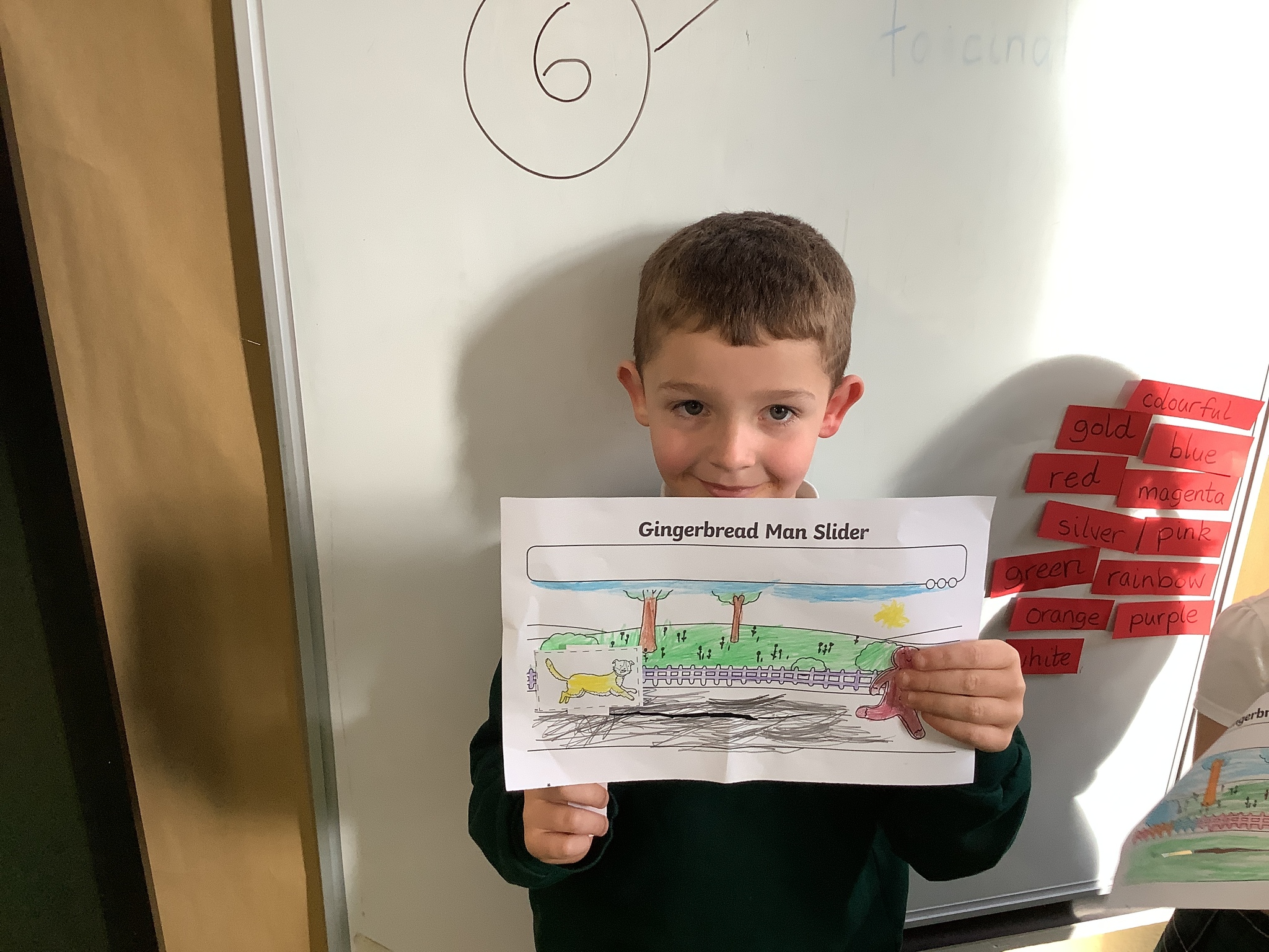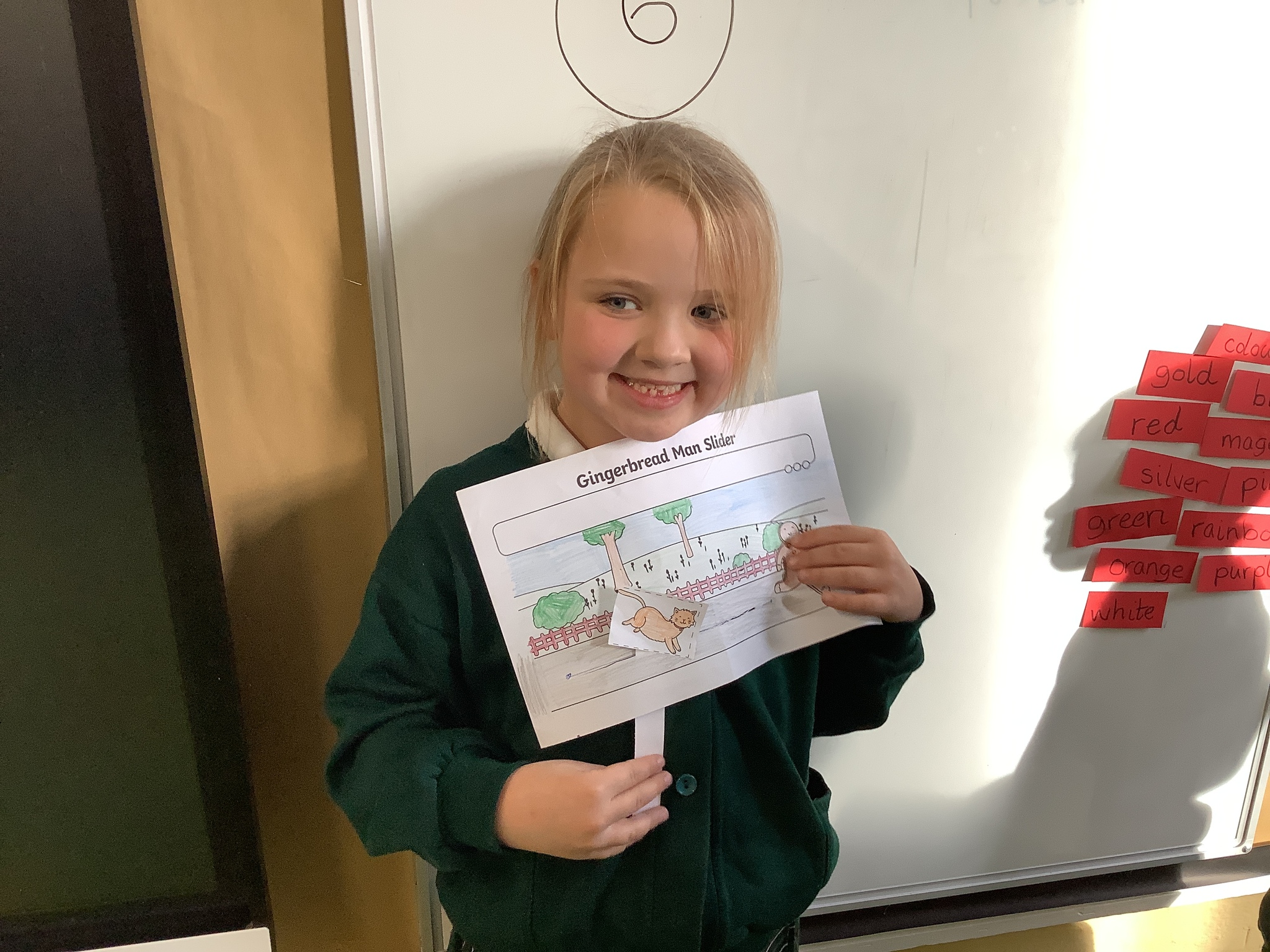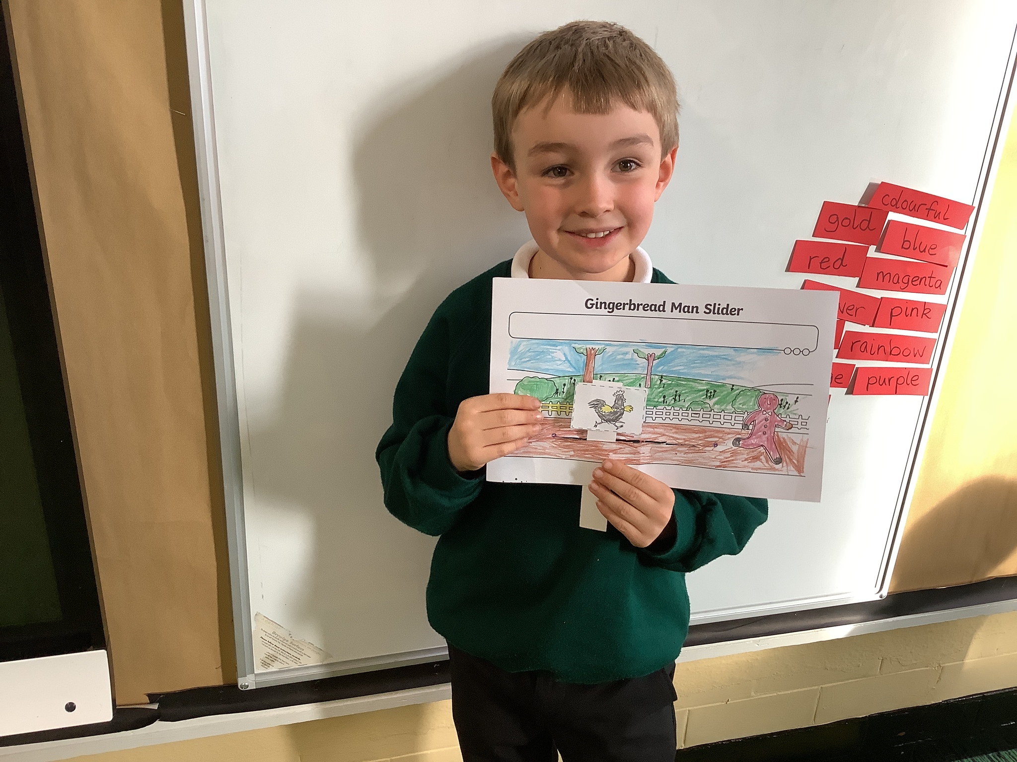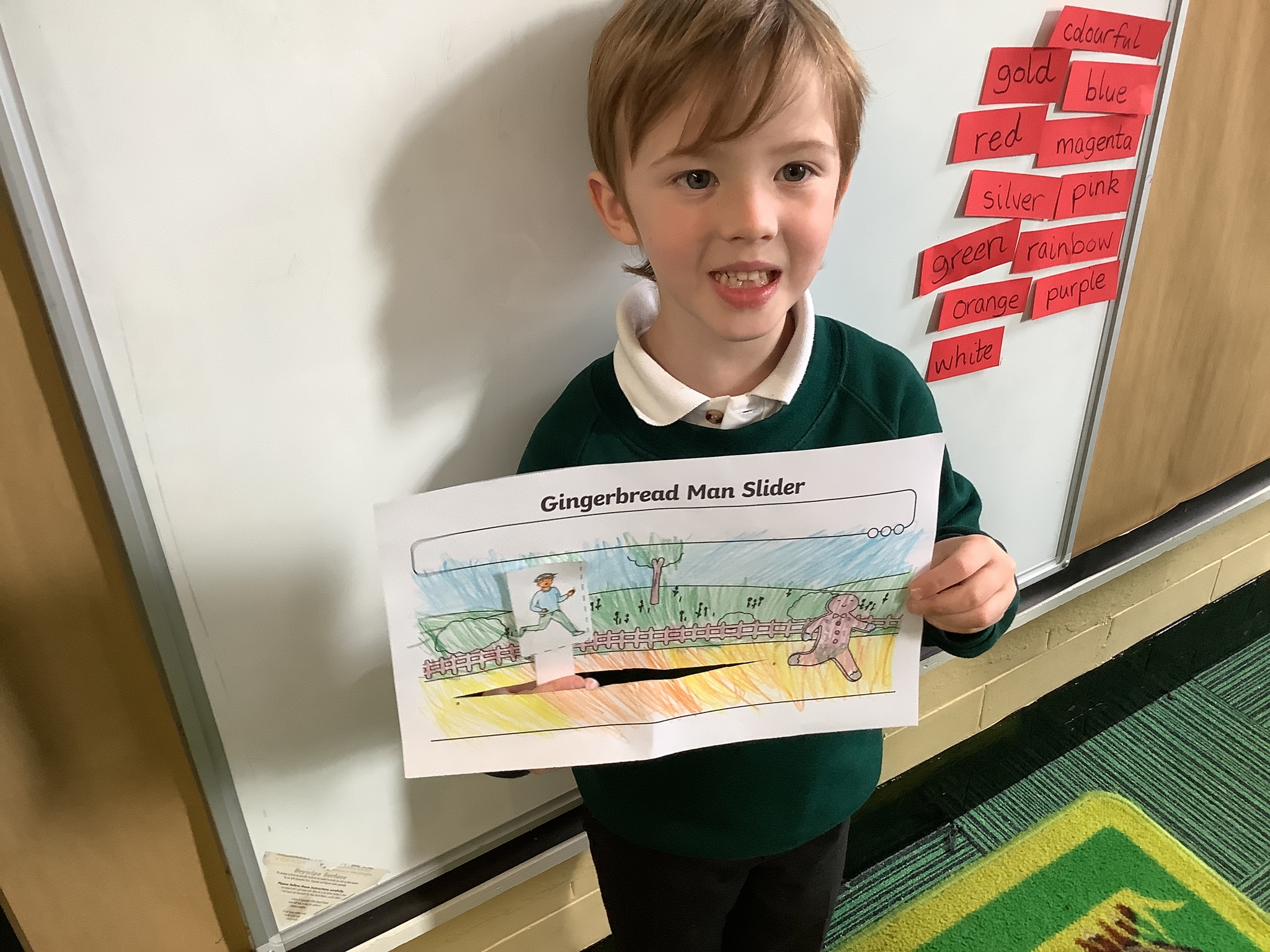 We made some human mechanisms to understand what they are before learning how to make a paper mechanism. We used a slider to make a moving picture to retell part of The Gingerbread Man story.