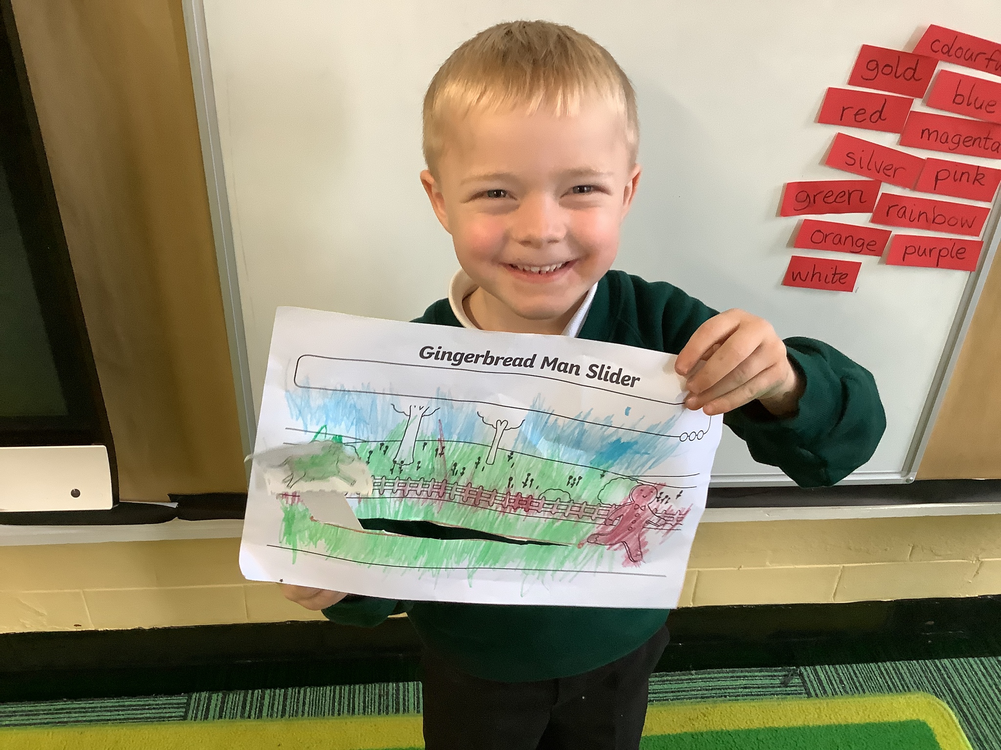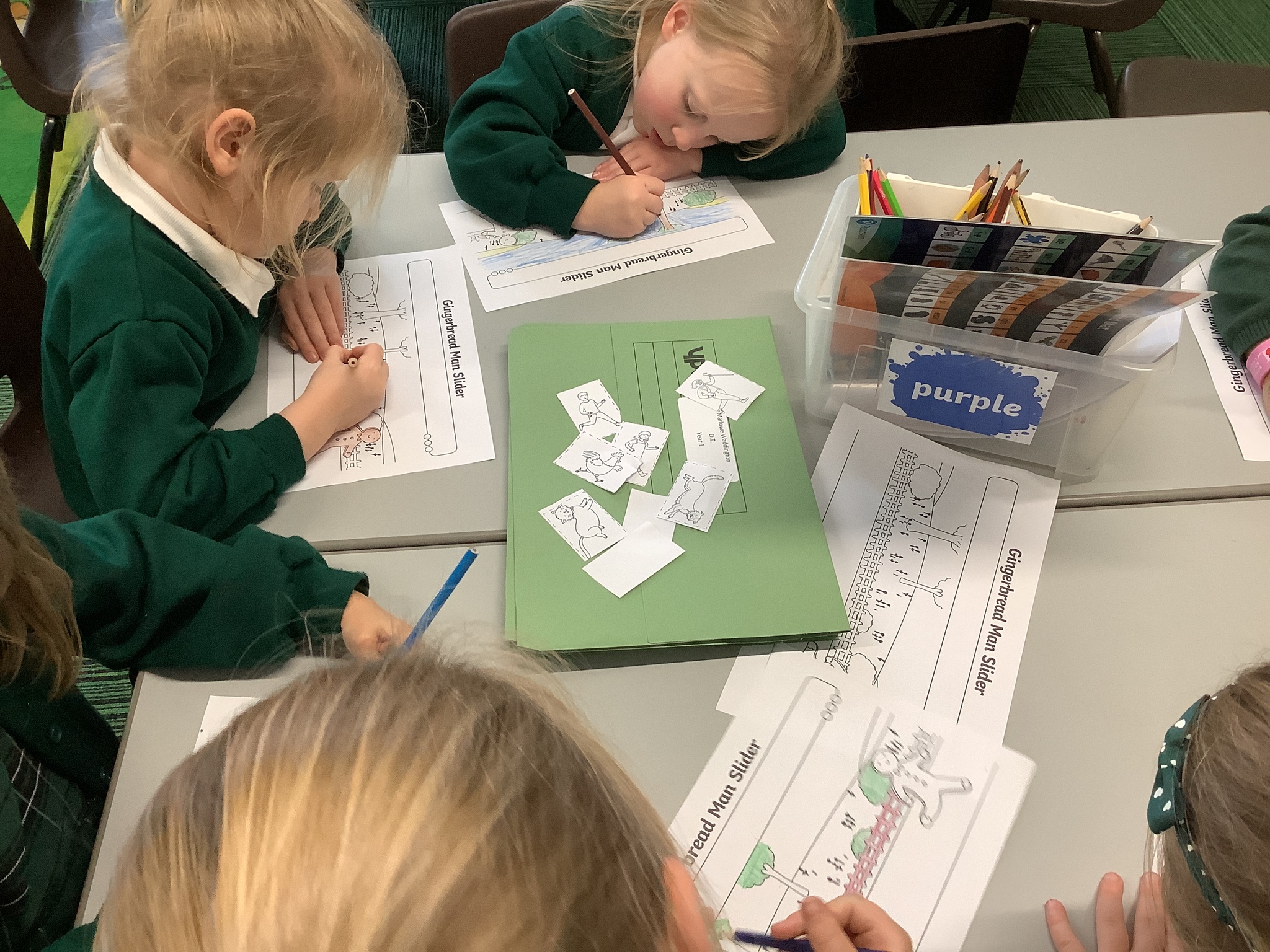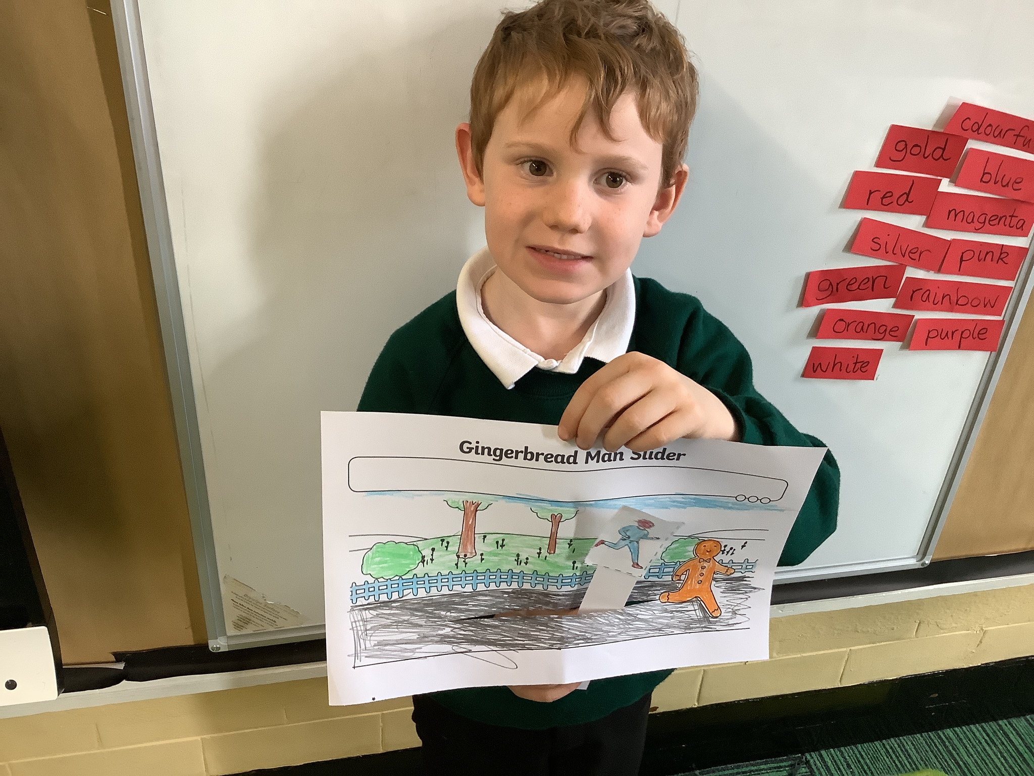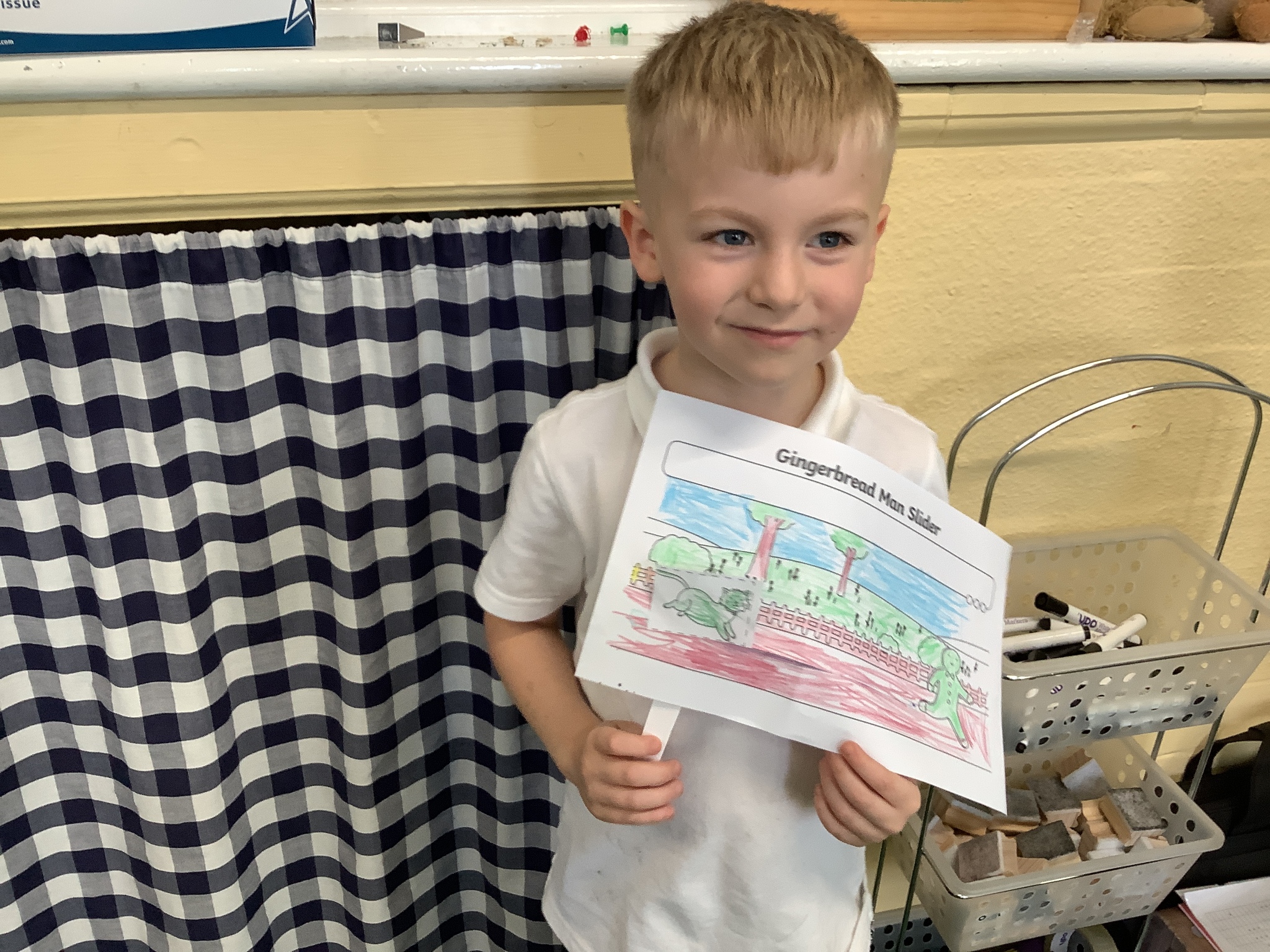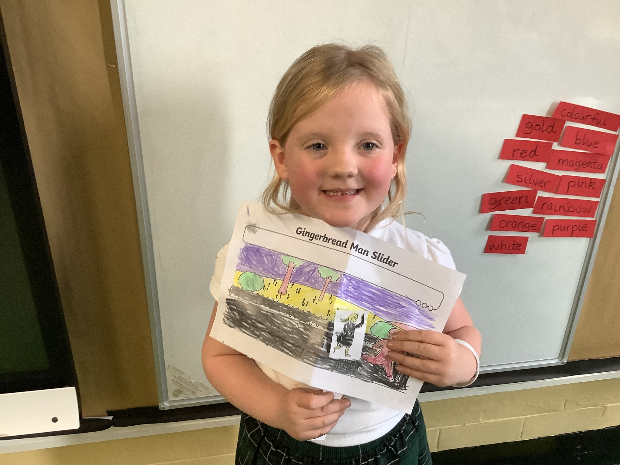 We made some human mechanisms to understand what they are before learning how to make a paper mechanism. We used a slider to make a moving picture to retell part of The Gingerbread Man story.