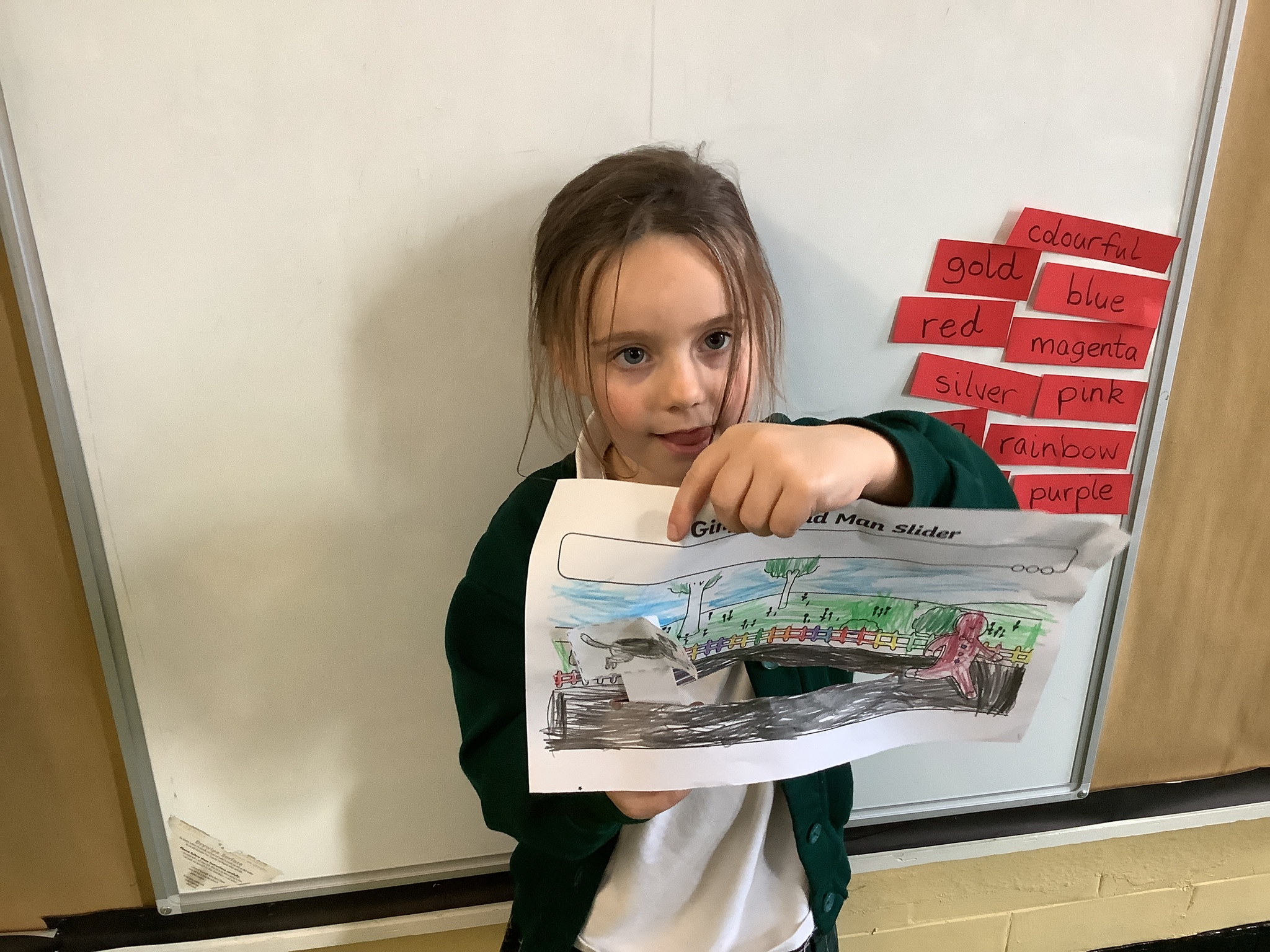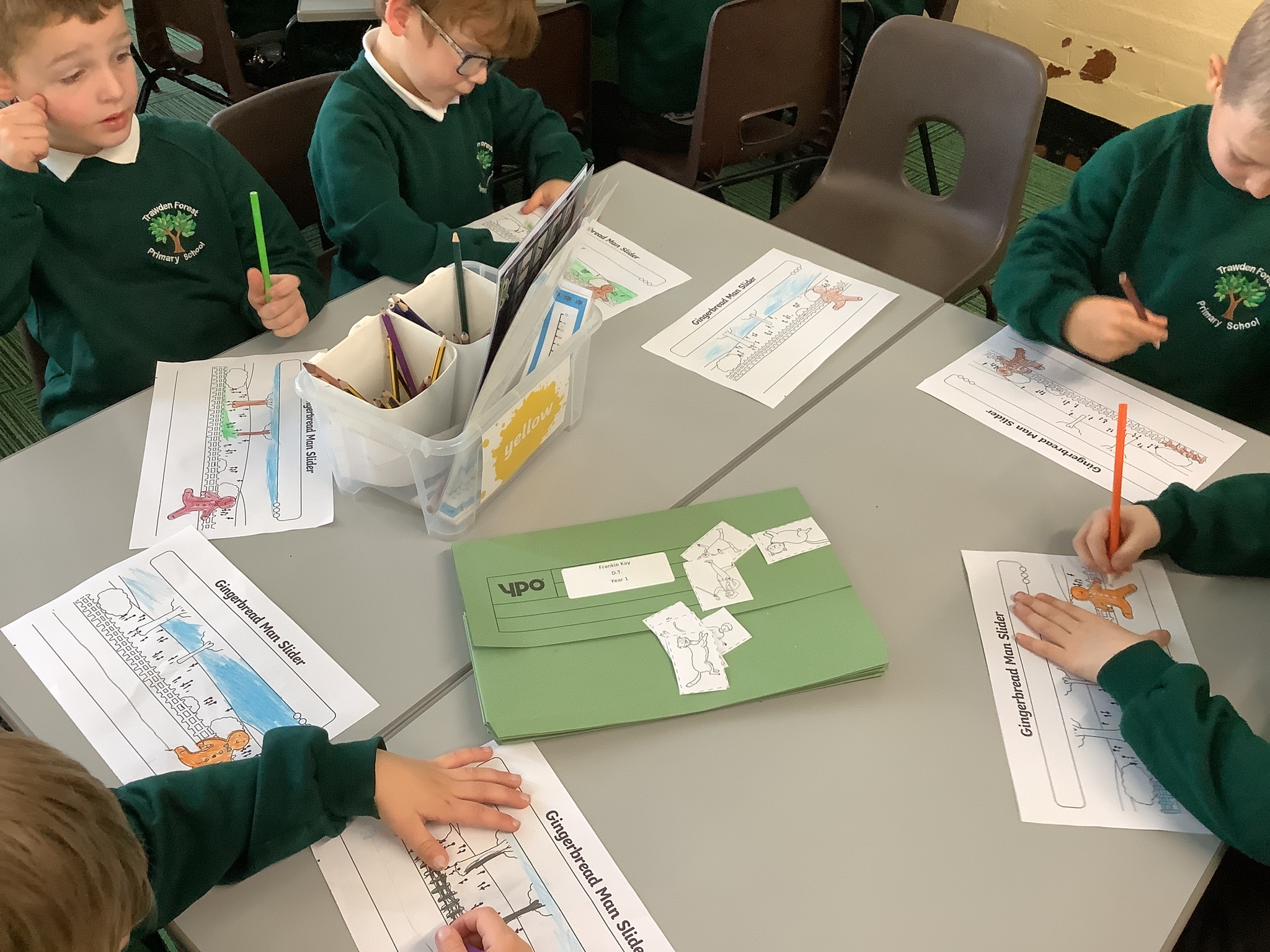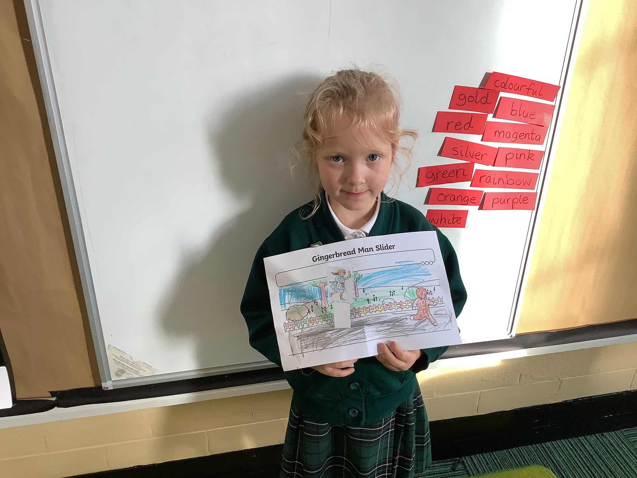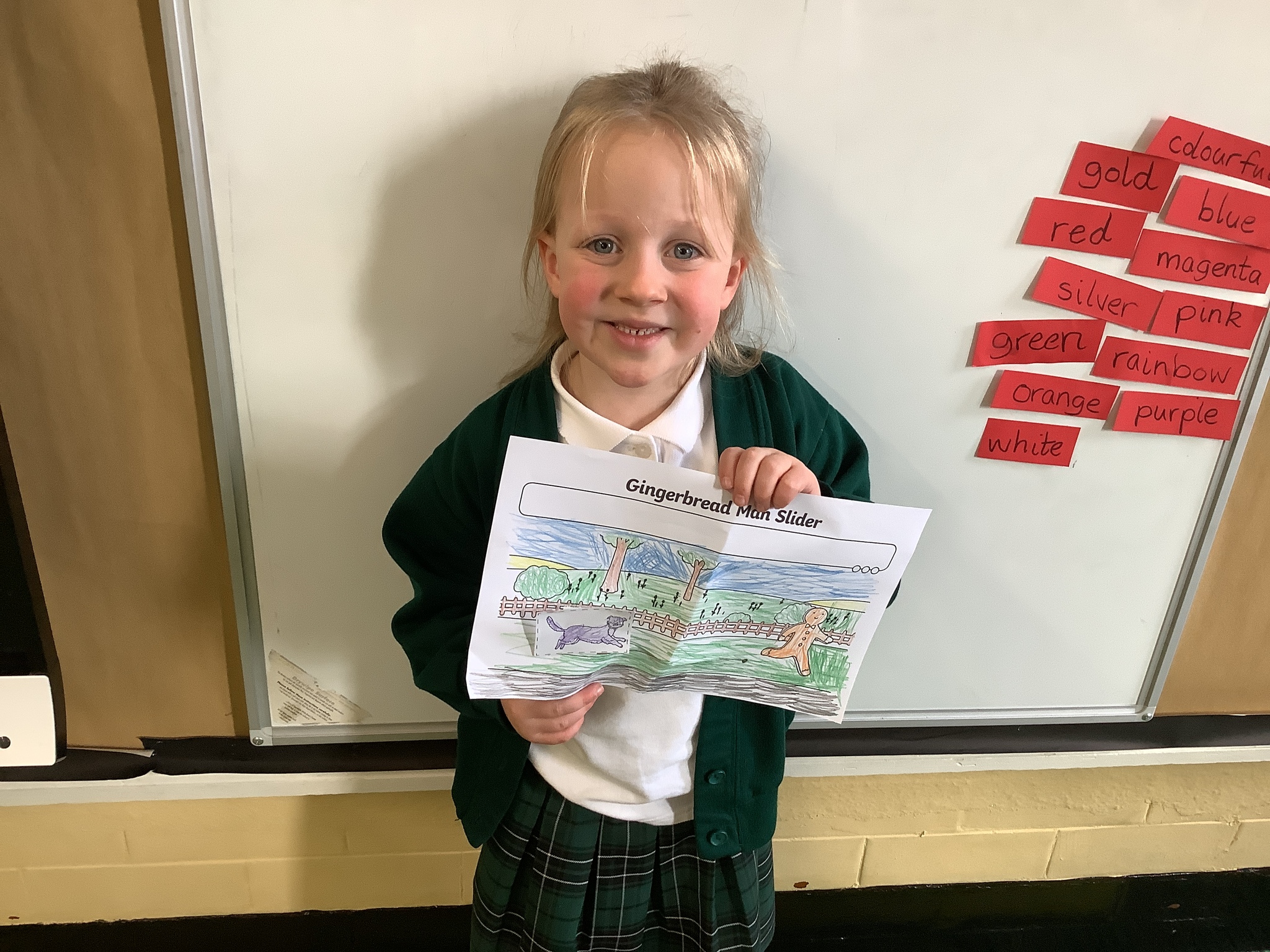 We made some human mechanisms to understand what they are before learning how to make a paper mechanism. We used a slider to make a moving picture to retell part of The Gingerbread Man story.