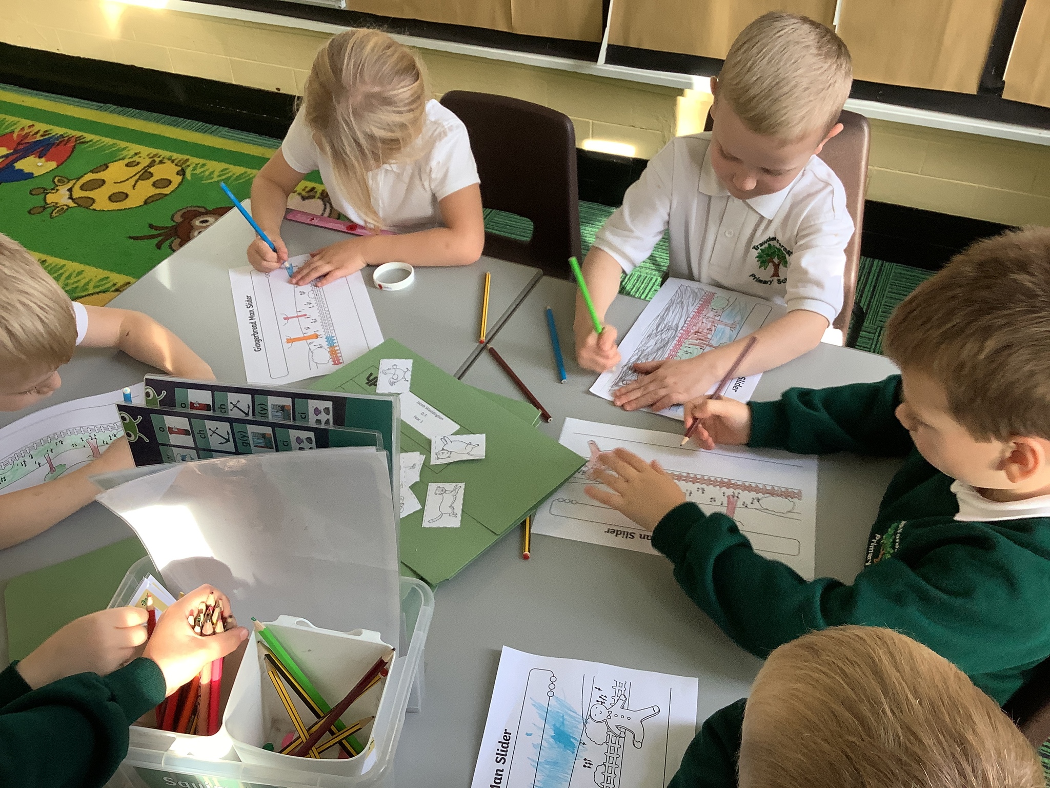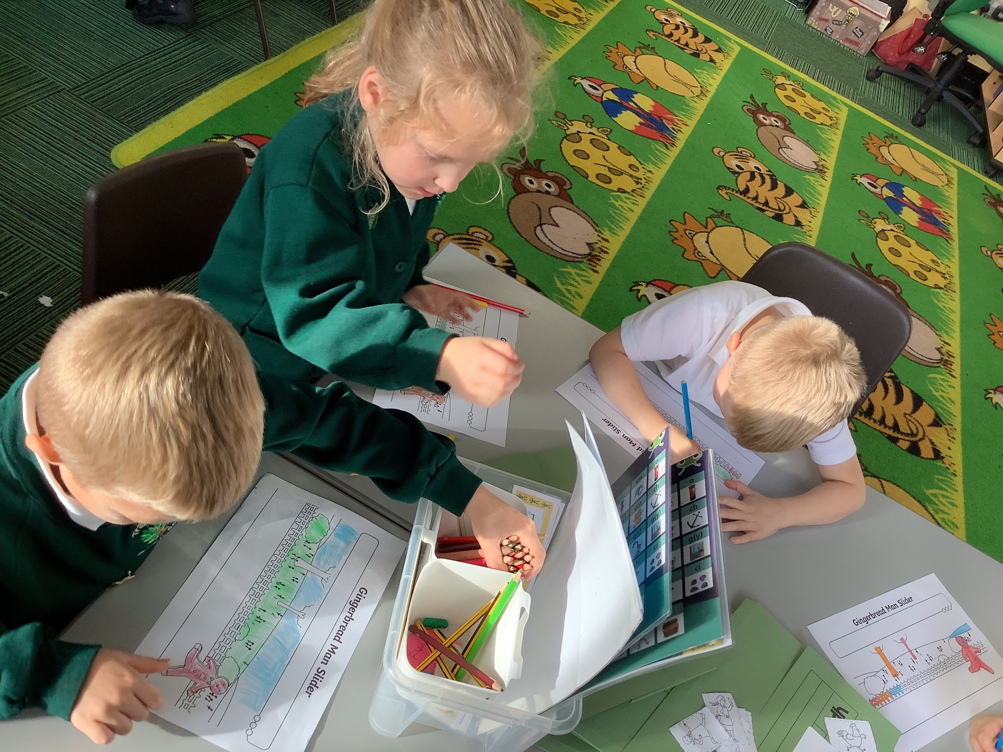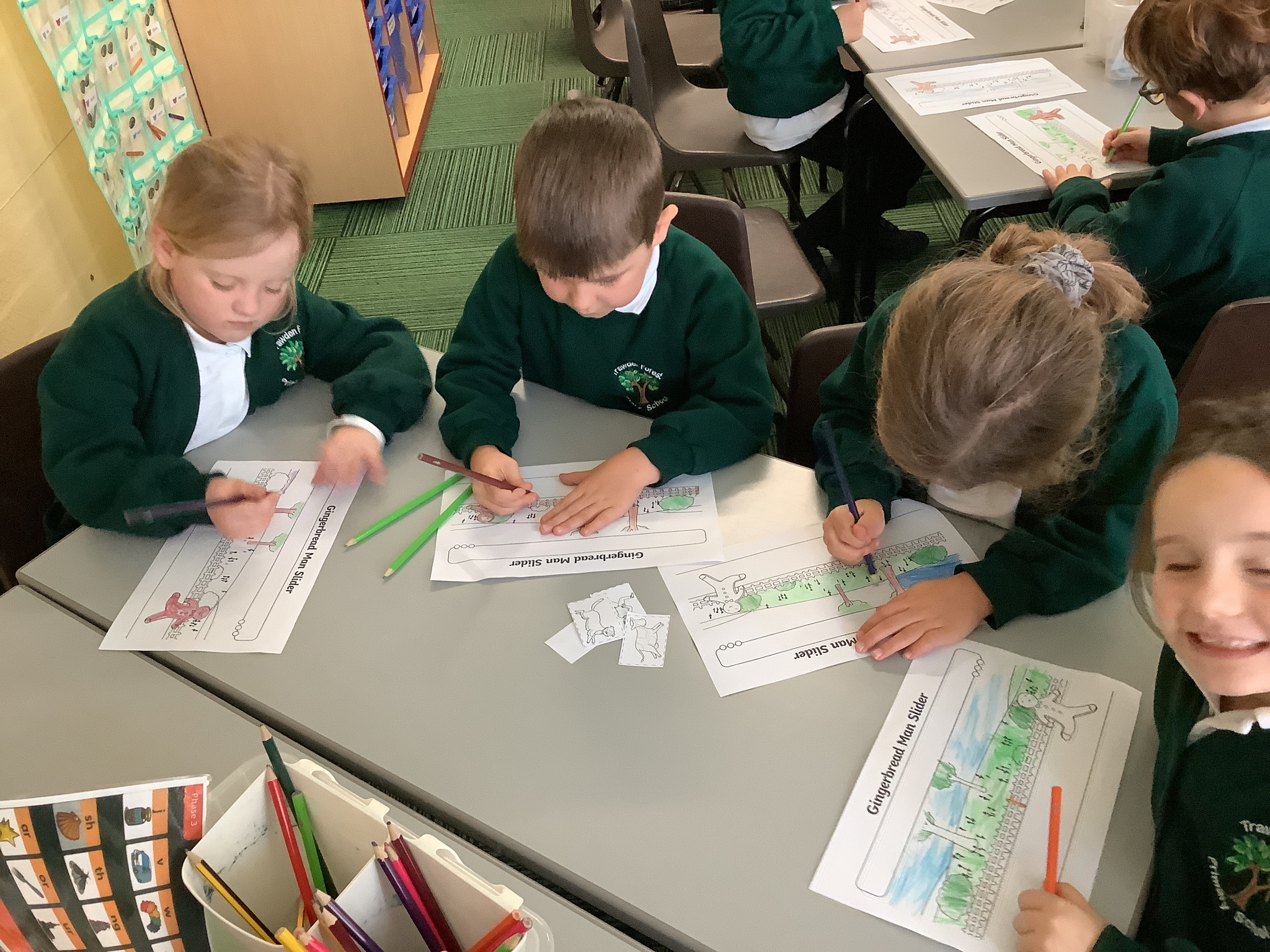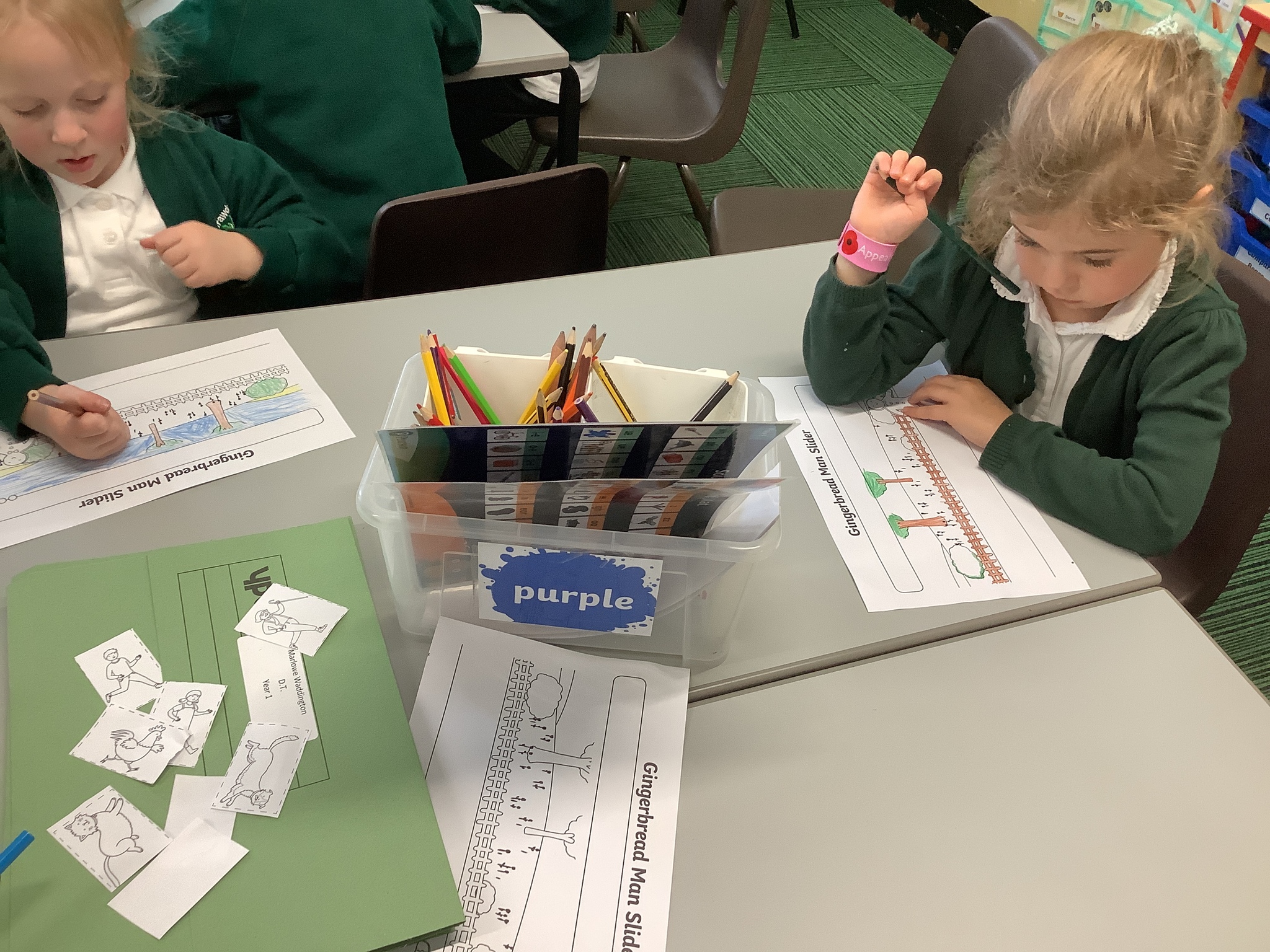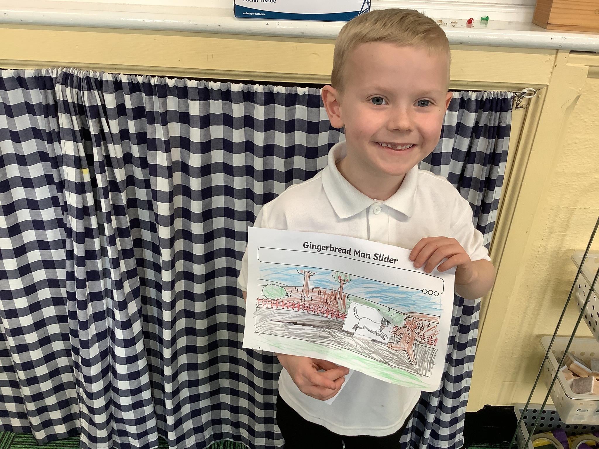 We made some human mechanisms to understand what they are before learning how to make a paper mechanism. We used a slider to make a moving picture to retell part of The Gingerbread Man story.