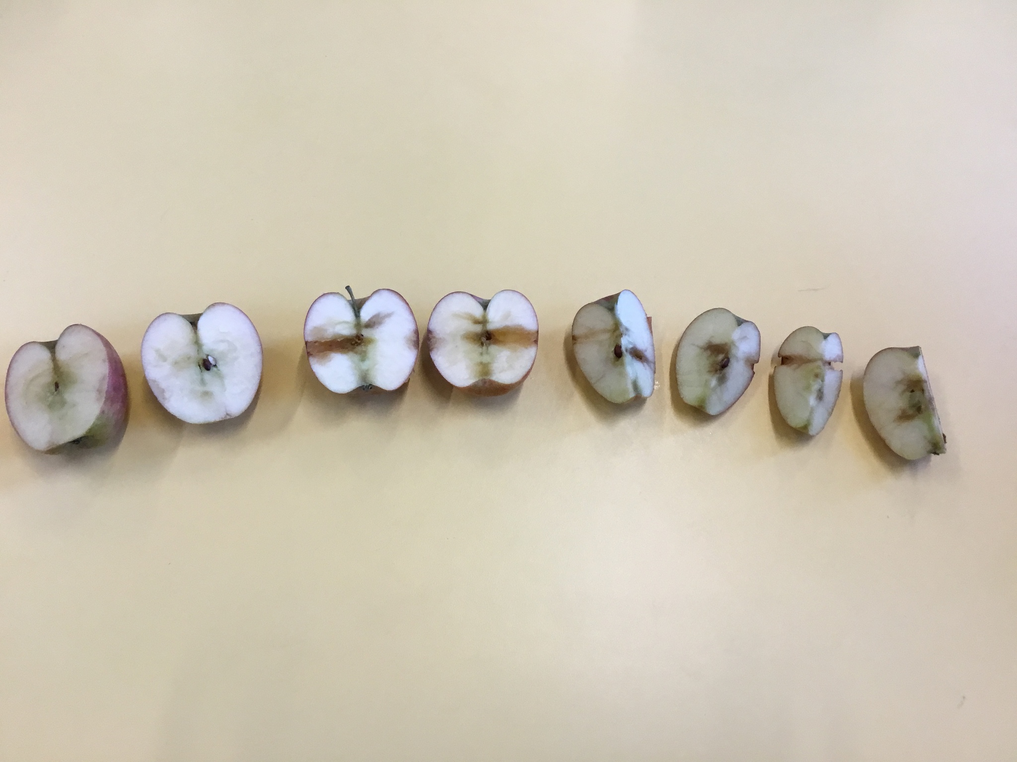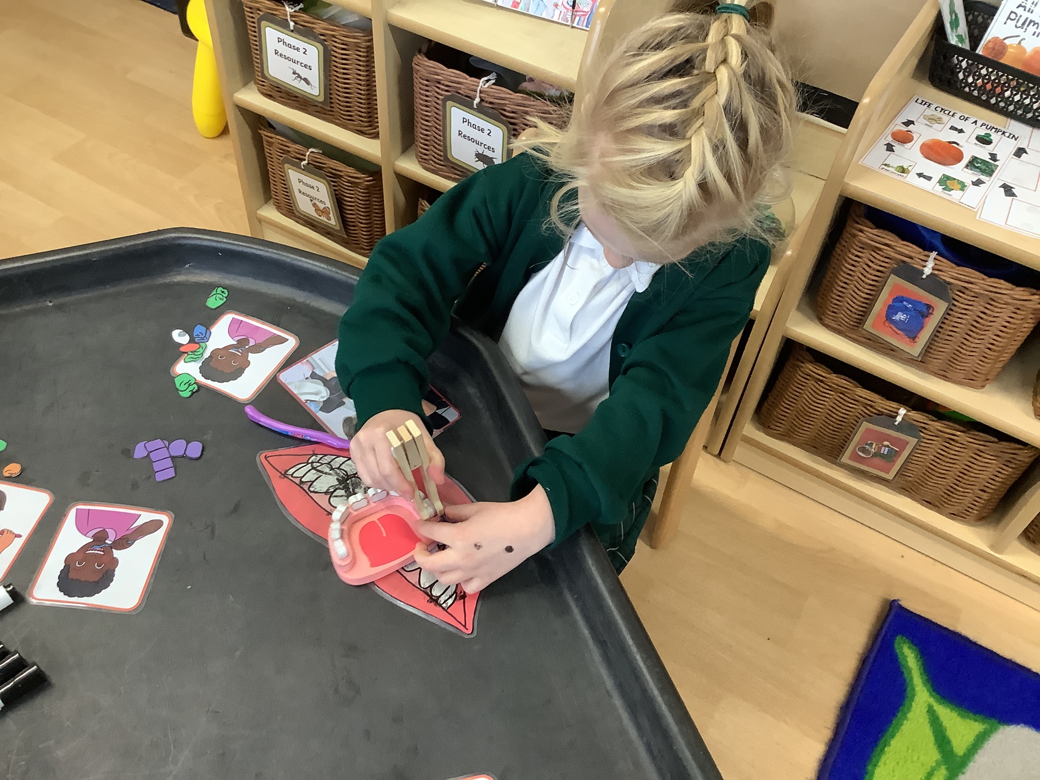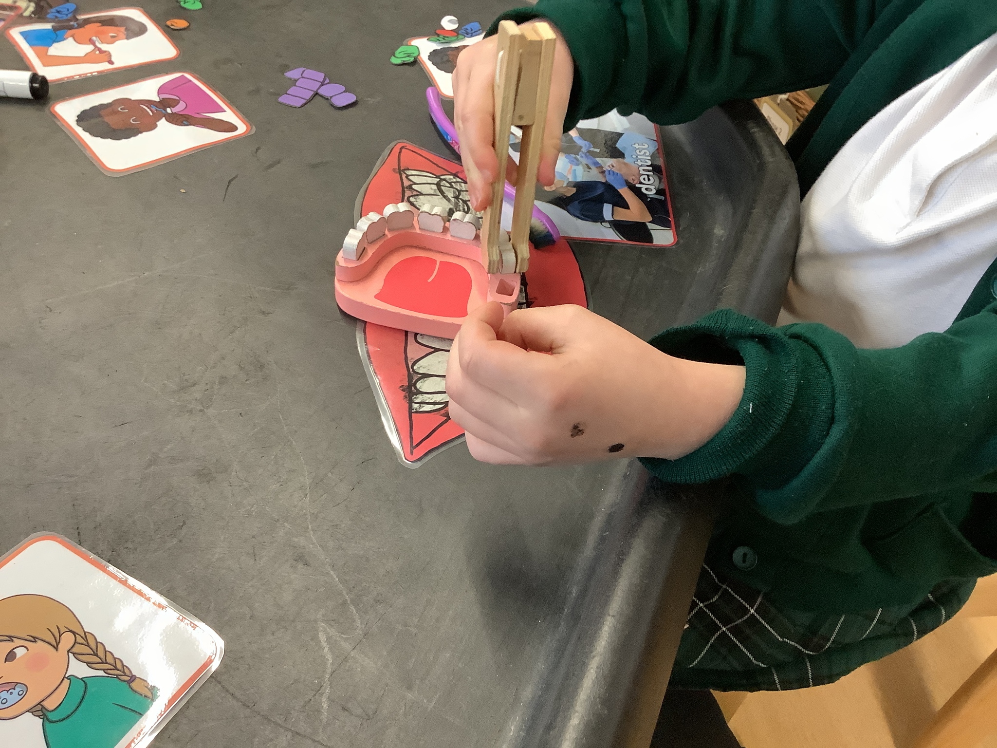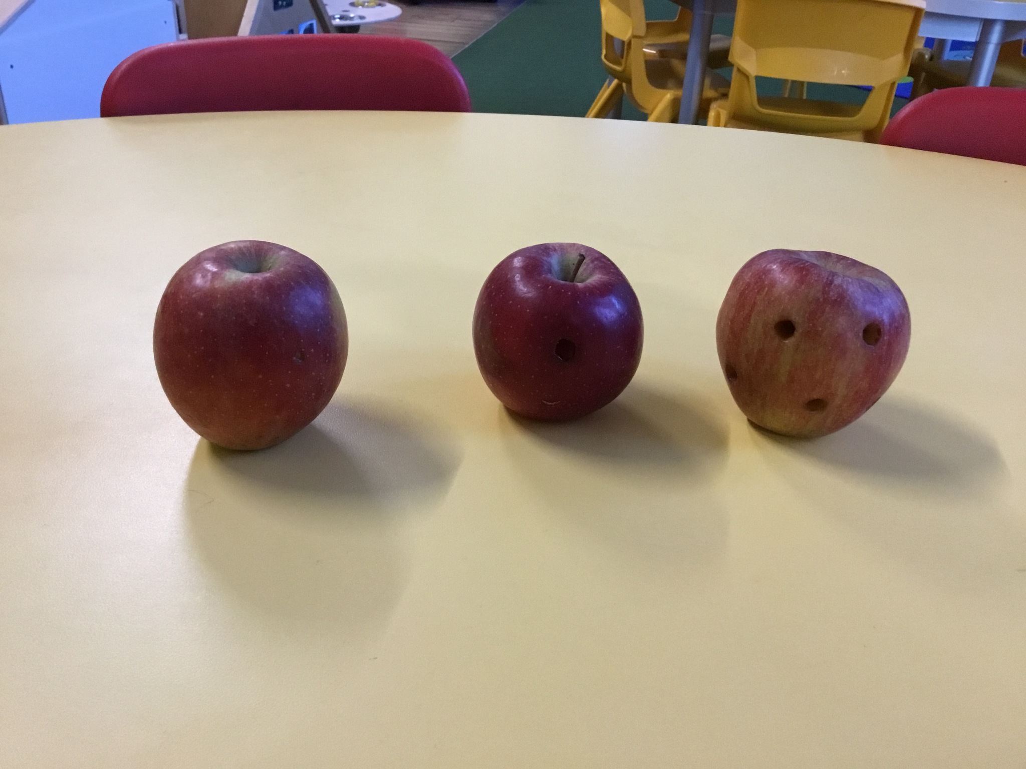 We focused on dentists to start with and found out all about the importance of cleaning and looking after our teeth. We conducted an experiment about enamel. We pretended that the apples were our teeth and that the skin on them was the enamel. We punched holes into the apples and waited a day before cutting them open to find out what had happened to them!
