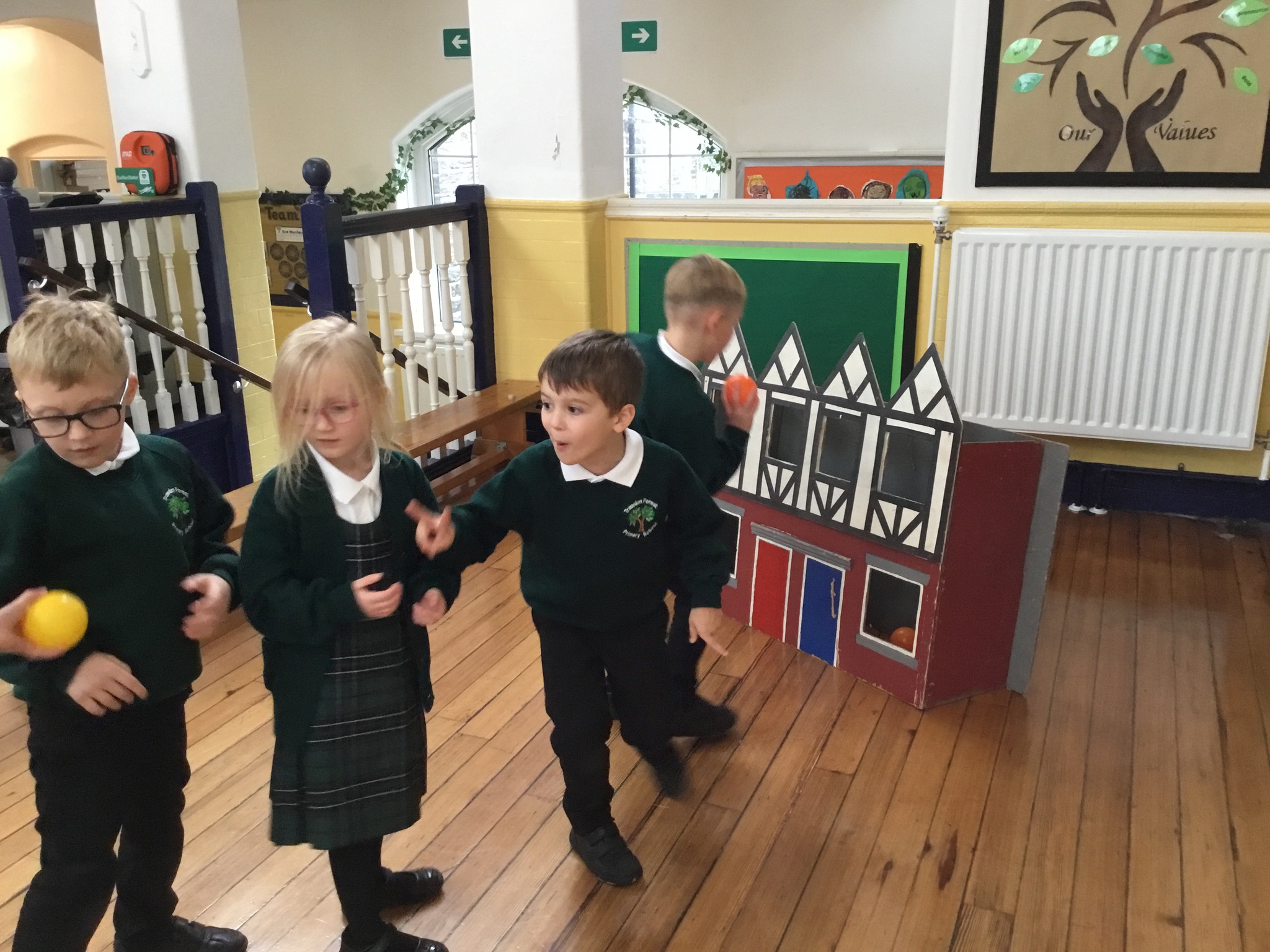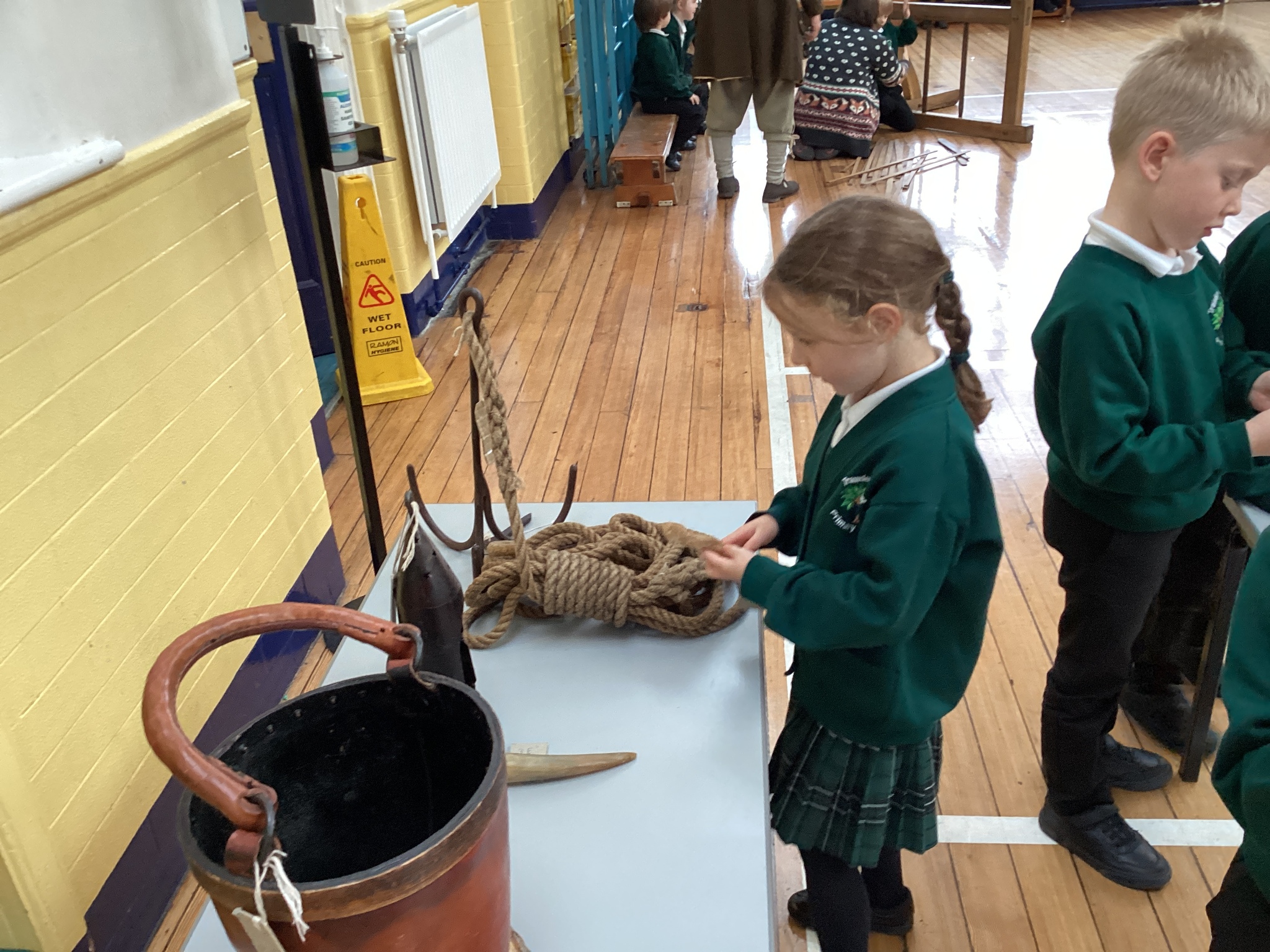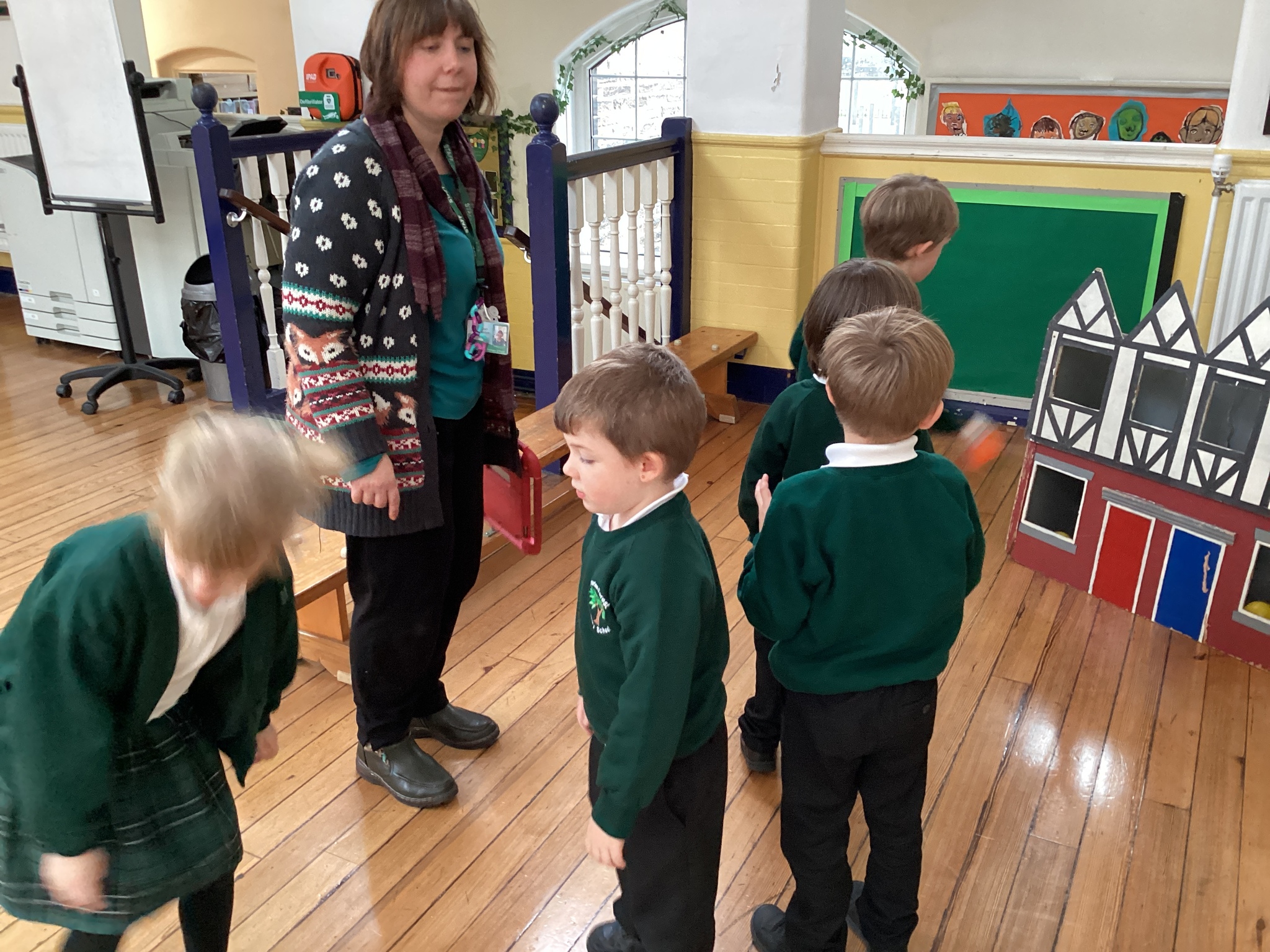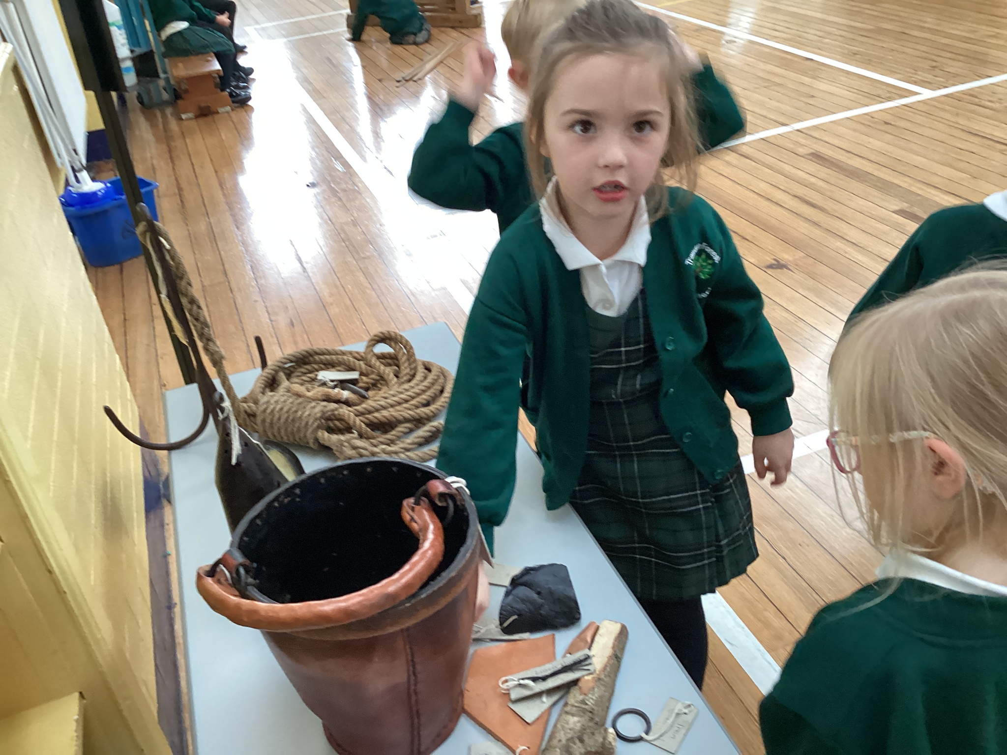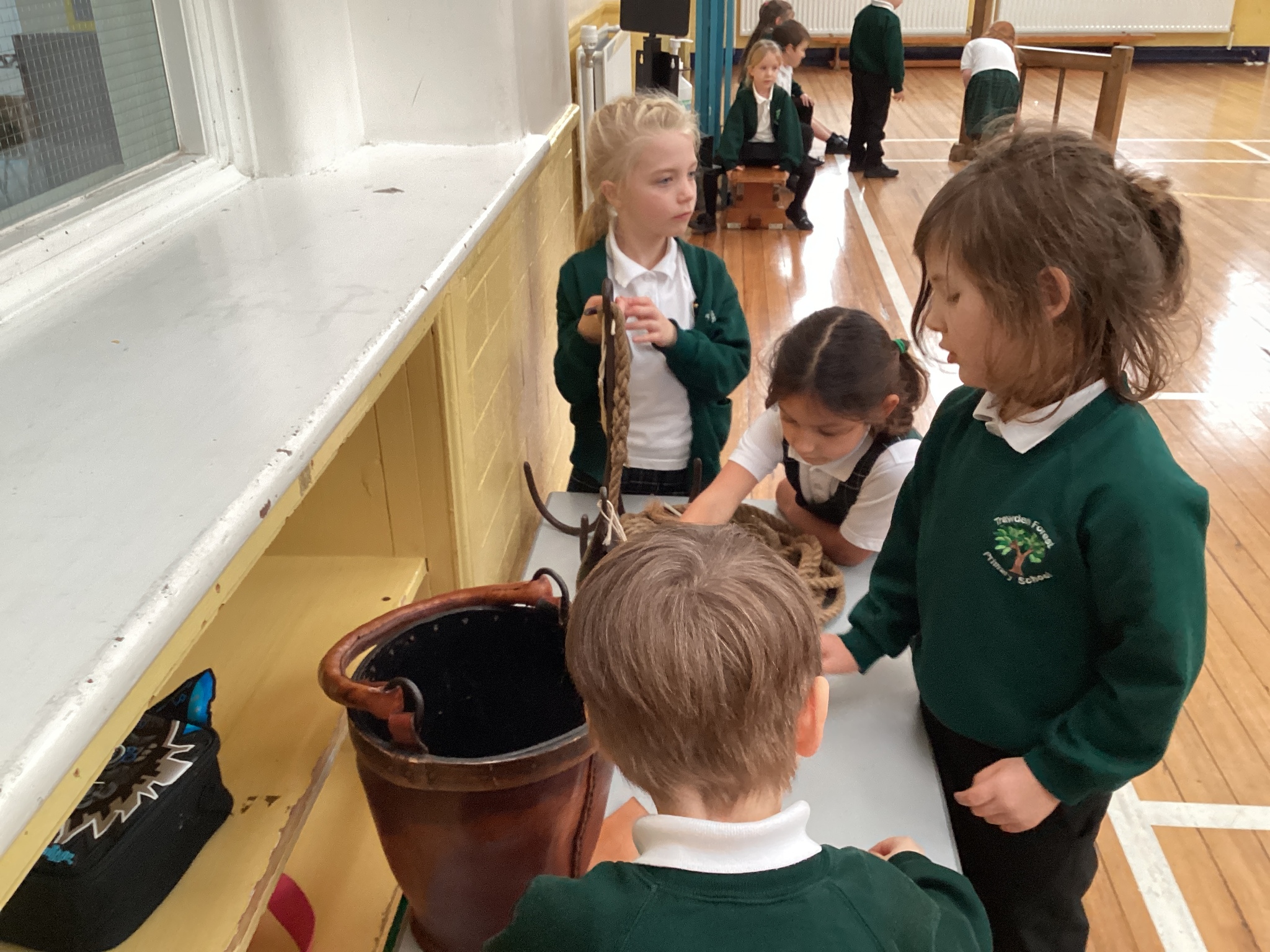 He told us all about the fire and how it started. We looked at some of the materials the houses were made from to discover why it spread so fast. The children formed a chain passing a bucket of water along until they put out the fire (Mrs Alcock!)