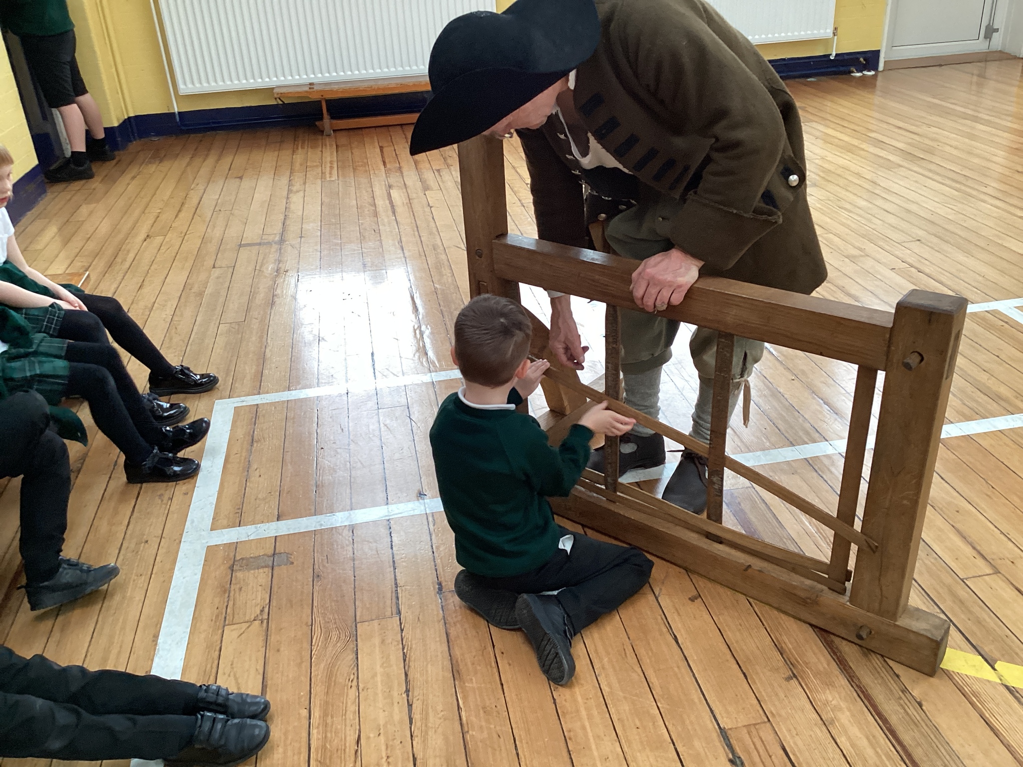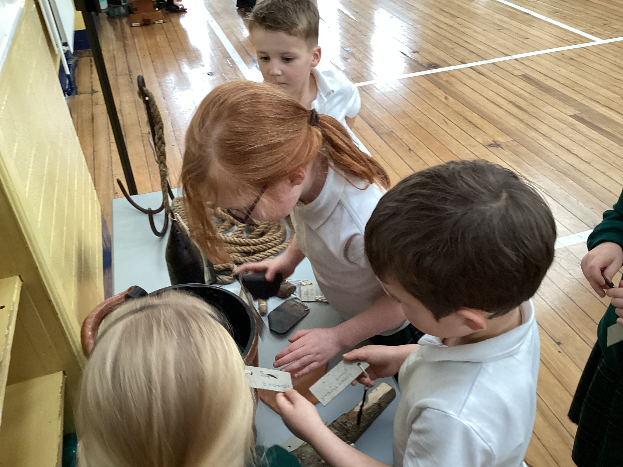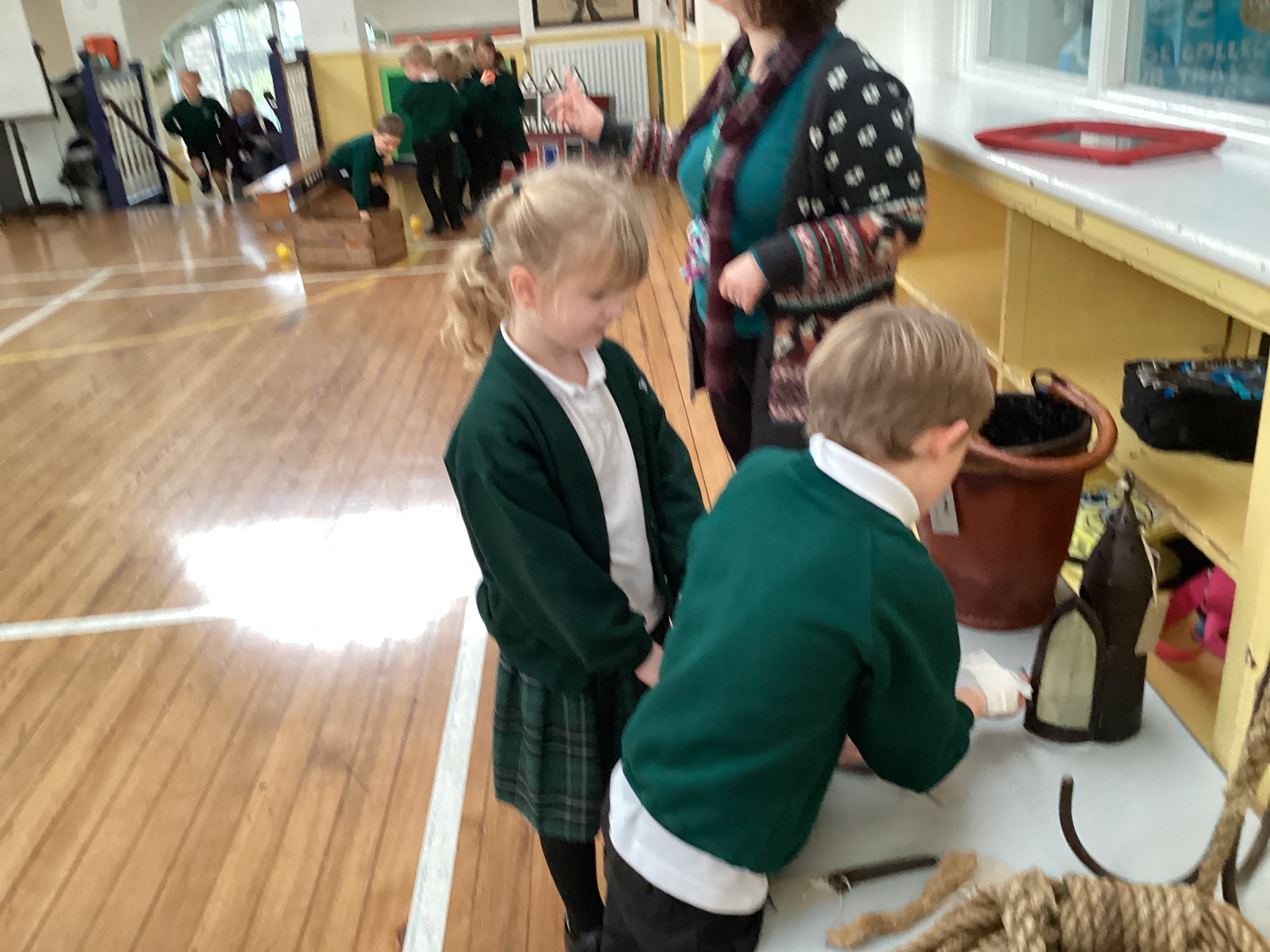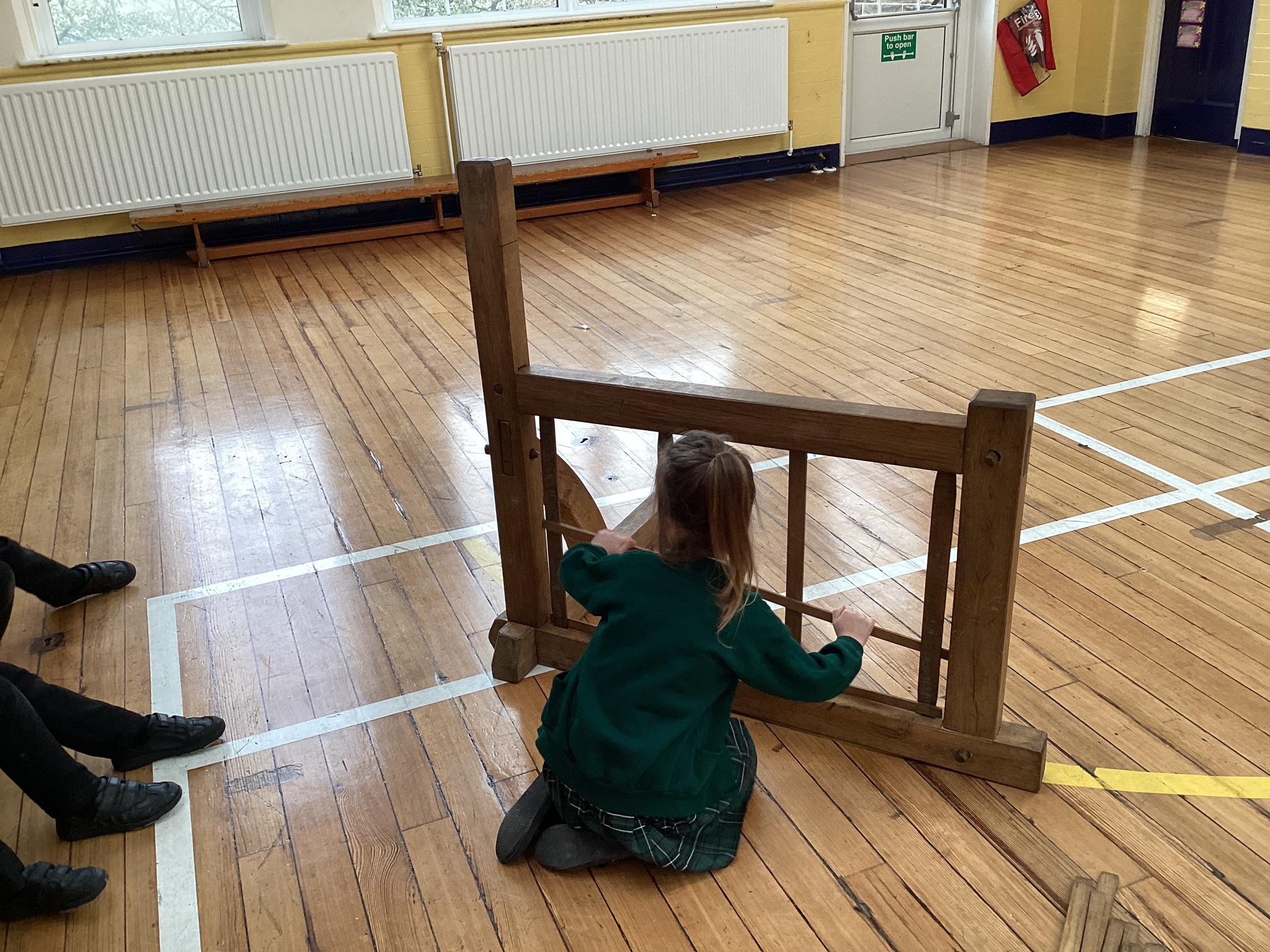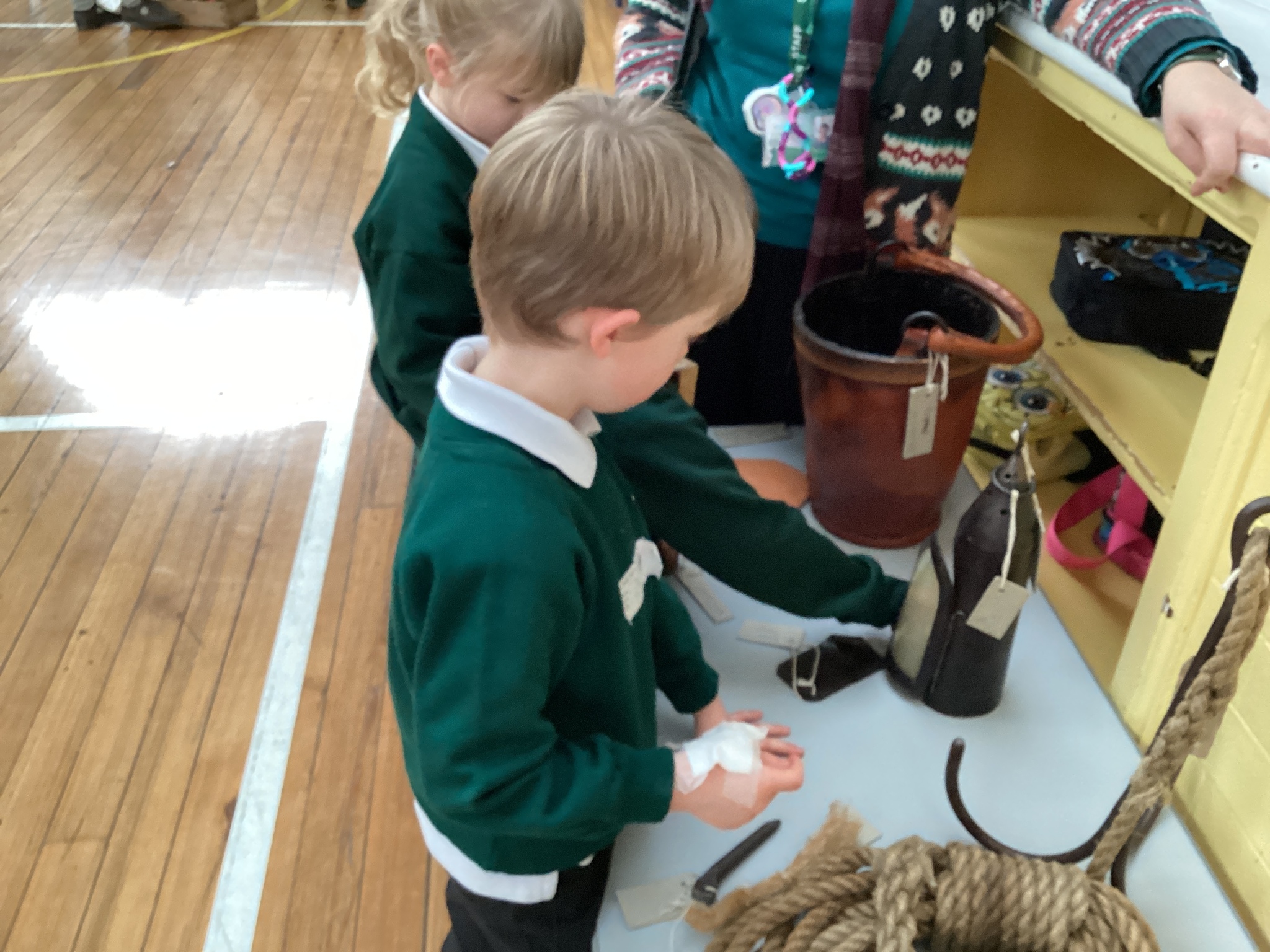 He told us all about the fire and how it started. We looked at some of the materials the houses were made from to discover why it spread so fast. The children formed a chain passing a bucket of water along until they put out the fire (Mrs Alcock!)