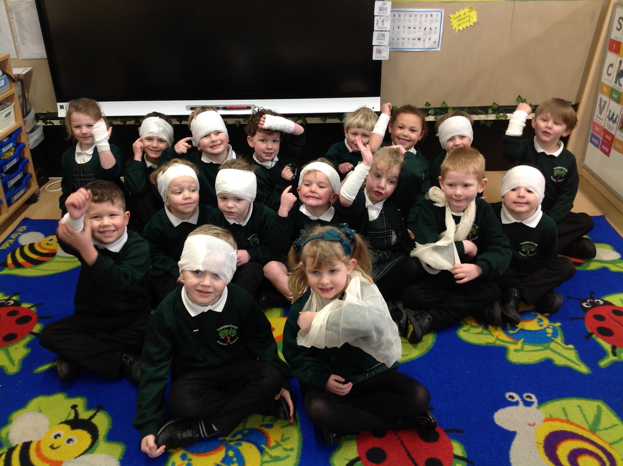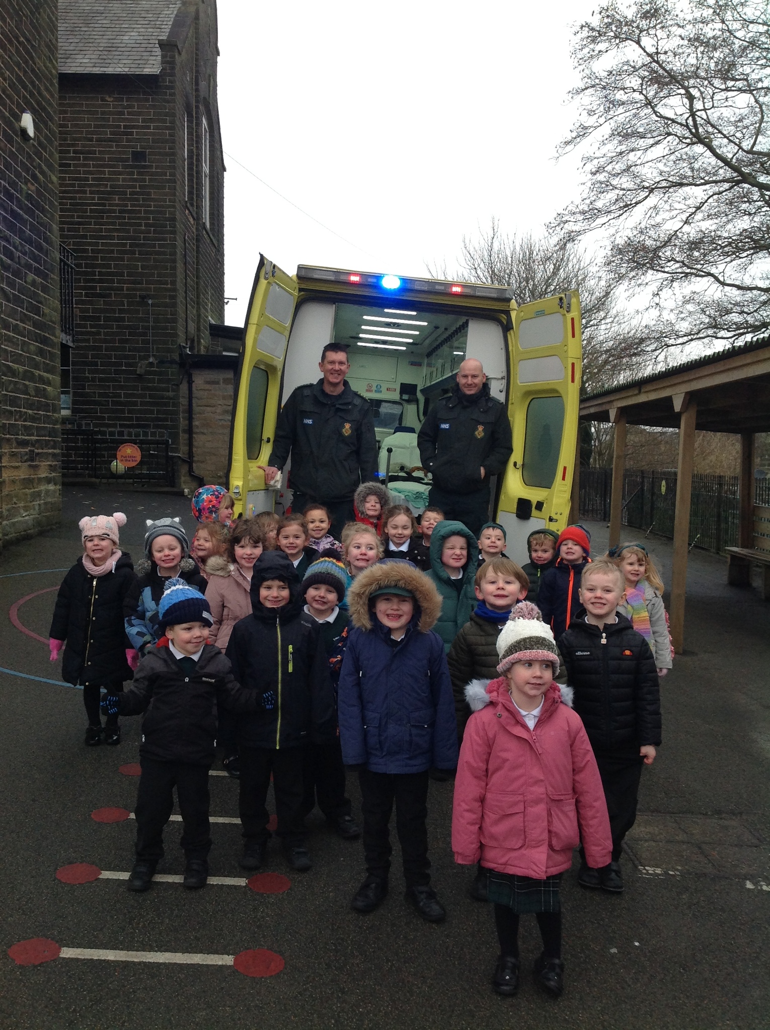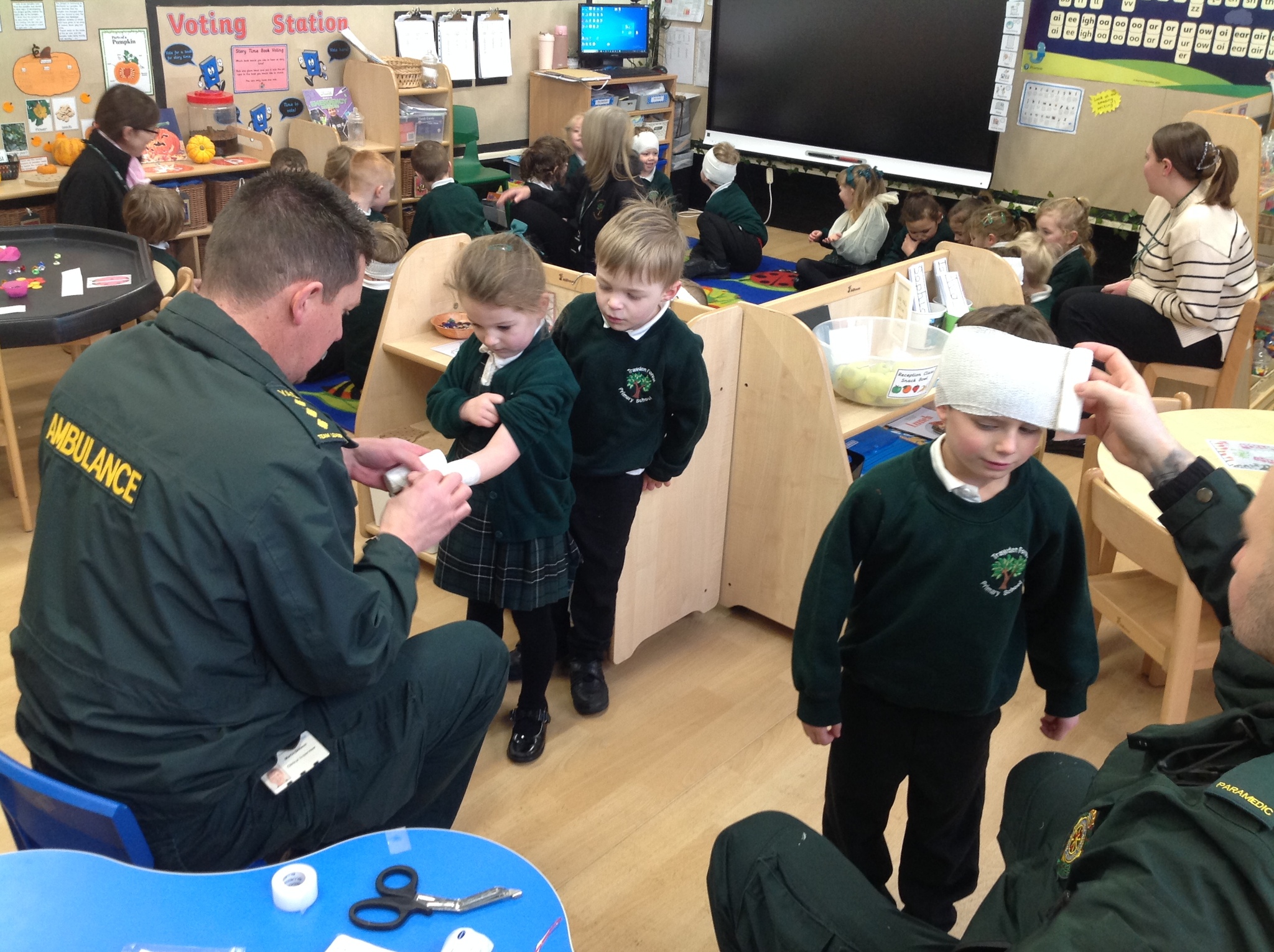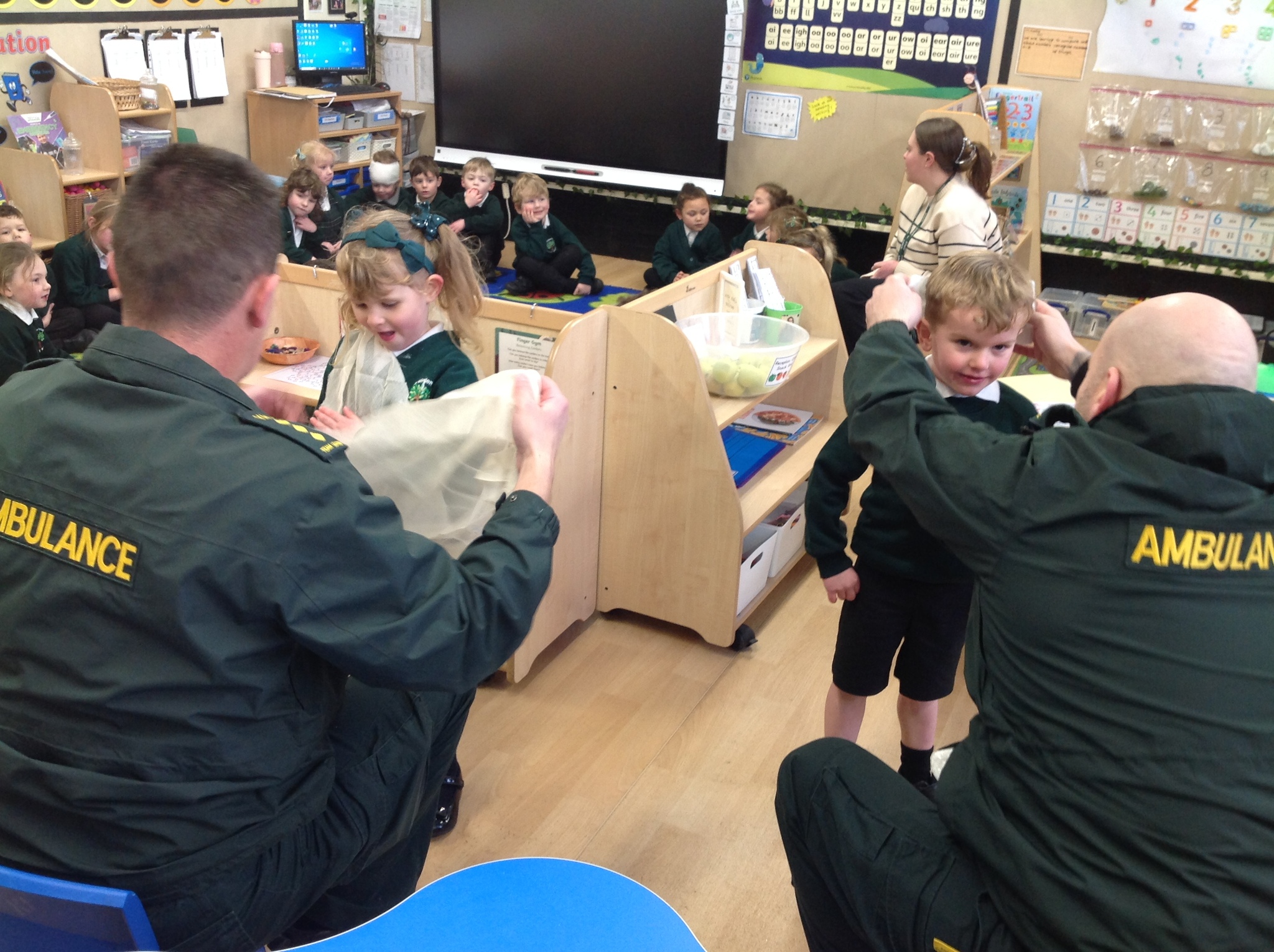 Today we had a very exciting visit from two paramedics who brought their ambulance to show us! The children were lucky enough to go on the ambulance and meet Charles and Eddie (the two poorly teddies). The children listened carefully and asked some great questions. Some of the children even chose to be bandaged up so please don’t worry when you see them after school! We all had a brilliant time and are very grateful for the visit.