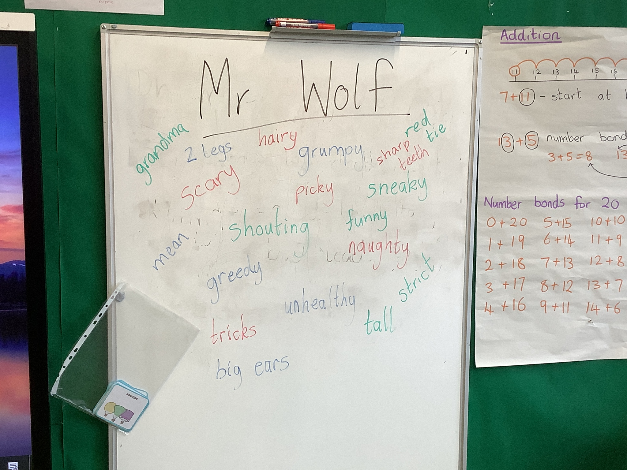 When Mrs Alcock came in she was shocked because she had never heard of Mr Wolf. She asked the children what he was like and they collected lots of words to describe him.