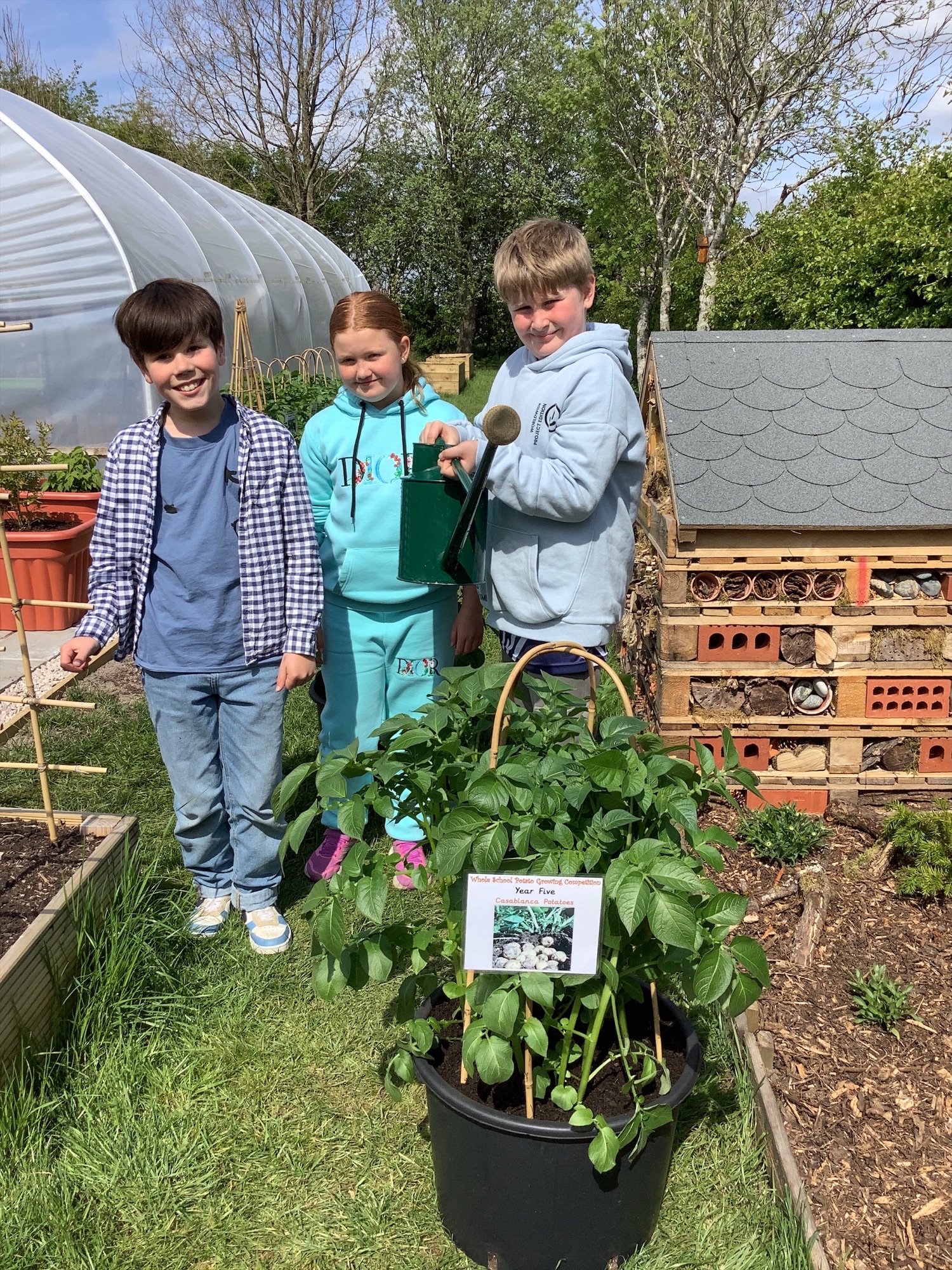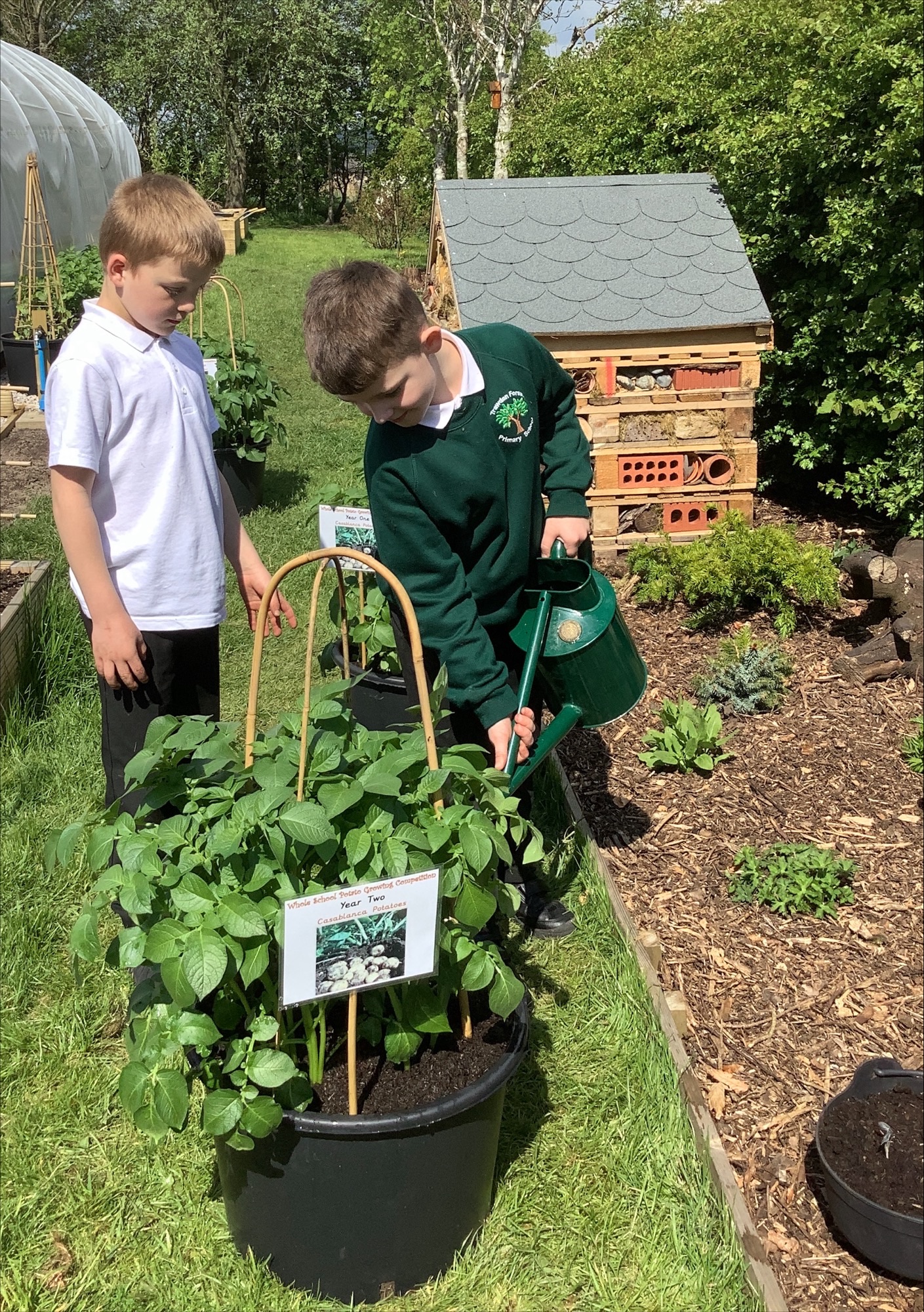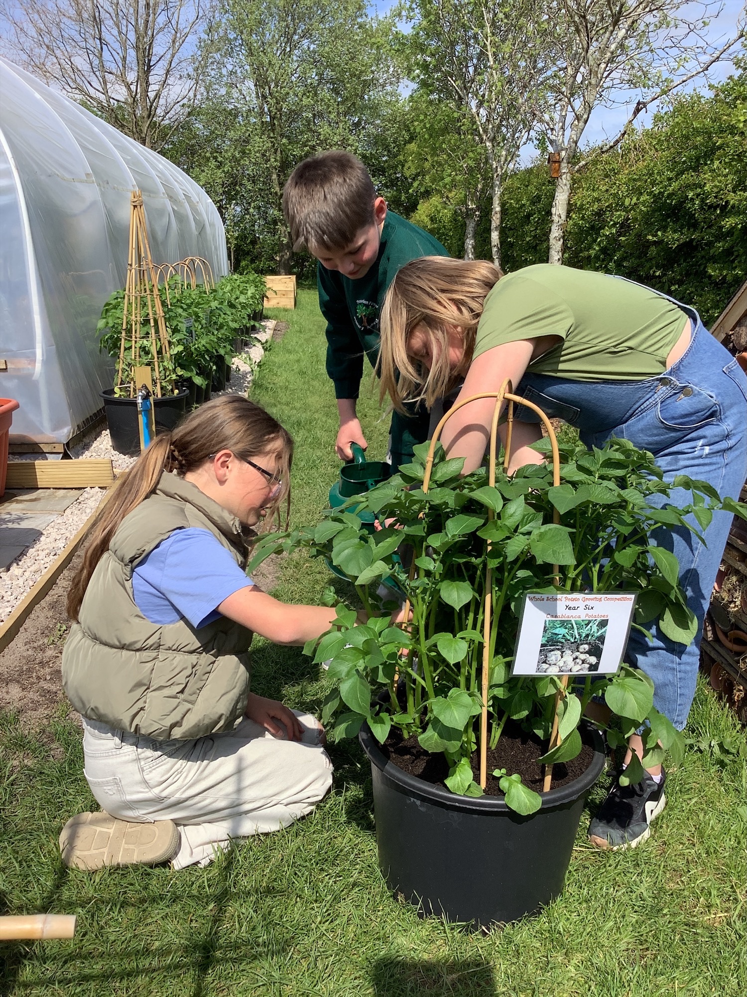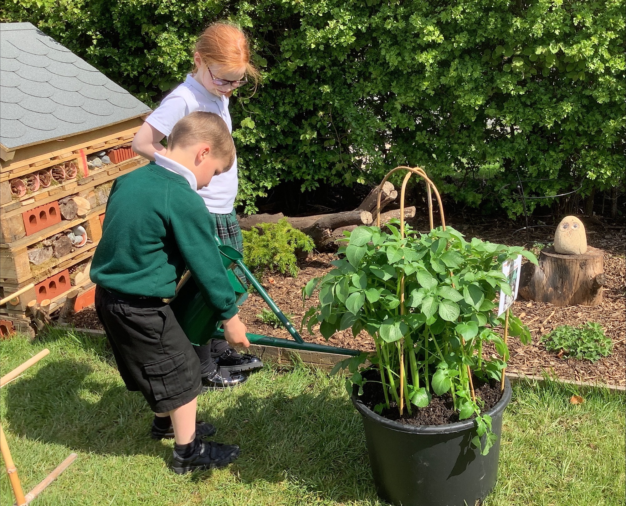 As part of the next stage in the growing process, representatives from every class gathered last week to carefully earth up their potato plants and give them a thorough watering.
