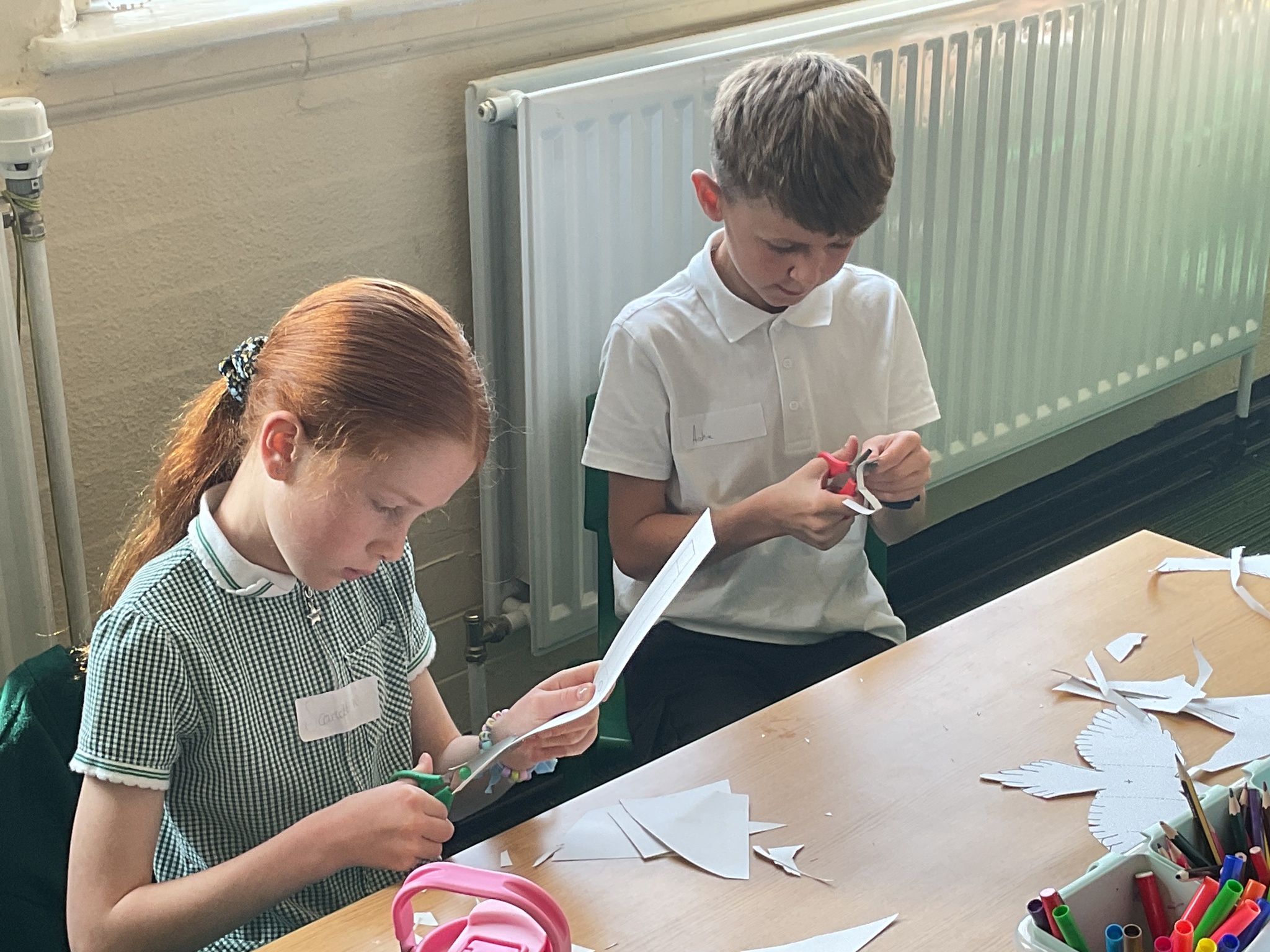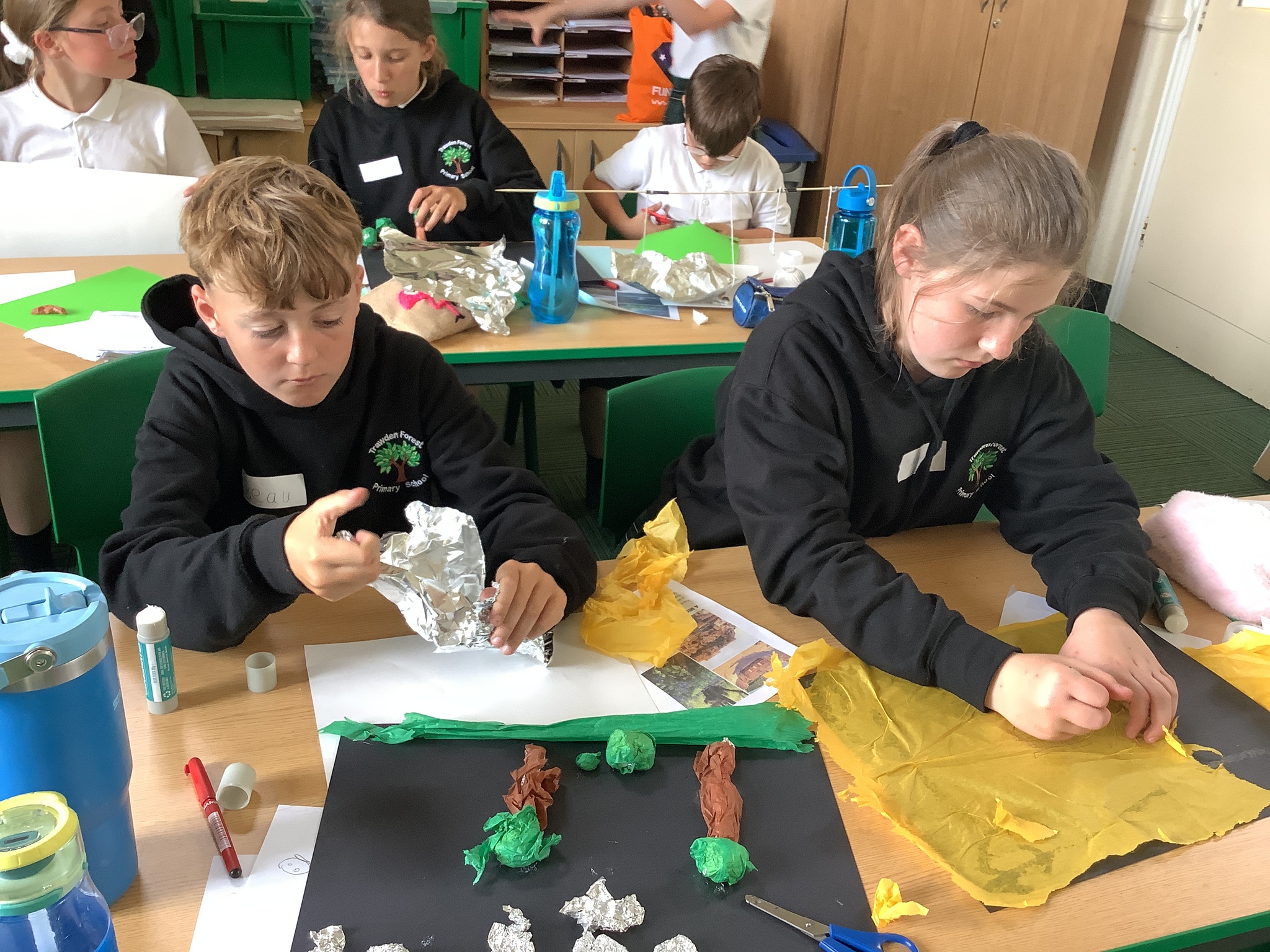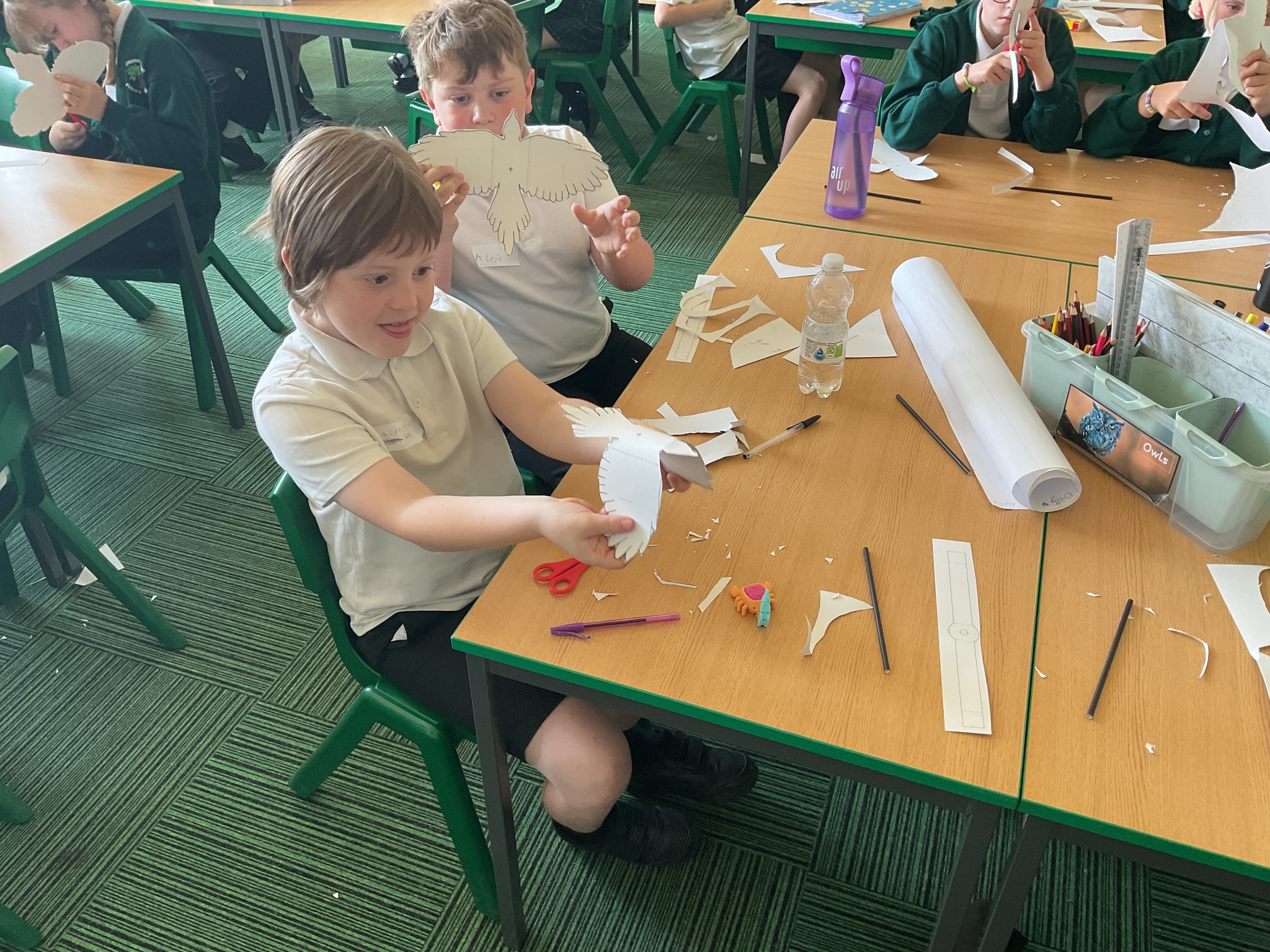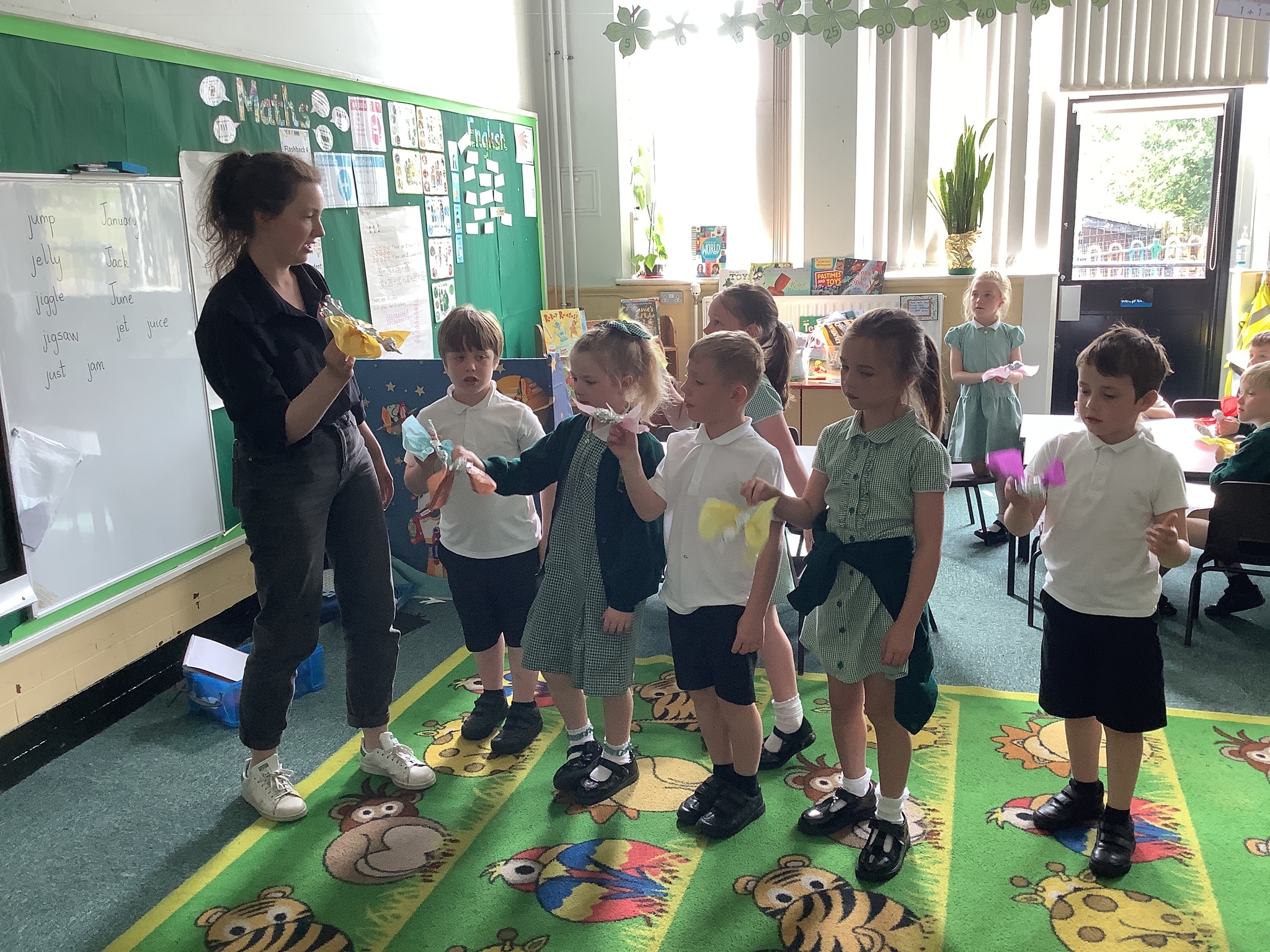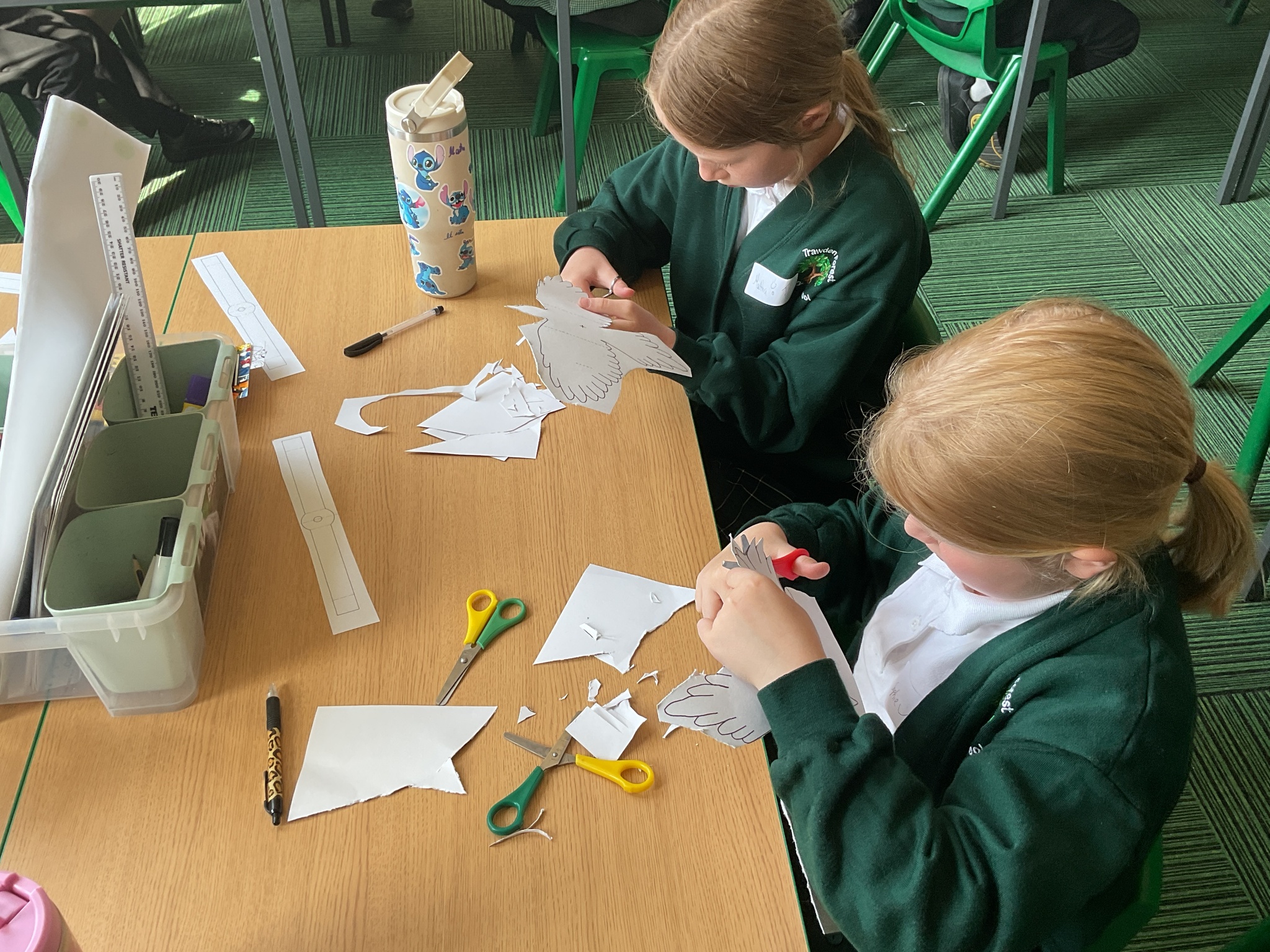 Then each class enjoyed a workshop where the children created something themselves. EYFS made some wriggly, jiggly snakes, Y1, Y2 and Y3 made foil and tissue birds and Y4 made some fabulous flapping bats. Y5 and Y6 used Shakespeare as their inspiration to design some sets for staging his plays.
