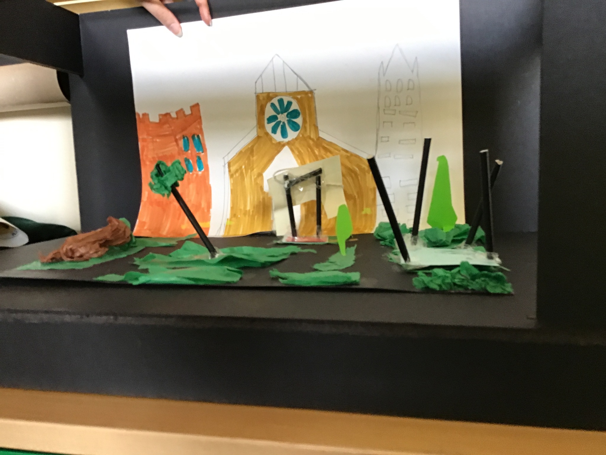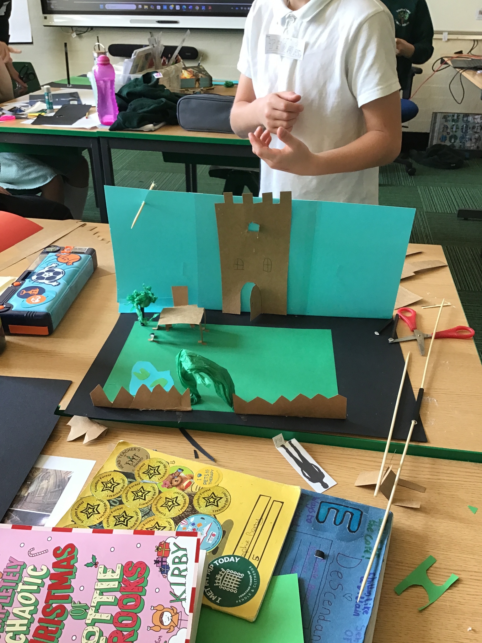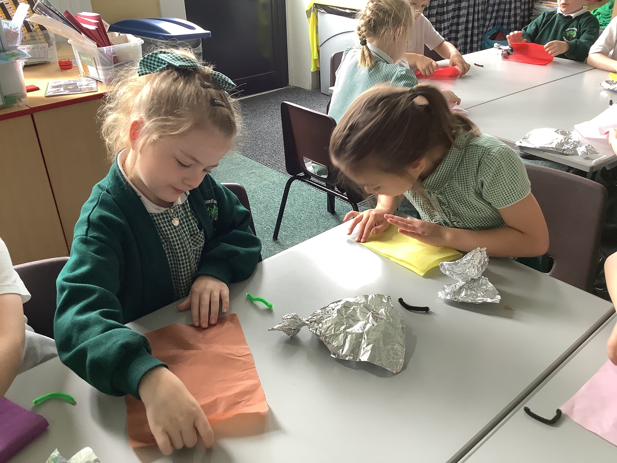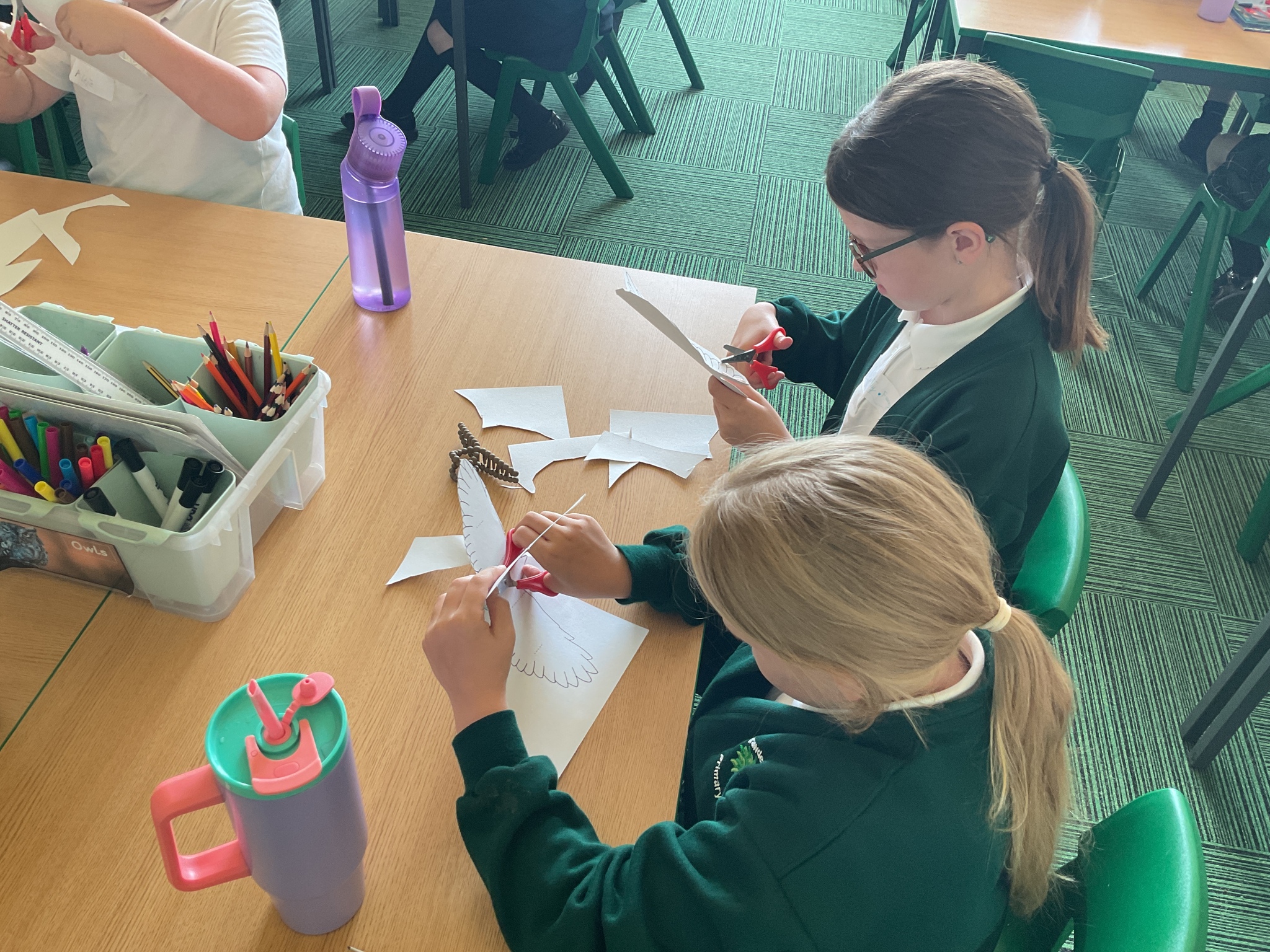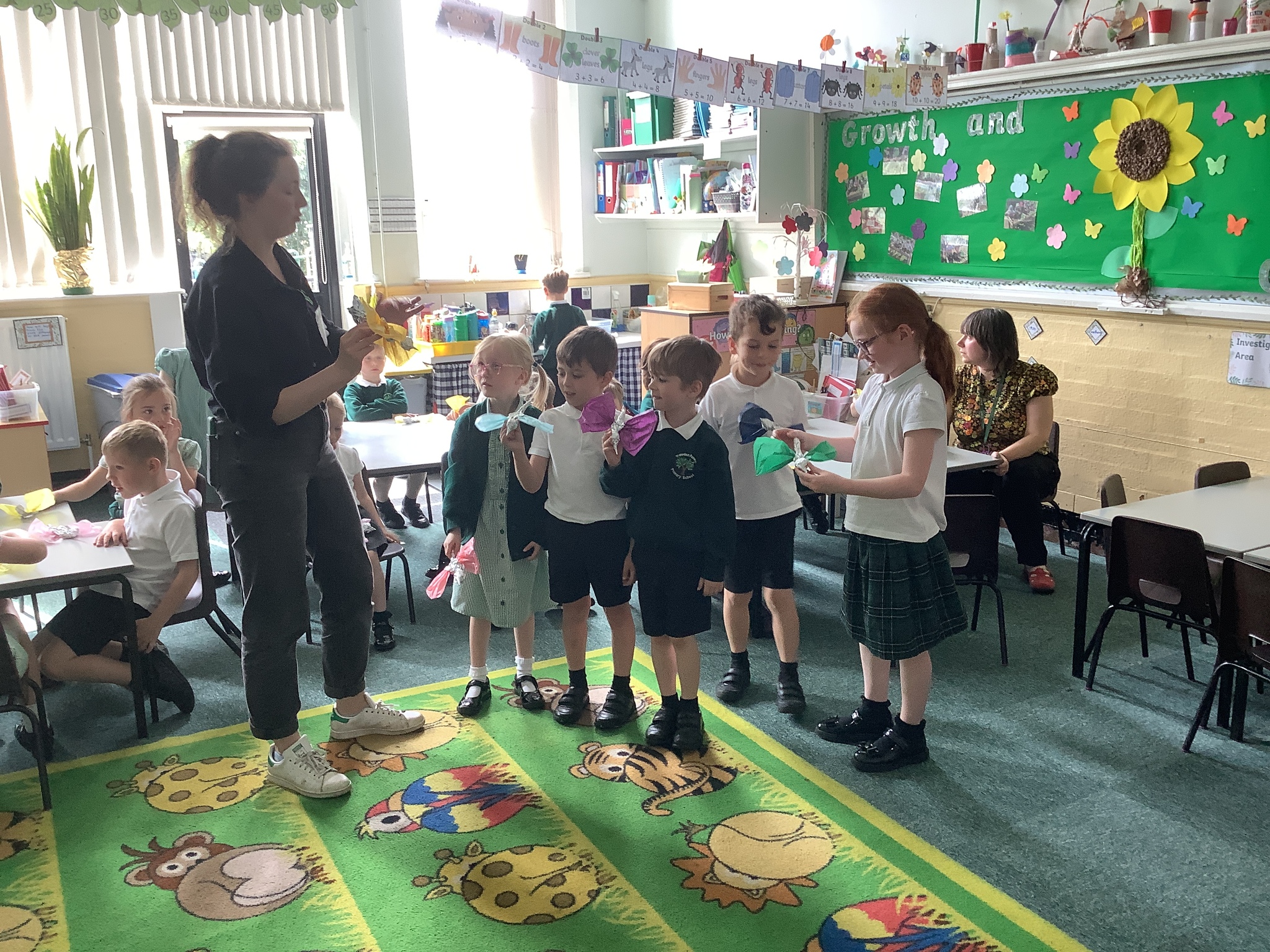Then each class enjoyed a workshop where the children created something themselves. EYFS made some wriggly, jiggly snakes, Y1, Y2 and Y3 made foil and tissue birds and Y4 made some fabulous flapping bats. Y5 and Y6 used Shakespeare as their inspiration to design some sets for staging his plays.