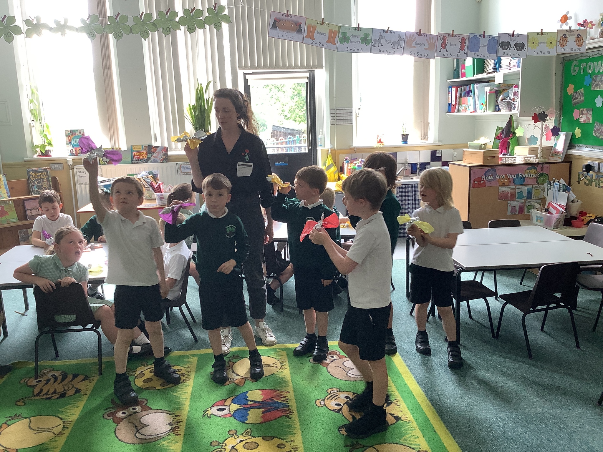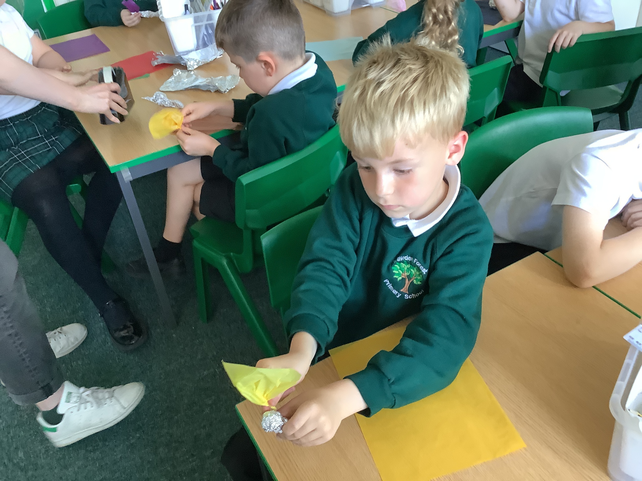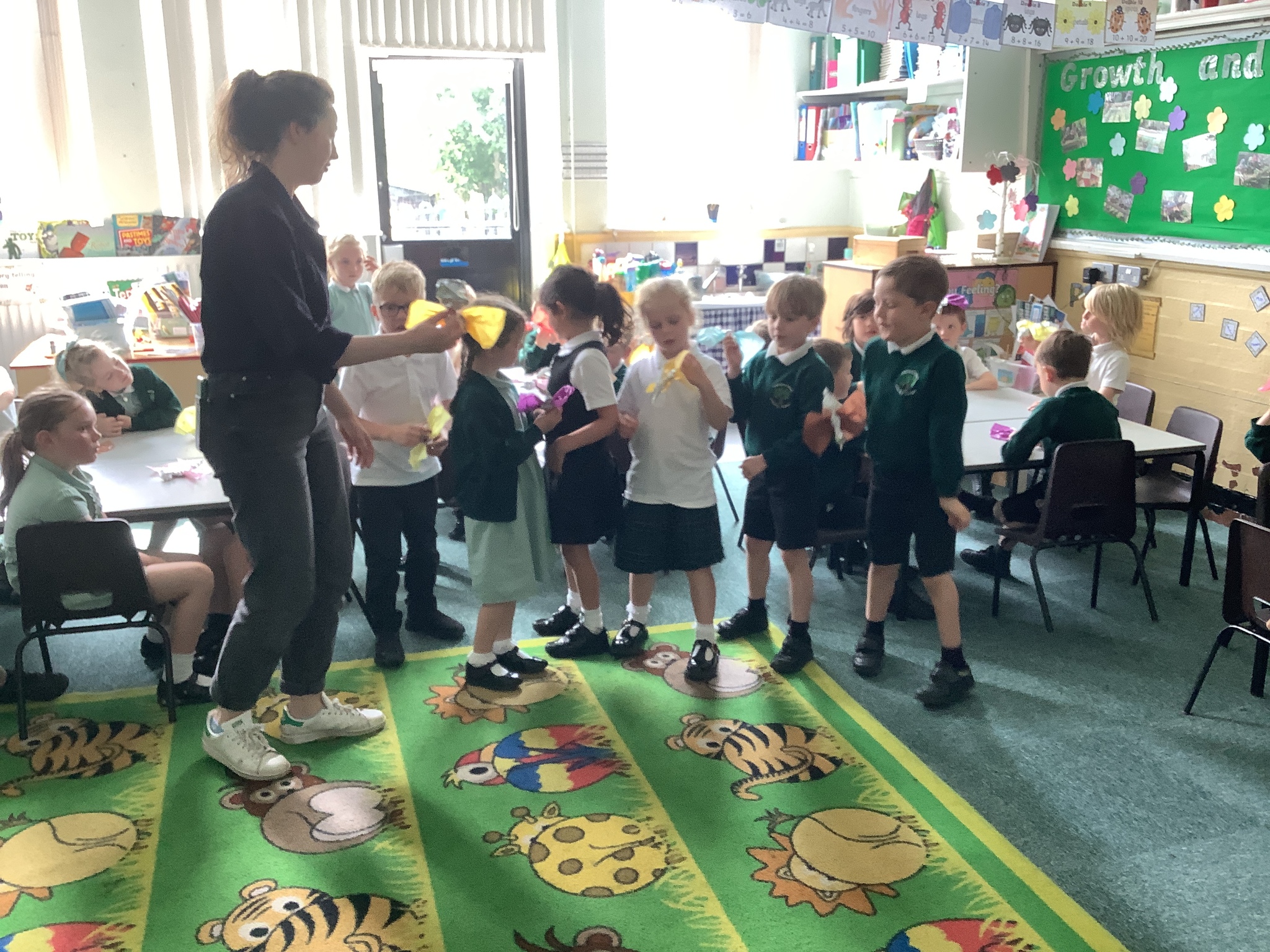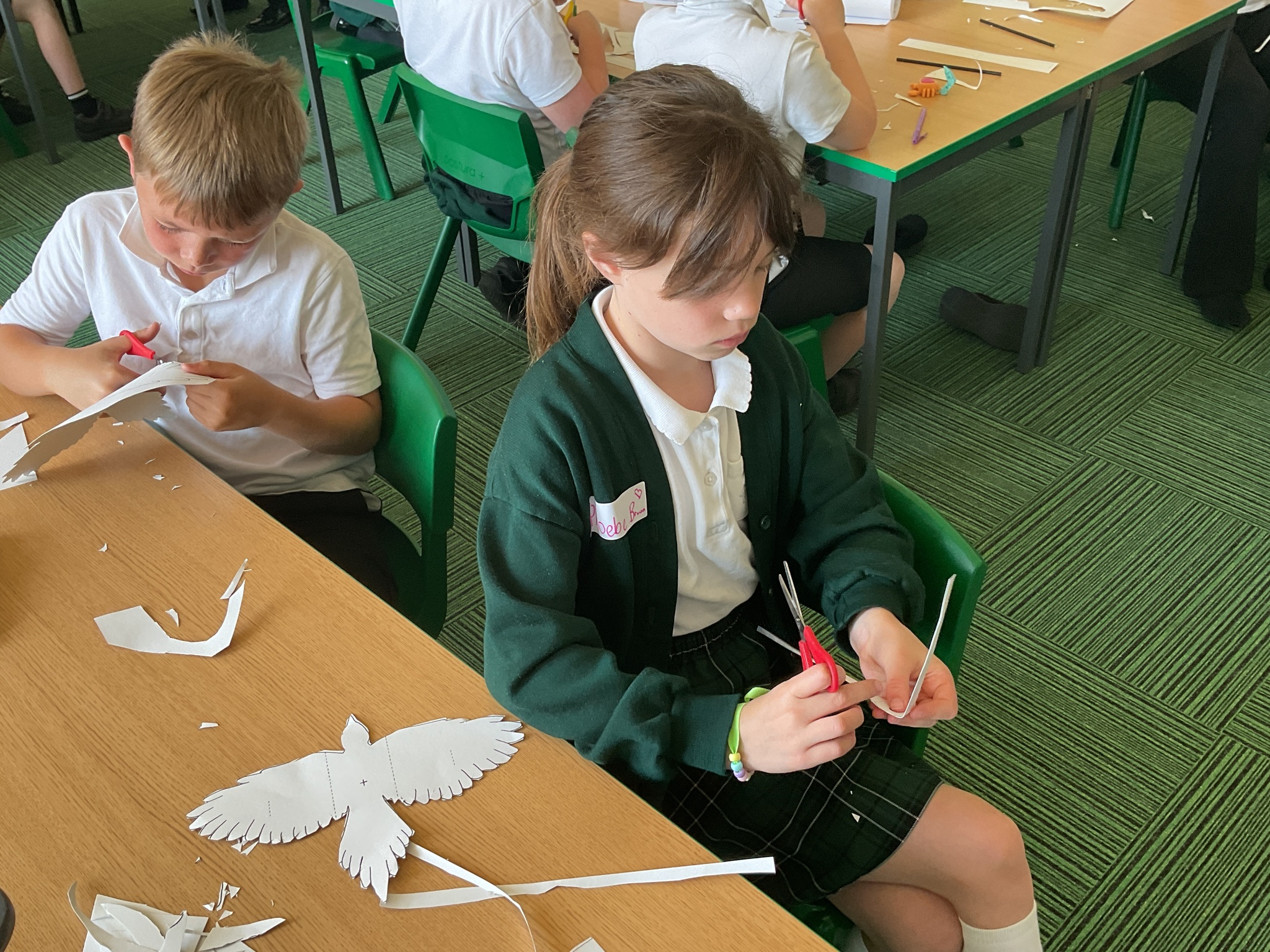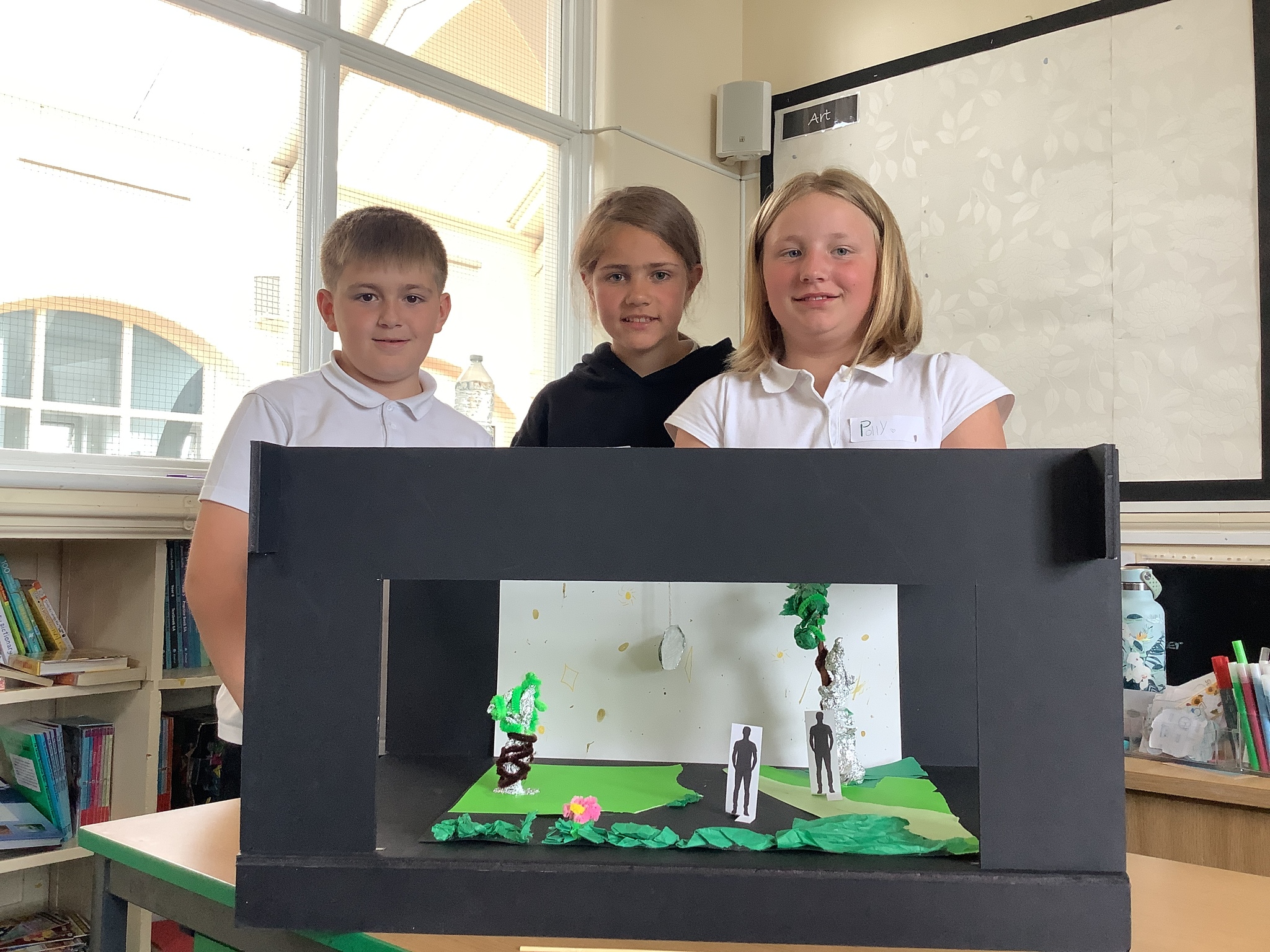 Then each class enjoyed a workshop where the children created something themselves. EYFS made some wriggly, jiggly snakes, Y1, Y2 and Y3 made foil and tissue birds and Y4 made some fabulous flapping bats. Y5 and Y6 used Shakespeare as their inspiration to design some sets for staging his plays.