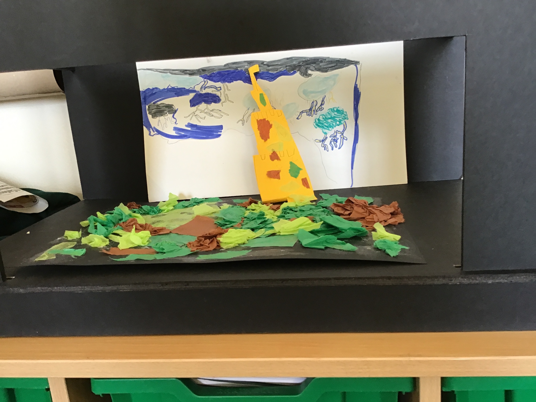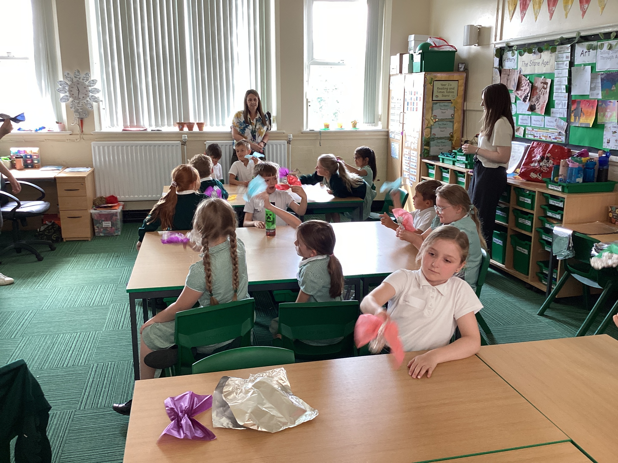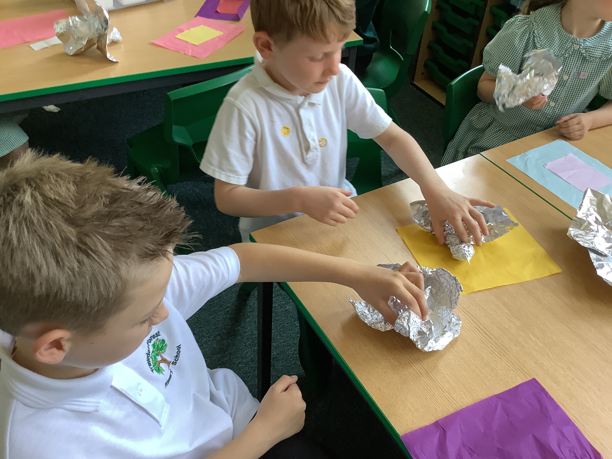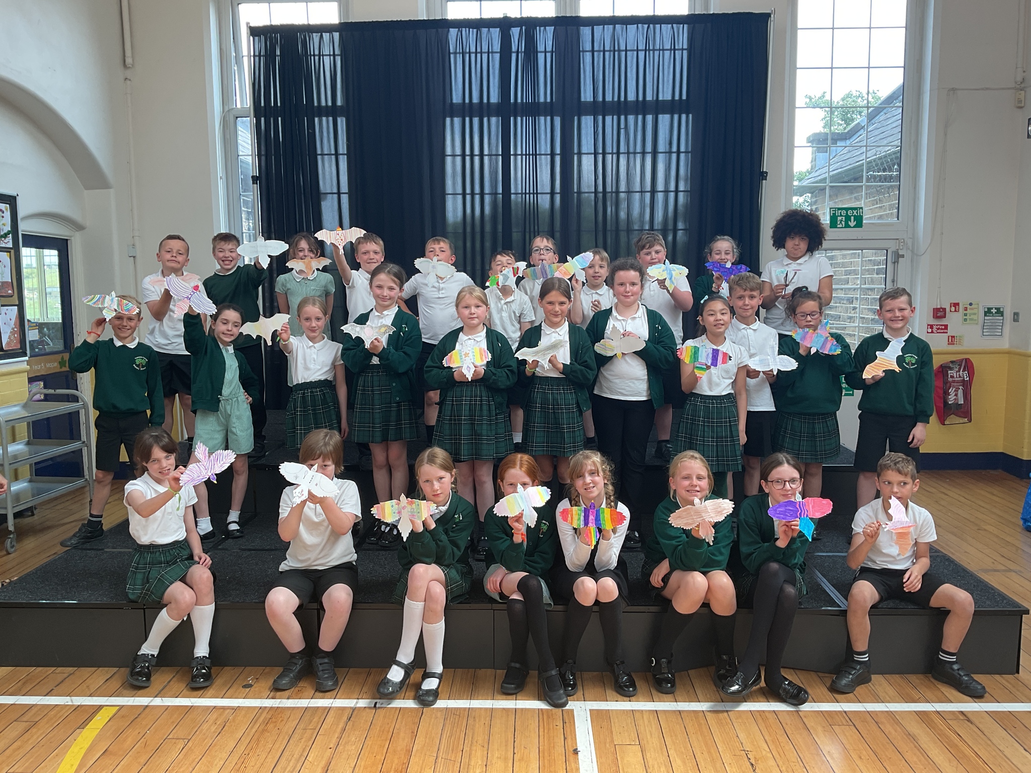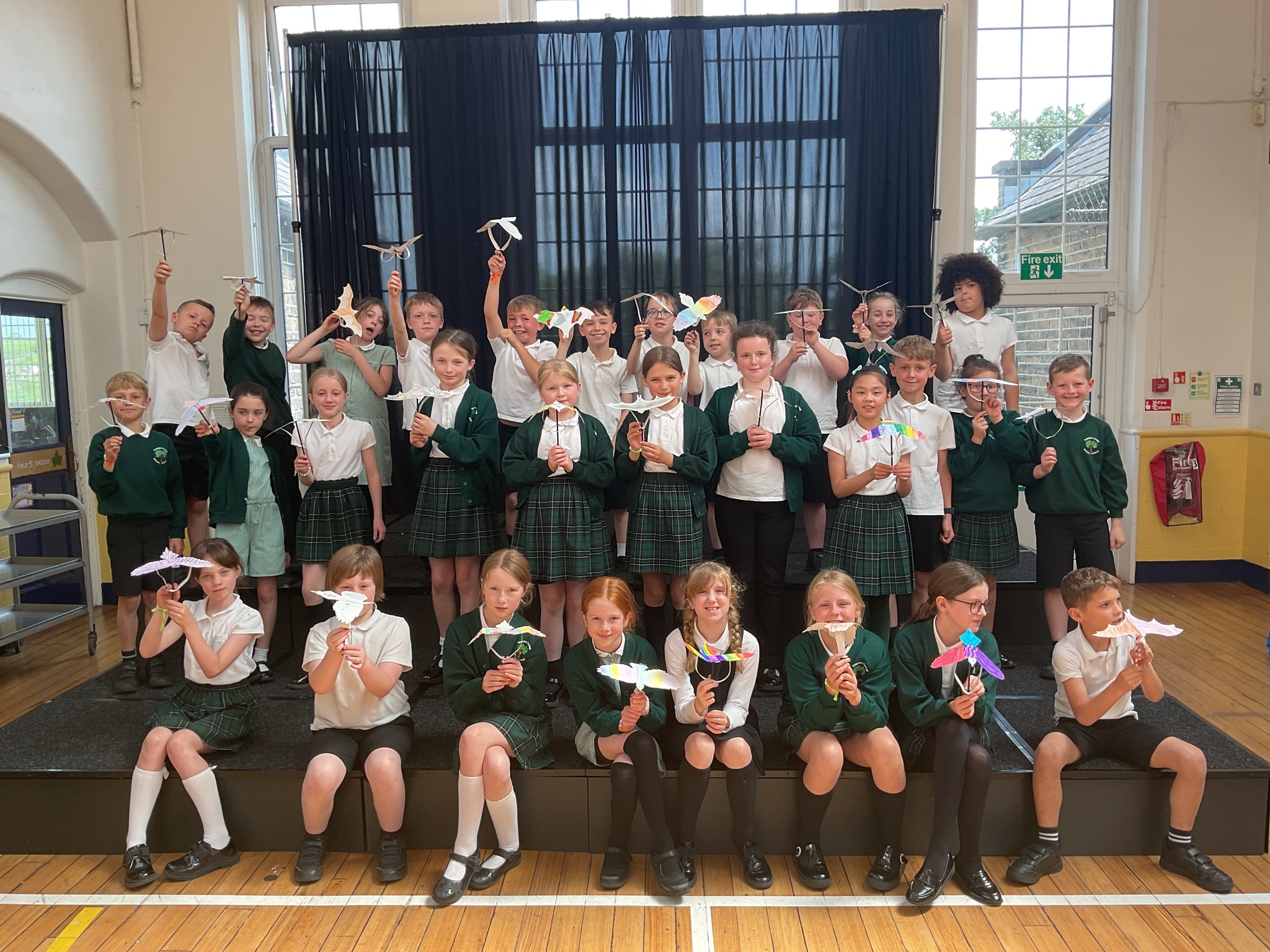 Then each class enjoyed a workshop where the children created something themselves. EYFS made some wriggly, jiggly snakes, Y1, Y2 and Y3 made foil and tissue birds and Y4 made some fabulous flapping bats. Y5 and Y6 used Shakespeare as their inspiration to design some sets for staging his plays.