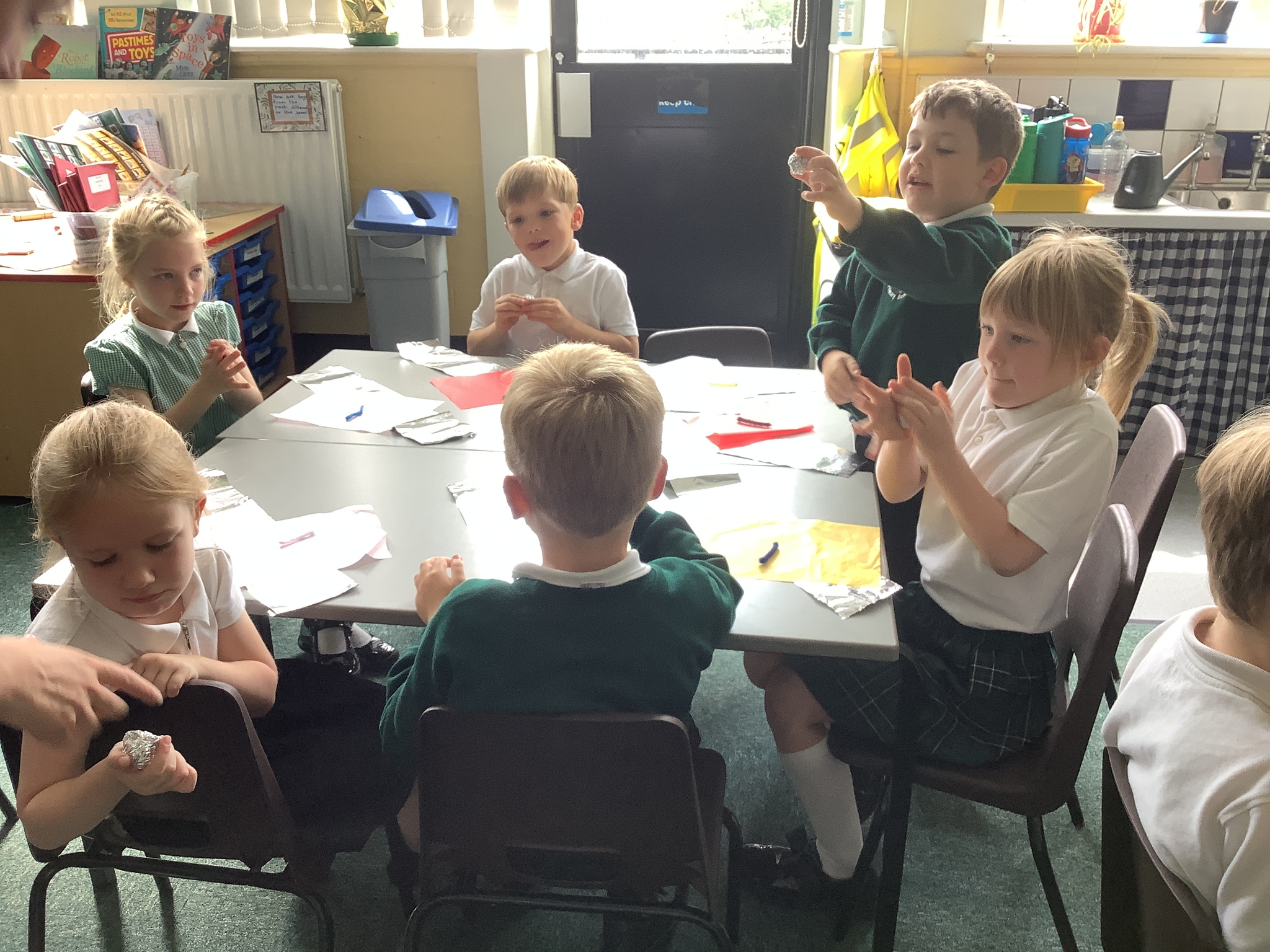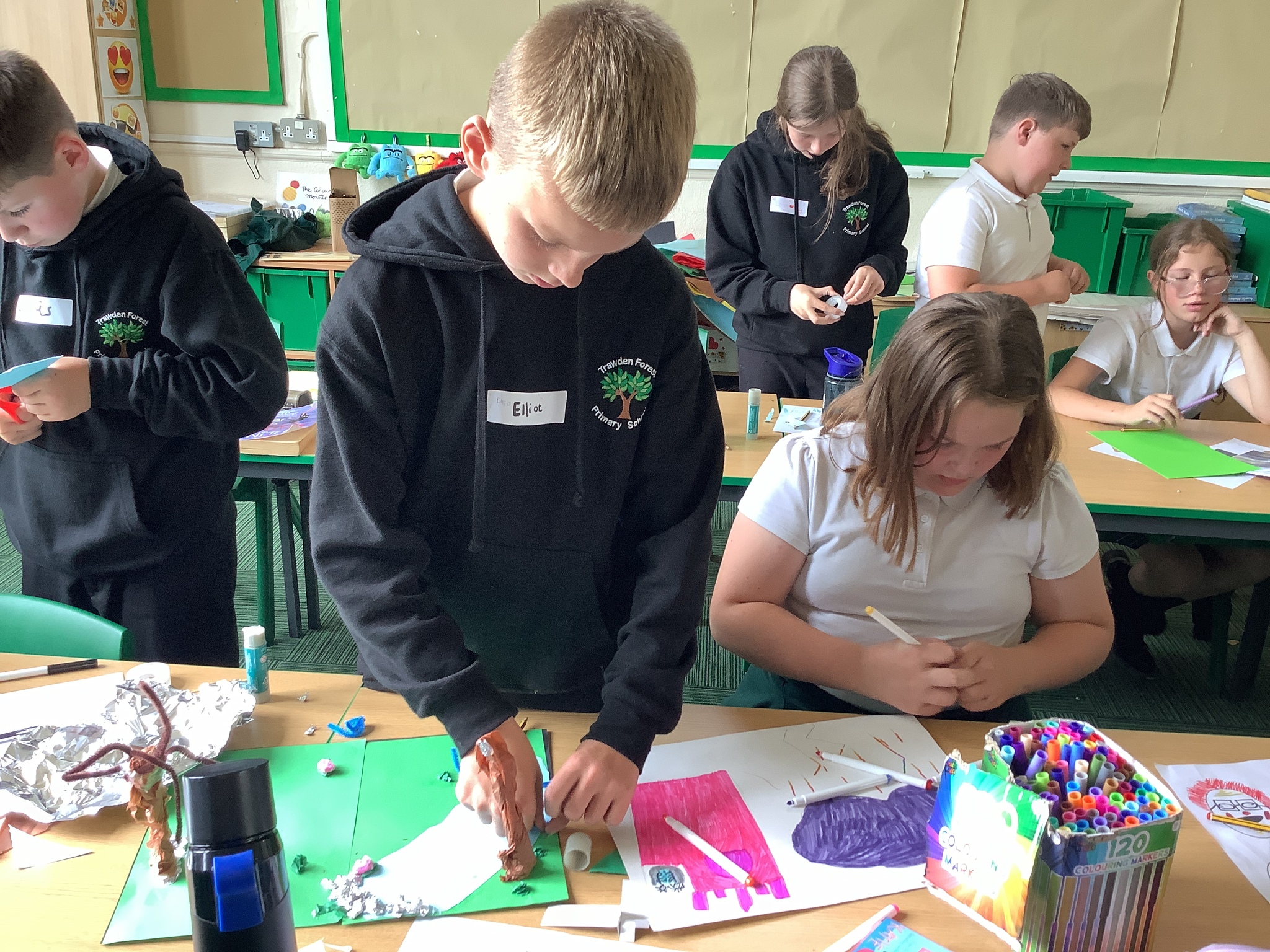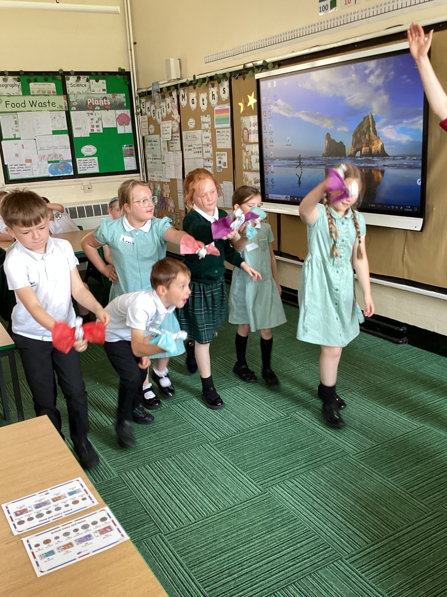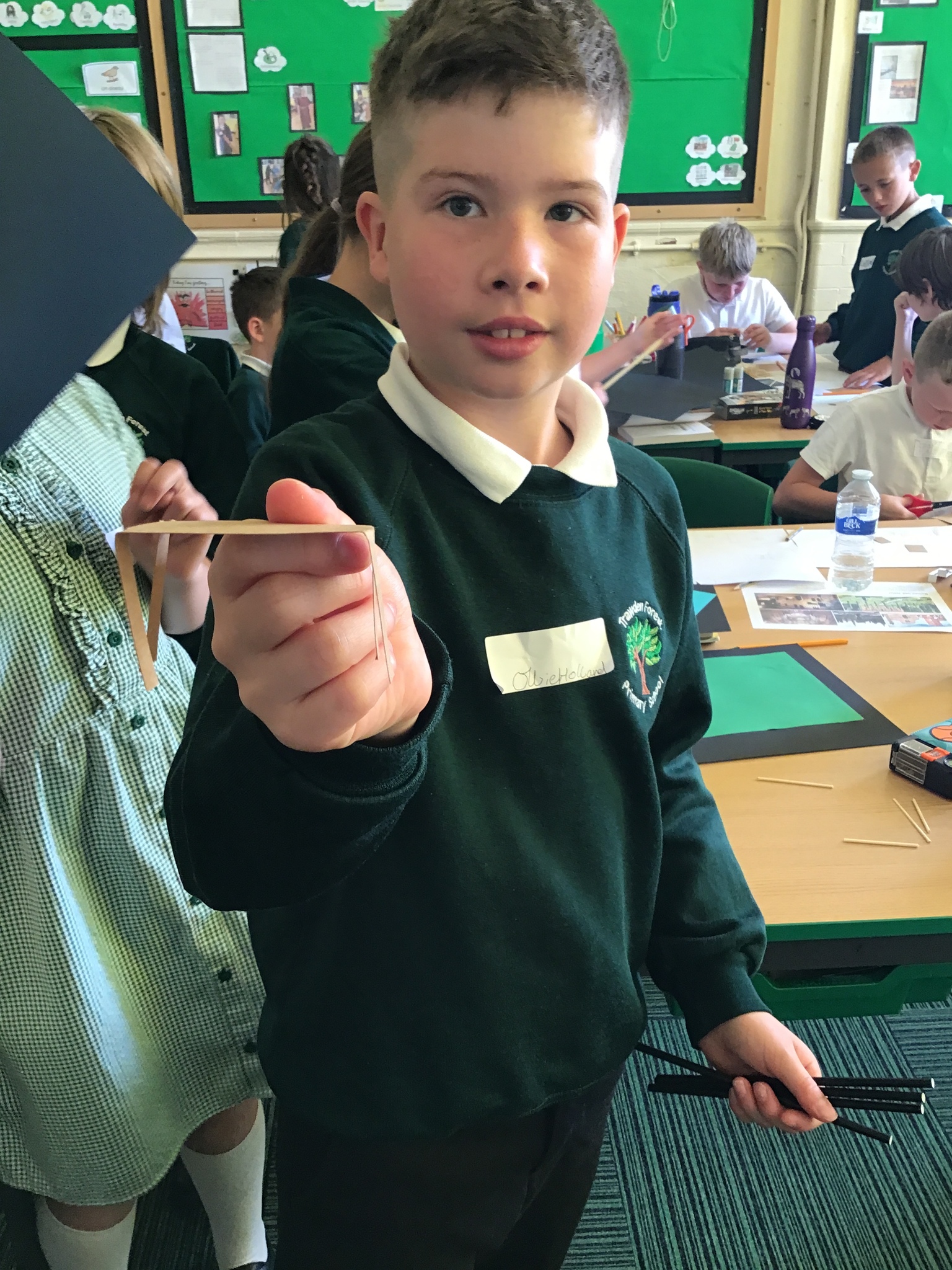 Then each class enjoyed a workshop where the children created something themselves. EYFS made some wriggly, jiggly snakes, Y1, Y2 and Y3 made foil and tissue birds and Y4 made some fabulous flapping bats. Y5 and Y6 used Shakespeare as their inspiration to design some sets for staging his plays.