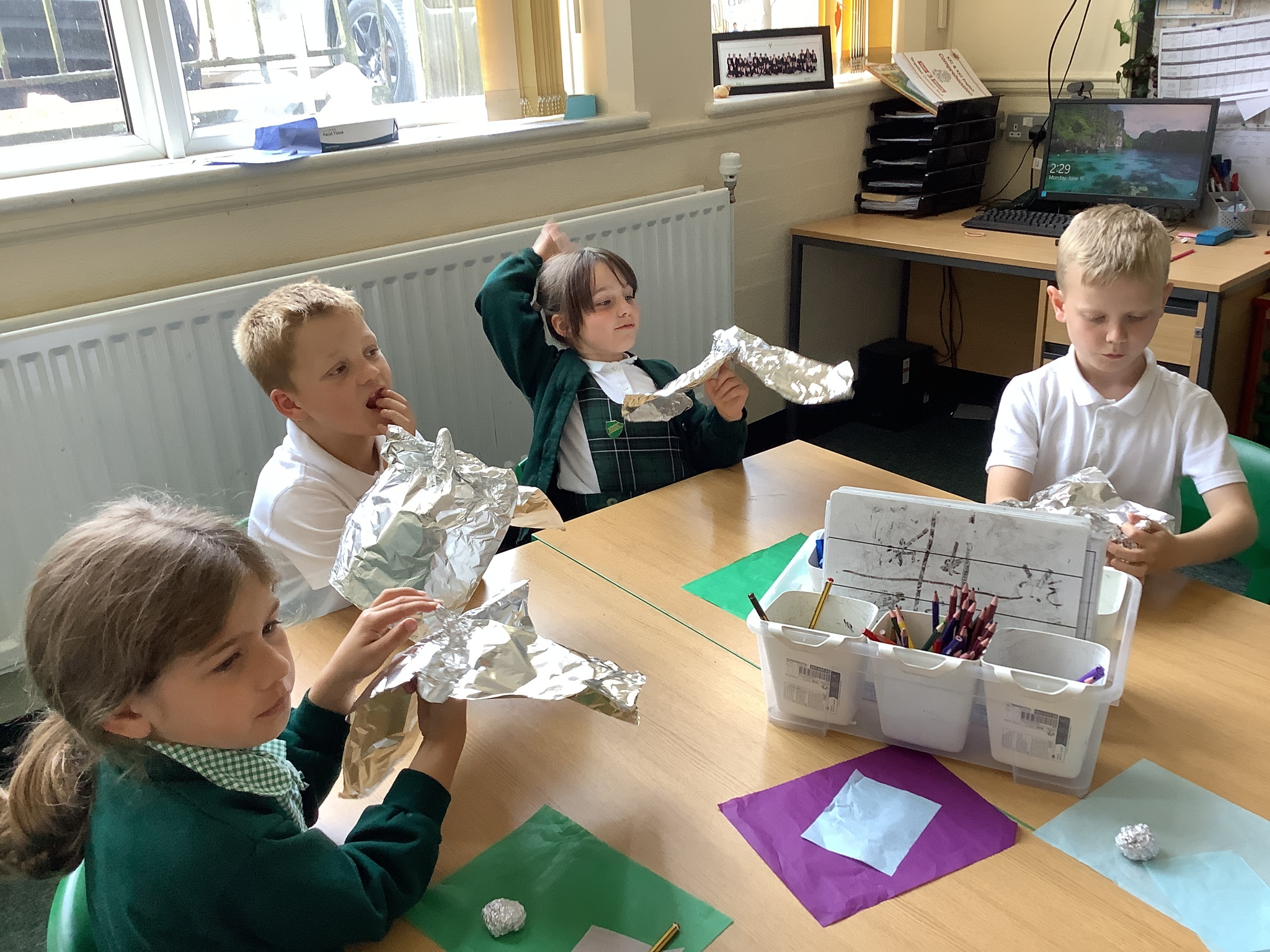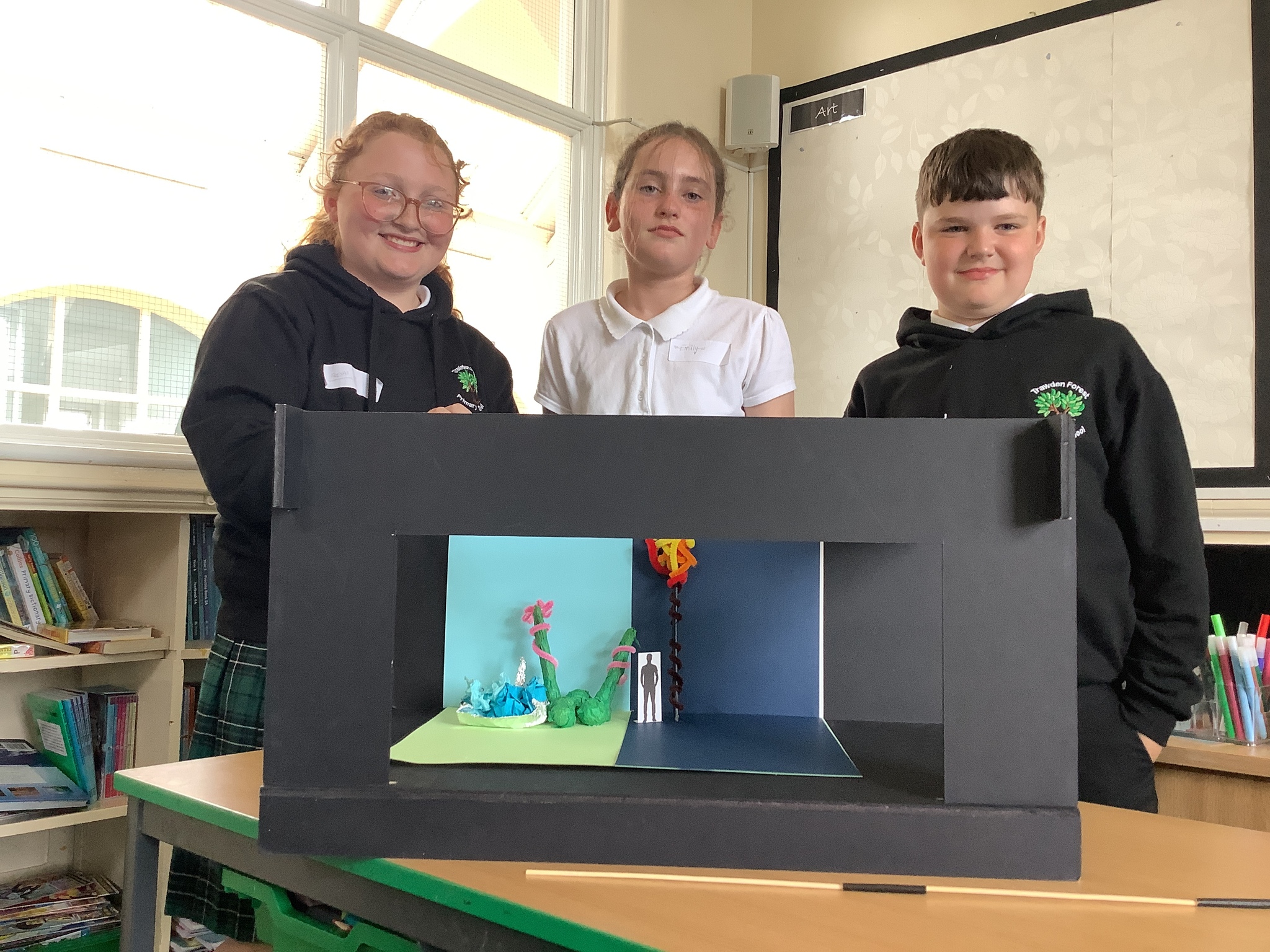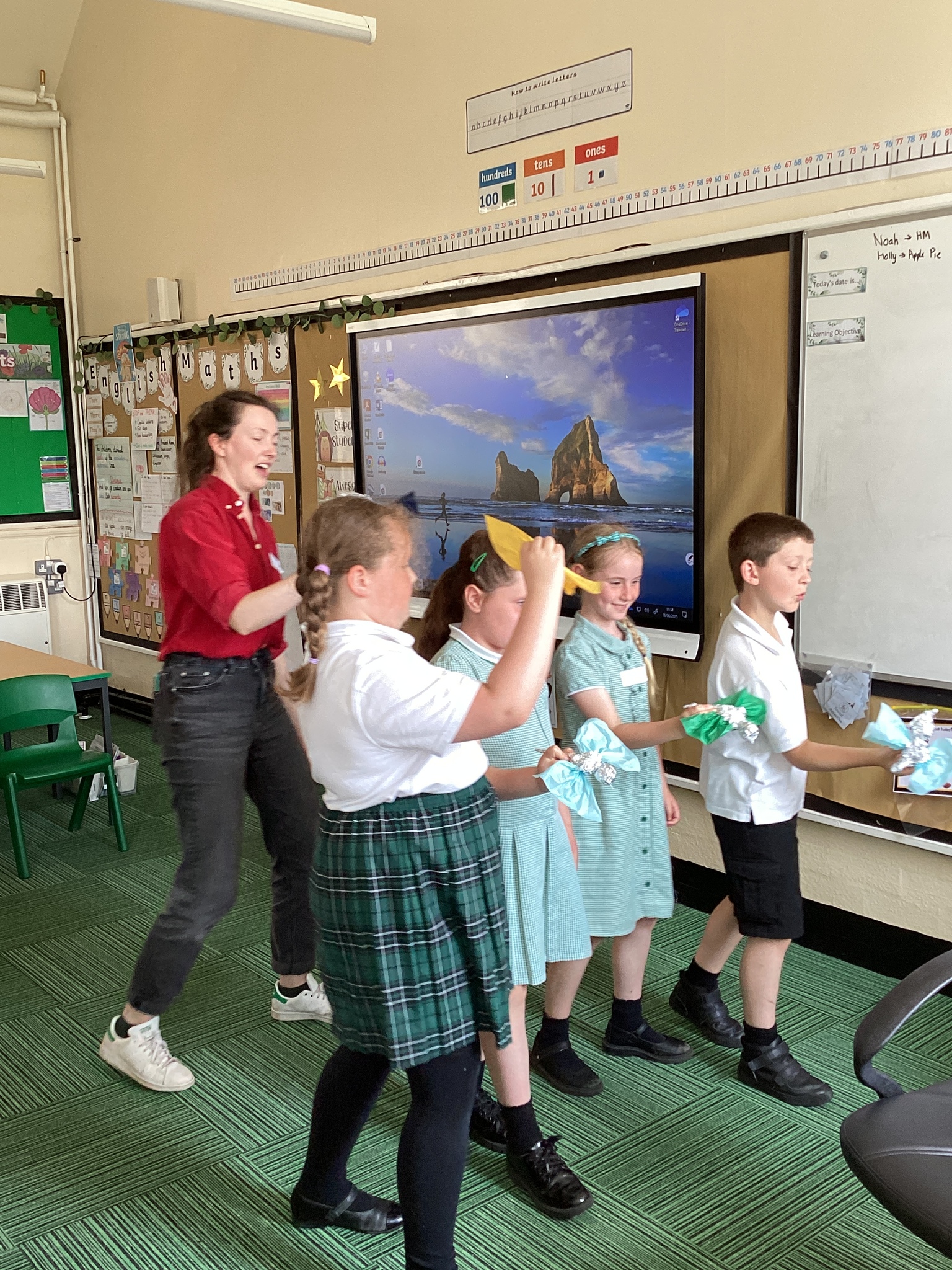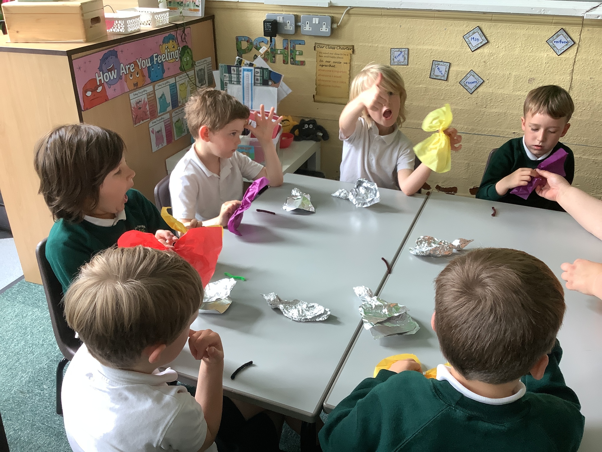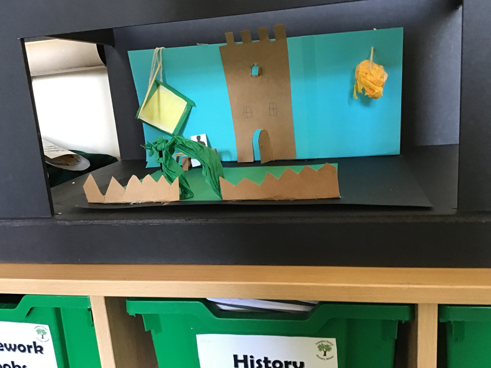Then each class enjoyed a workshop where the children created something themselves. EYFS made some wriggly, jiggly snakes, Y1, Y2 and Y3 made foil and tissue birds and Y4 made some fabulous flapping bats. Y5 and Y6 used Shakespeare as their inspiration to design some sets for staging his plays.