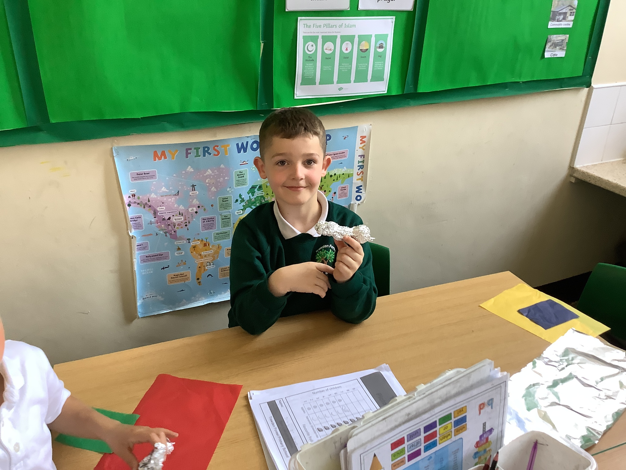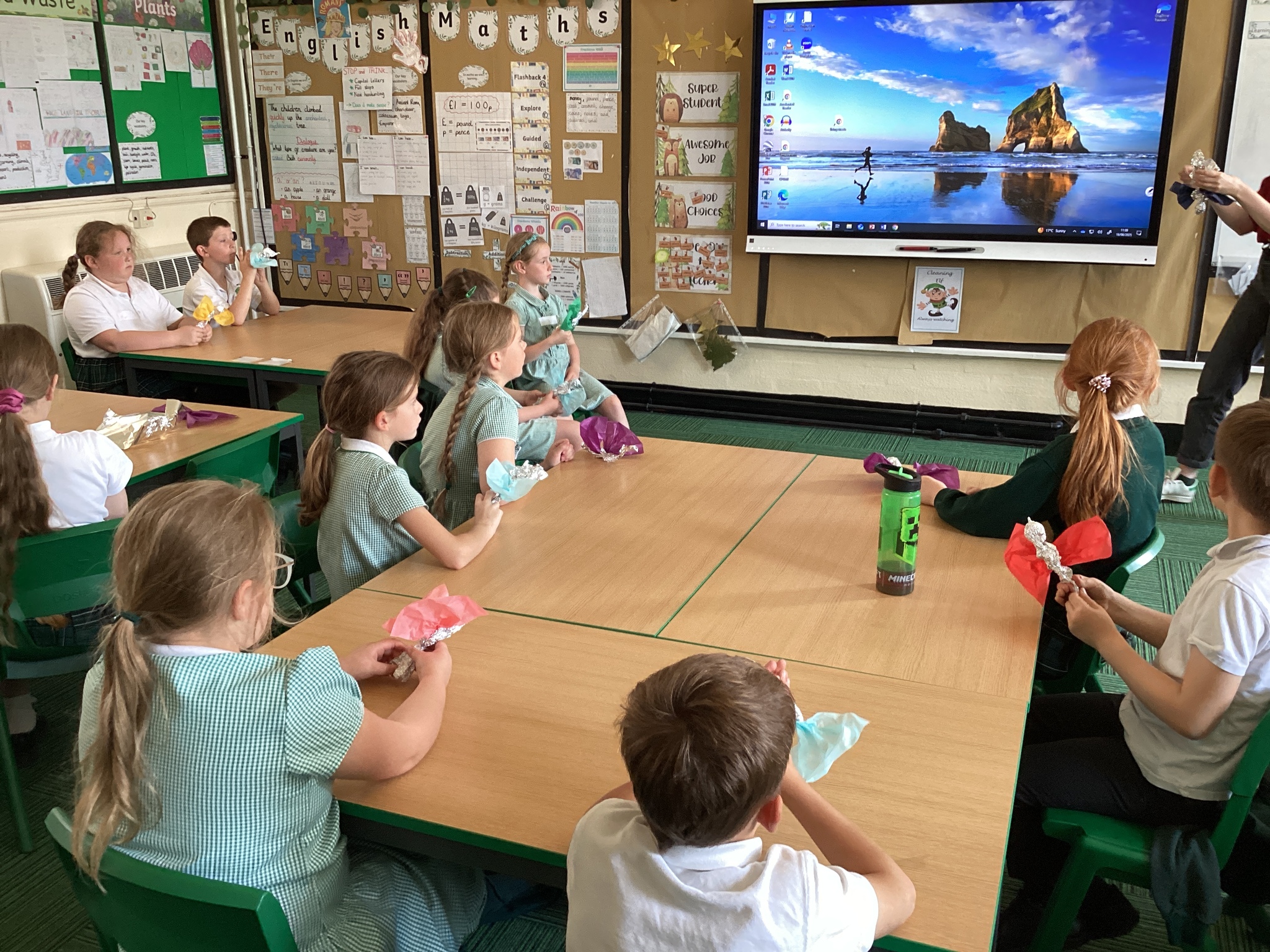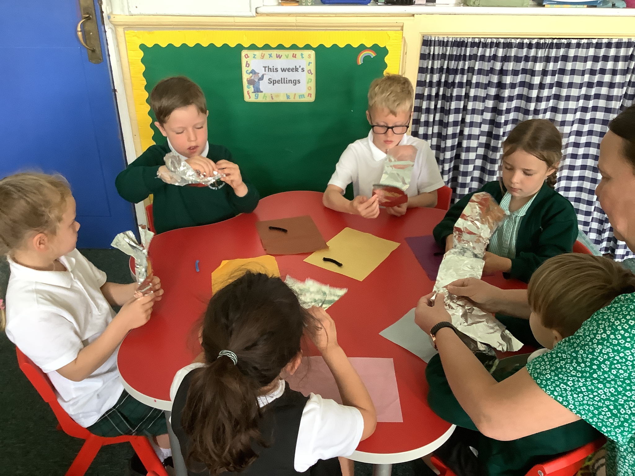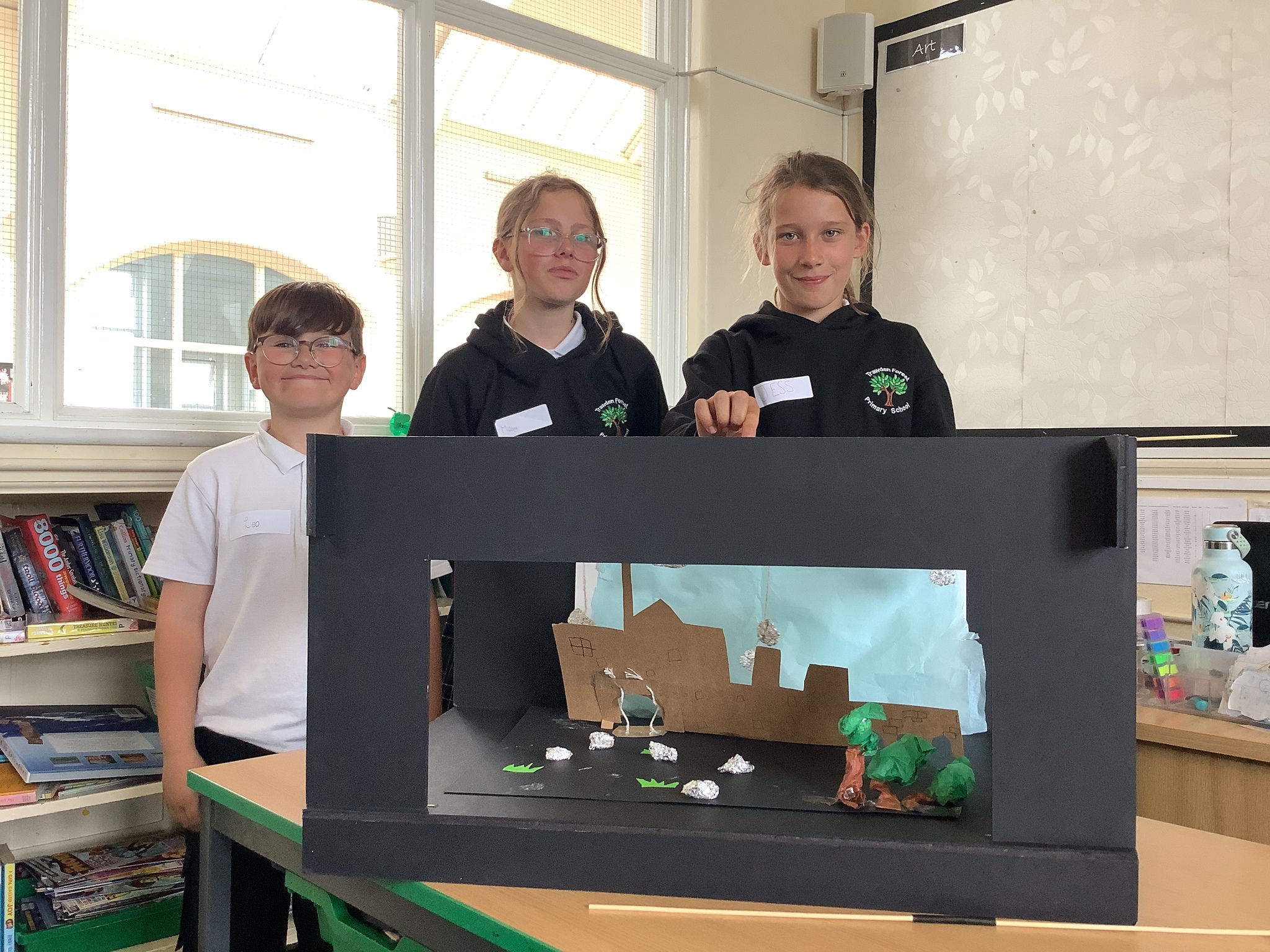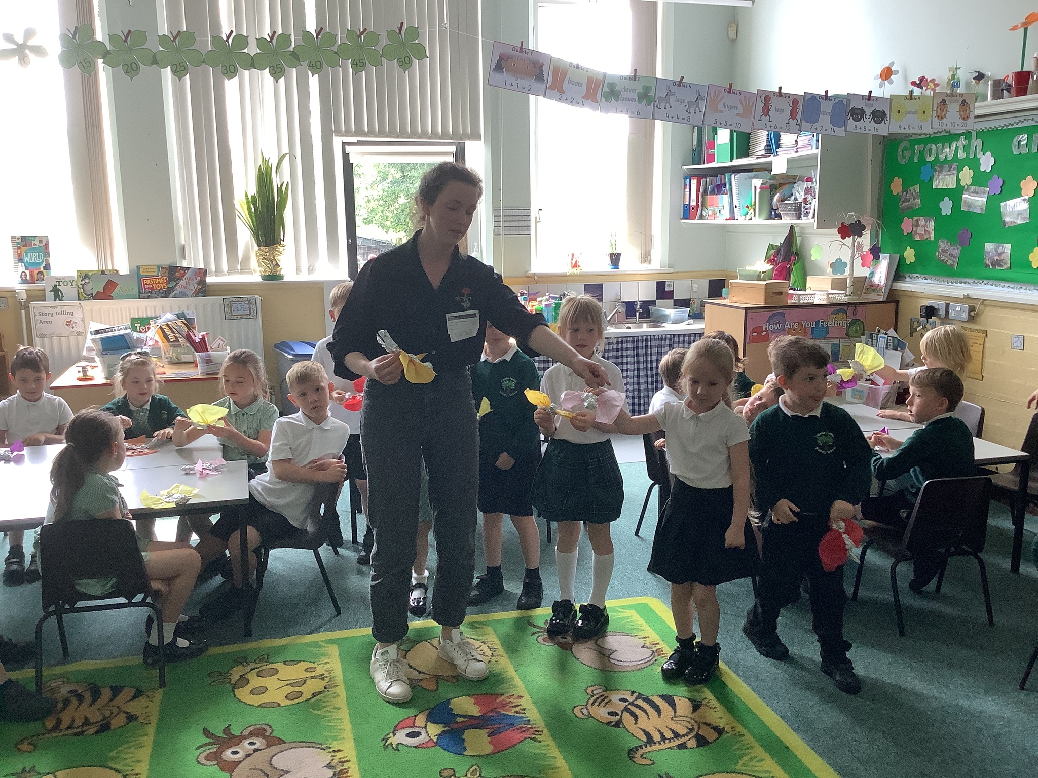 Then each class enjoyed a workshop where the children created something themselves. EYFS made some wriggly, jiggly snakes, Y1, Y2 and Y3 made foil and tissue birds and Y4 made some fabulous flapping bats. Y5 and Y6 used Shakespeare as their inspiration to design some sets for staging his plays.