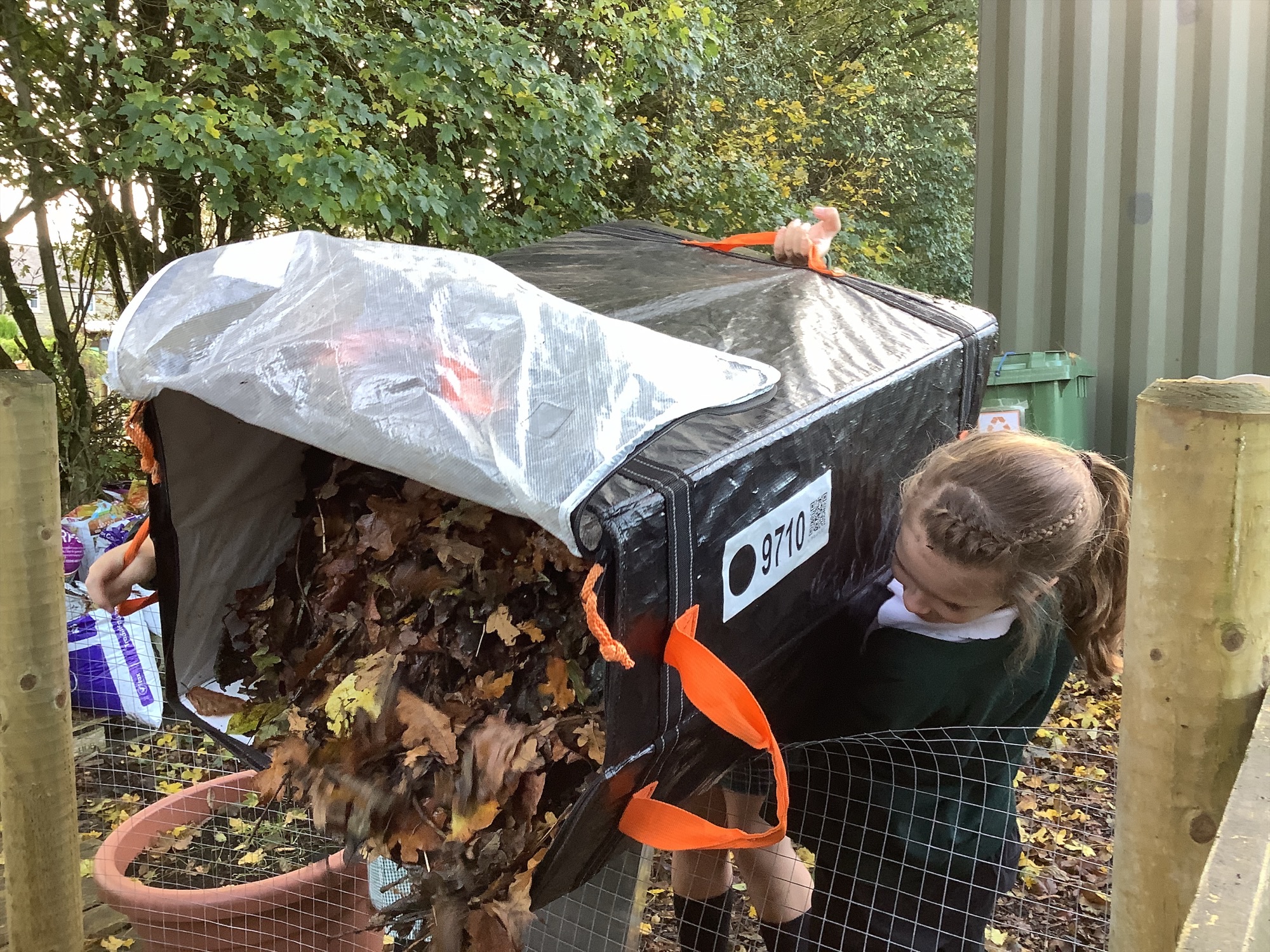 This week, our Gardening Club got busy collecting fallen autumn leaves to add to our leaf mulch bin — these will slowly break down over the next couple of years to make leaf-mould, a rich, natural soil conditioner that’s fantastic for our garden!