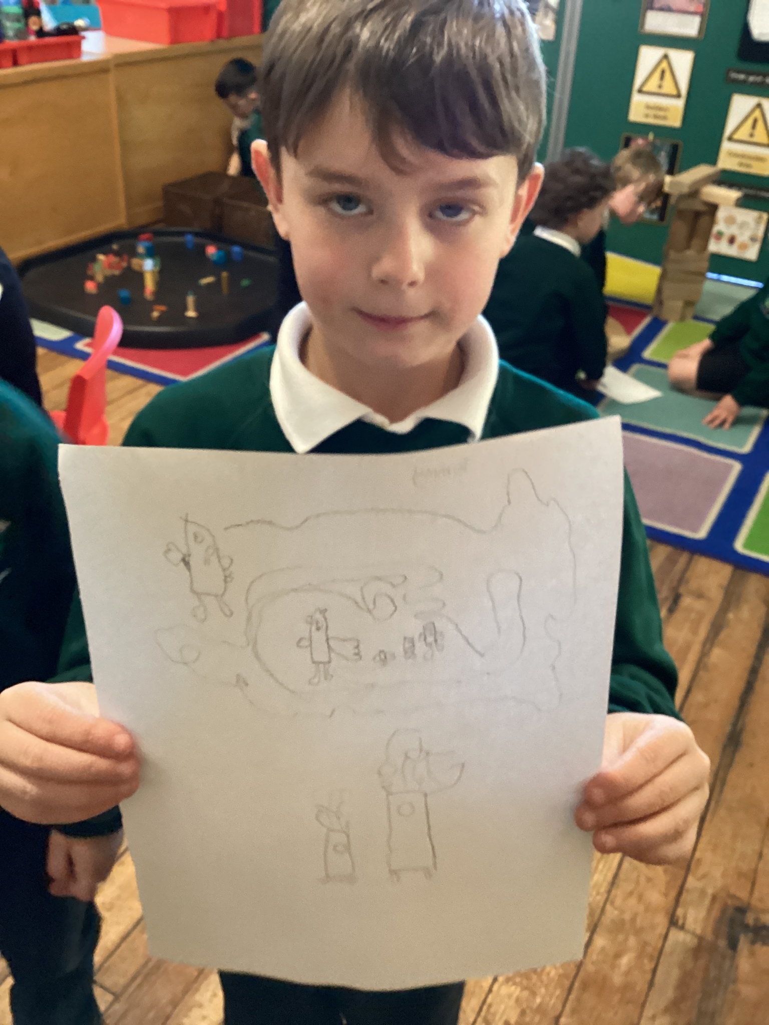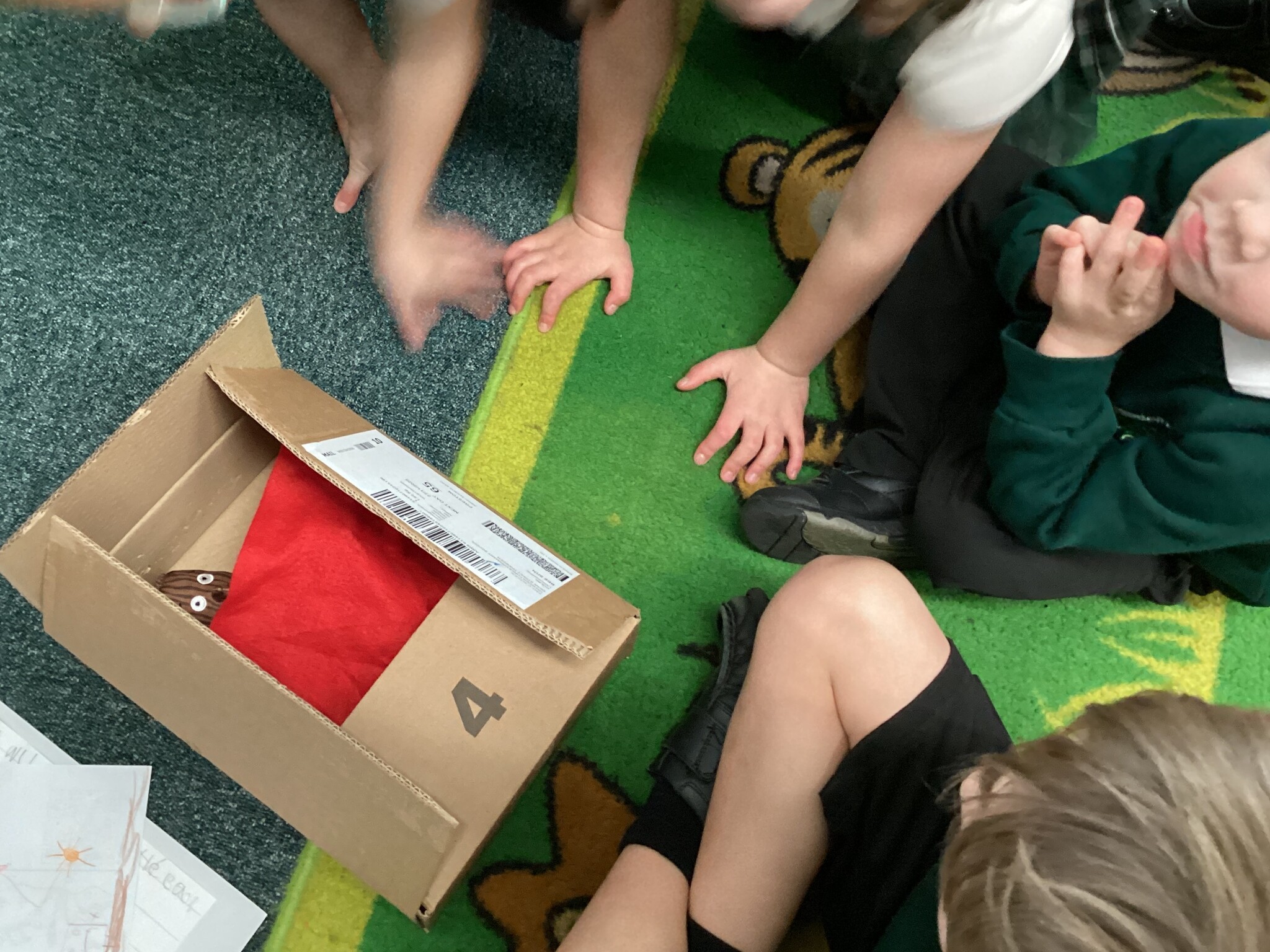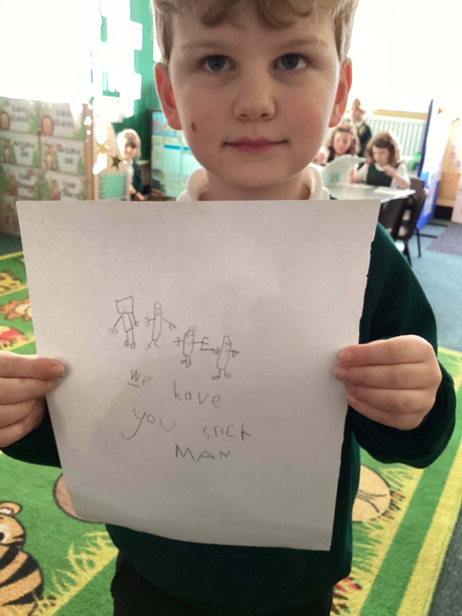 Year 1 were very surprised yesterday to discover an unusual guest had arrived while they were rehearsing. Some children discovered a sleeping 'Stickman' in an empty box in class. We were puzzled as to how and why he was there. Tommy suggested he might have been blown from the family tree in the strong winds we have had. Ted thought he had lost his family. Ava decided he must have come in because he was cold. Freddie said that maybe he needed our help.
